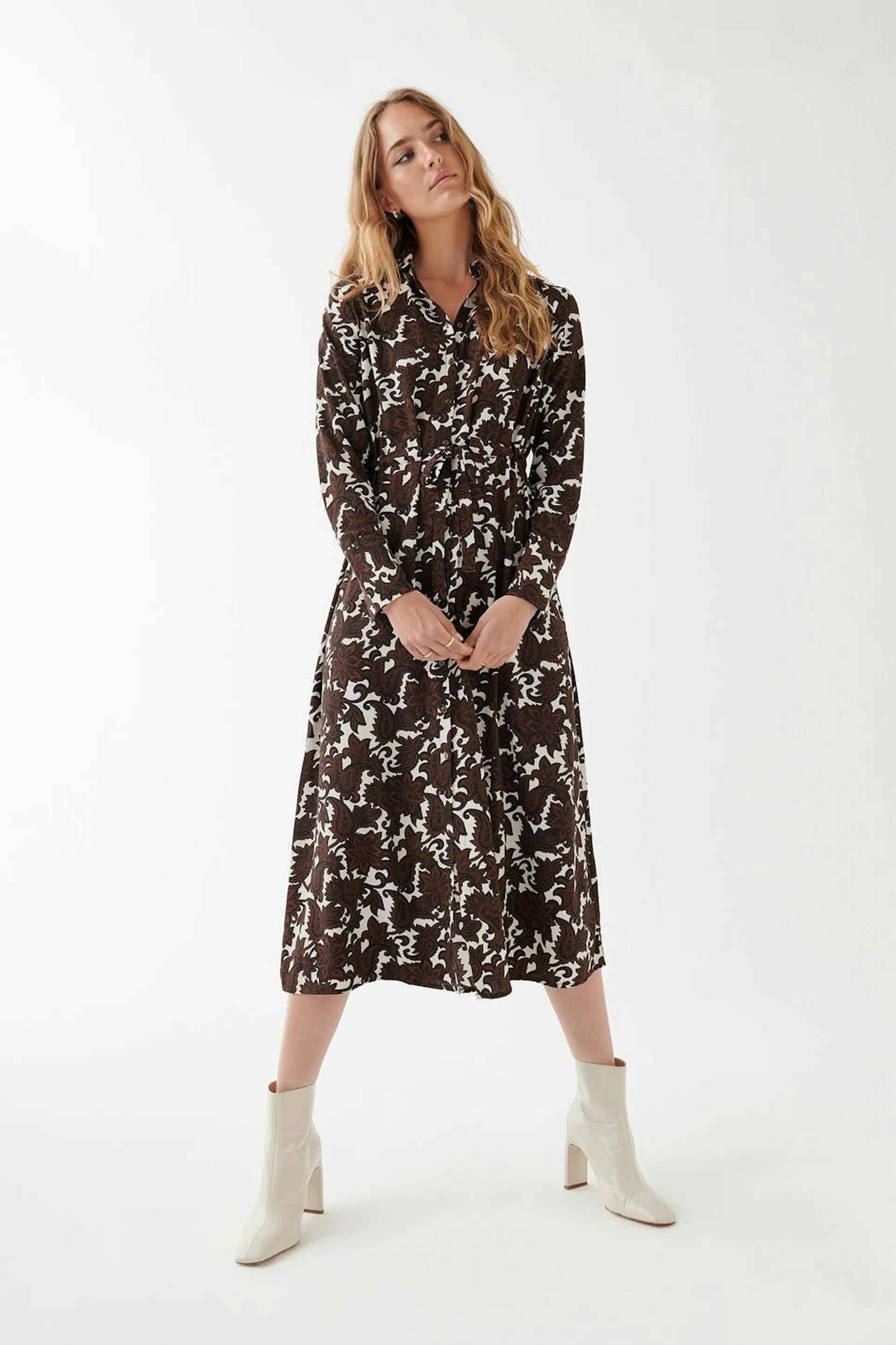 Leaf patterned shirt dress with a regular fit. Brown, white, long-sleeved and calf-length. It has a tie strap at the waist.