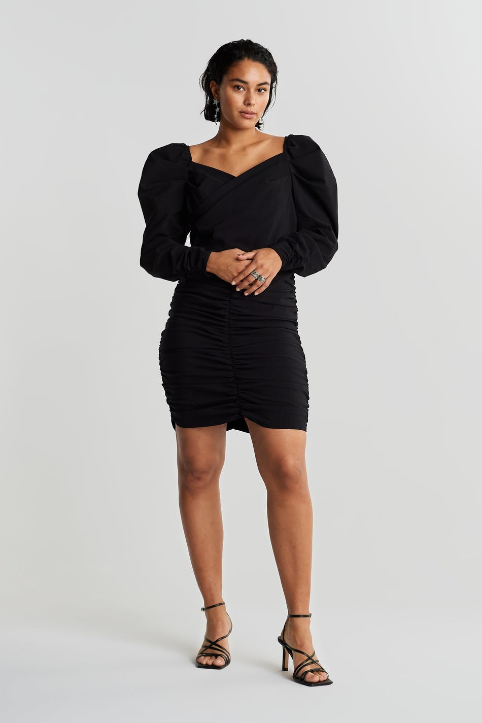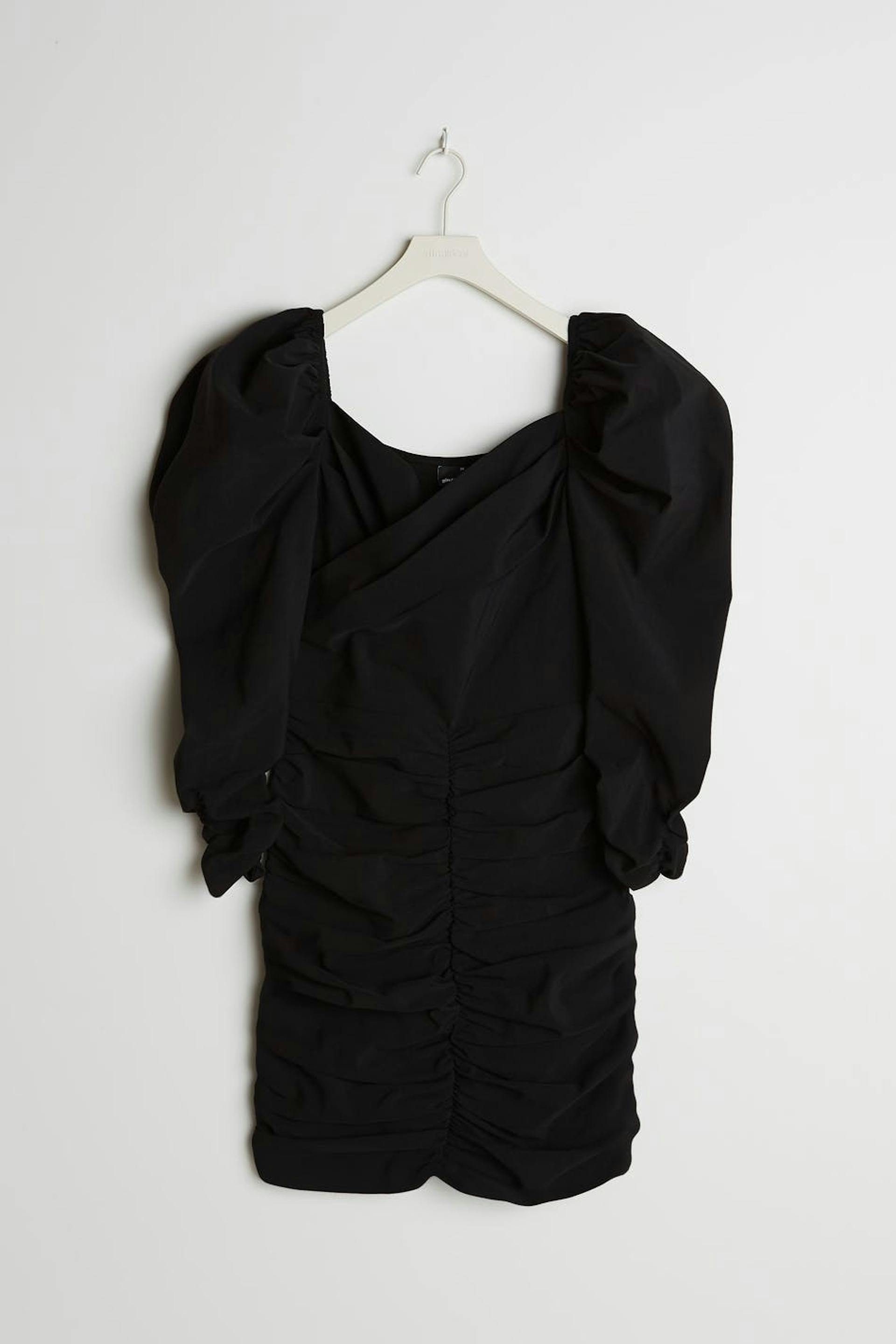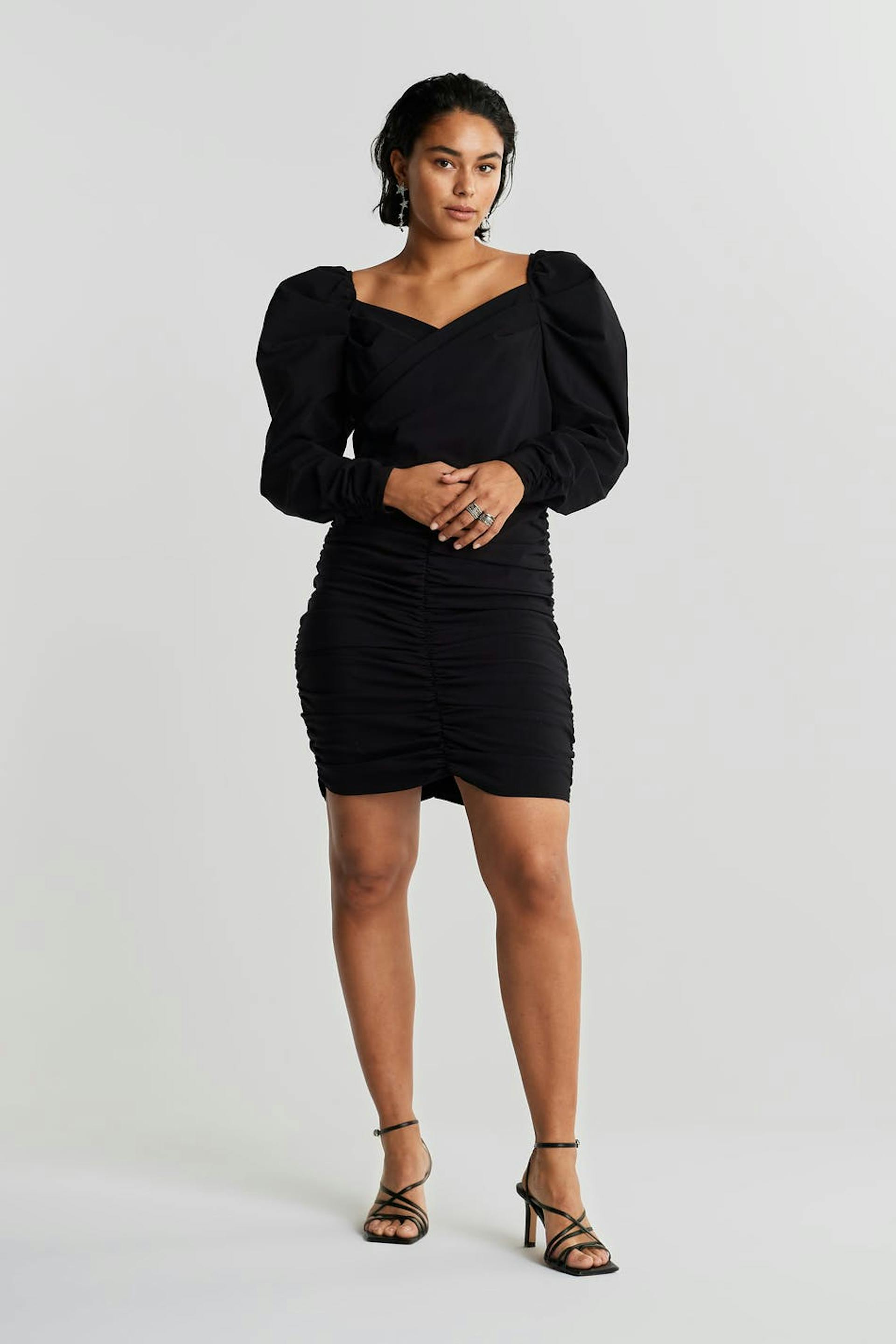 Short dress with a fitted fit. The dress is perfect for the party and black and has a wrap detail at the front. It has long puff sleeves and gathering on the skirt.
