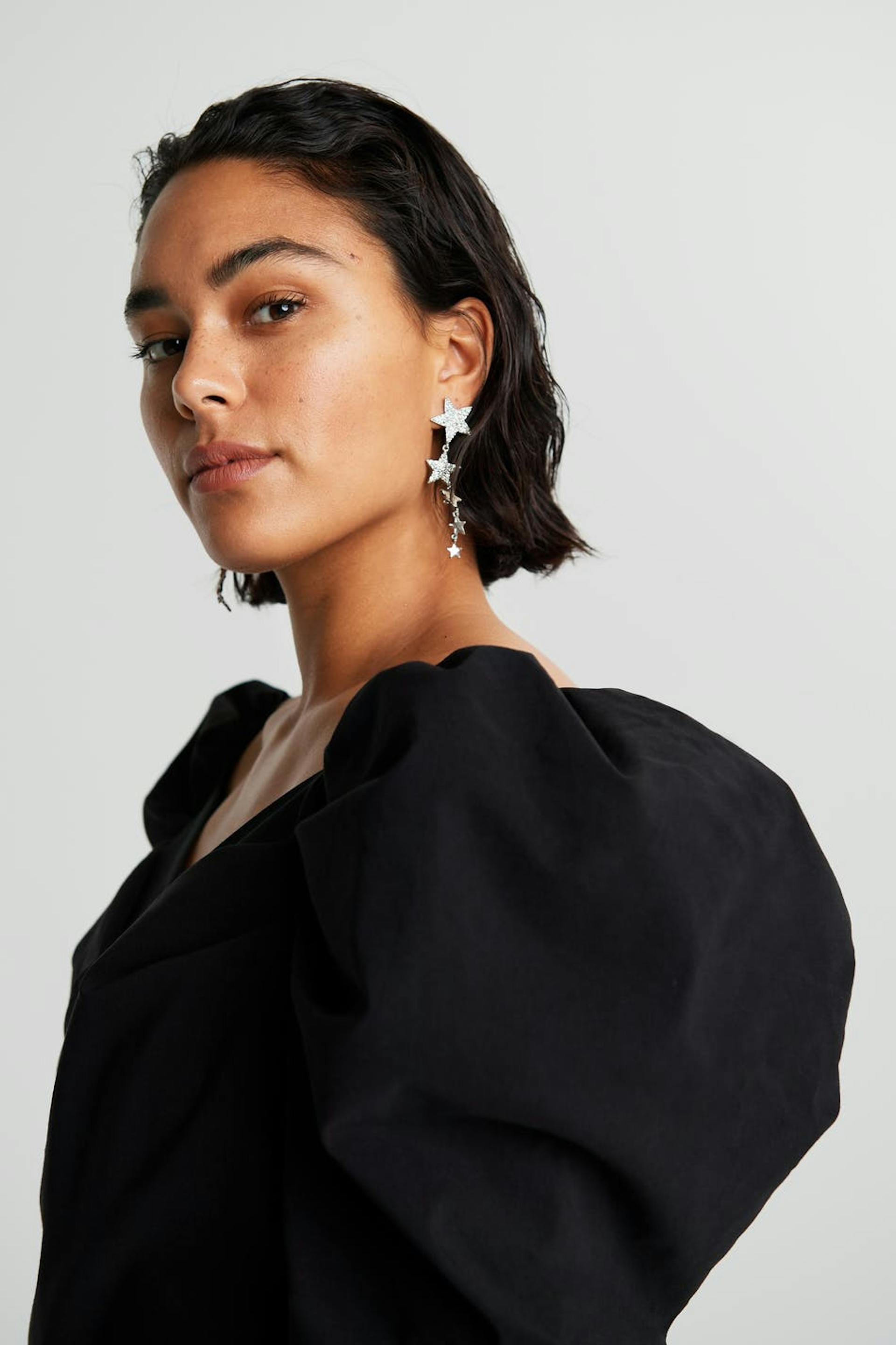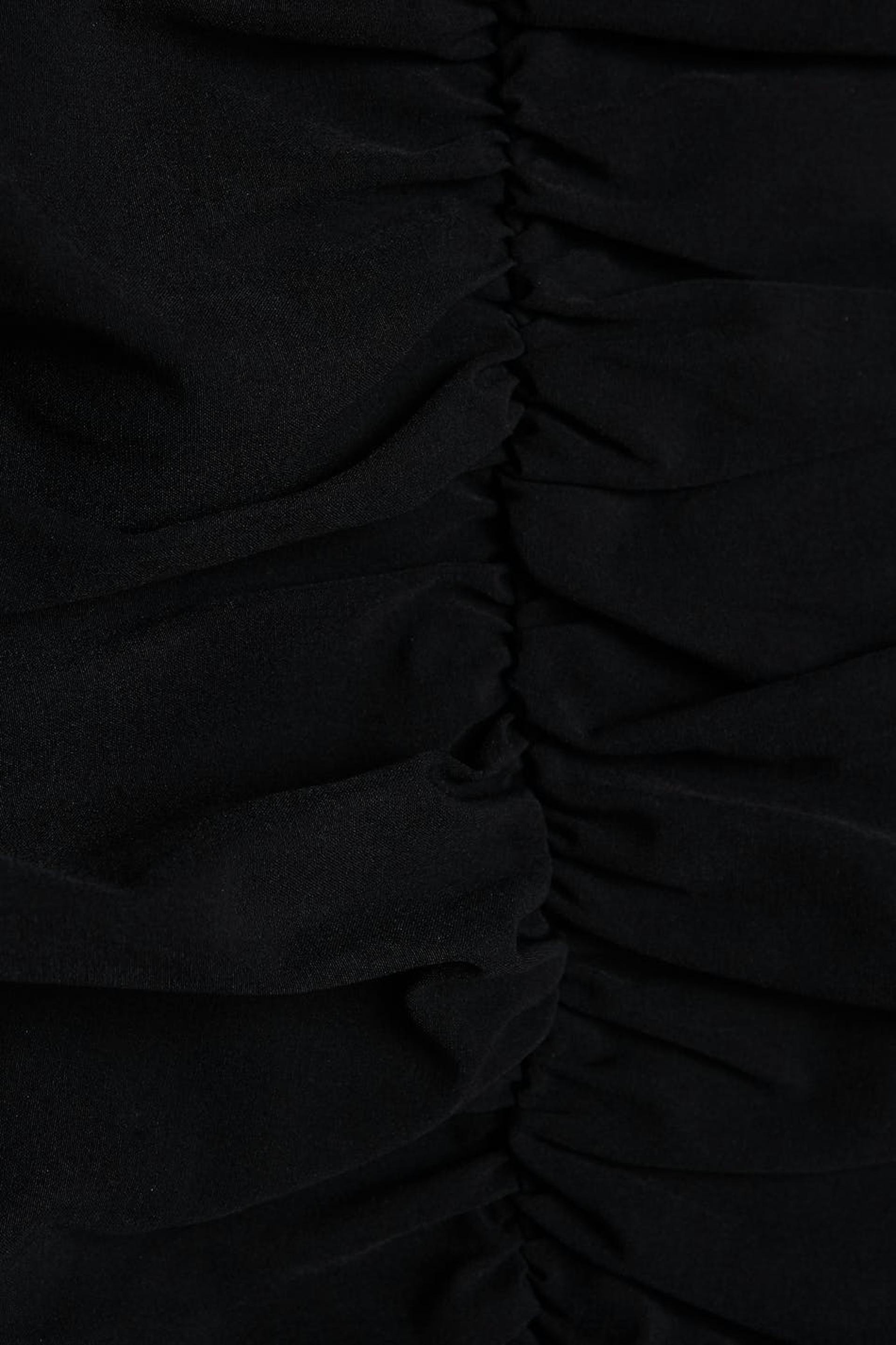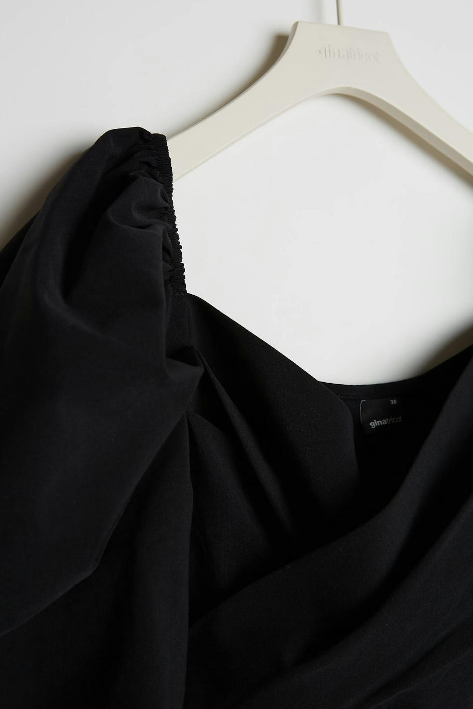 Short dress with a fitted fit. The dress is perfect for the party and black and has a wrap detail at the front. It has long puff sleeves and gathering on the skirt.