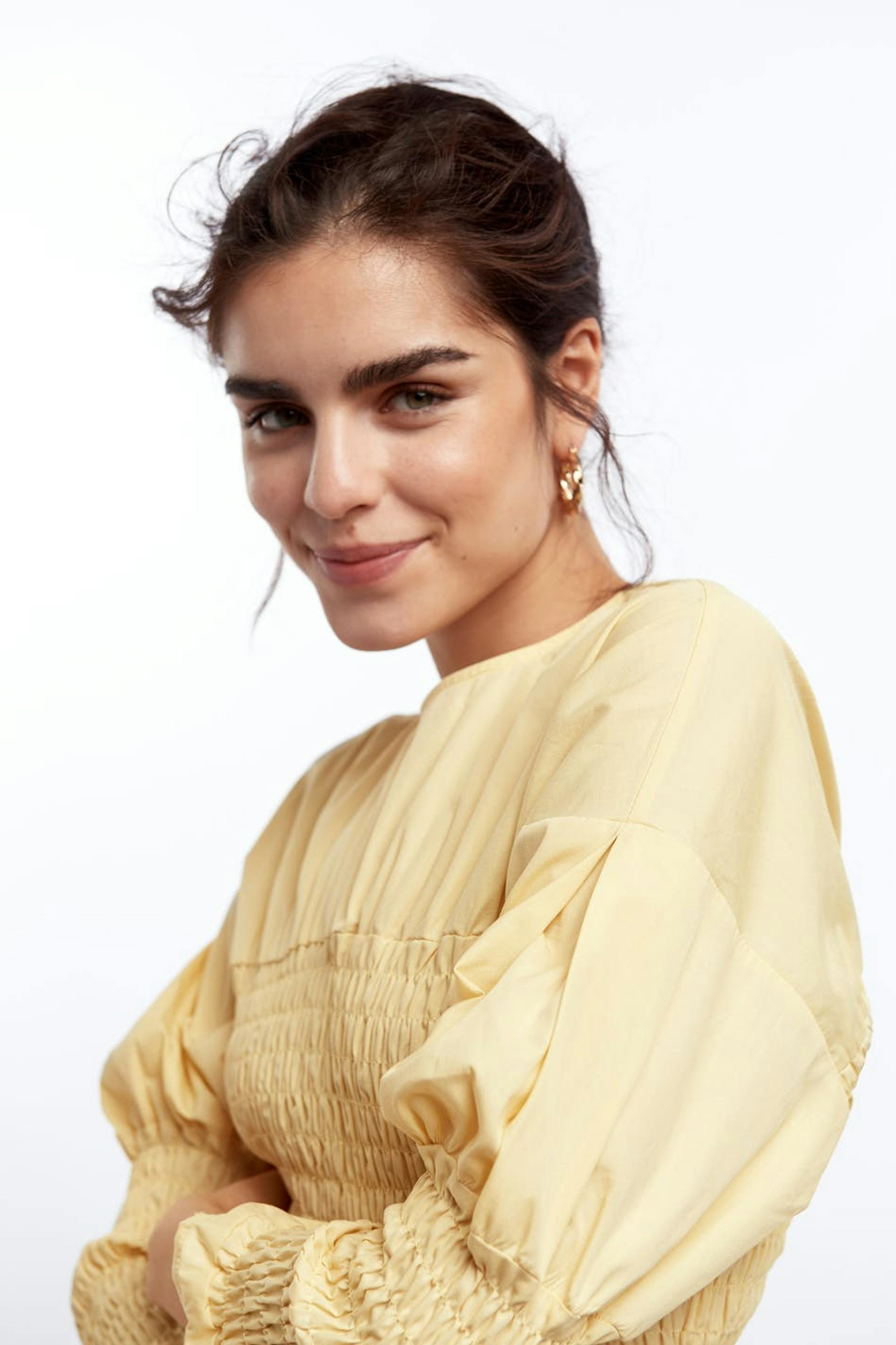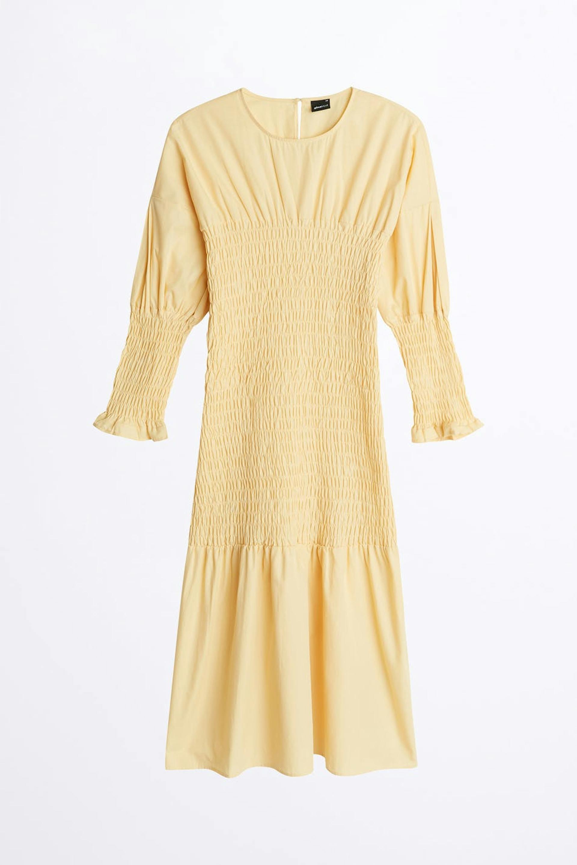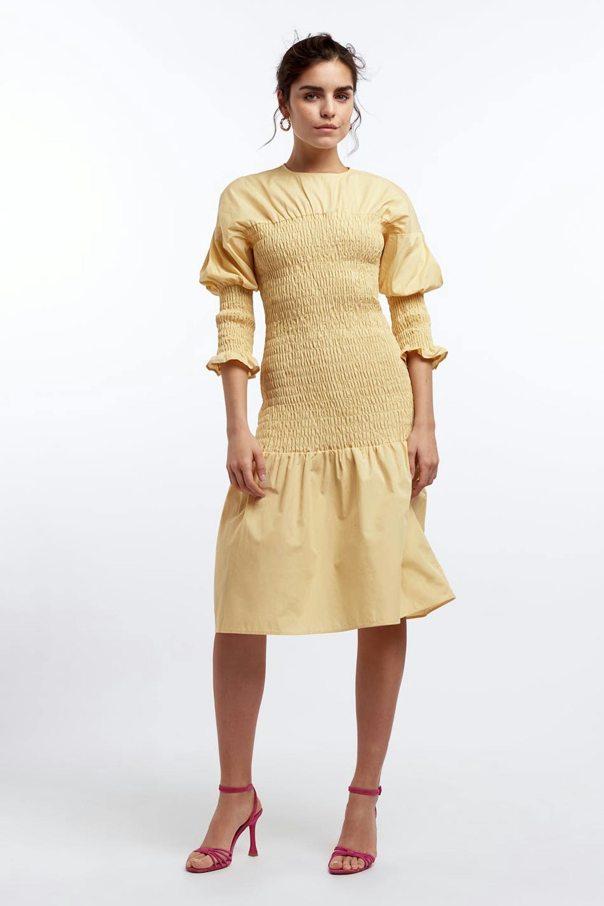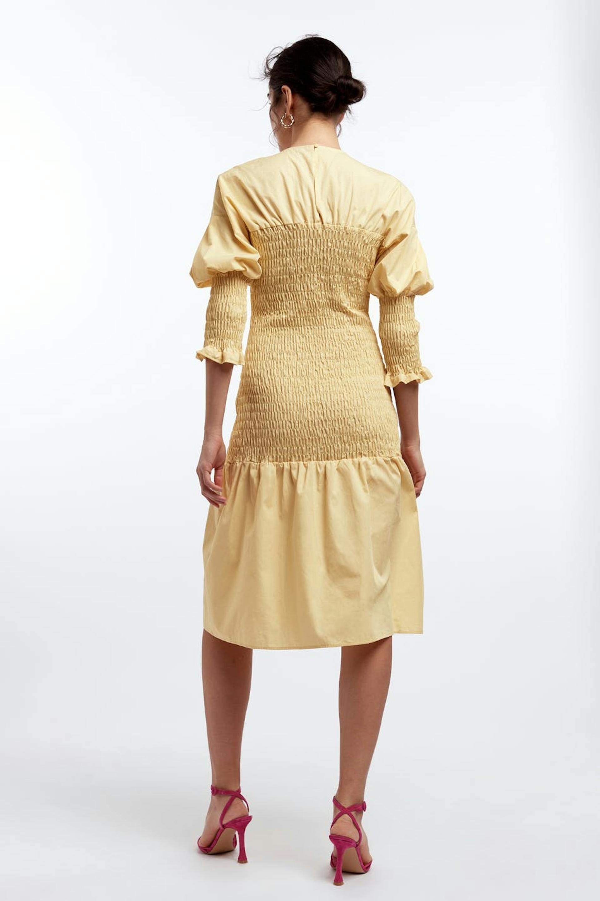 Smocked dress with 3/4 length puff sleeves. The dress is yellow and has a crew neckline. It has midi length.