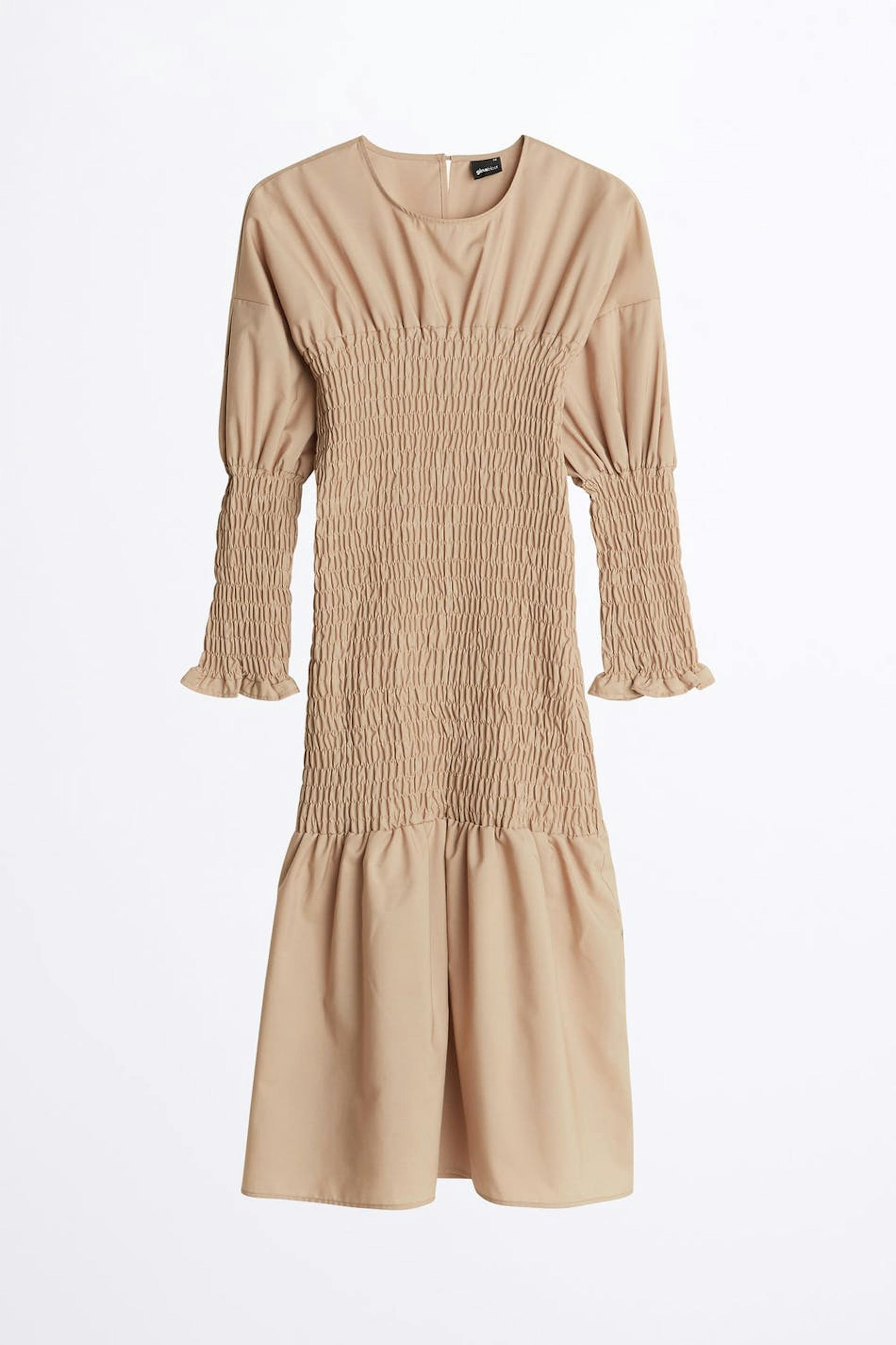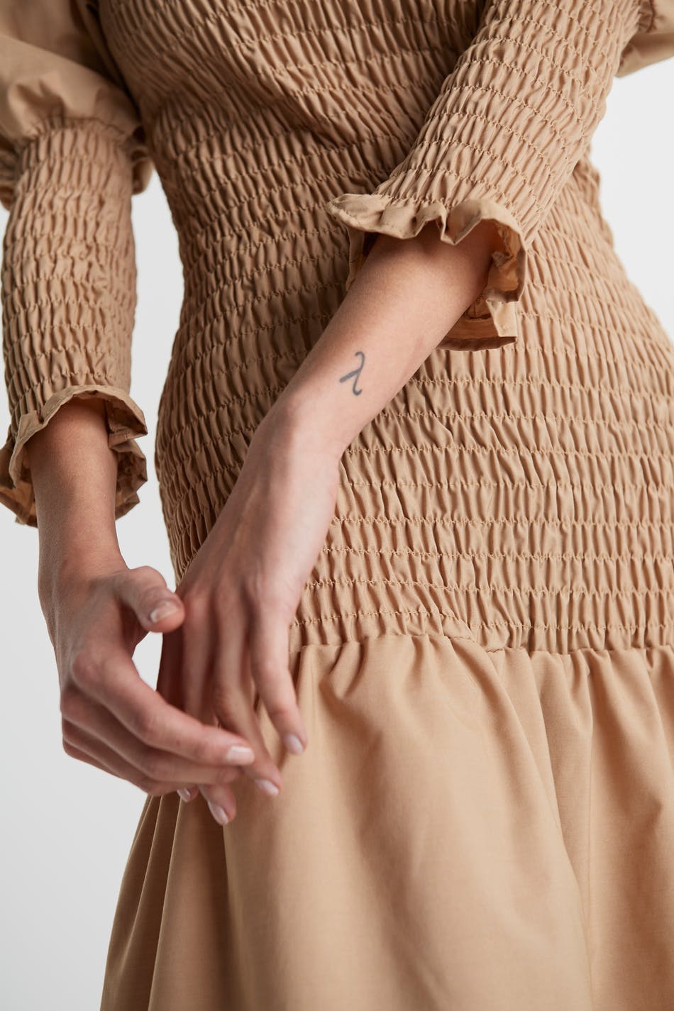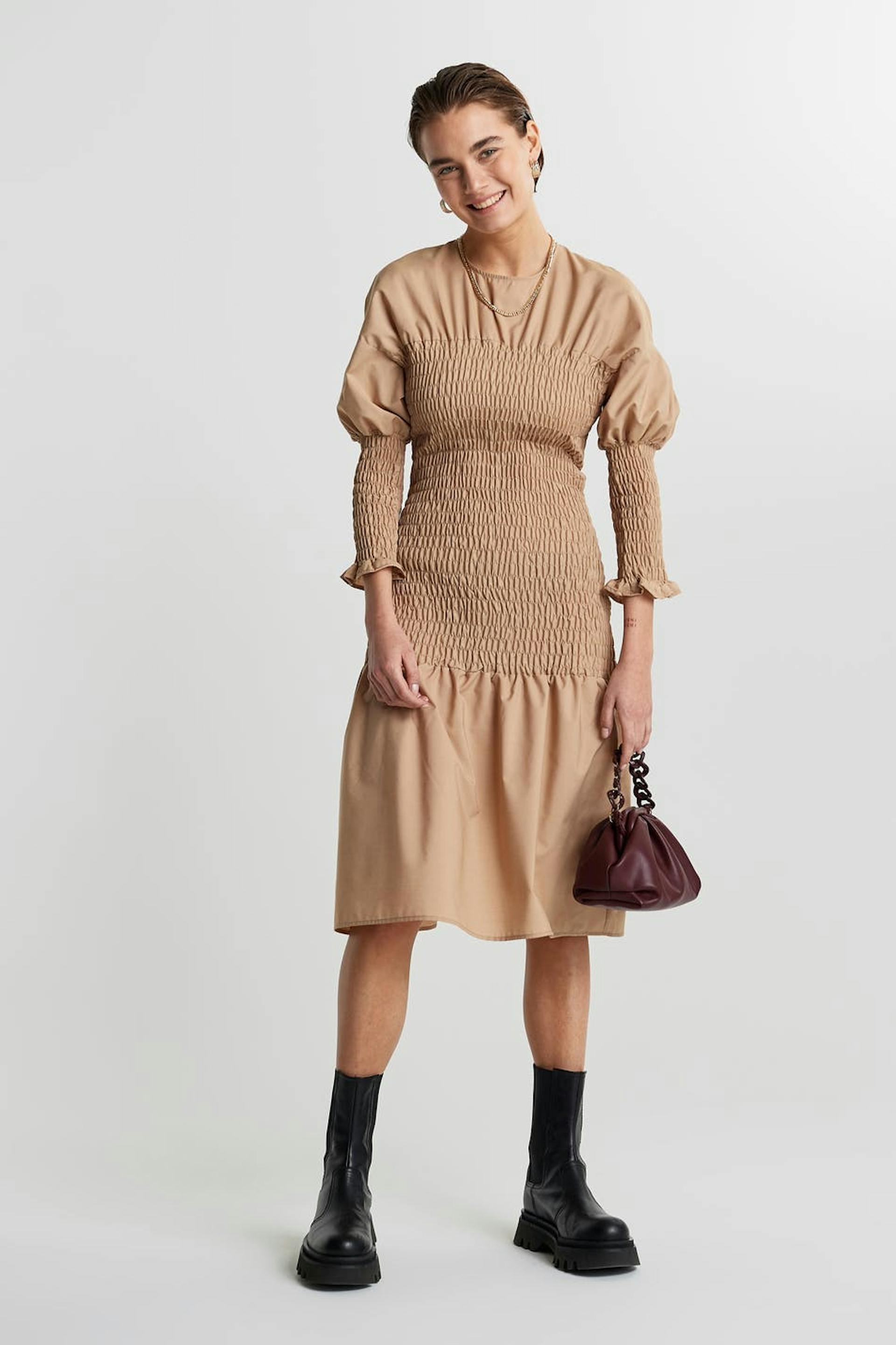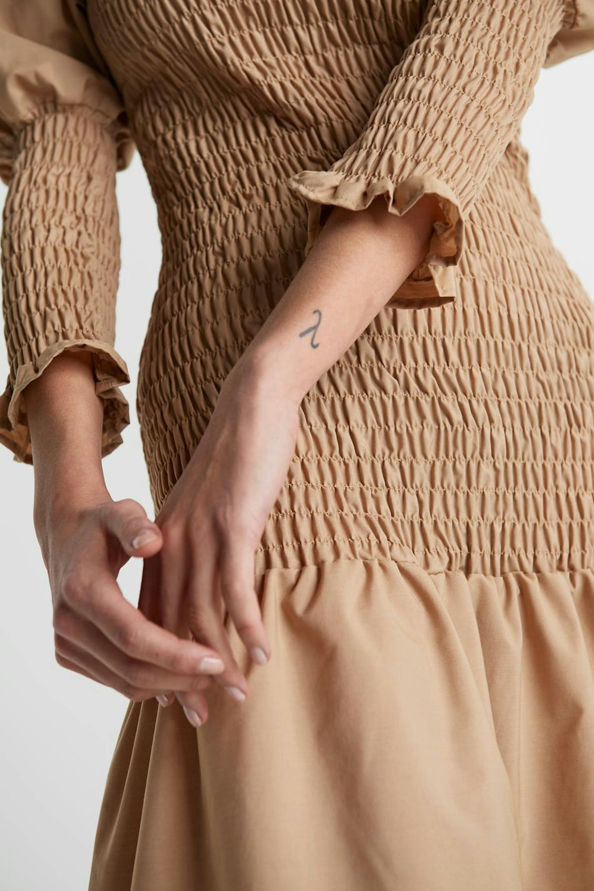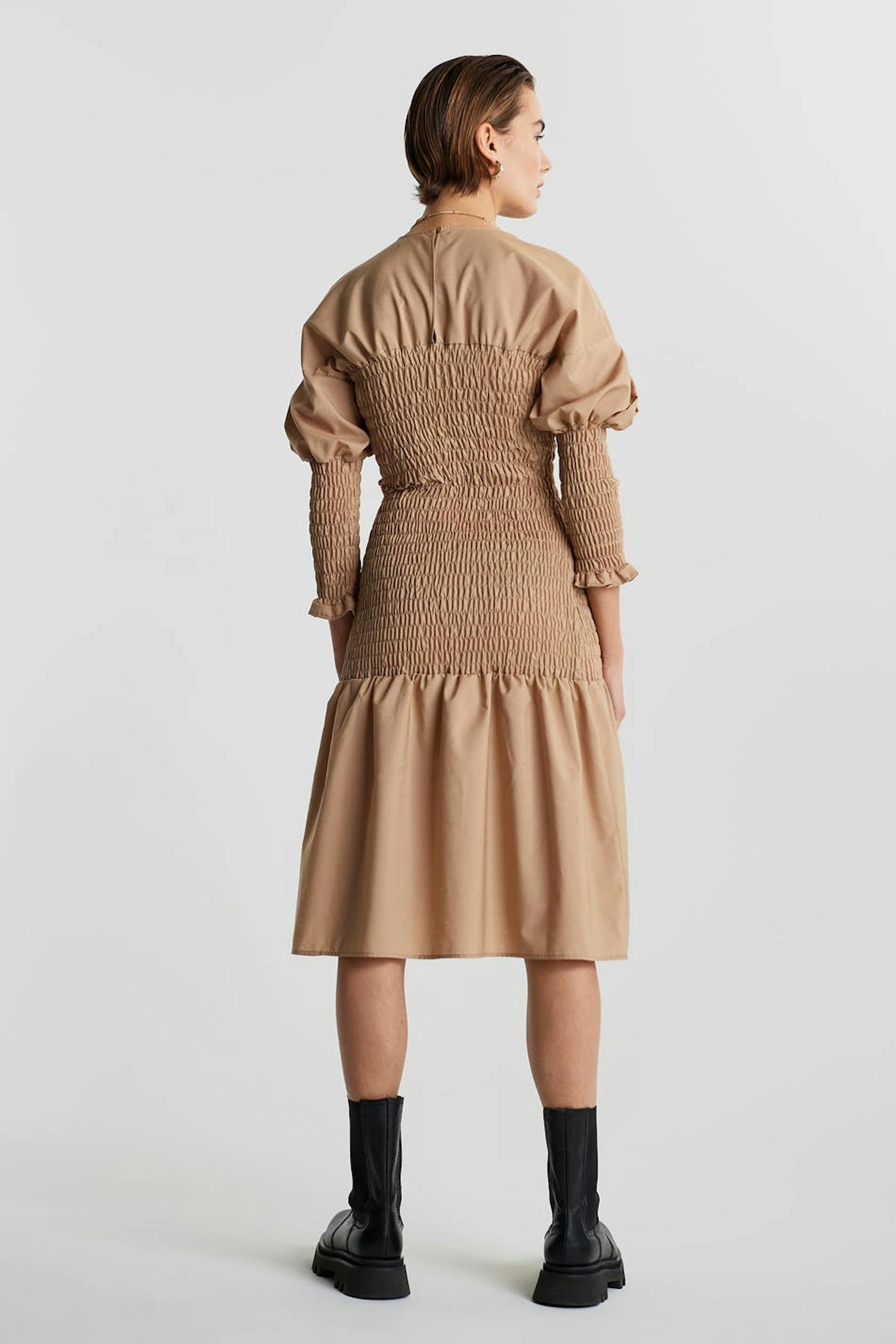Smockdress with puff sleeves. Boat neckline with dropped shoulders. Midi length. Supplier: Huzi Tekstil Ltd Sti Production unit: Yesim Tekstil-Hulya Karacoban