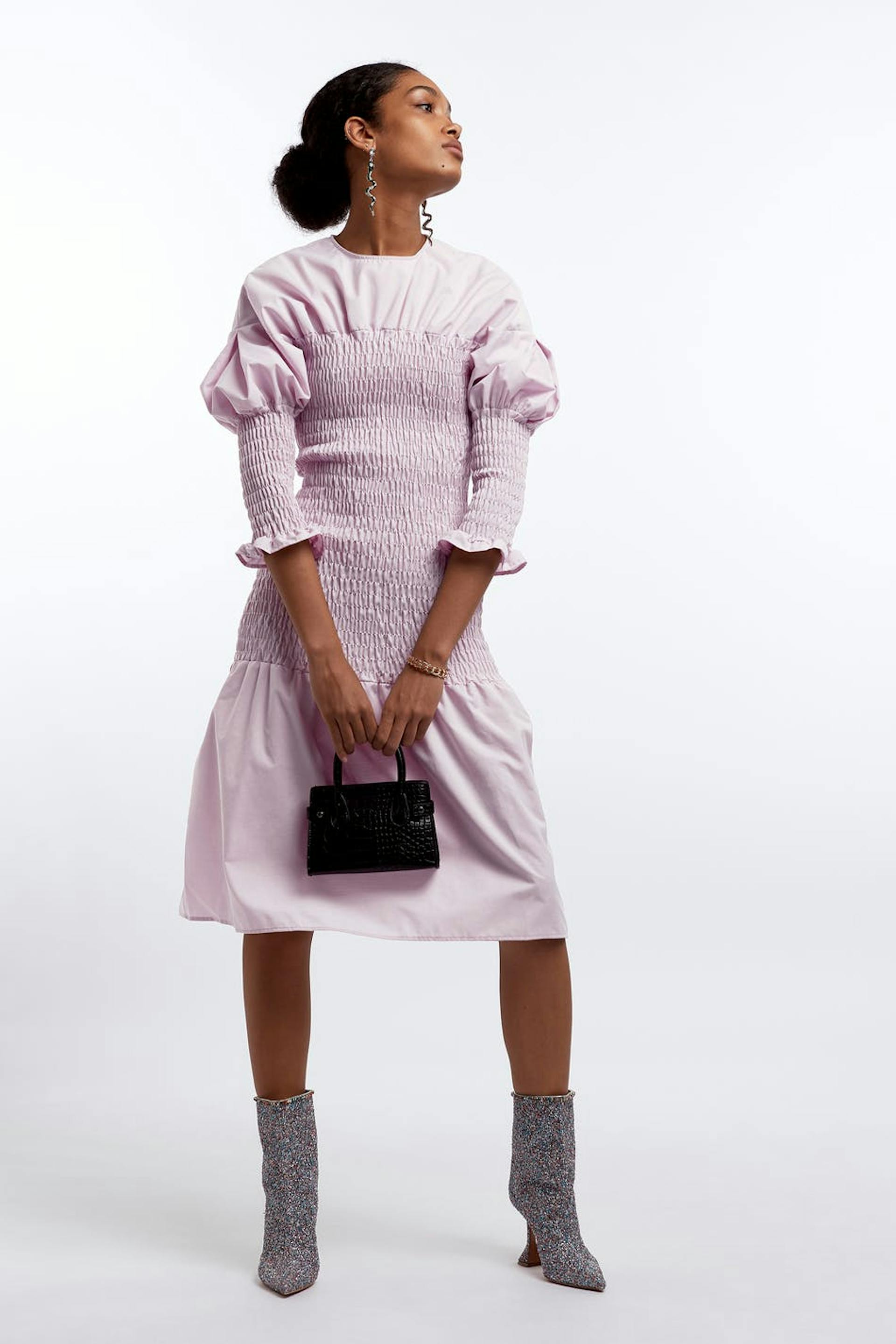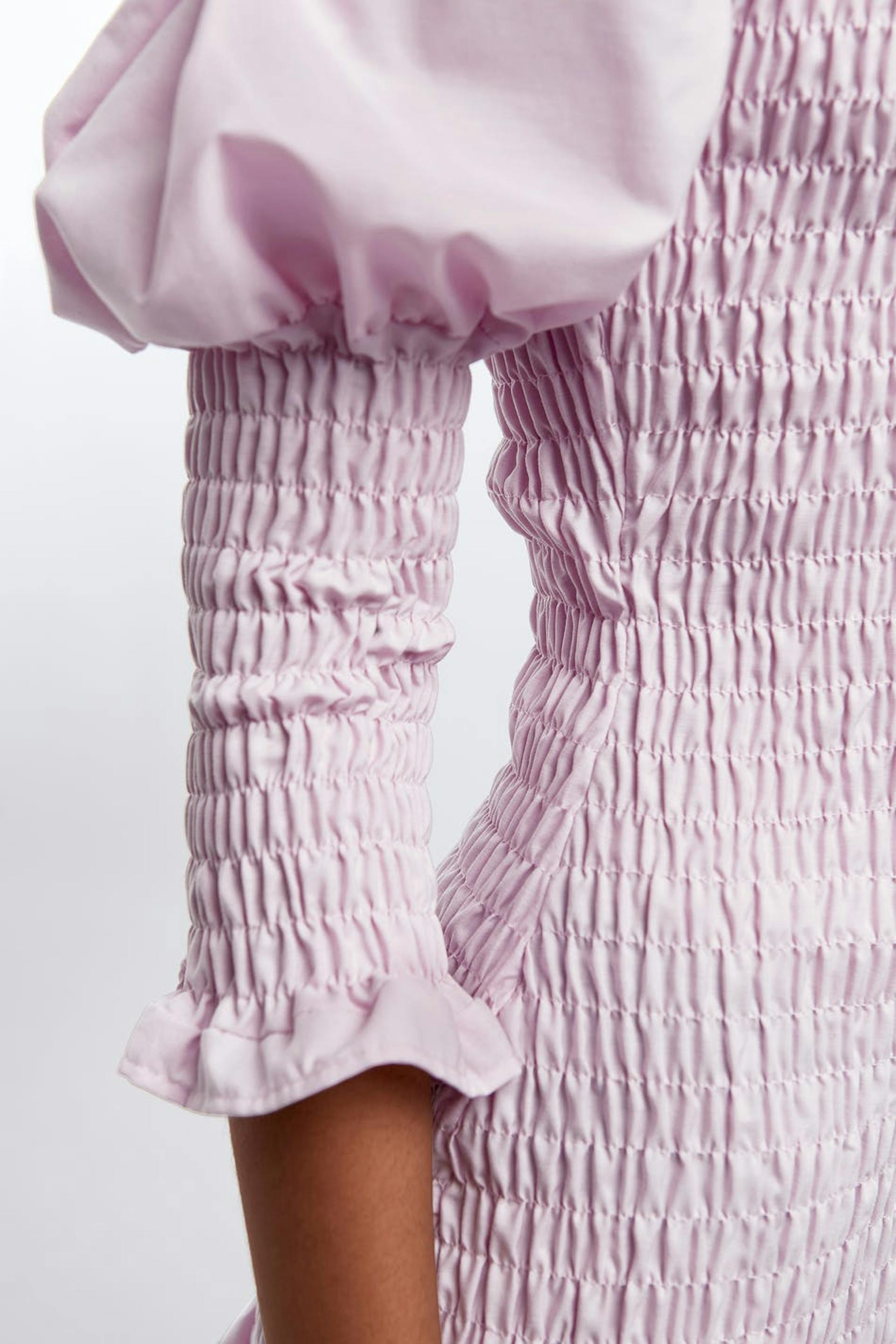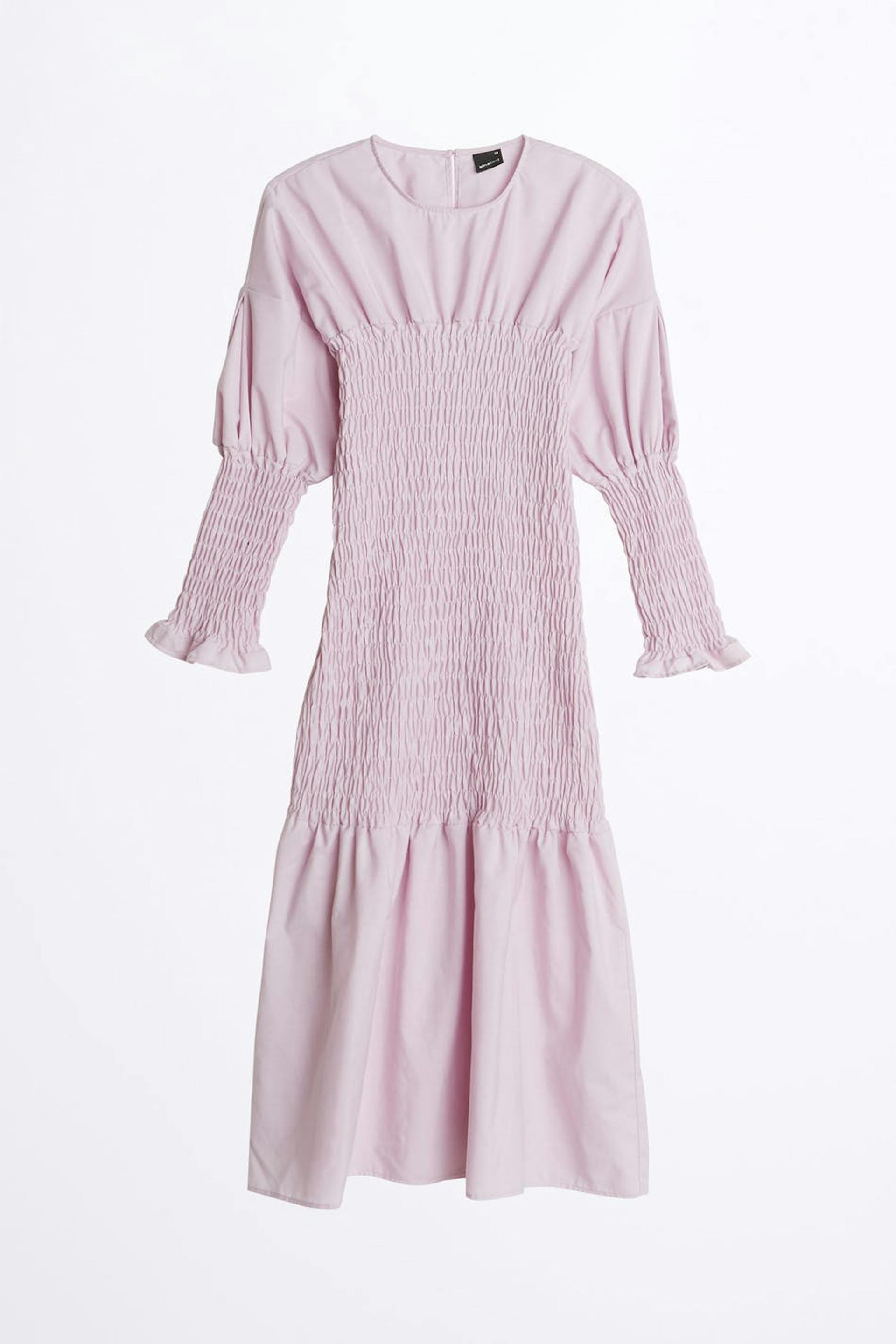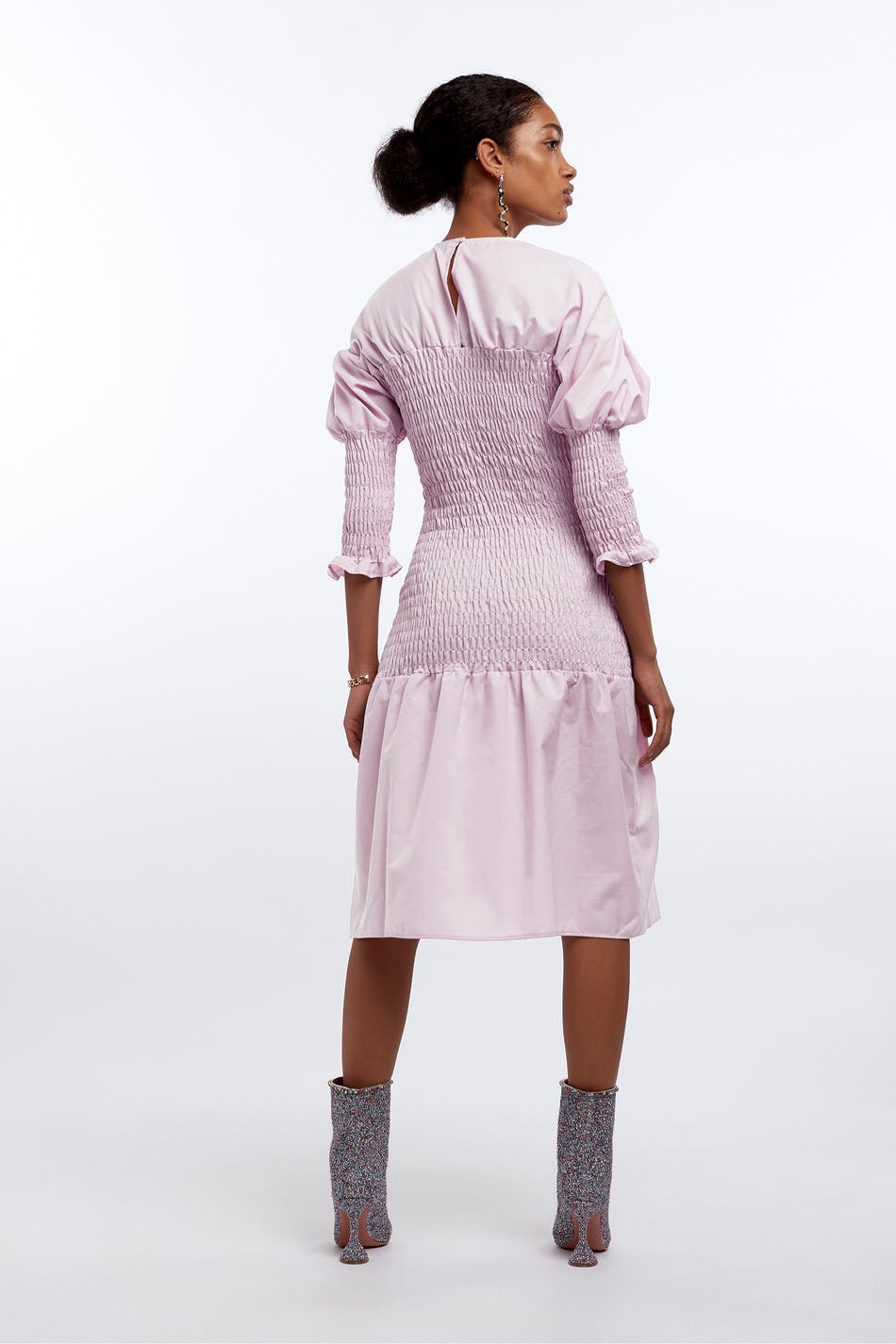 Smocked dress with 3/4 length puff sleeves. The dress is perfect for the party and purple and has midi length.