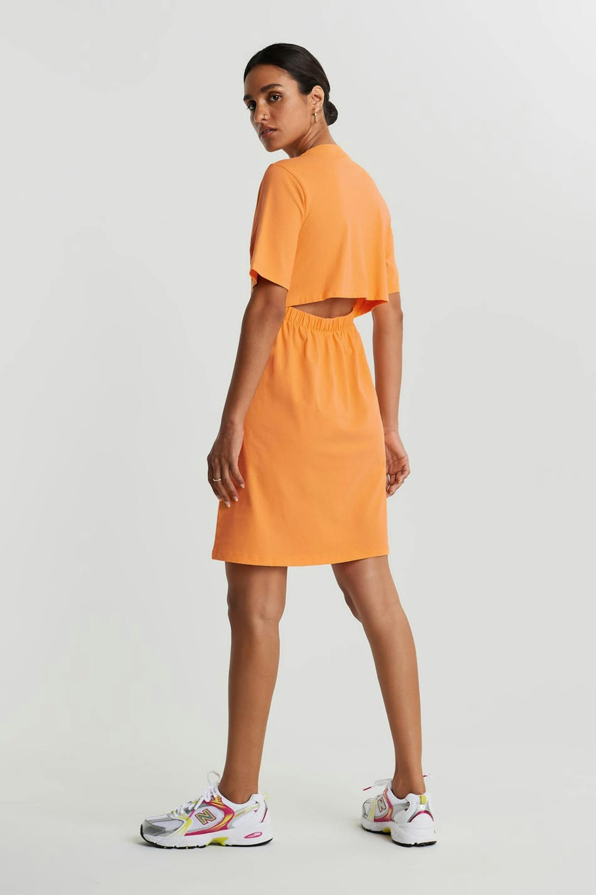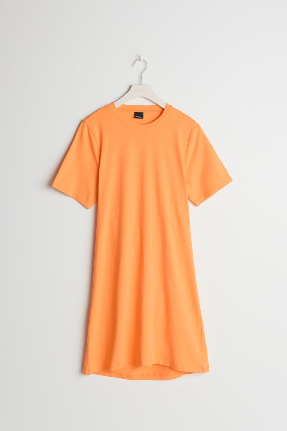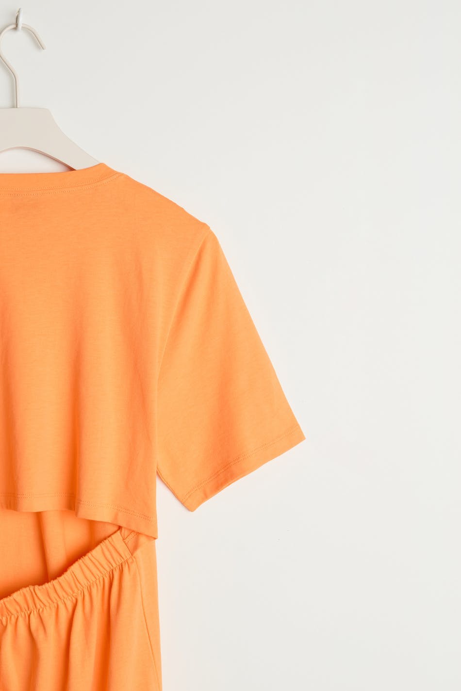 T-shirt dress with a cut out detail in the back with an elastic band at the hem. The dress is orange and has a slit on the sides. It is made of jersey.