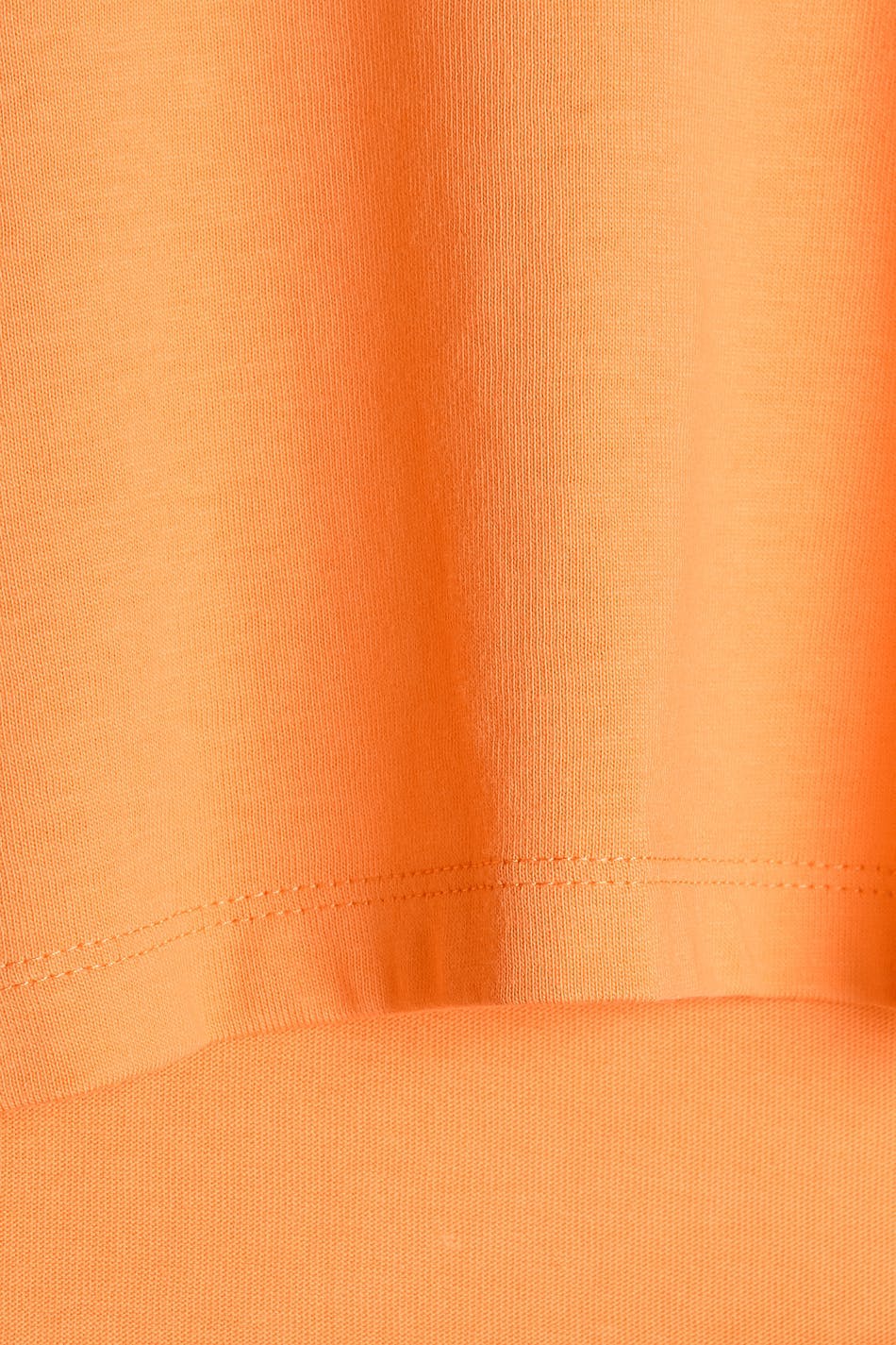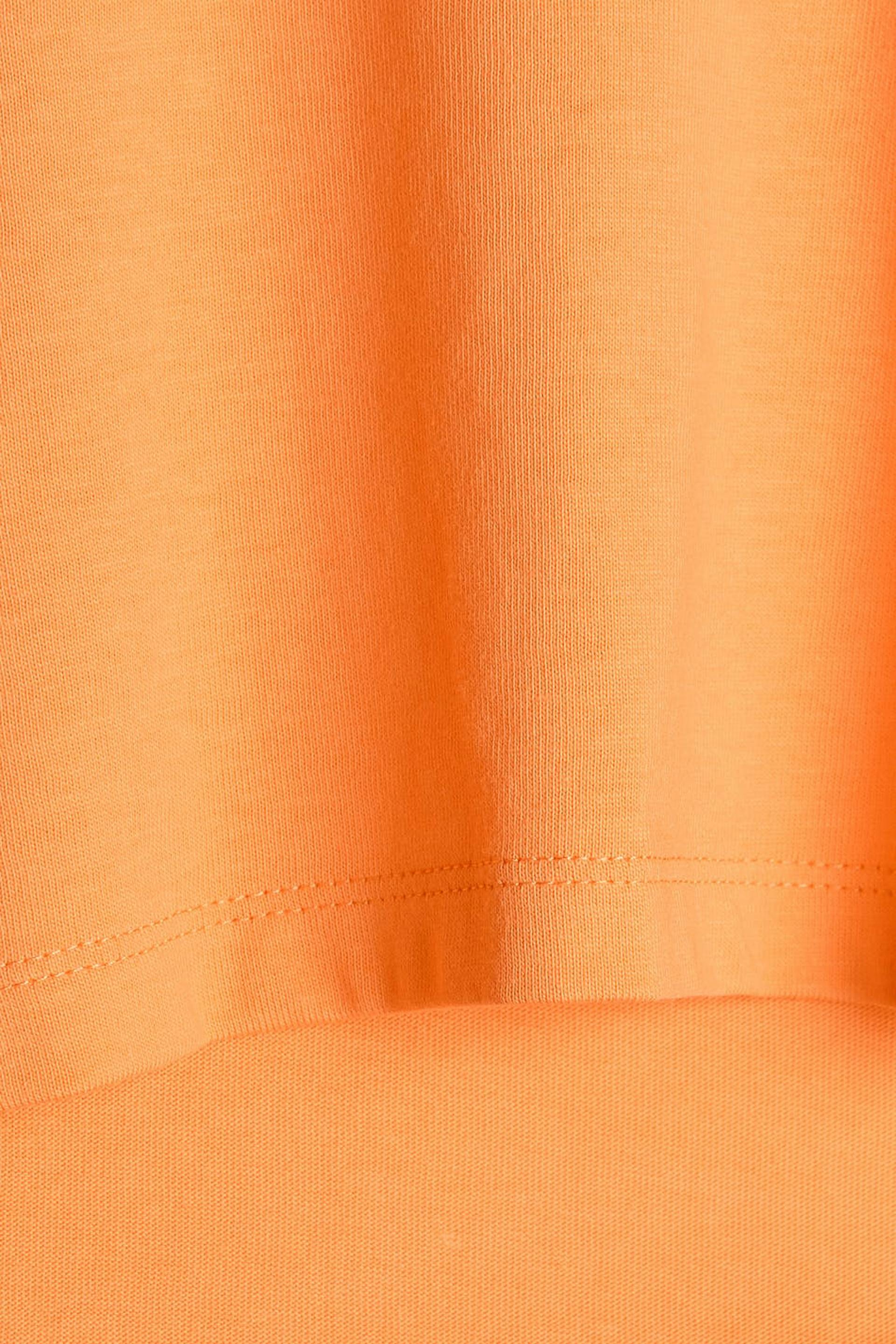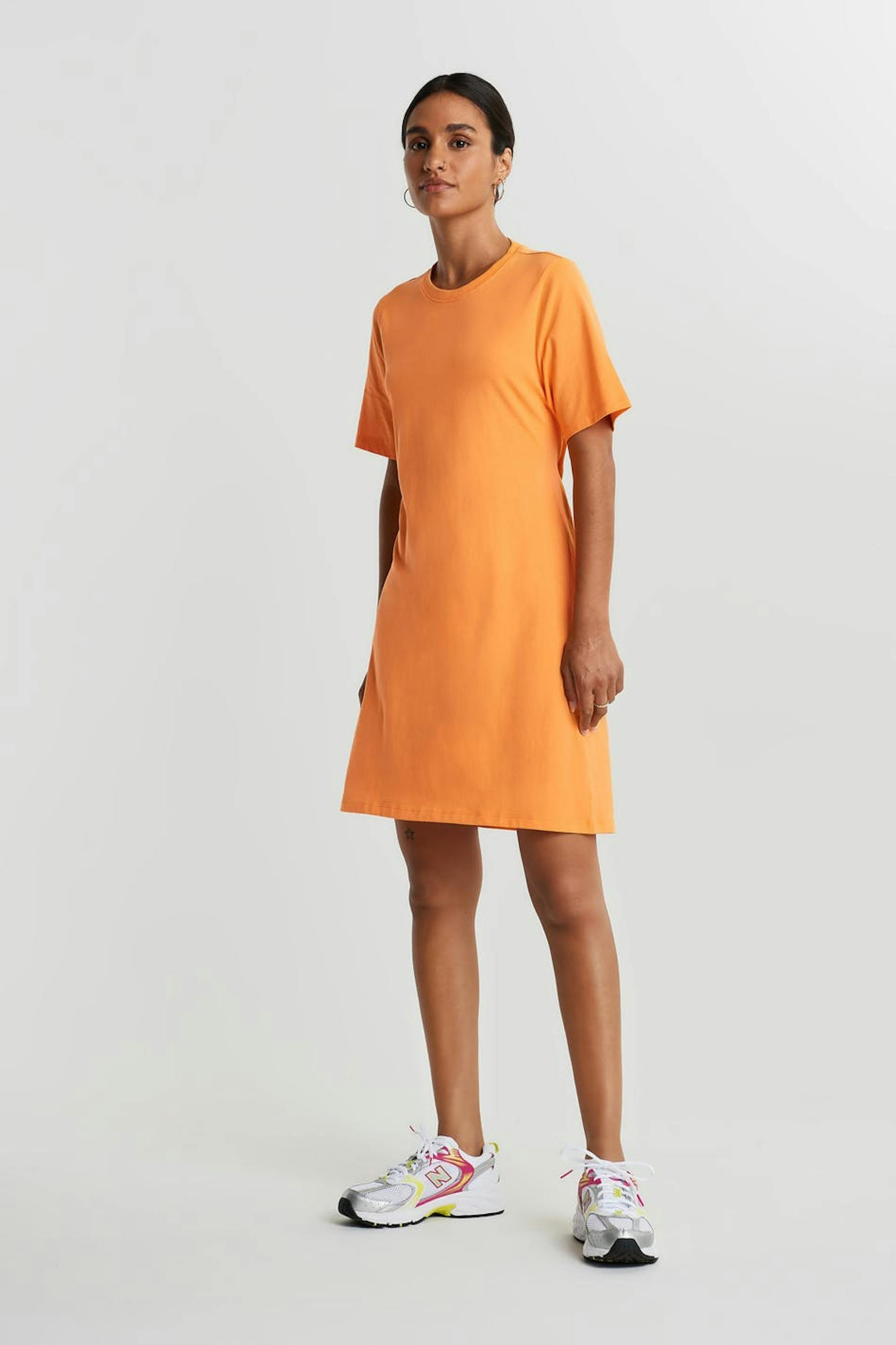 T-shirt dress with a cut out detail in the back with an elastic band at the hem. The dress is orange and has a slit on the sides. It is made of jersey.