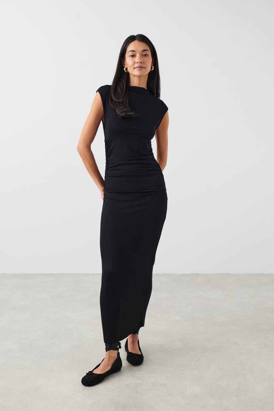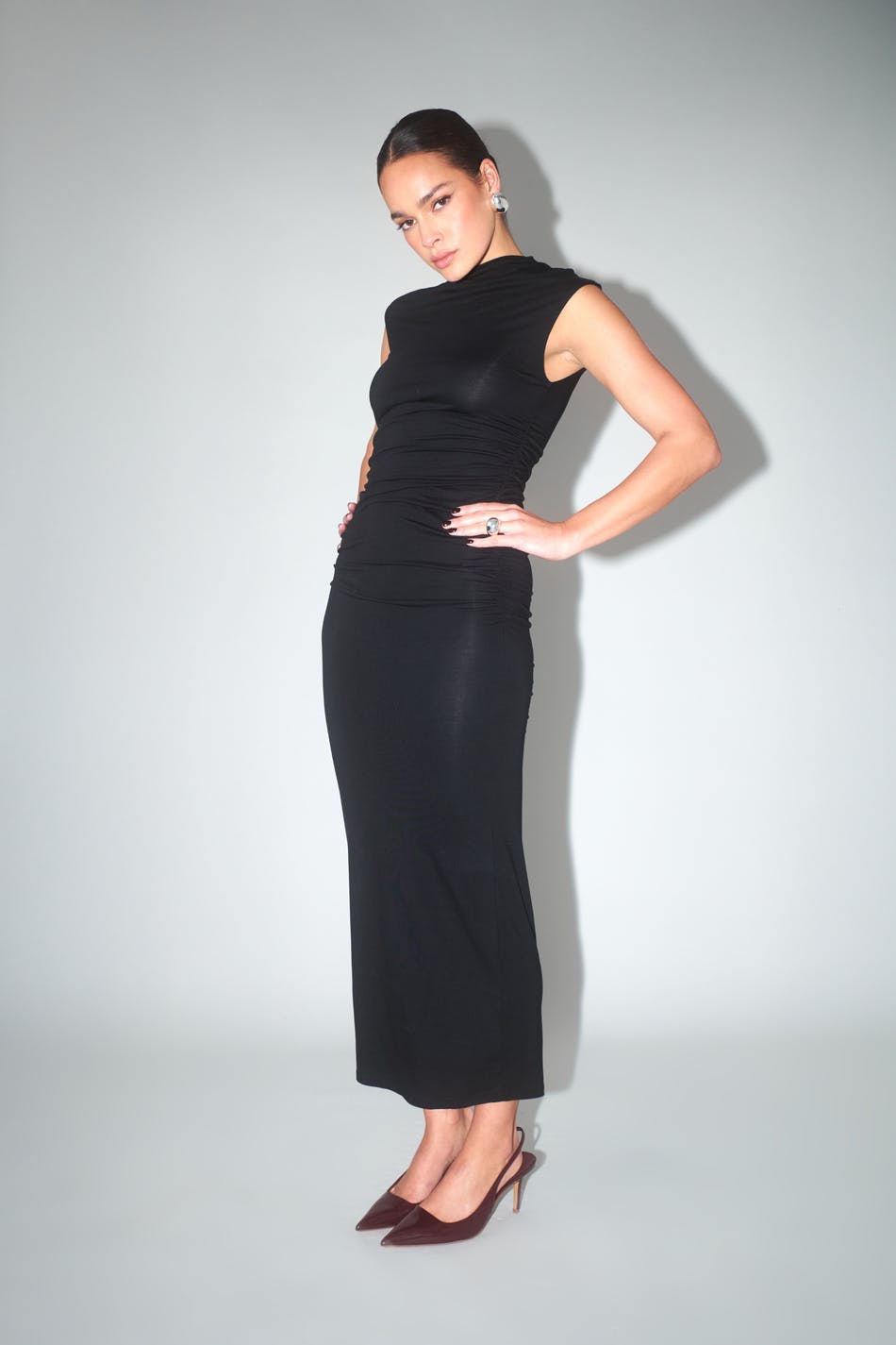Soft touch – second skin comfort. Sleeveless dress in soft viscose with figure-hugging fit. The dress is black and has ruching in the sides. It has funnel neck and midi length.