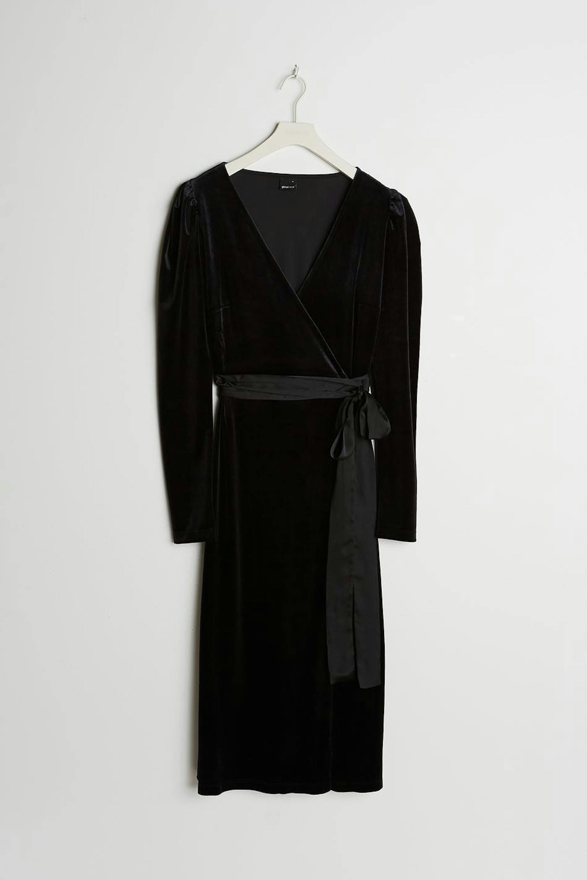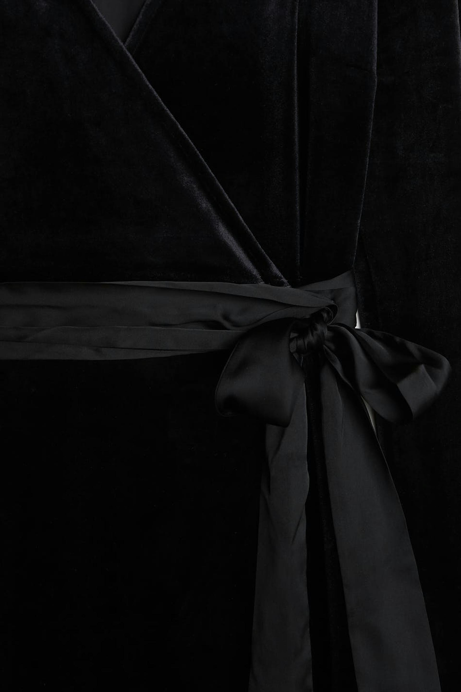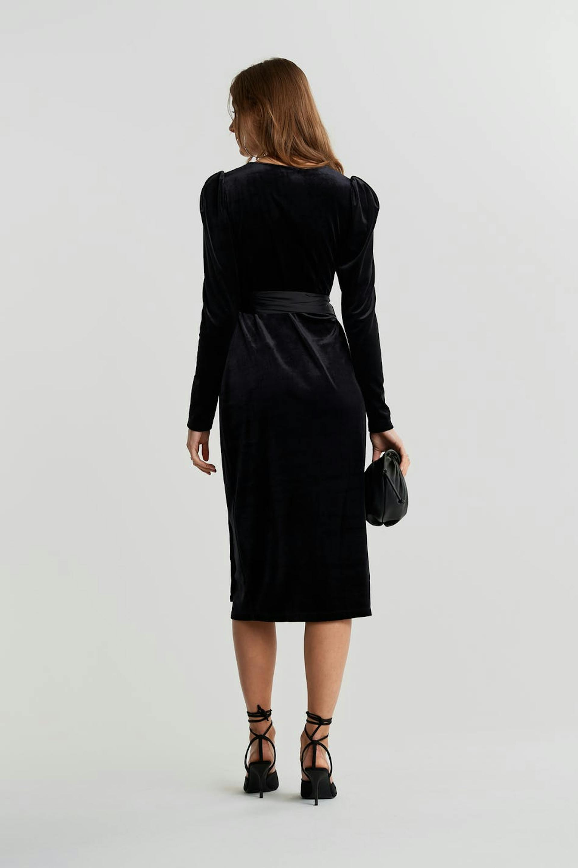 Long-sleeved dress with a regular fit. The dress is perfect for the party and black and has an overlap design. It has a velvet like material and a tie strap at the waist.