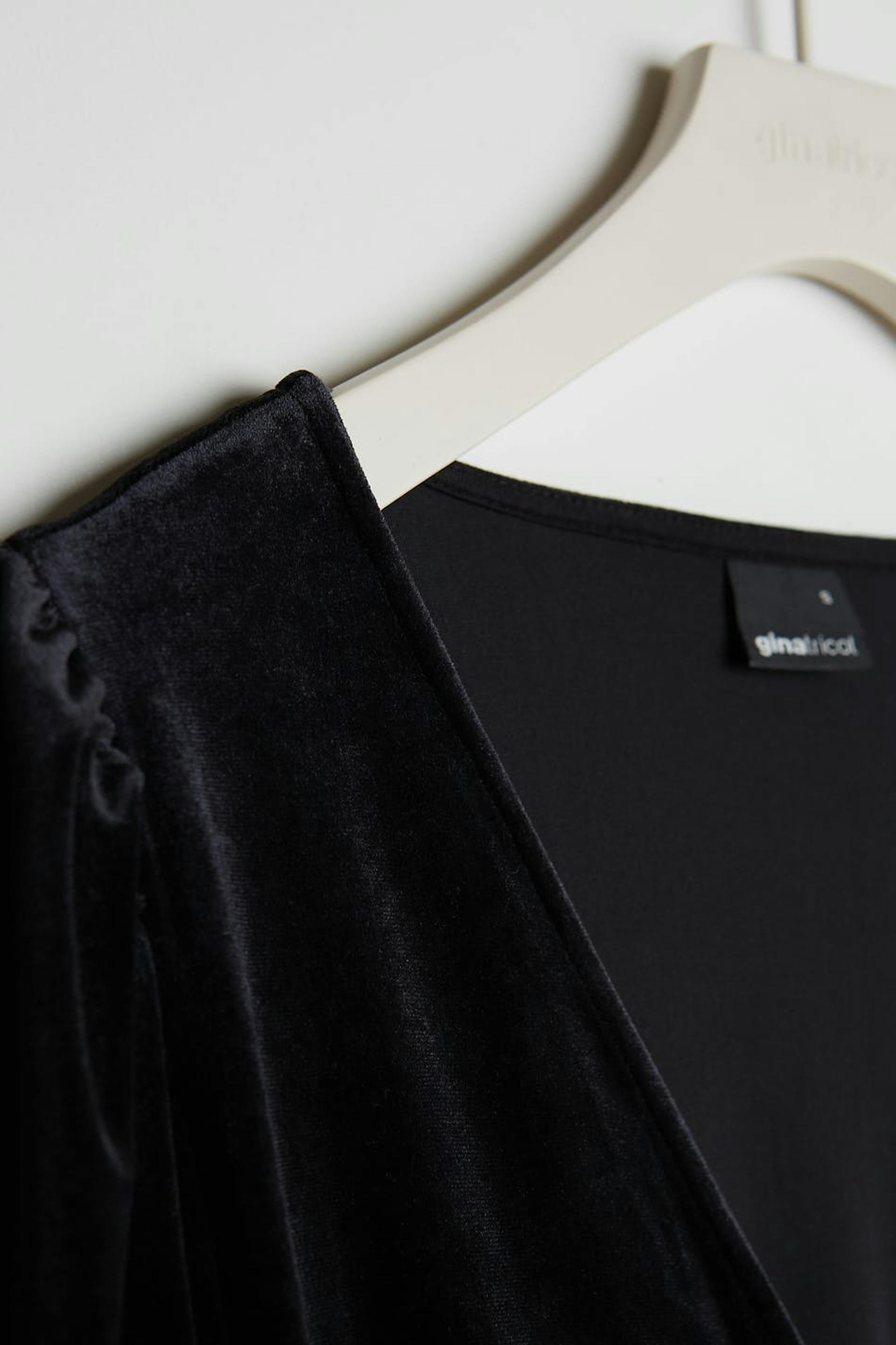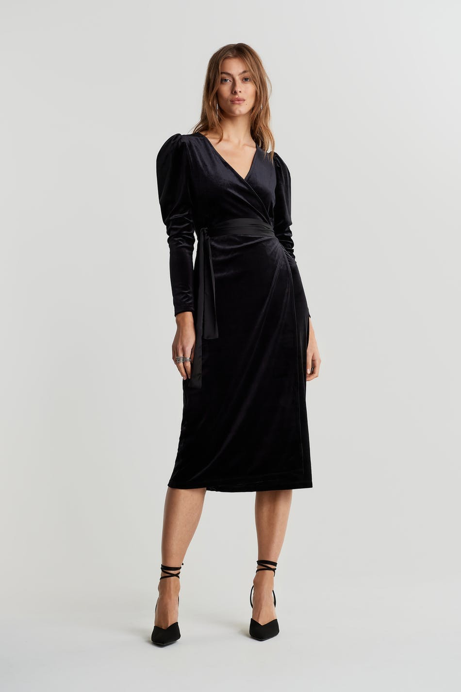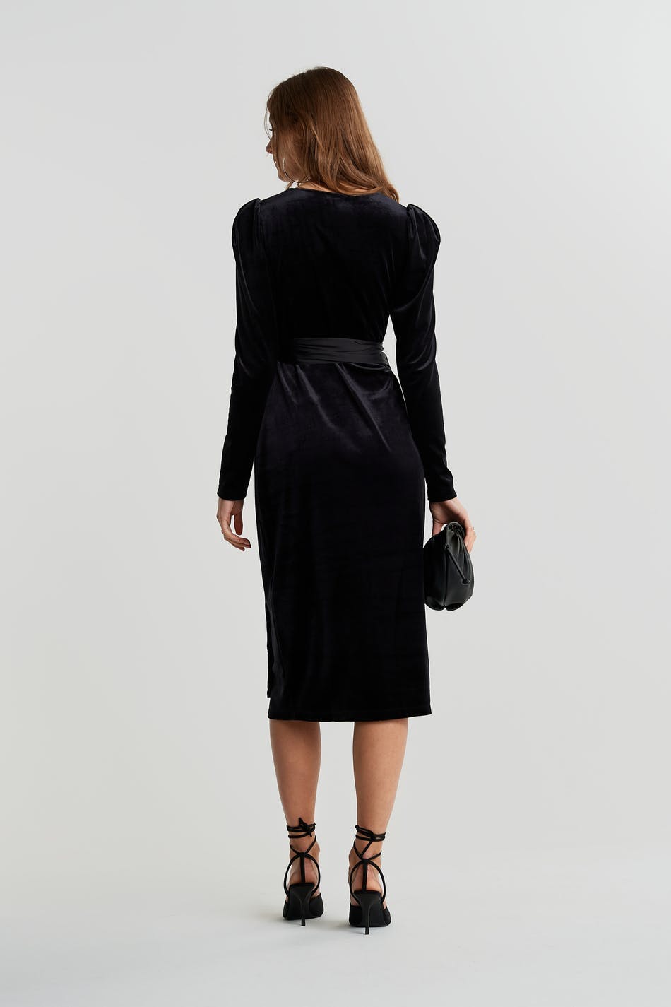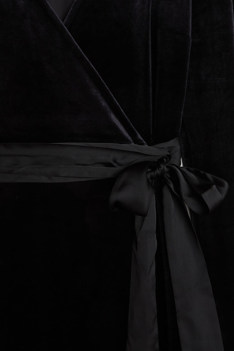 Long-sleeved dress with a regular fit. The dress is perfect for the party and black and has an overlap design. It has a velvet like material and a tie strap at the waist.