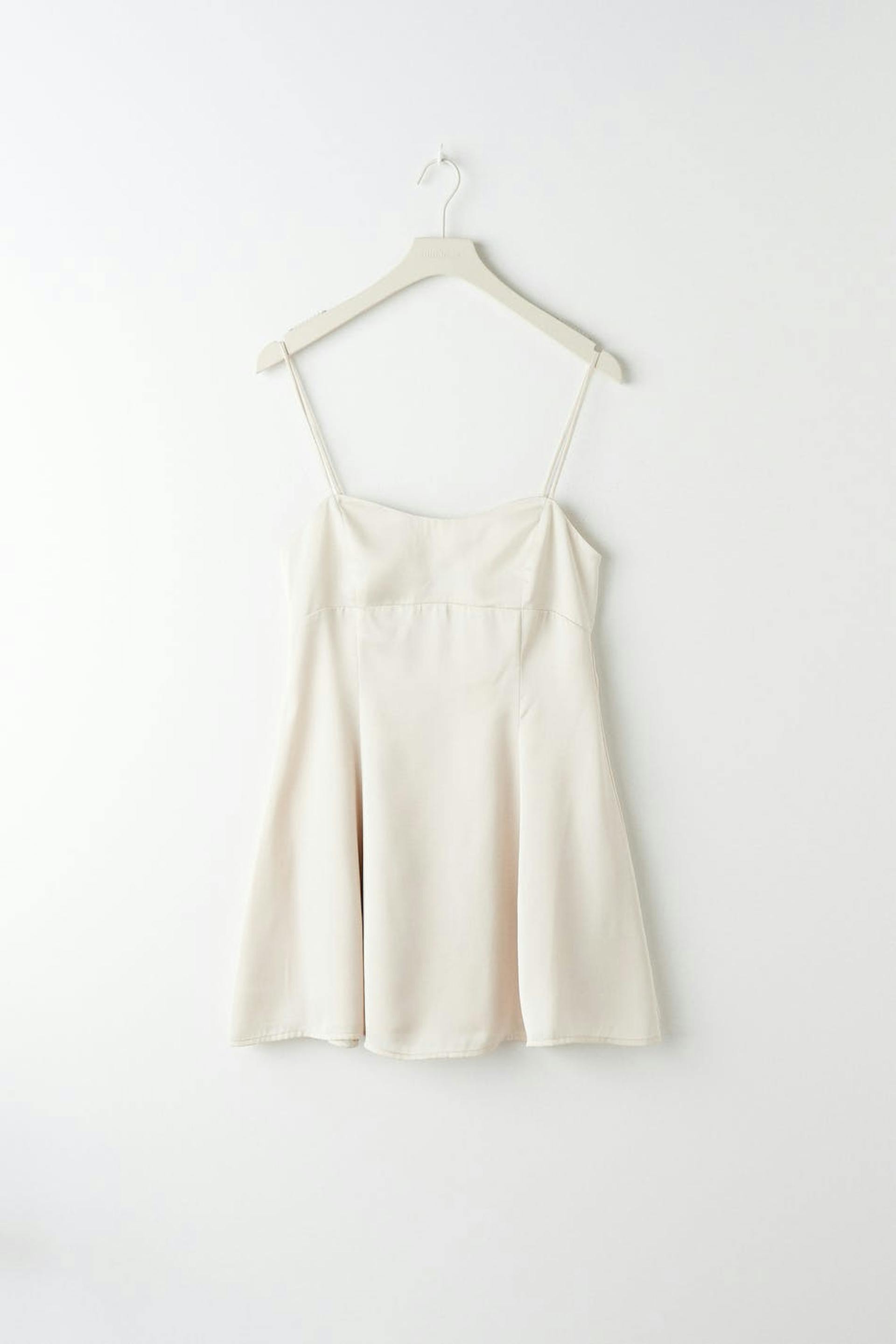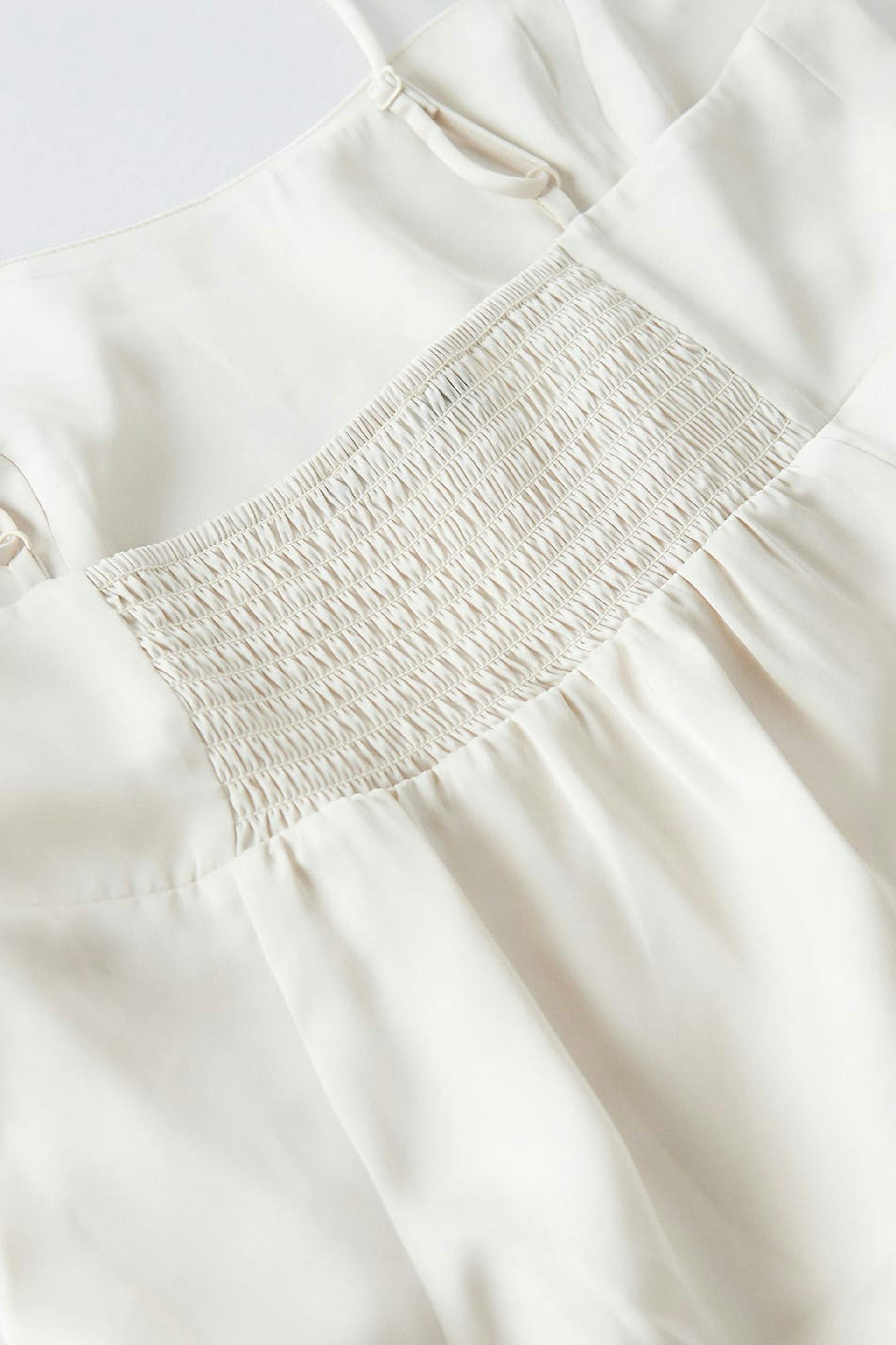 Sleeveless mini dress in satin with a sweetheart neckline. The dress is white and has thin adjustable shoulder straps. It has a smocking in the back with pleat details at the front.