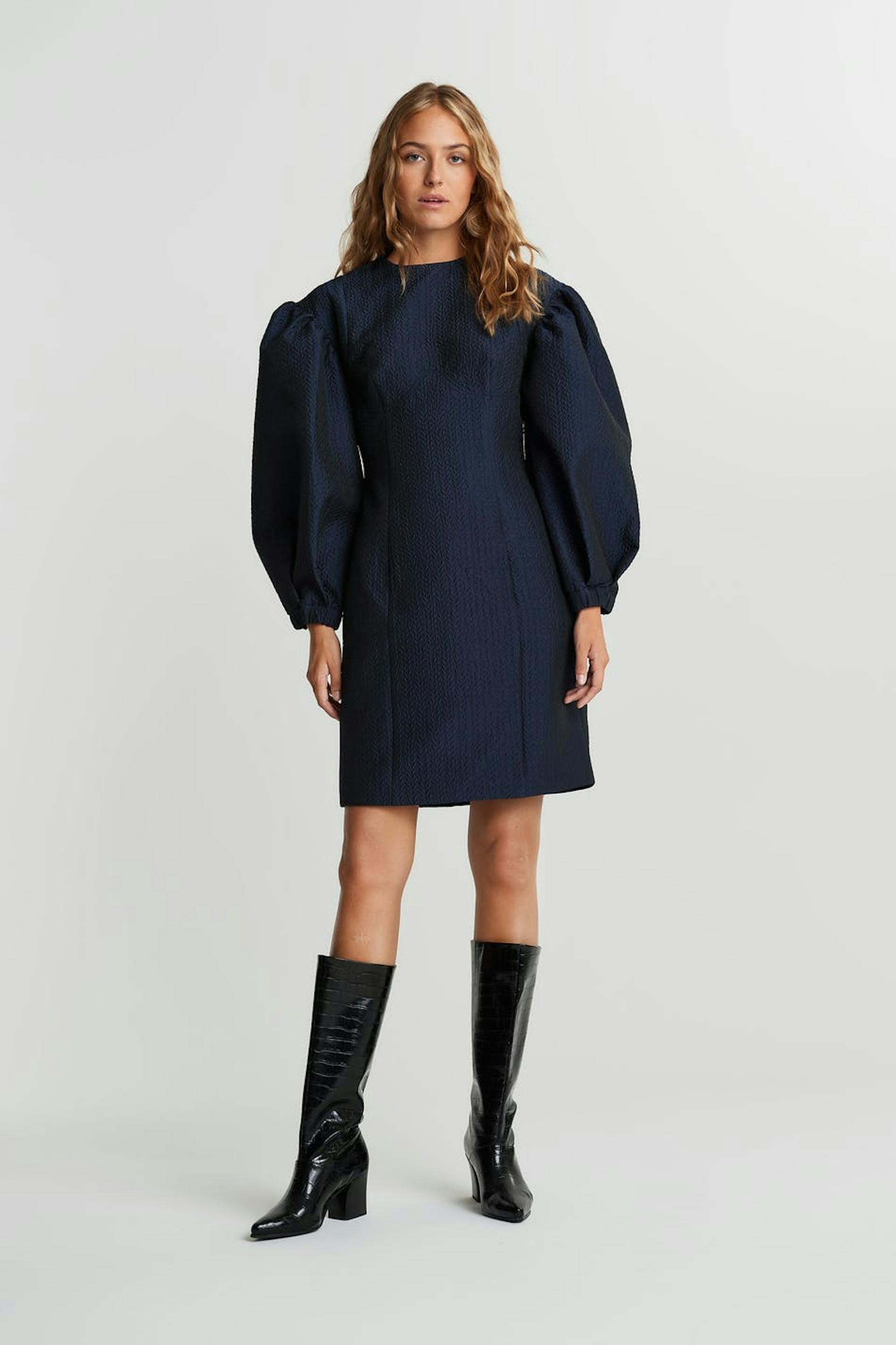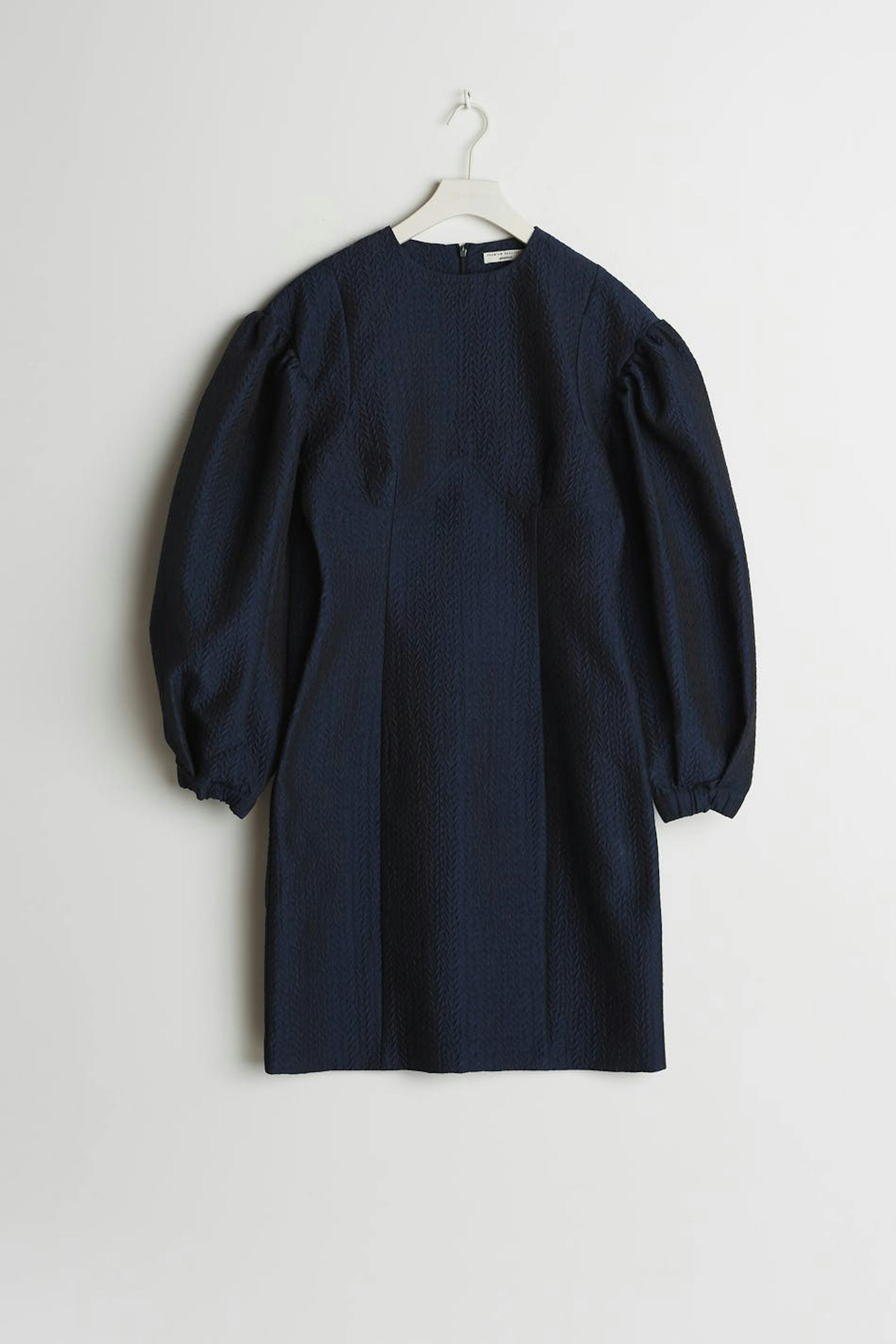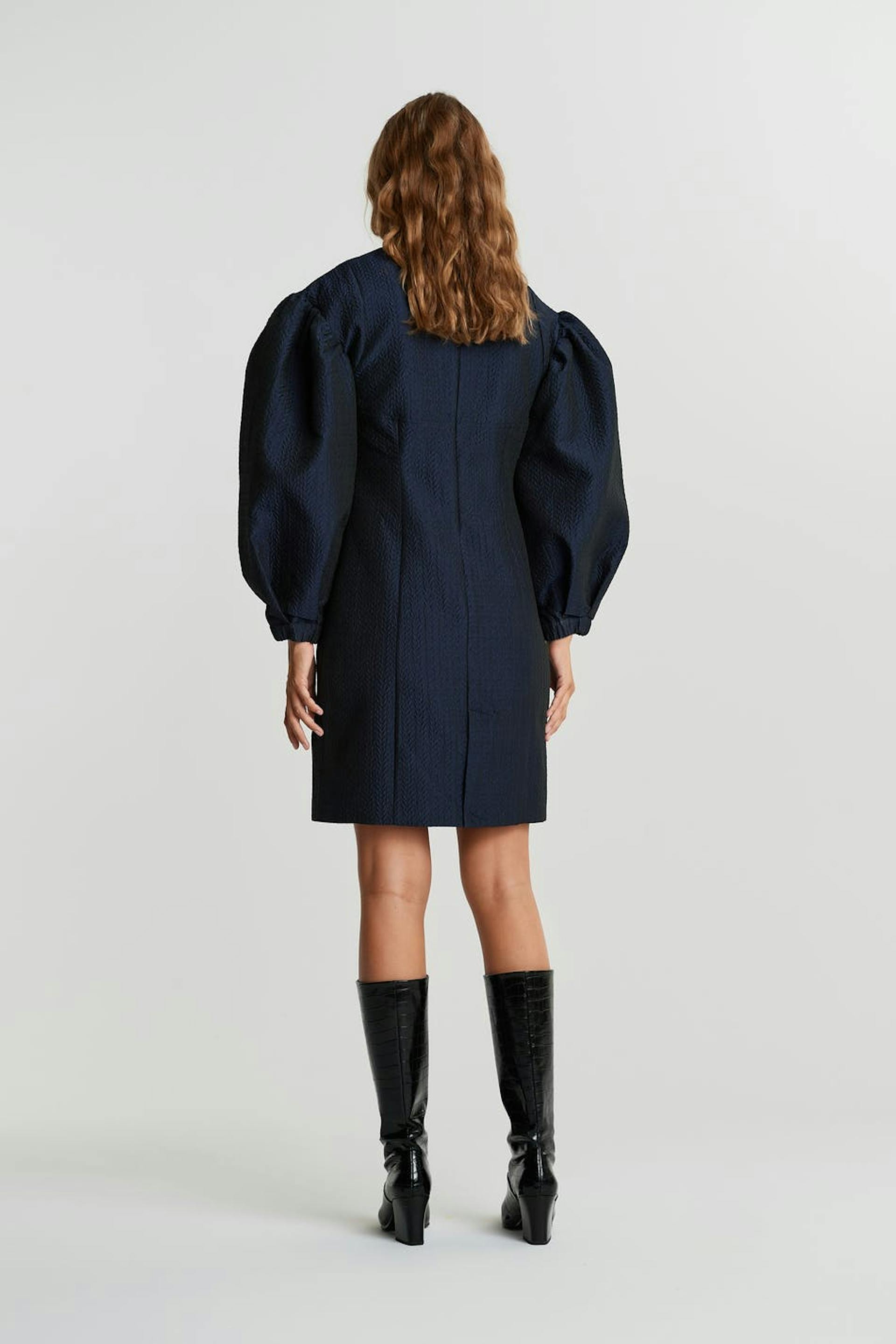 Fitted dress with big, sculpting, long sleeves. The dress is blue and treaded and has a zip in the back. It has seam details on the front and on the back.