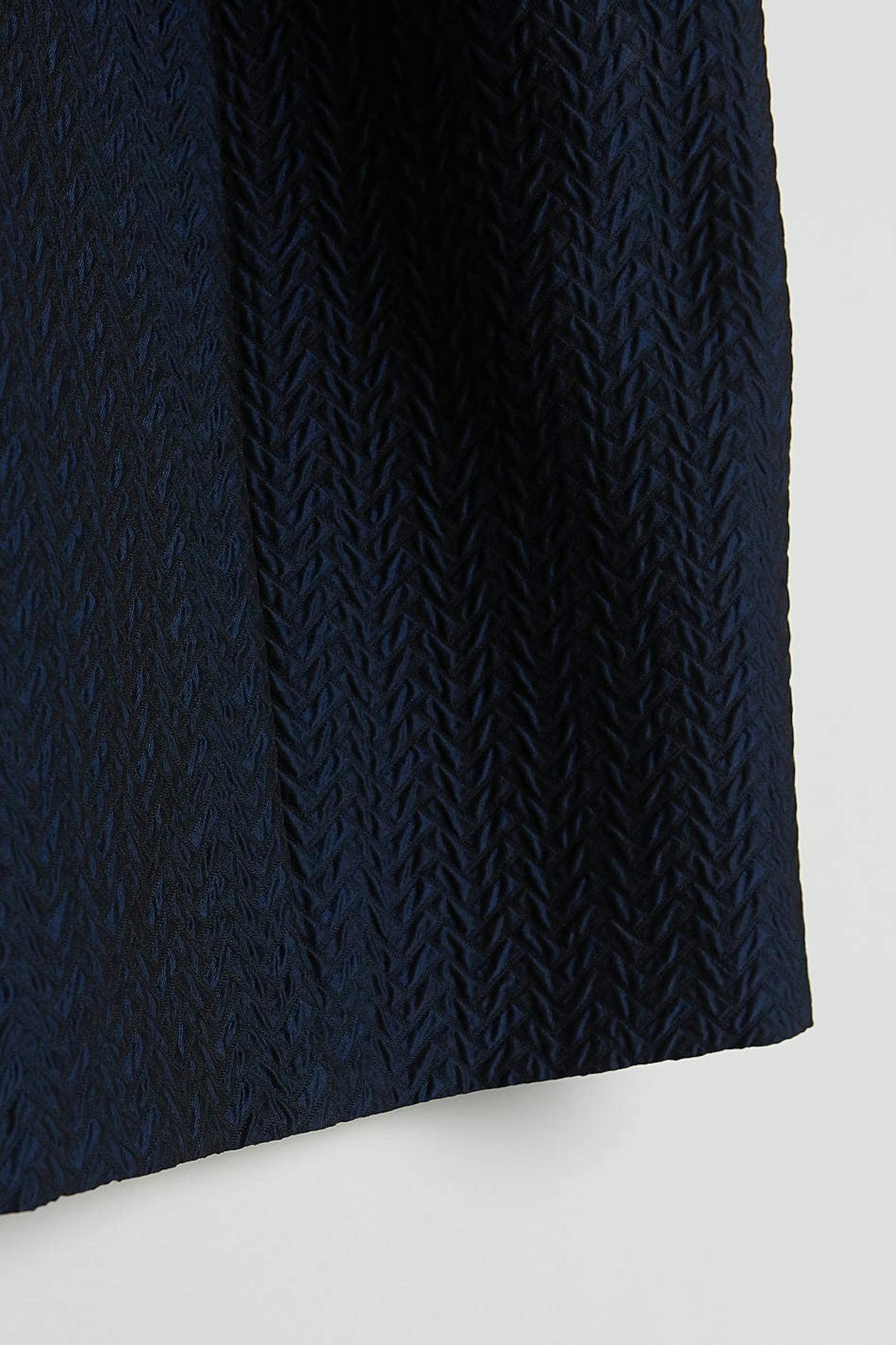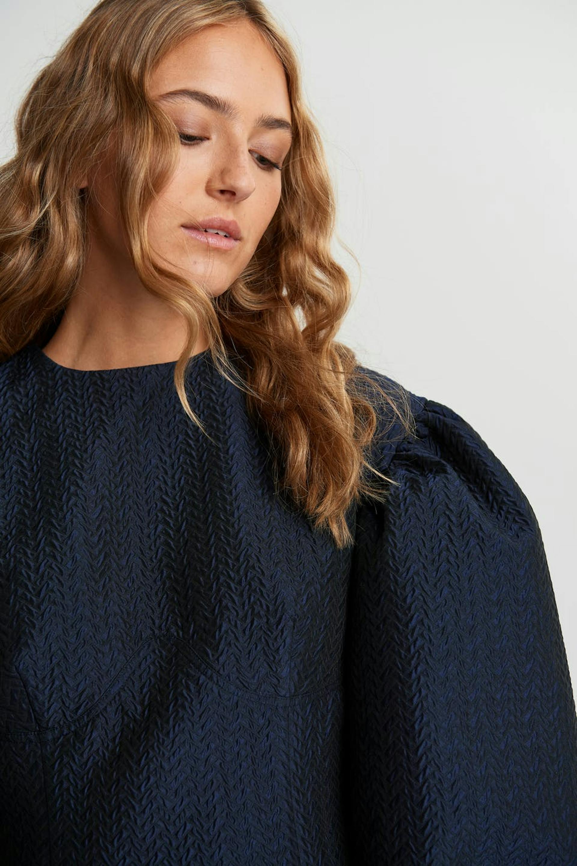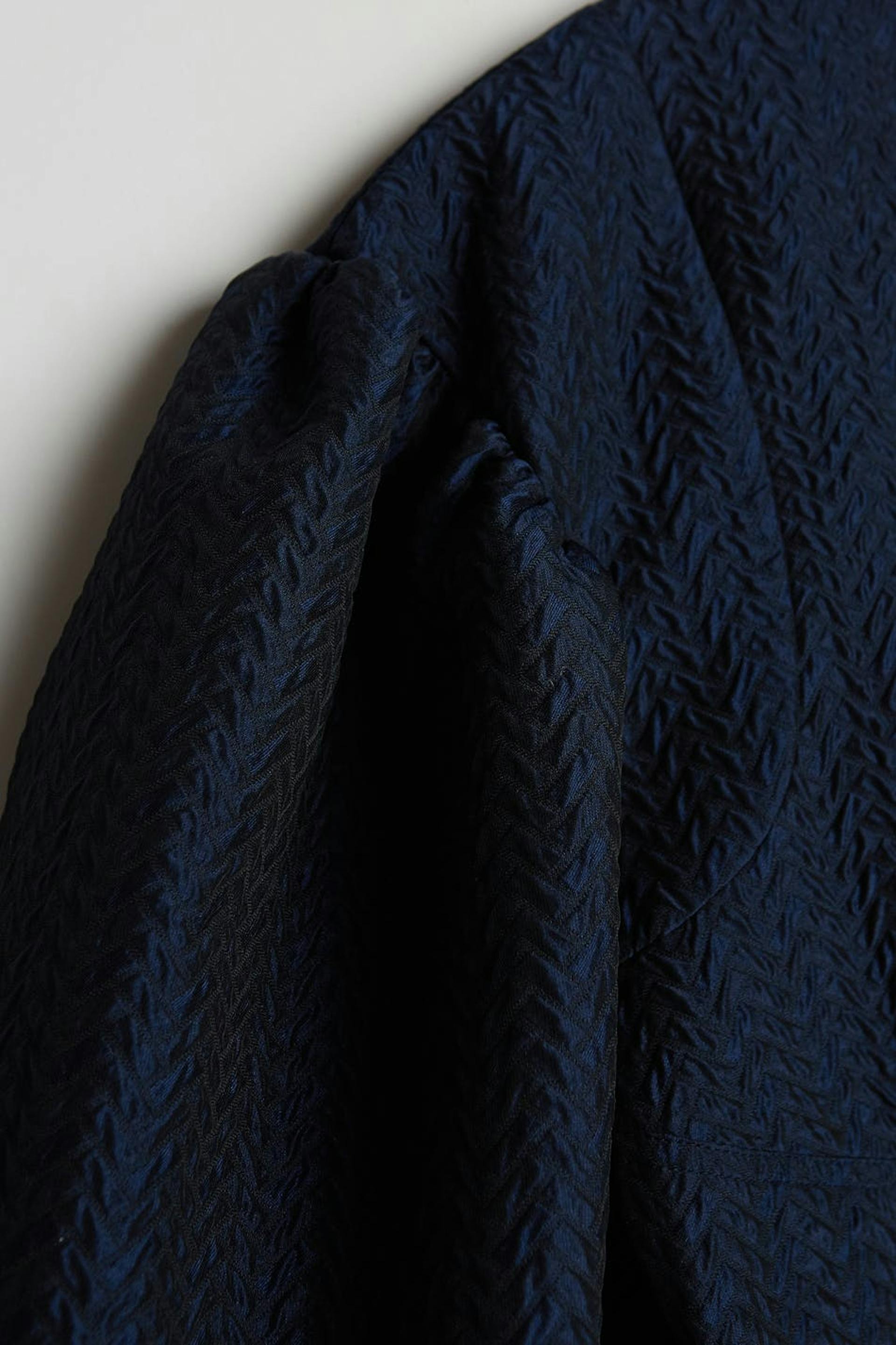 Fitted dress with big, sculpting, long sleeves. The dress is blue and treaded and has a zip in the back. It has seam details on the front and on the back.