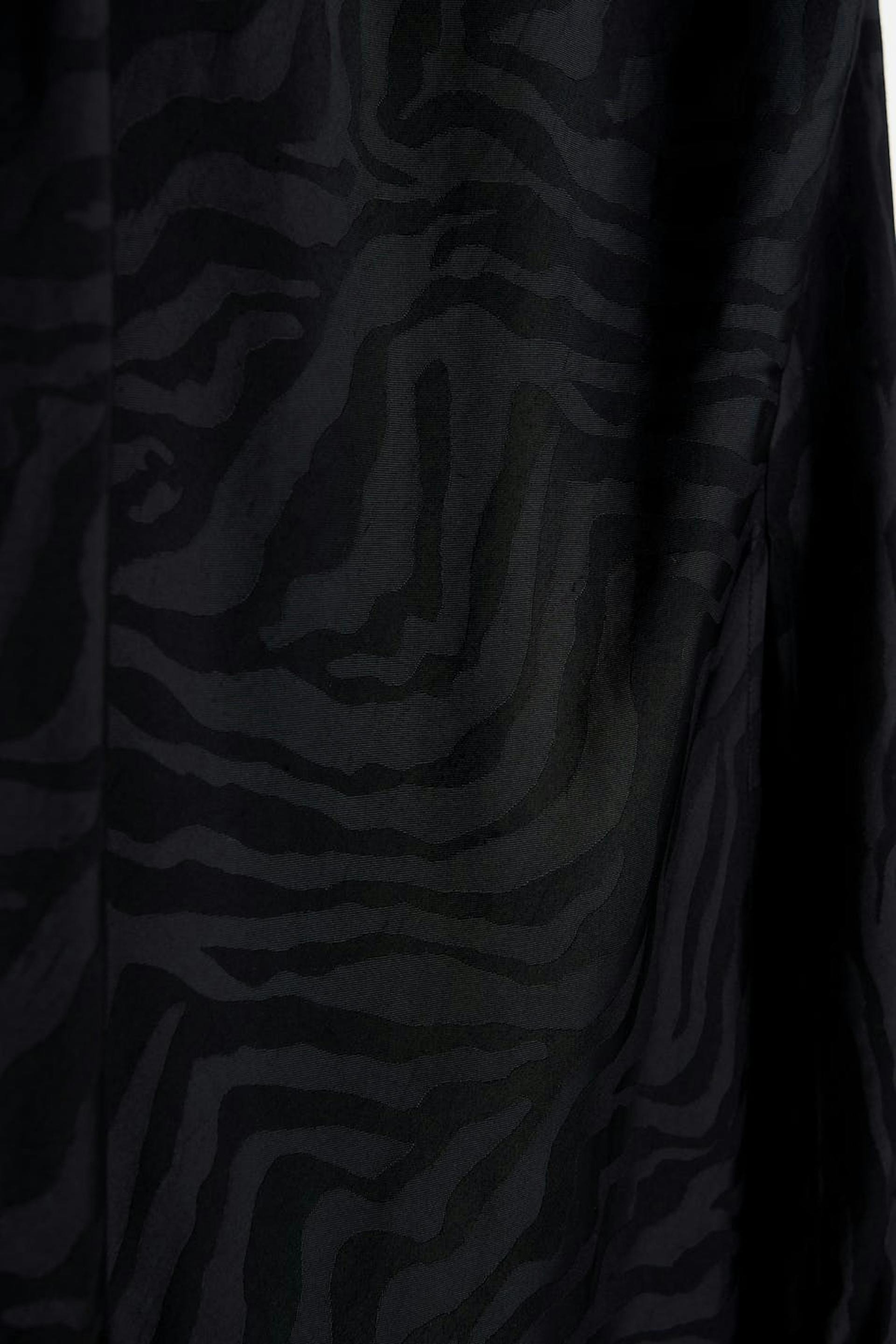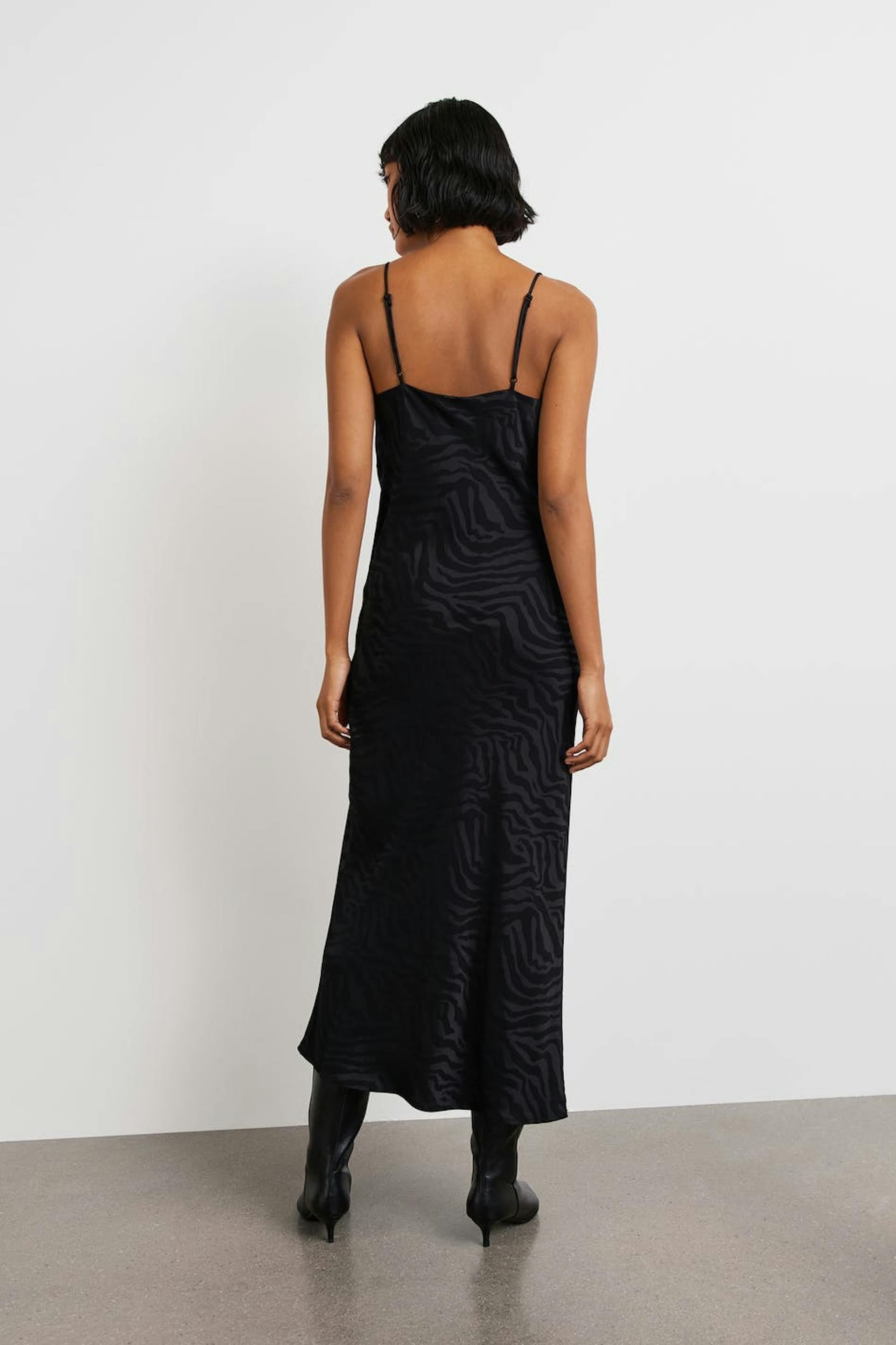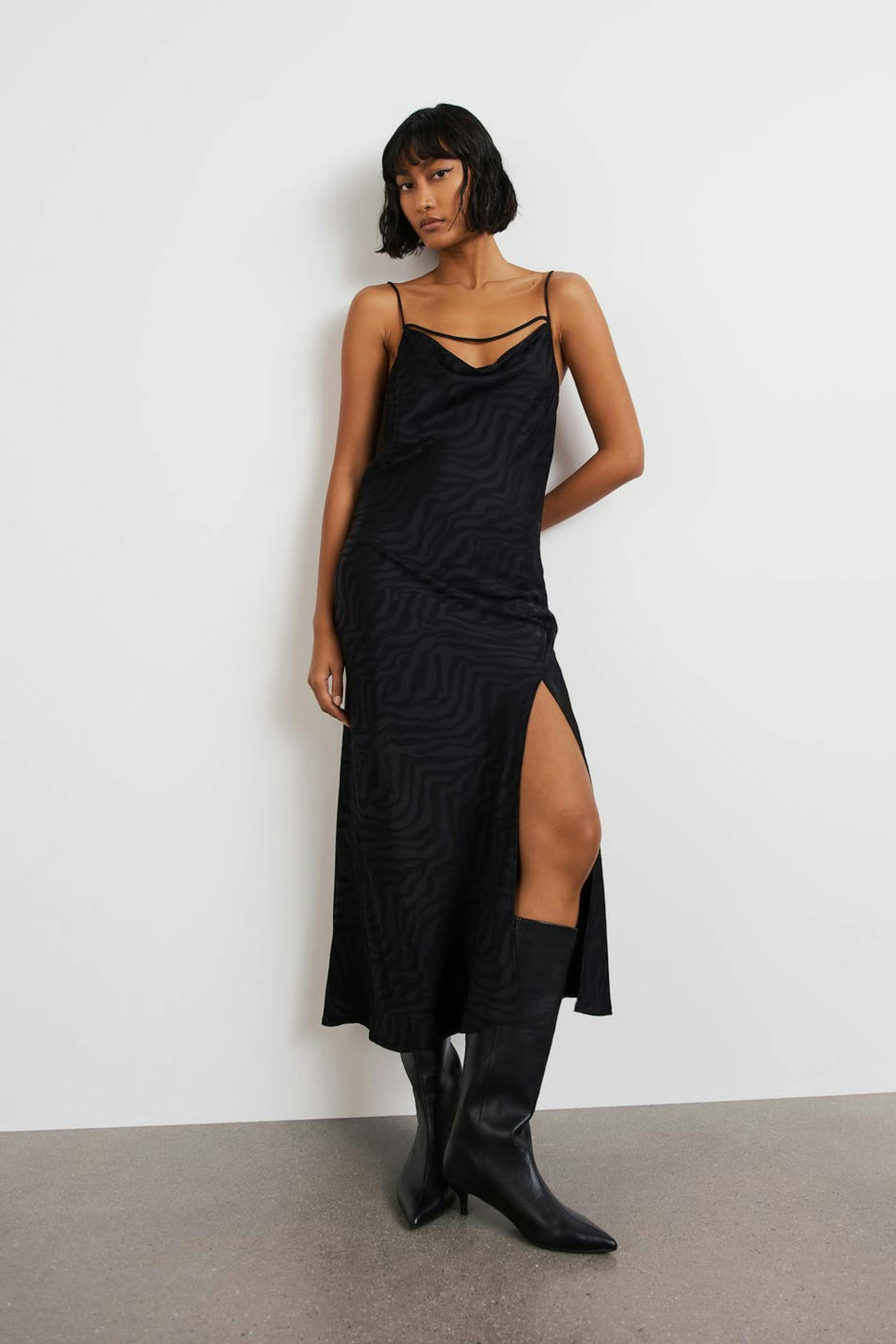 Midi dress with slit at the front. The dress is perfect for the party and has a black, zebra patterned jacquard weave. It has a fitted fit, a draped neckline and thin, adjustable shoulder straps.