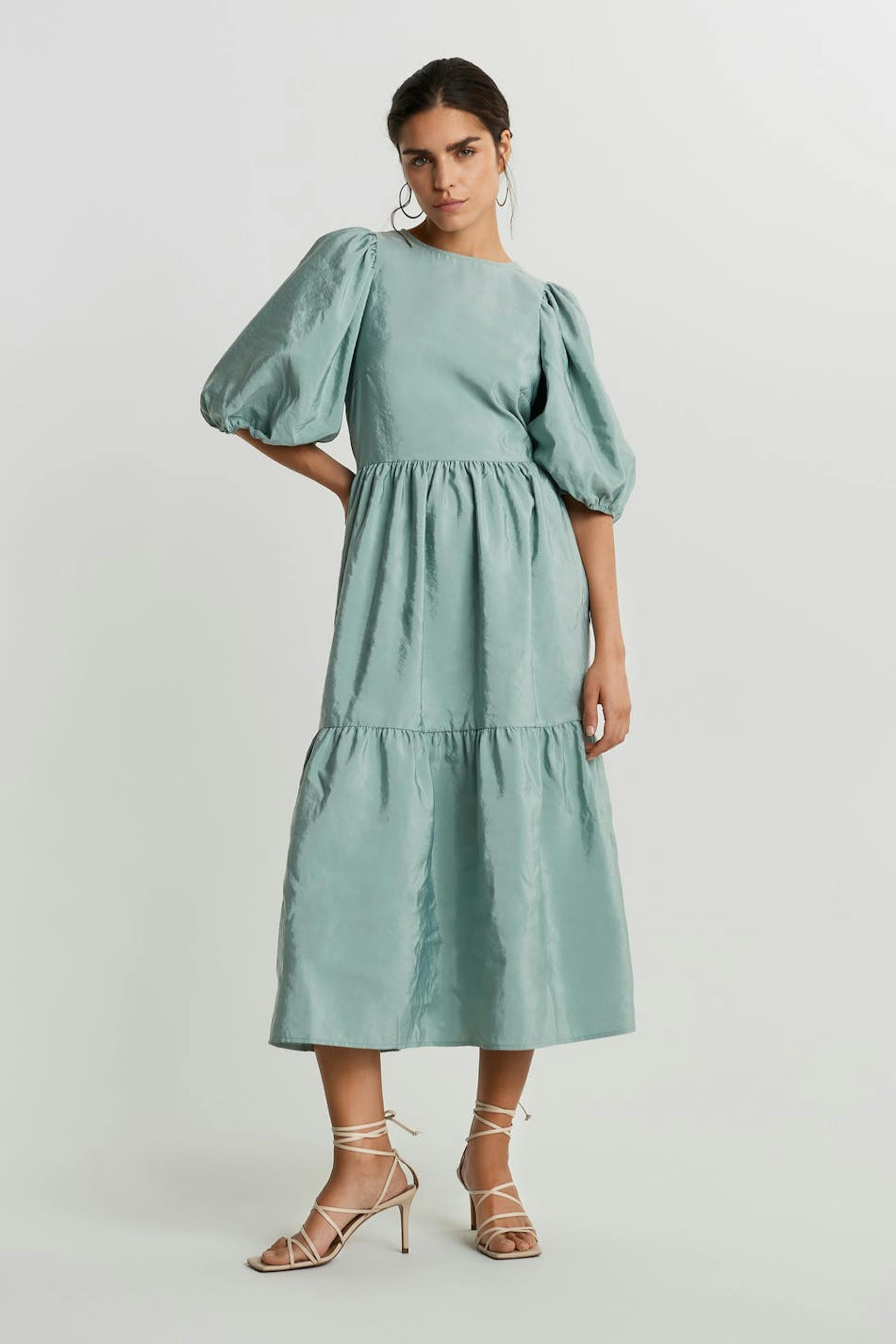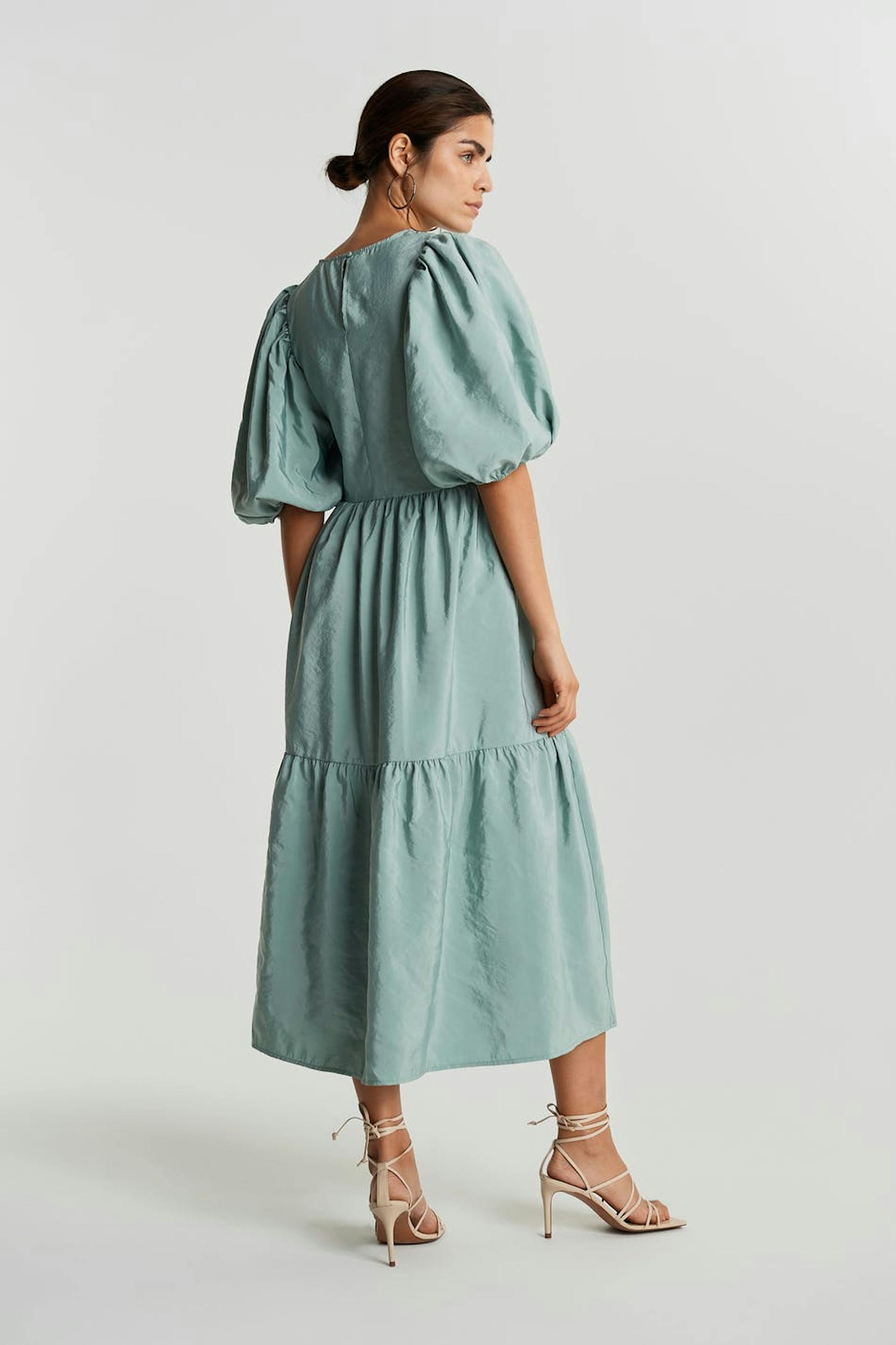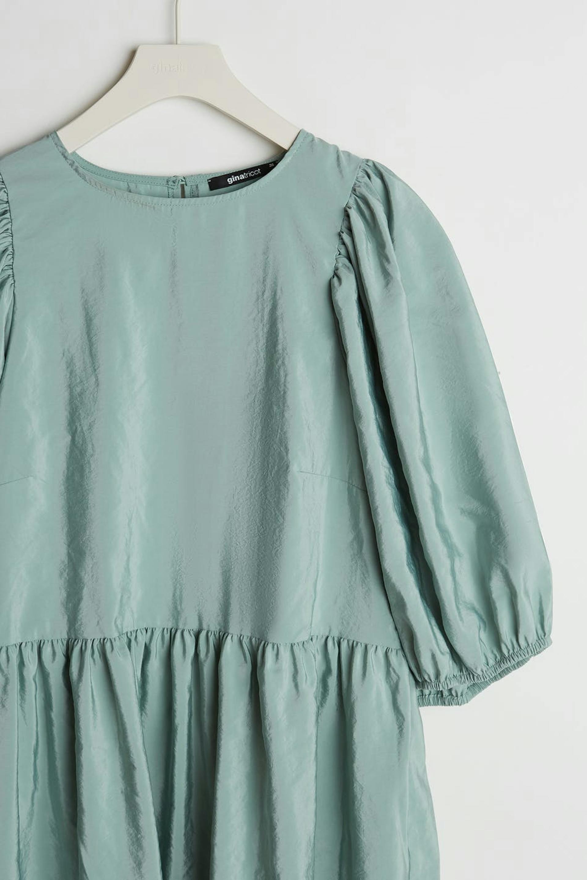 Dress with short balloon sleeves. The dress is blue and has a button at the neck. It has a seam detail at the waist and on the skirt.