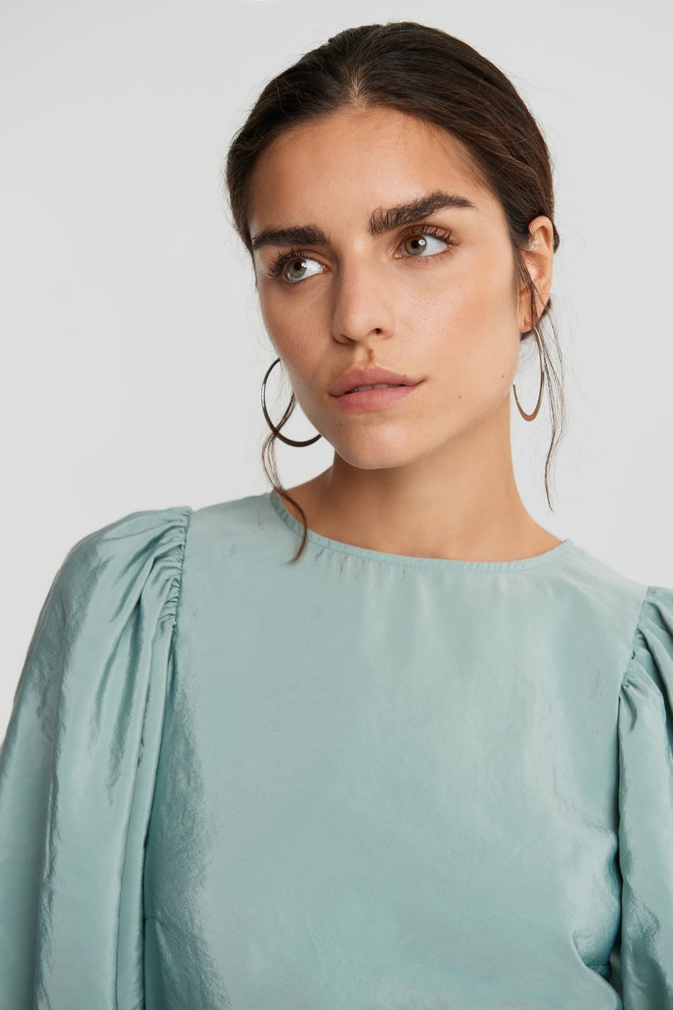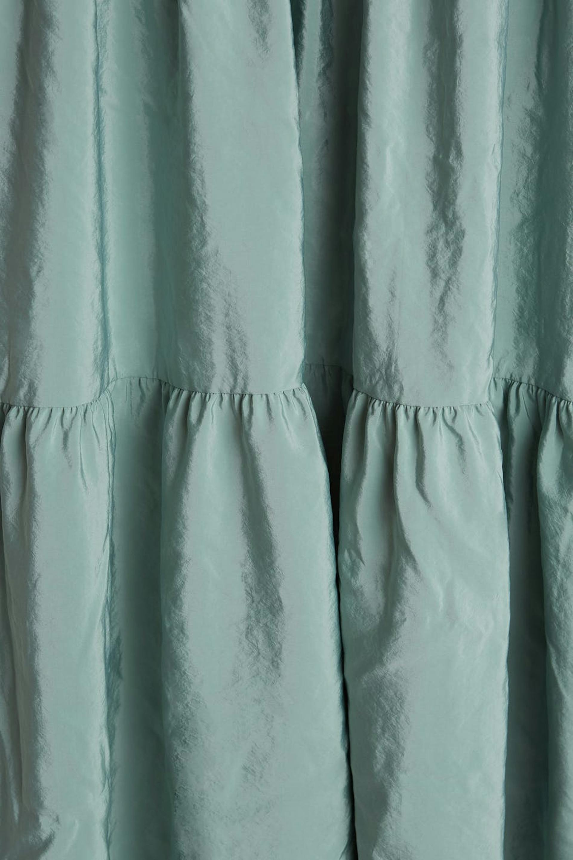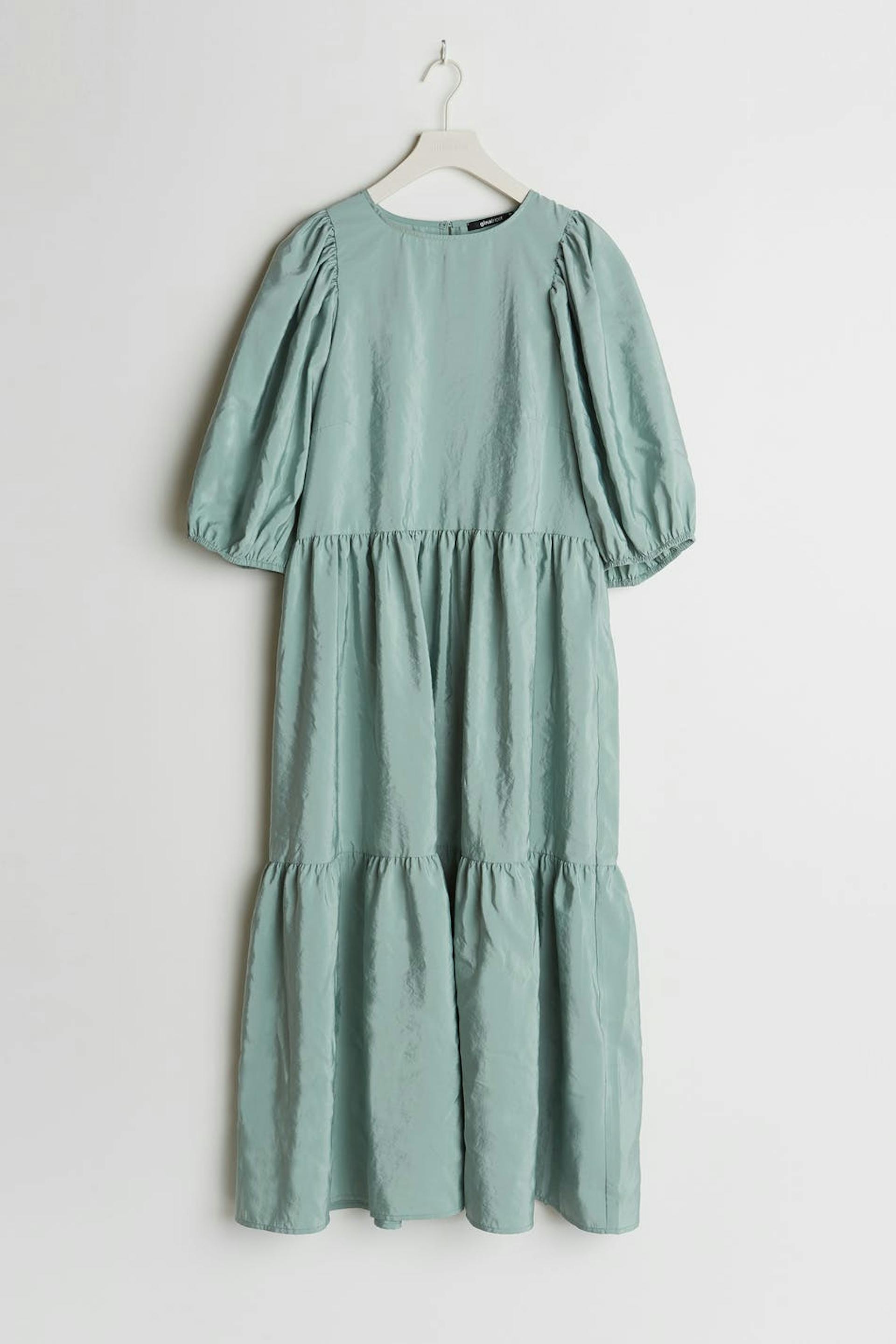 Dress with short balloon sleeves. The dress is blue and has a button at the neck. It has a seam detail at the waist and on the skirt.