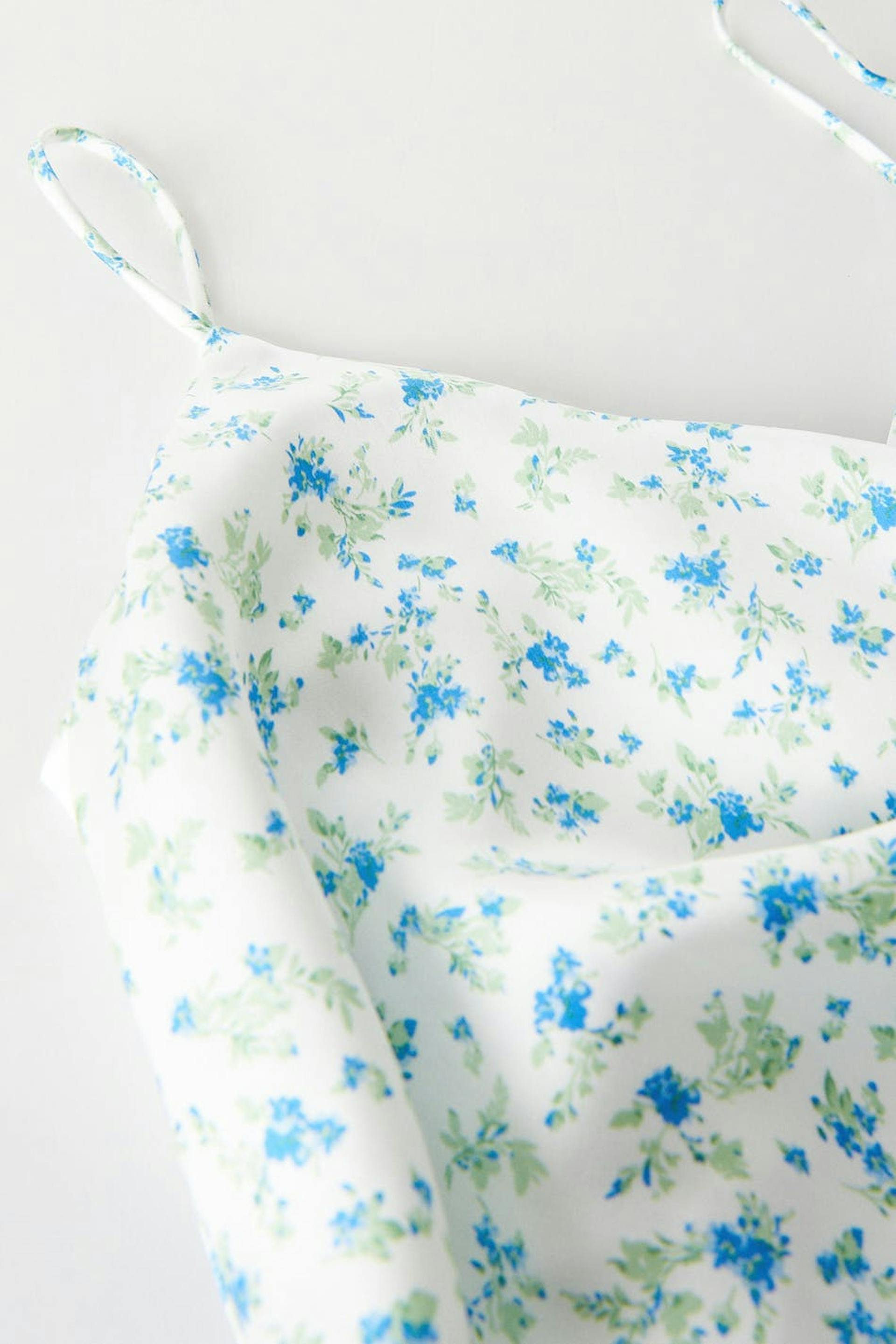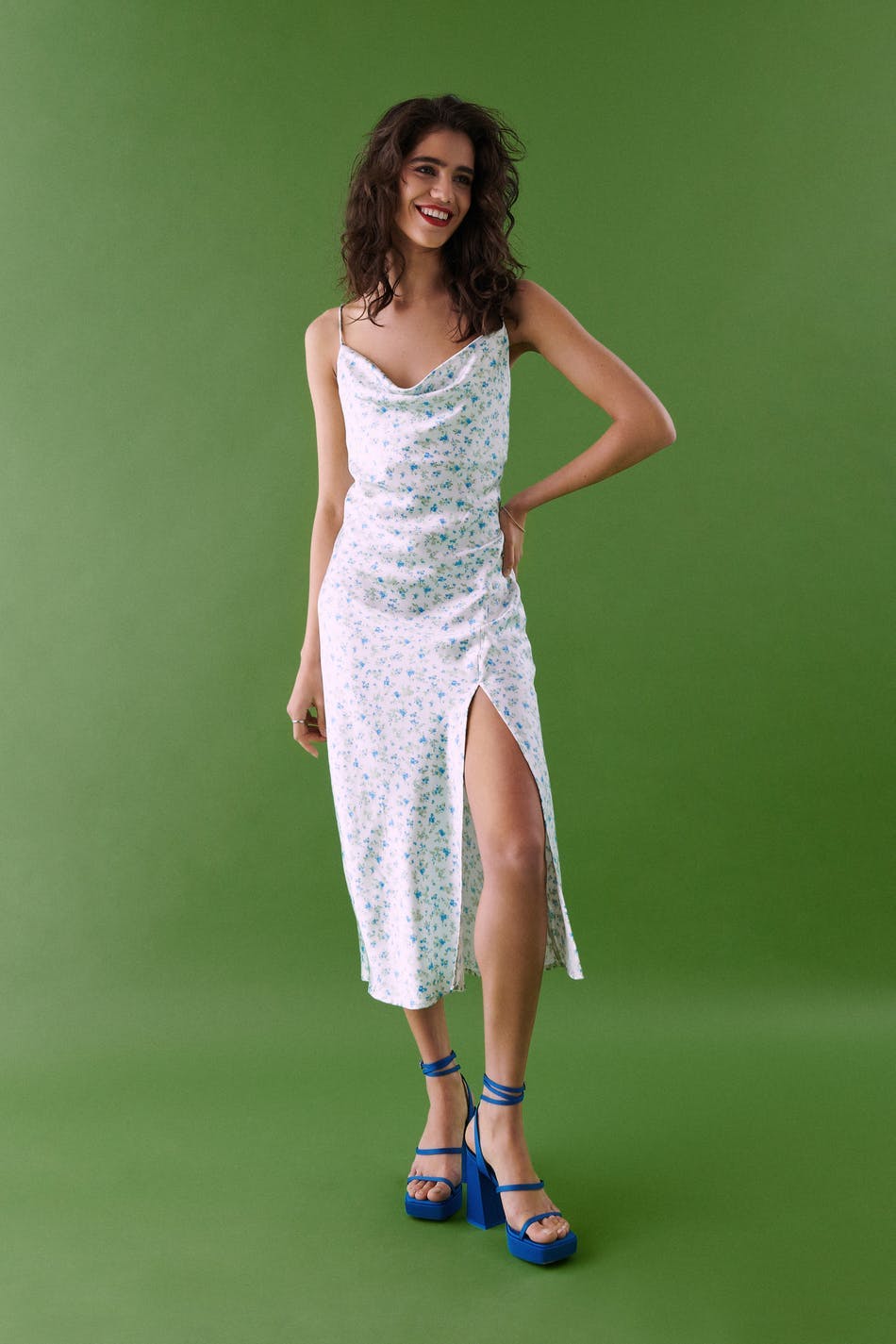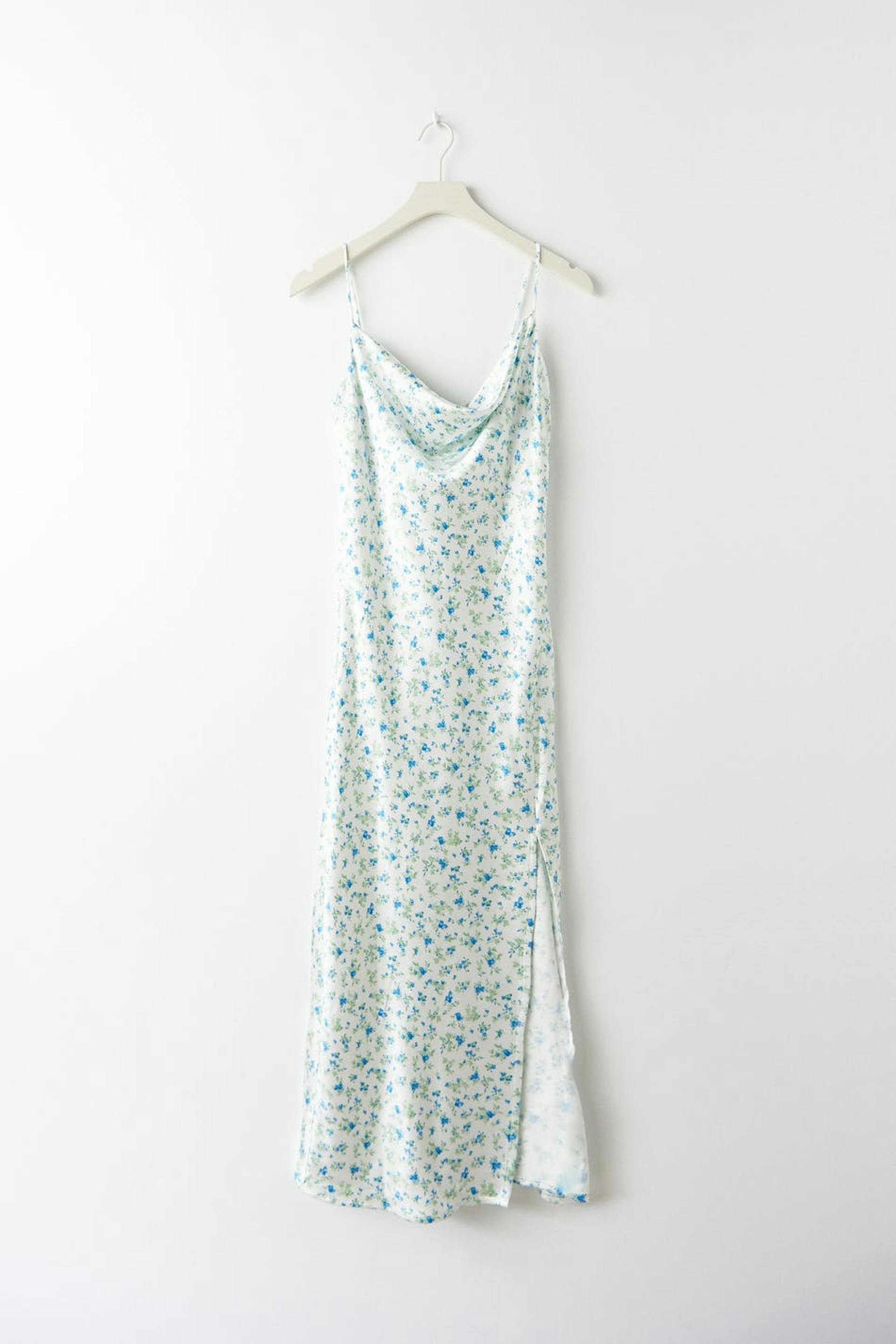 Dress in recycled polyester with cowl neck. The dress is perfect for the party and blue and has a high slit at the side. It has thin, adjustable shoulder straps and a shiny material in satin.