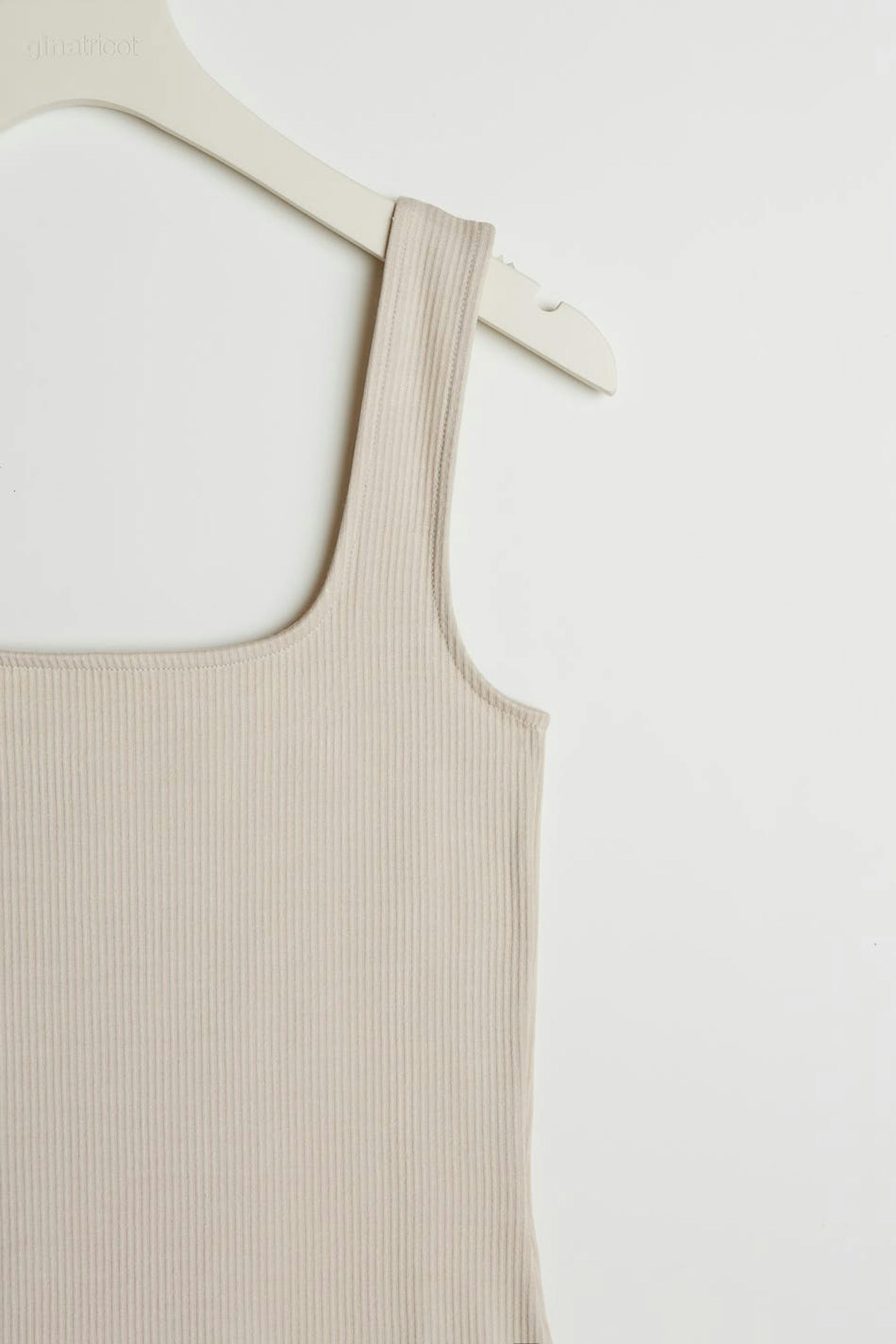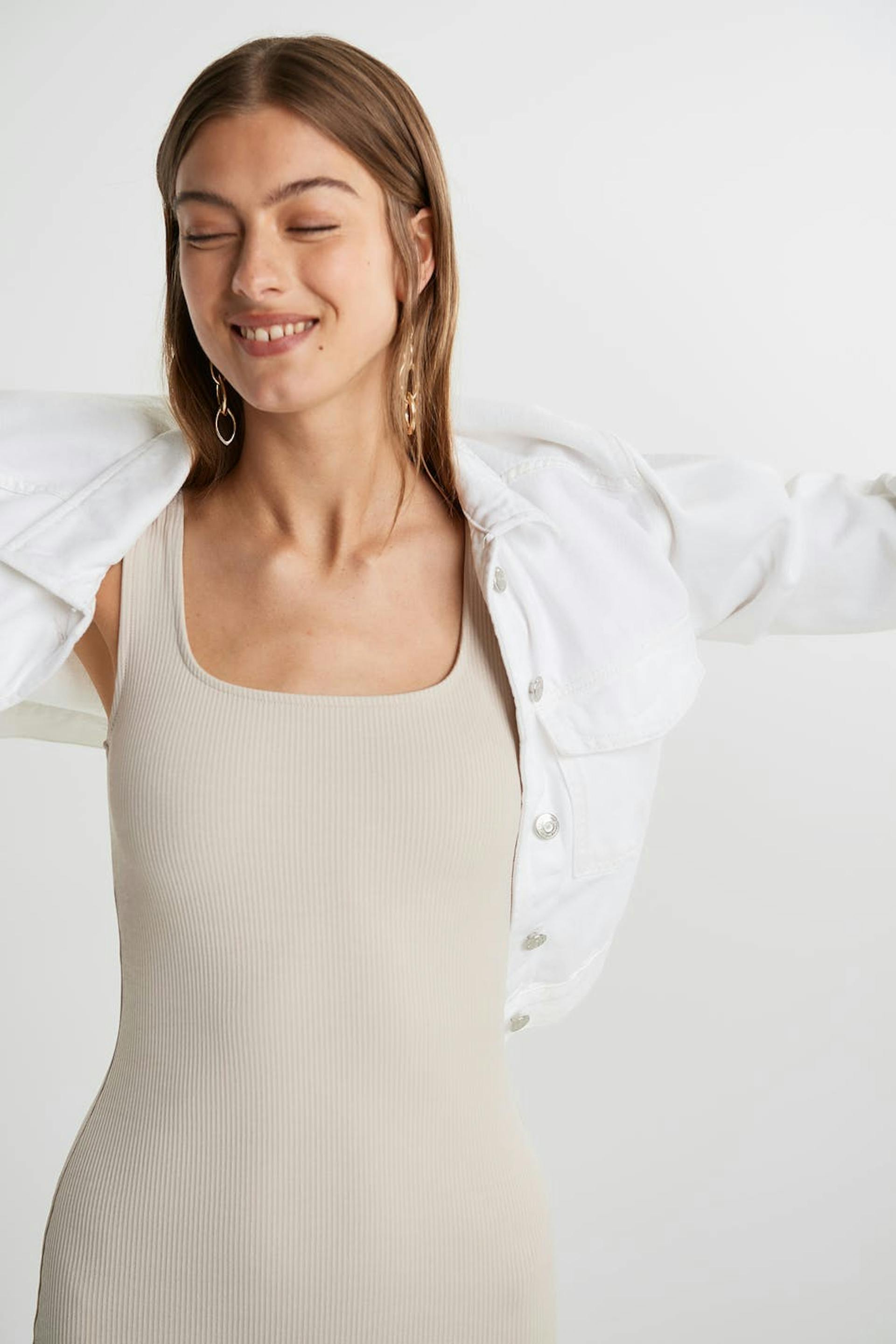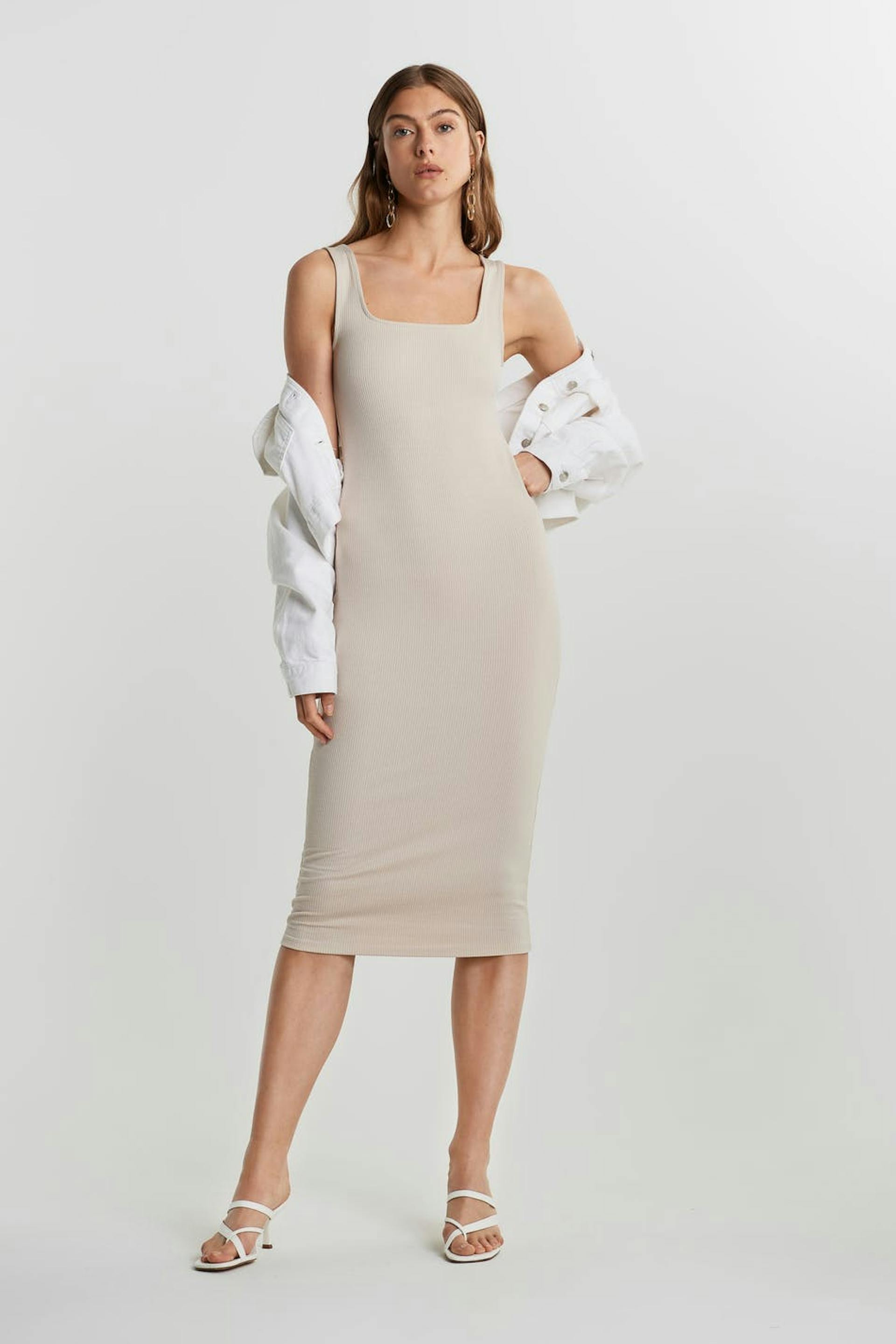 Rib-knit dress with a fitted fit. The dress is beige and calf-length and has a square neckline. It has a fitted fit.
