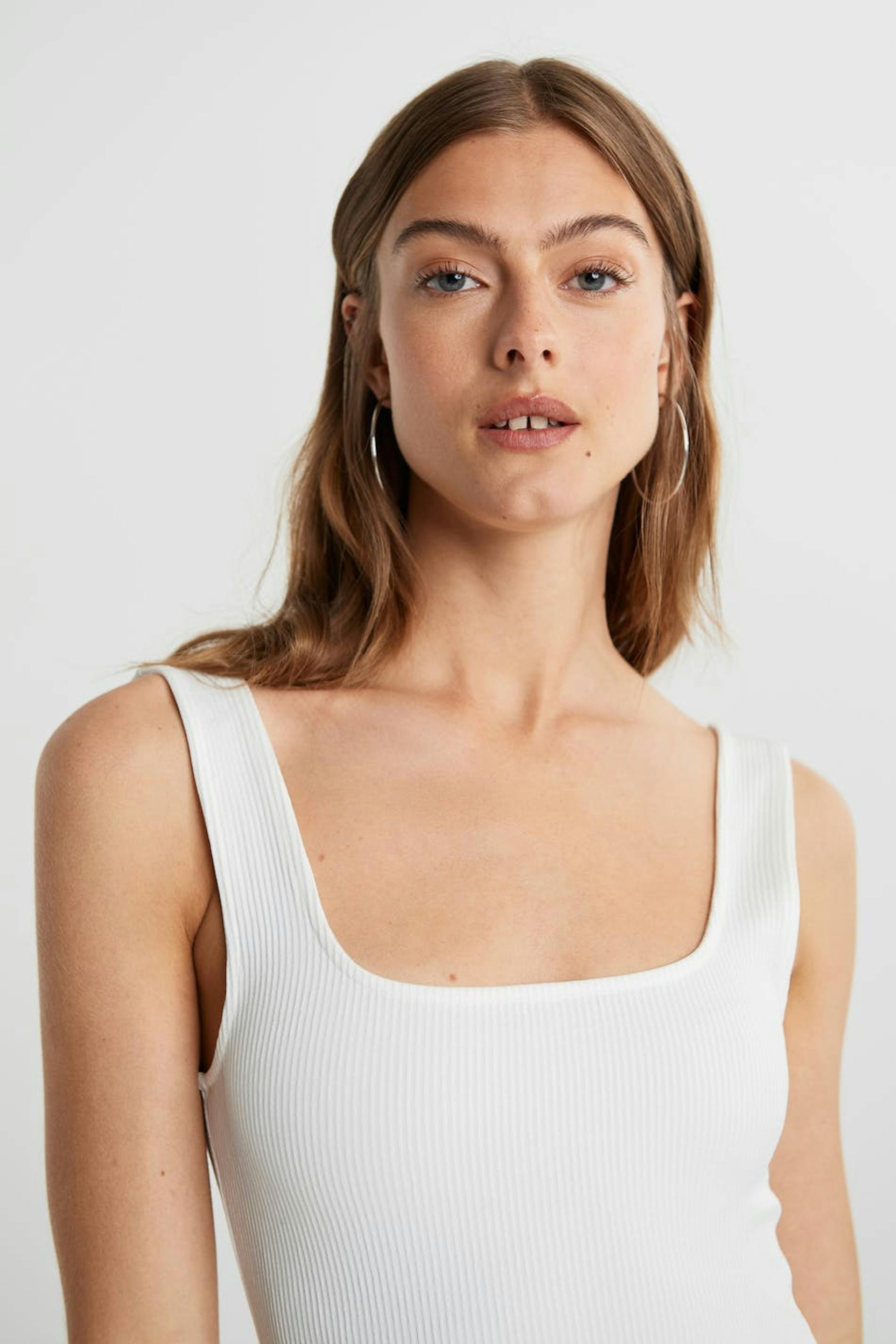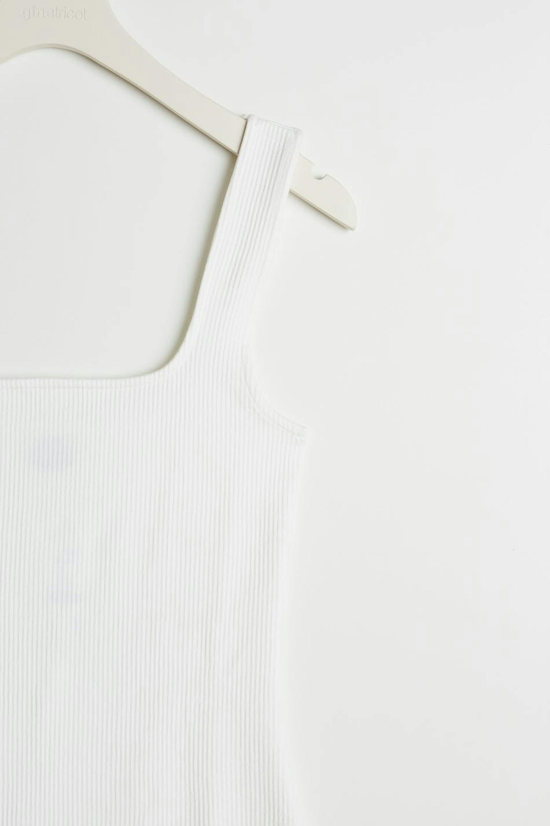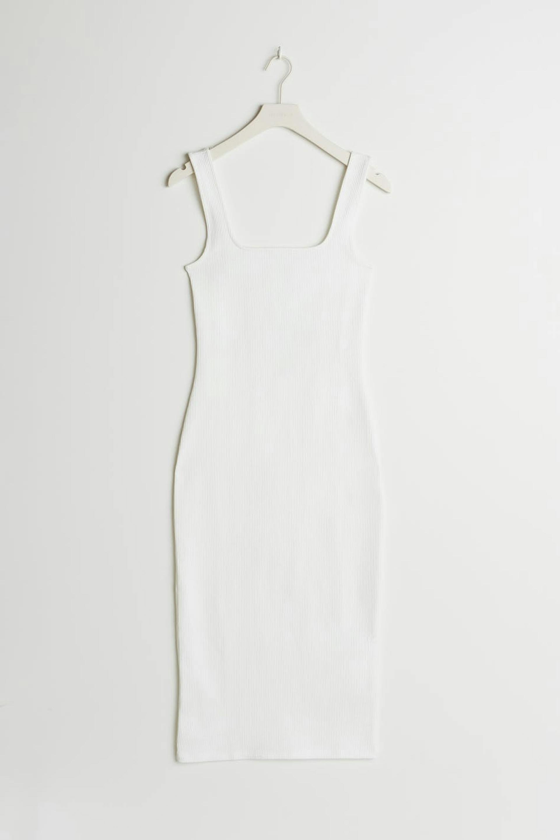 Rib-knit dress with a fitted fit. The dress is white and calf-length and has a square neckline. It has a fitted fit.