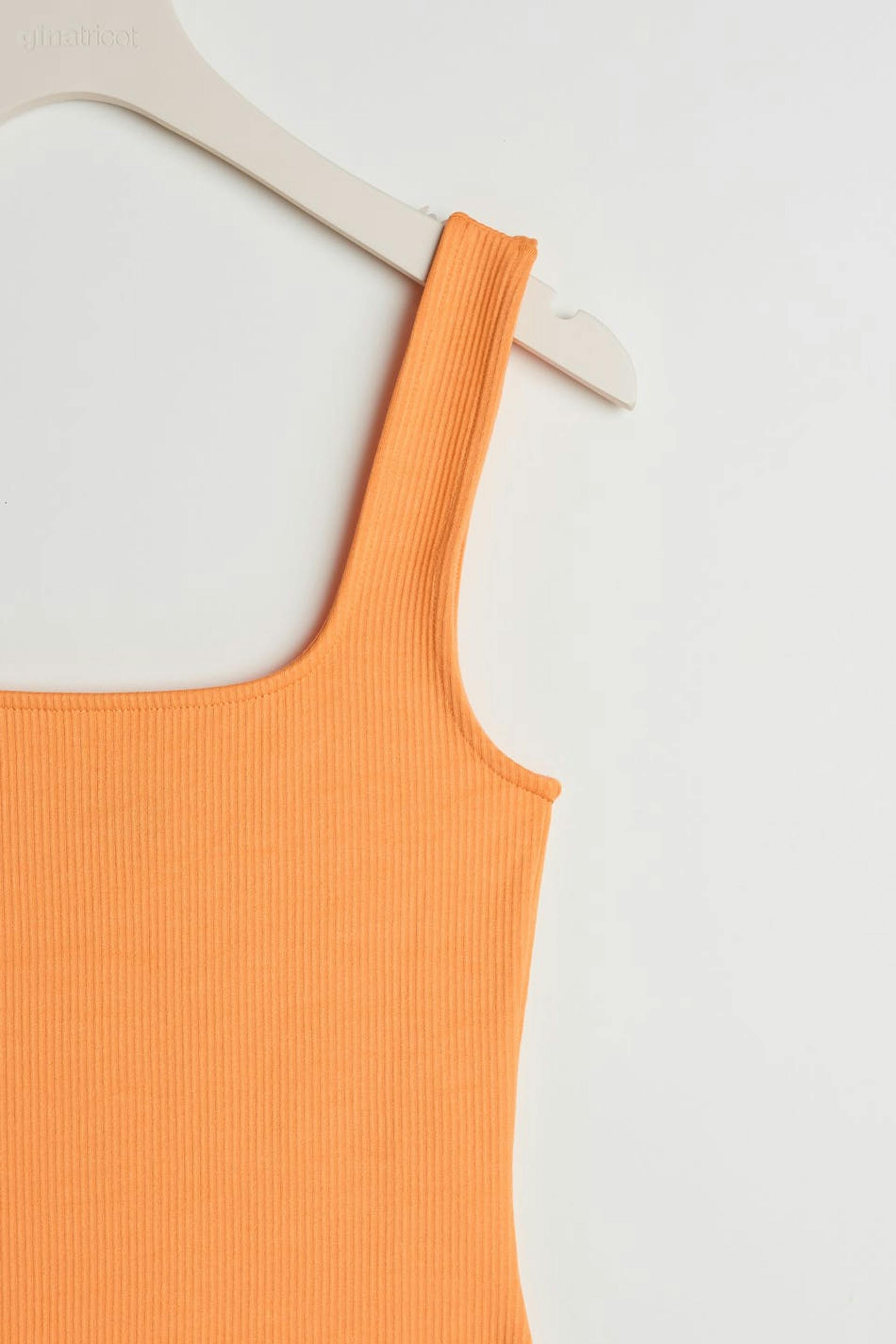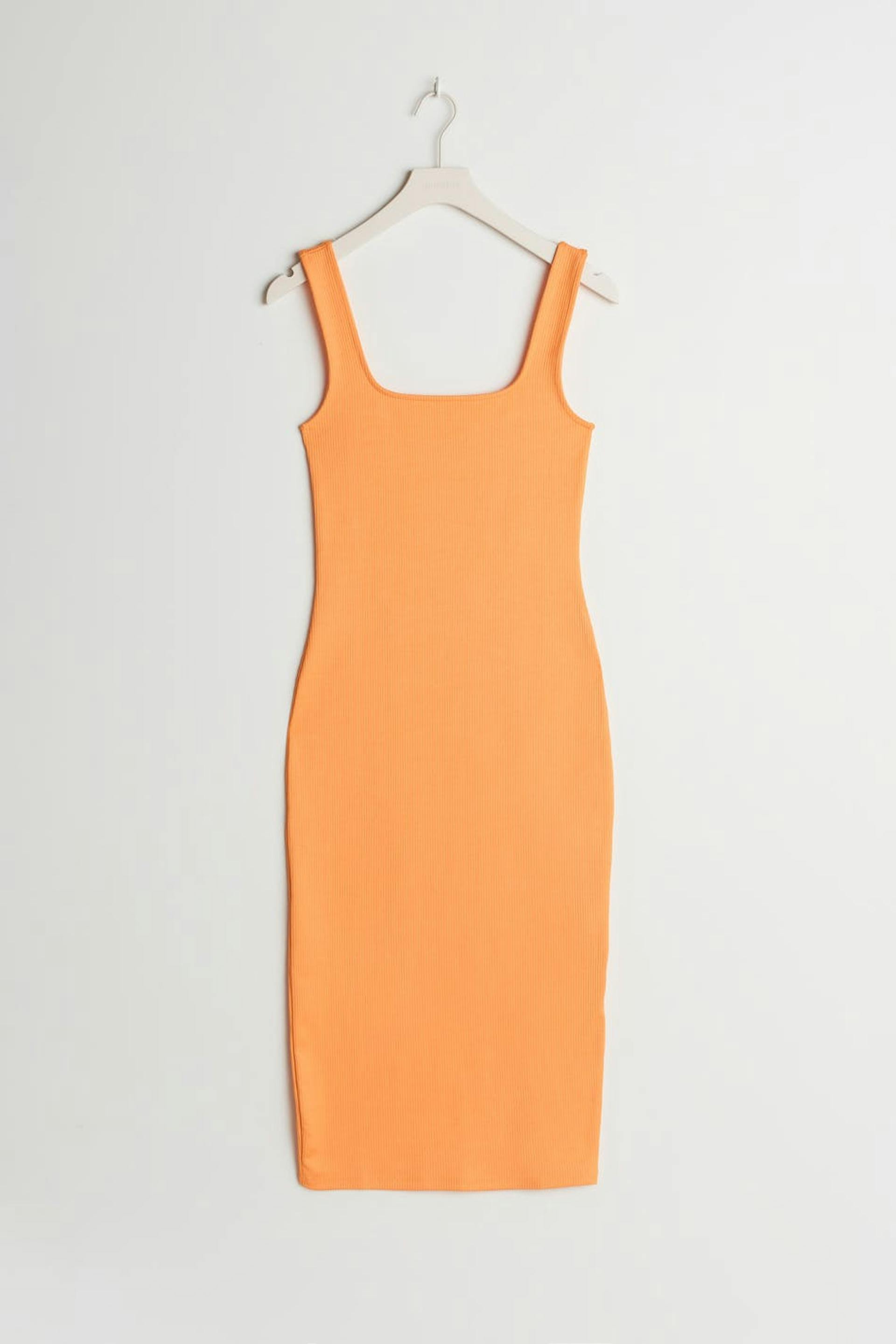Rib-knit dress with a fitted fit. The dress is orange and calf-length and has a square neckline.
