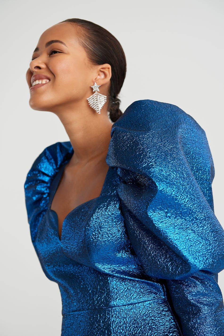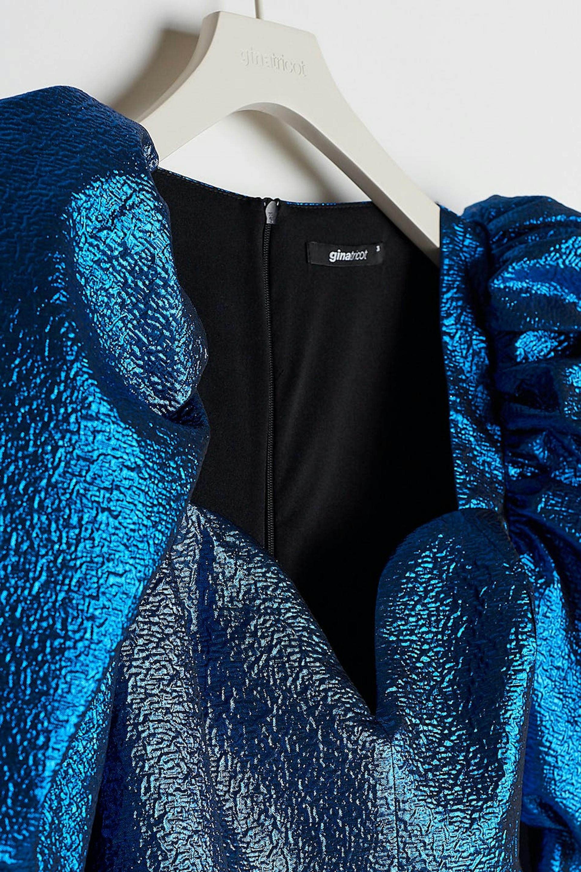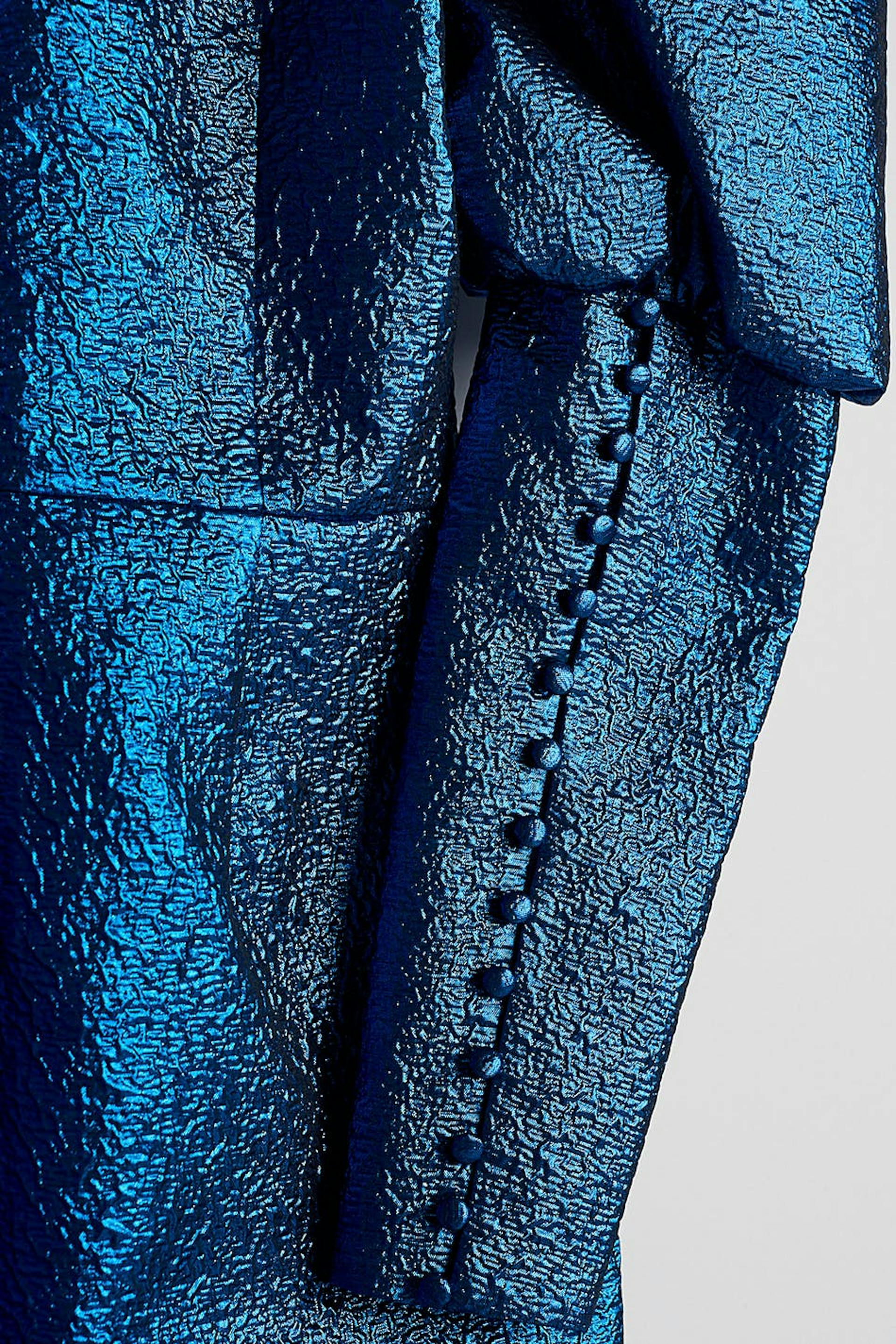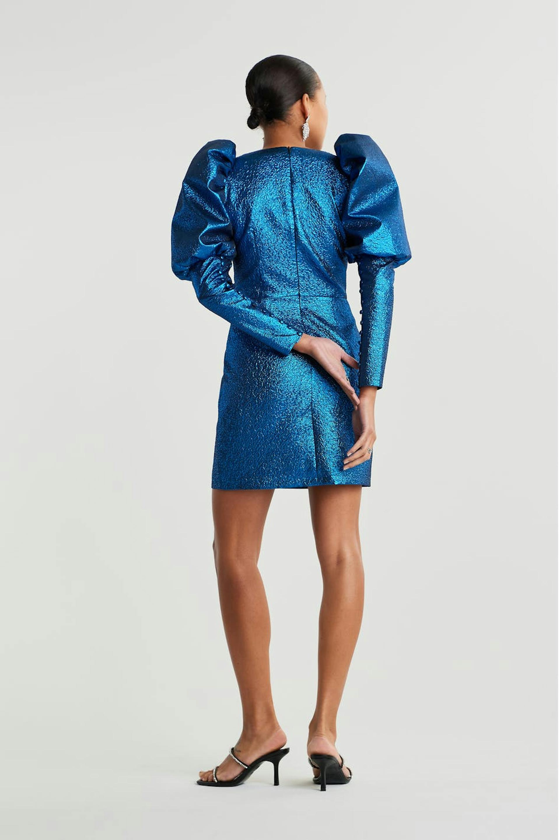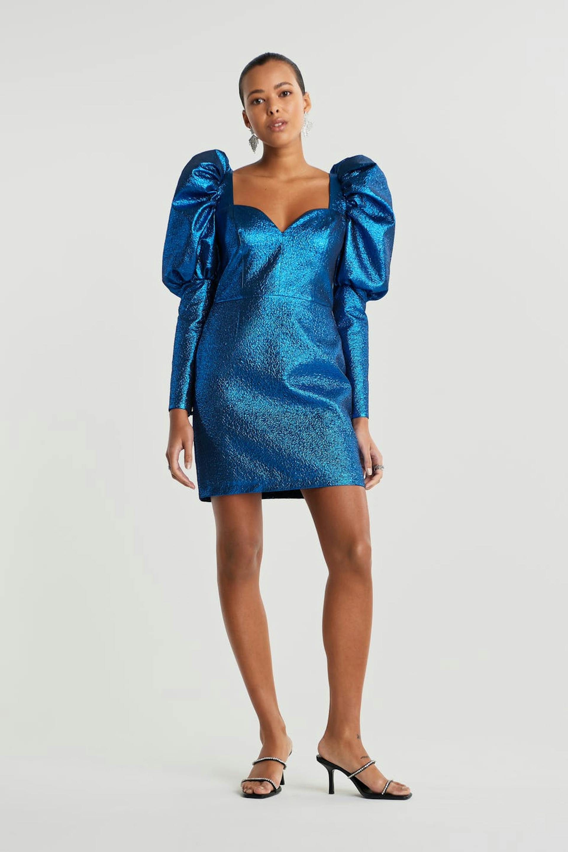 Shimmering dress with long, tapered puff sleeves with fabric covered cufflinks along each sleeve. The dress is perfect for the party, blue and short. It has a sweetheart neckline and a zip in the back. Online exclusive.