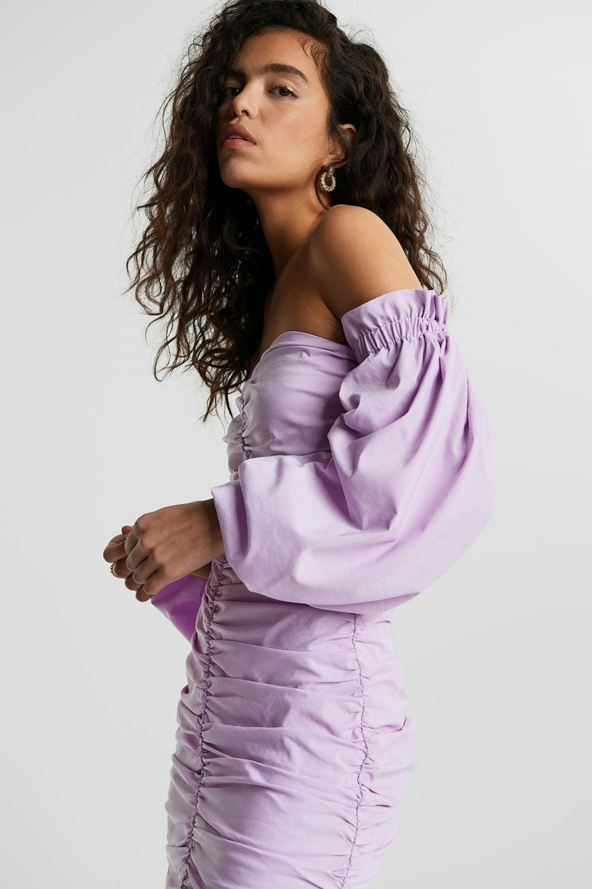 Woven off shoulder dress. Long balloon sleeves. Tight fit with gathering at center front. Supplier: Production unit: