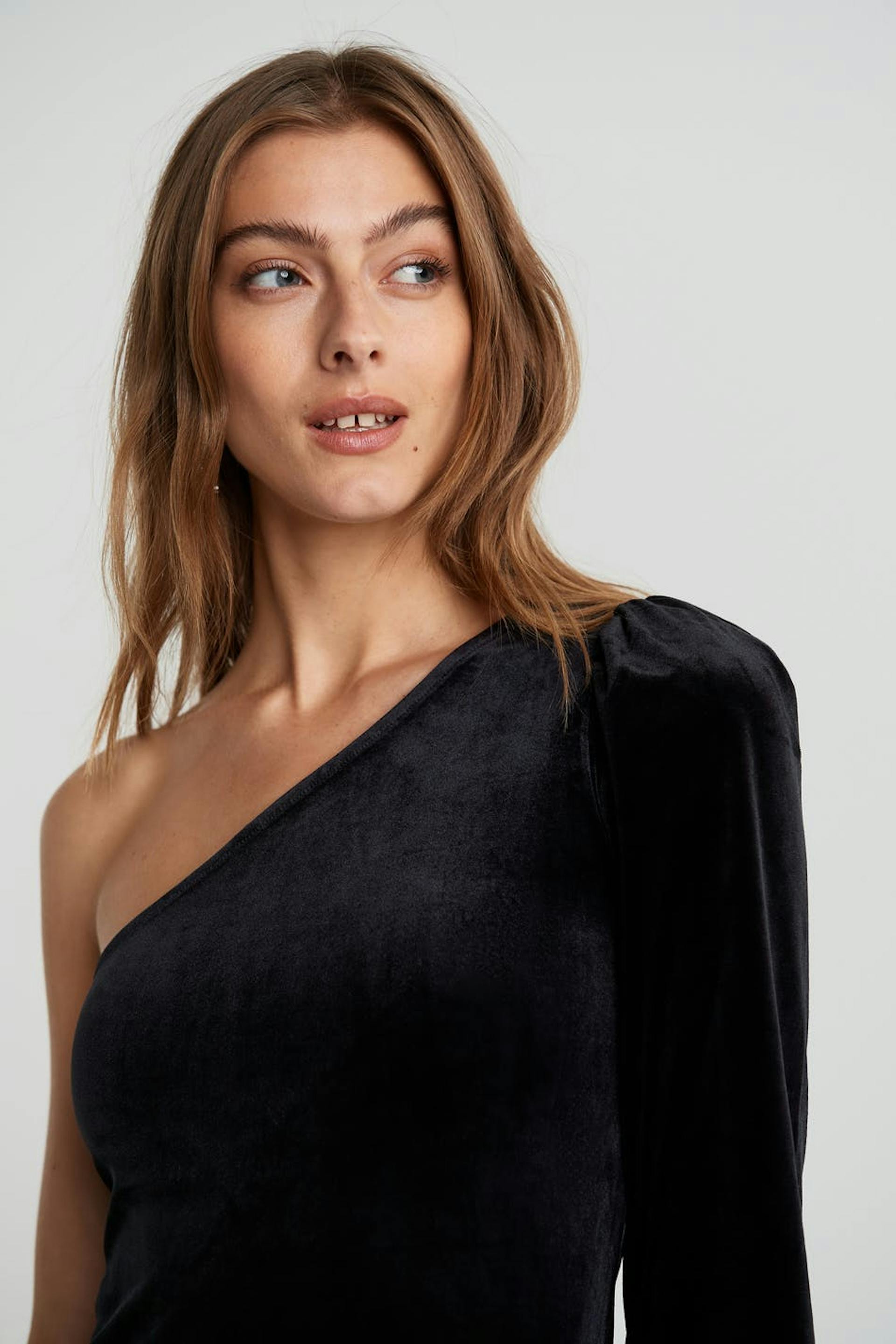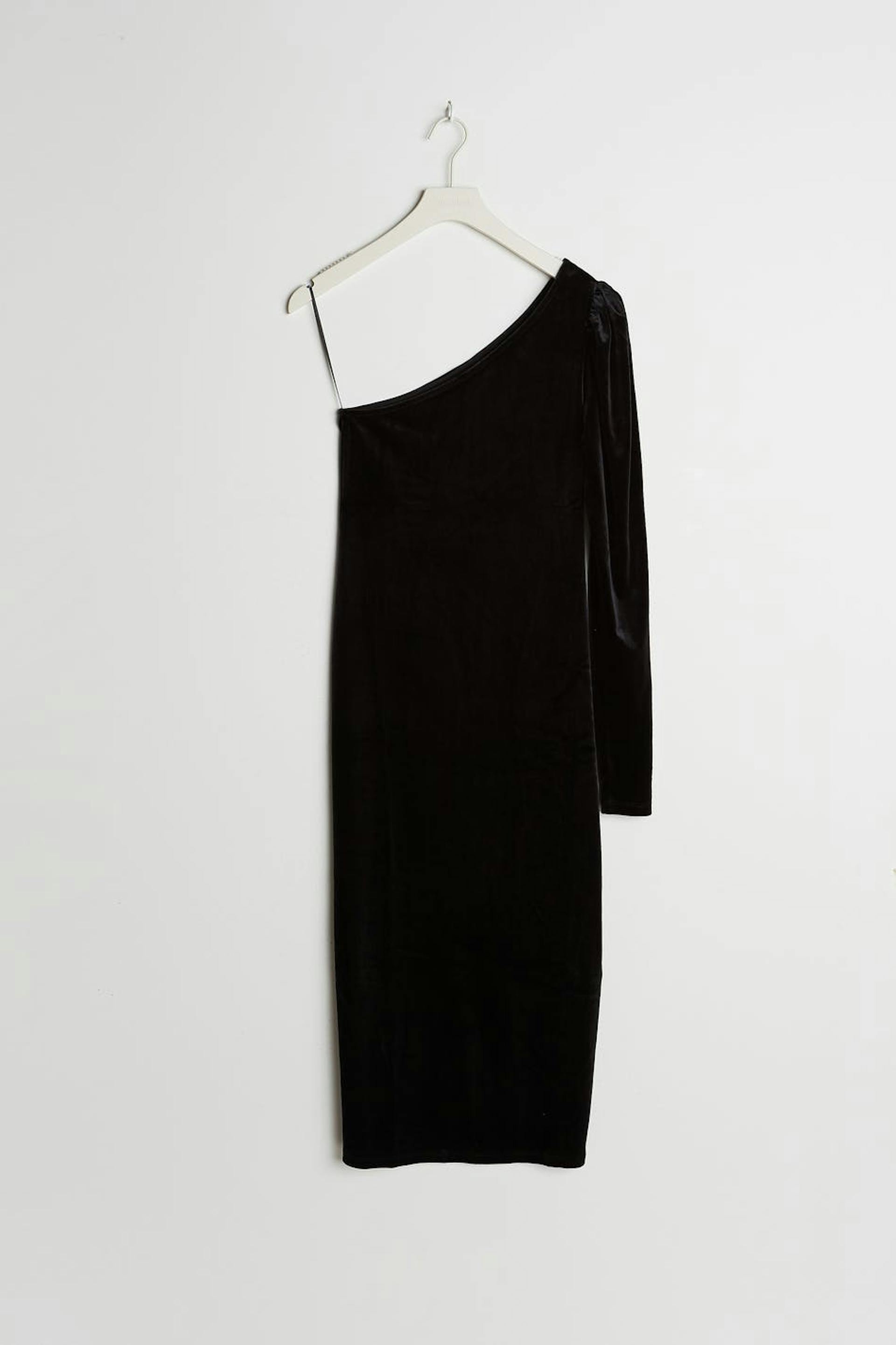 Dress with a one shoulder design. The dress is perfect for the party and black and has a long puff sleeve. It is made of velvet and has midi length.