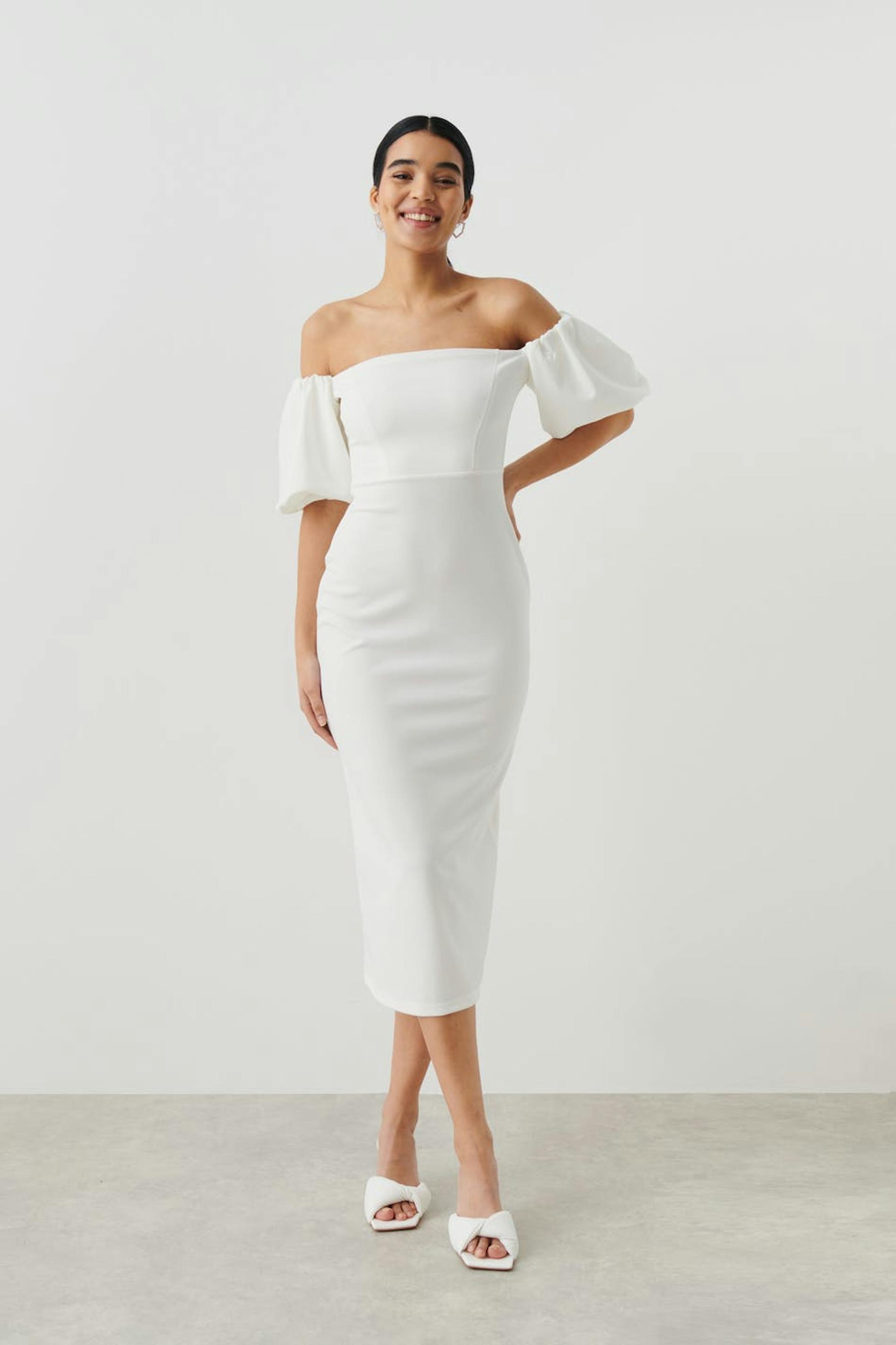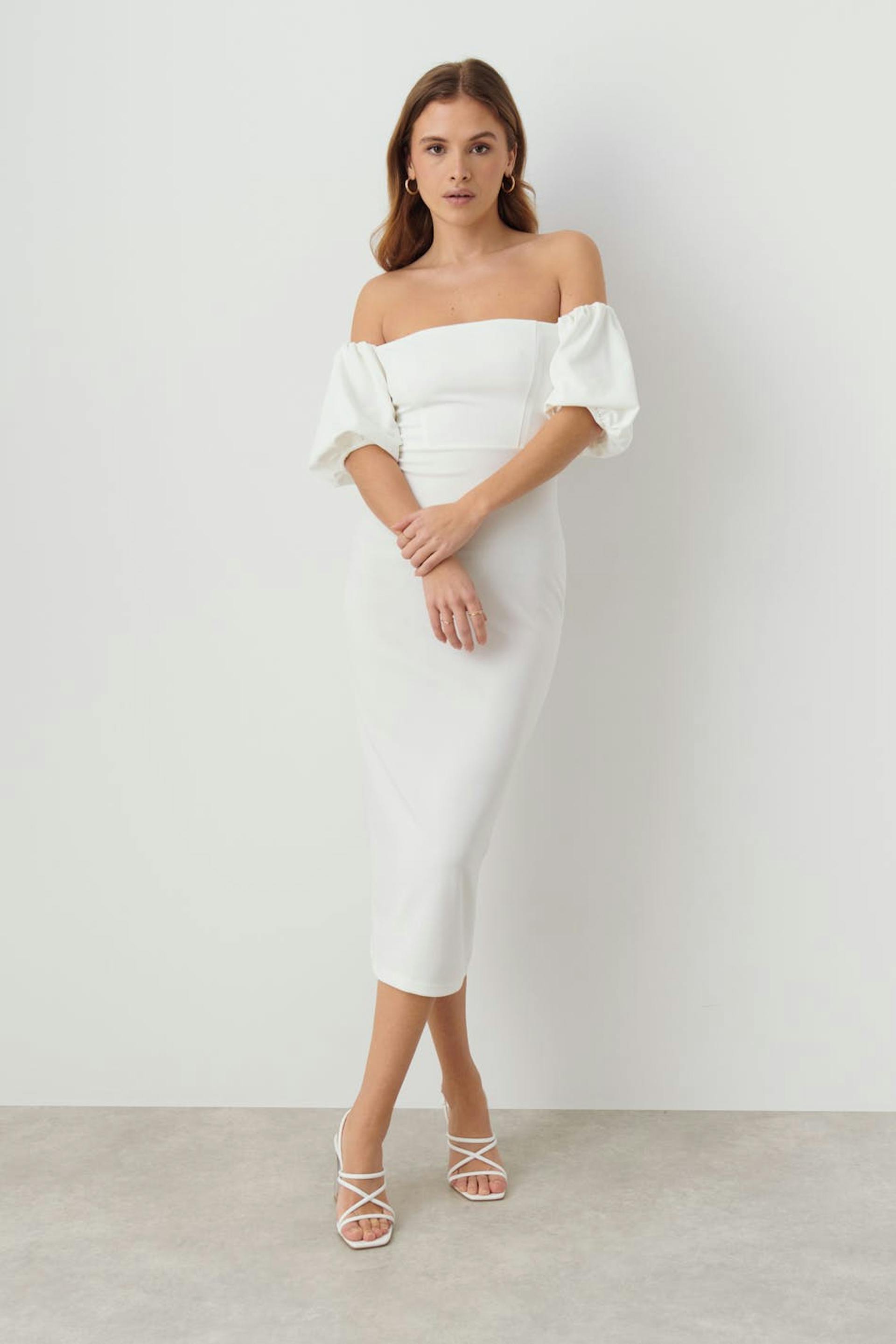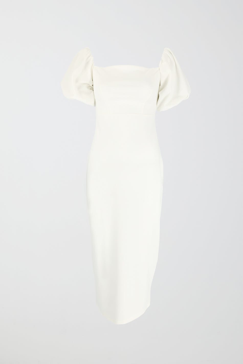 Midi dress in jersey with short puff sleeves. The dress is white and has a material with a stretch. It has one shoulder design and figure-hugging fit.