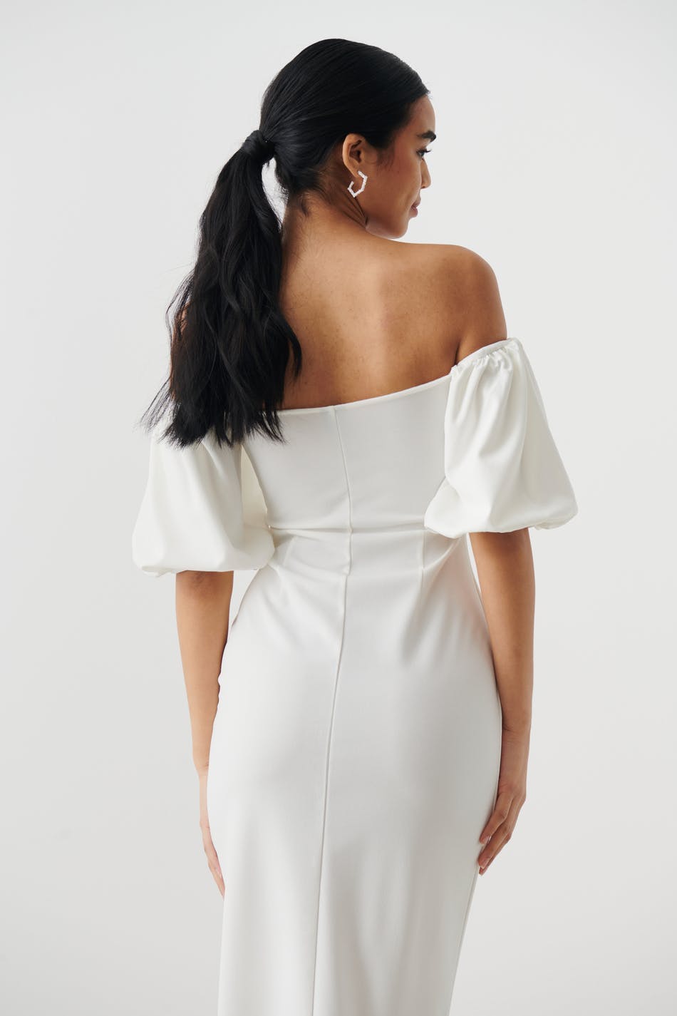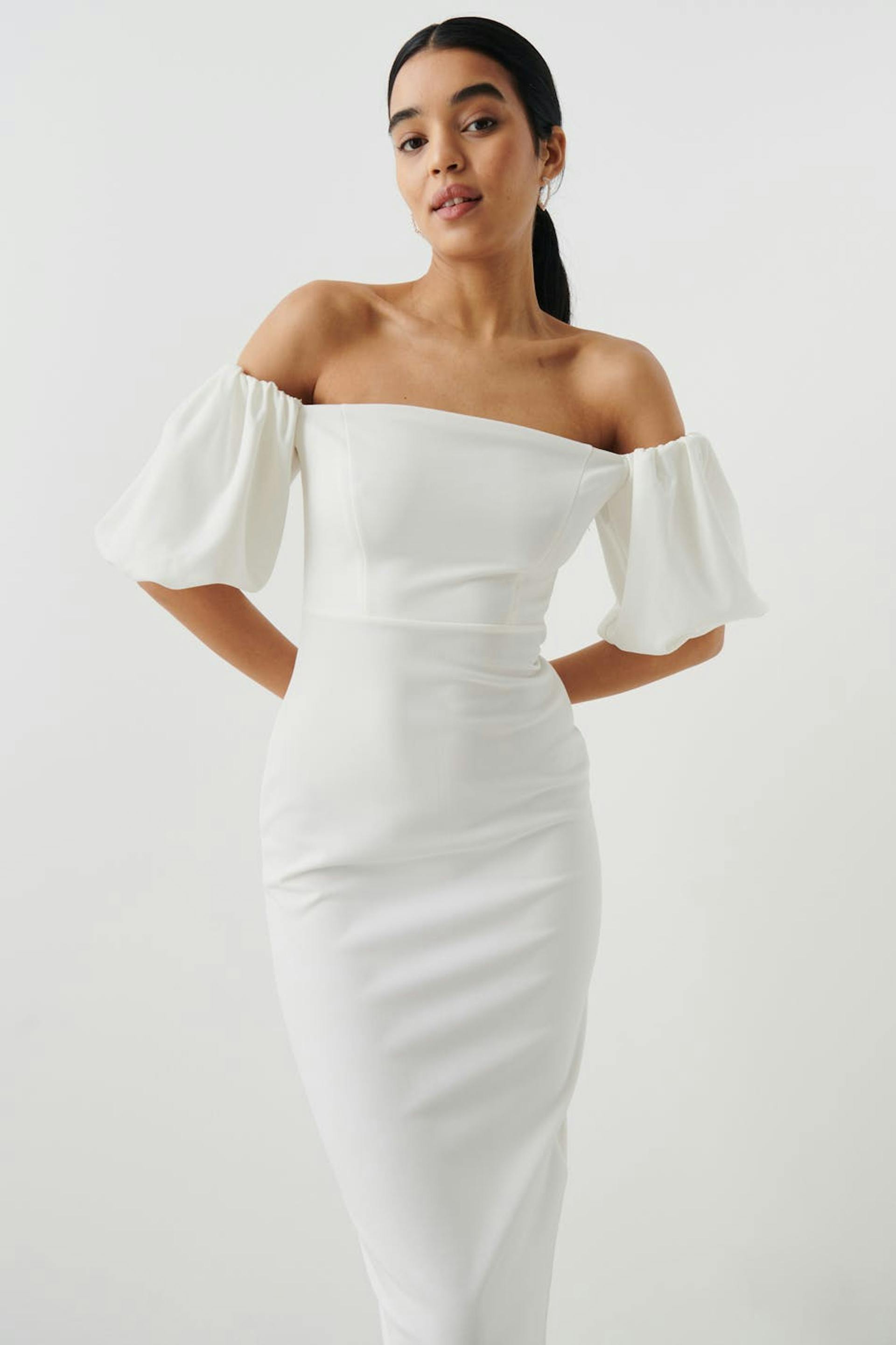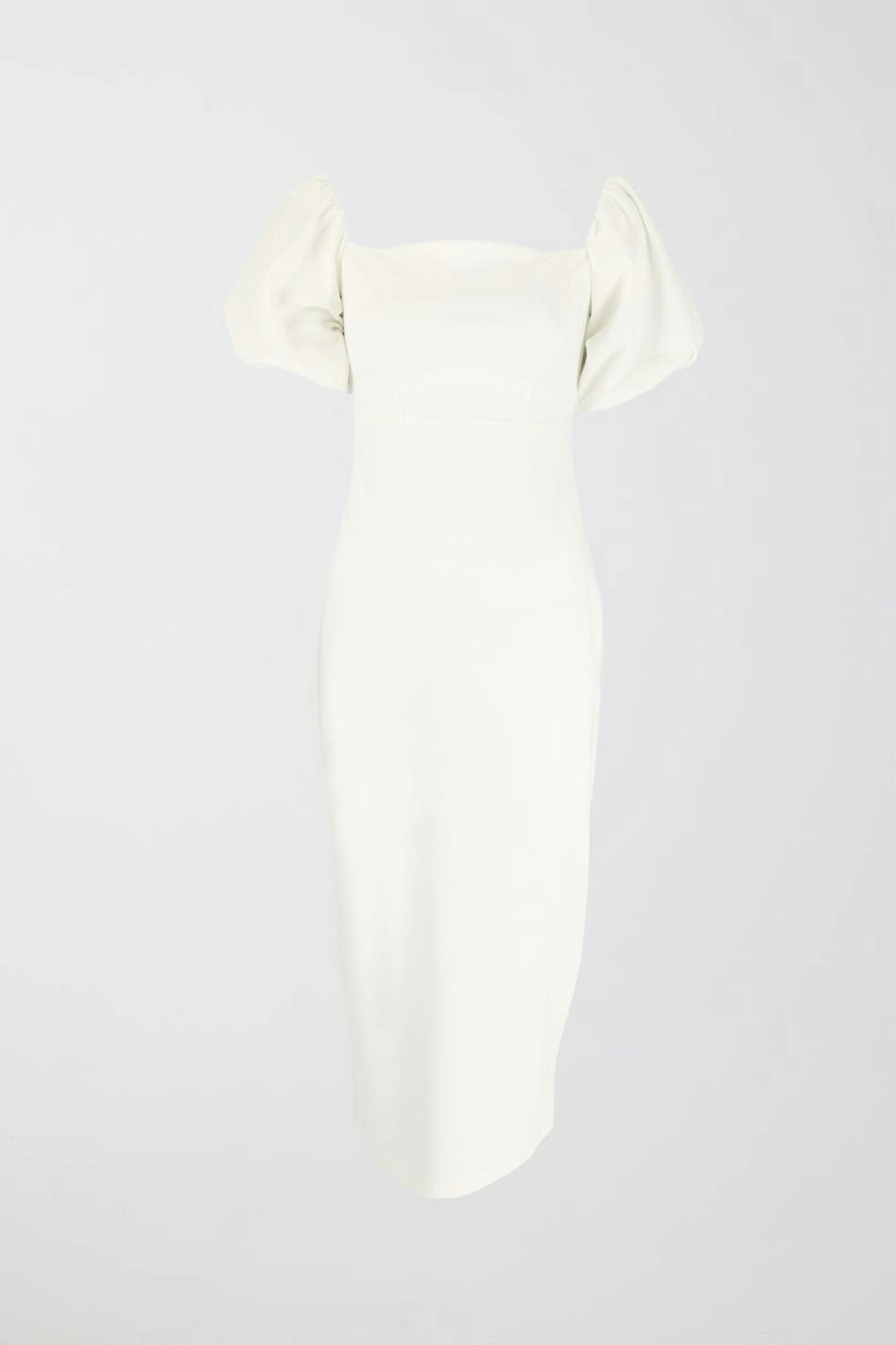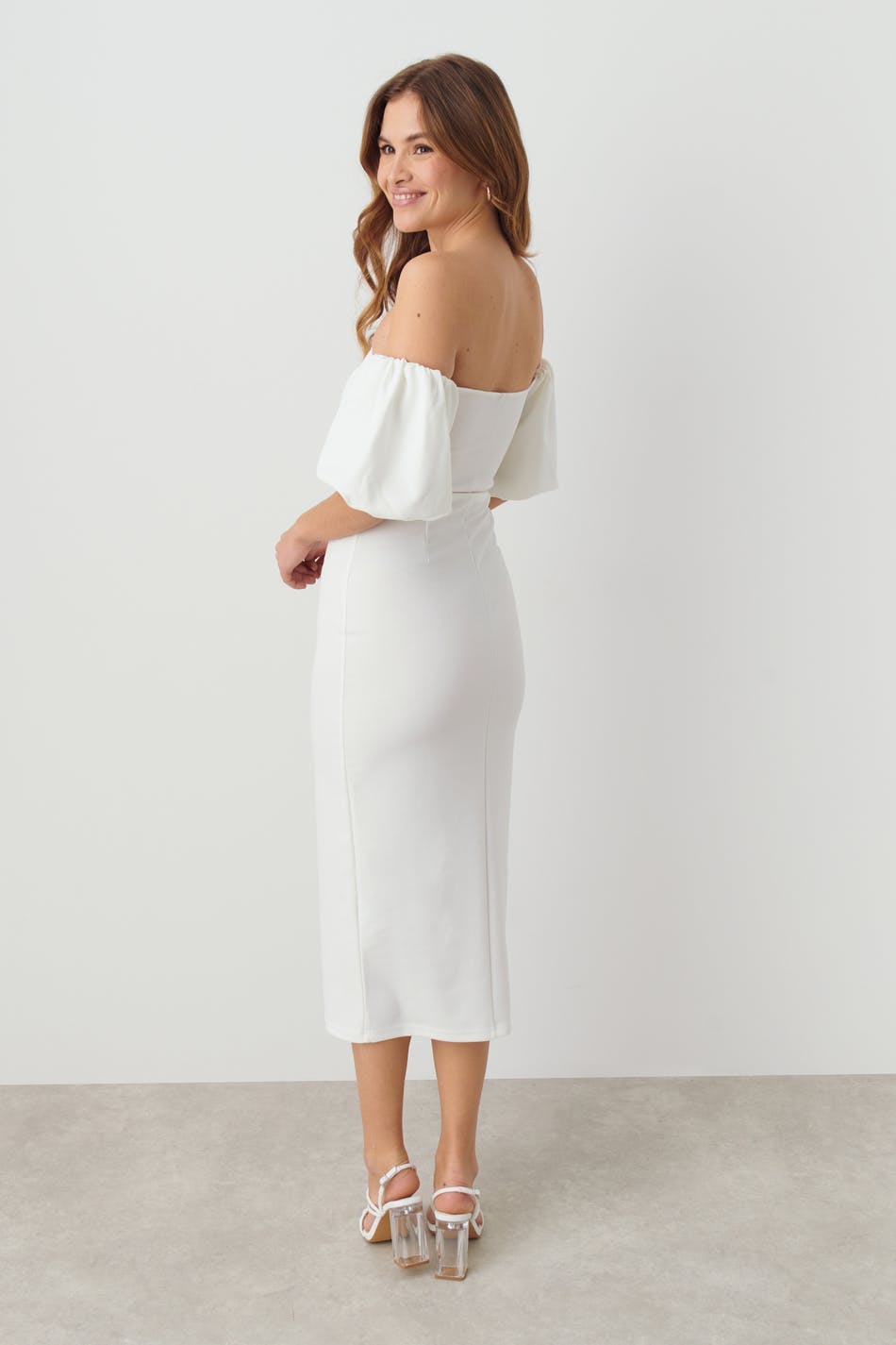 Midi dress in jersey with short puff sleeves. The dress is white and has a material with a stretch. It has one shoulder design and figure-hugging fit.