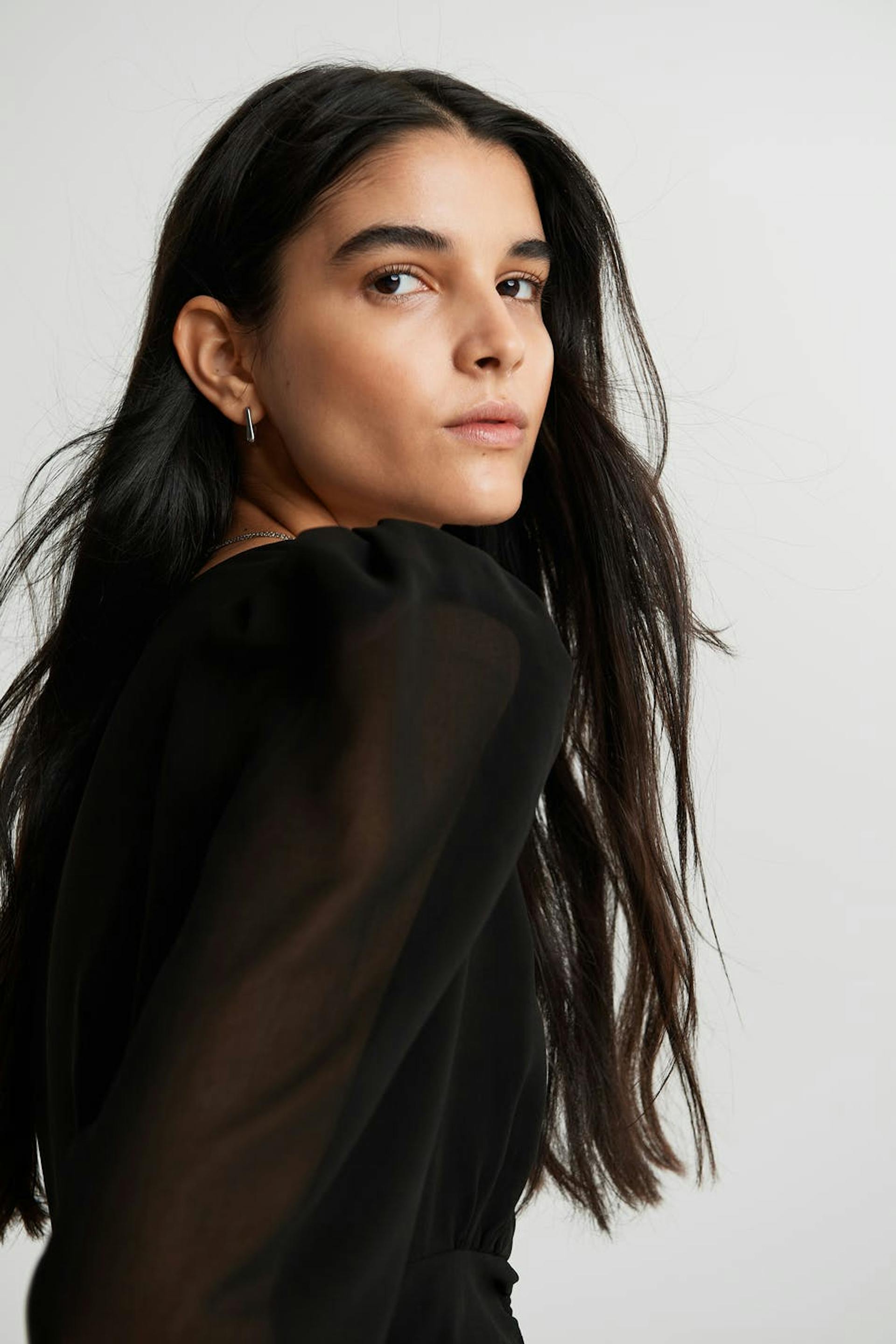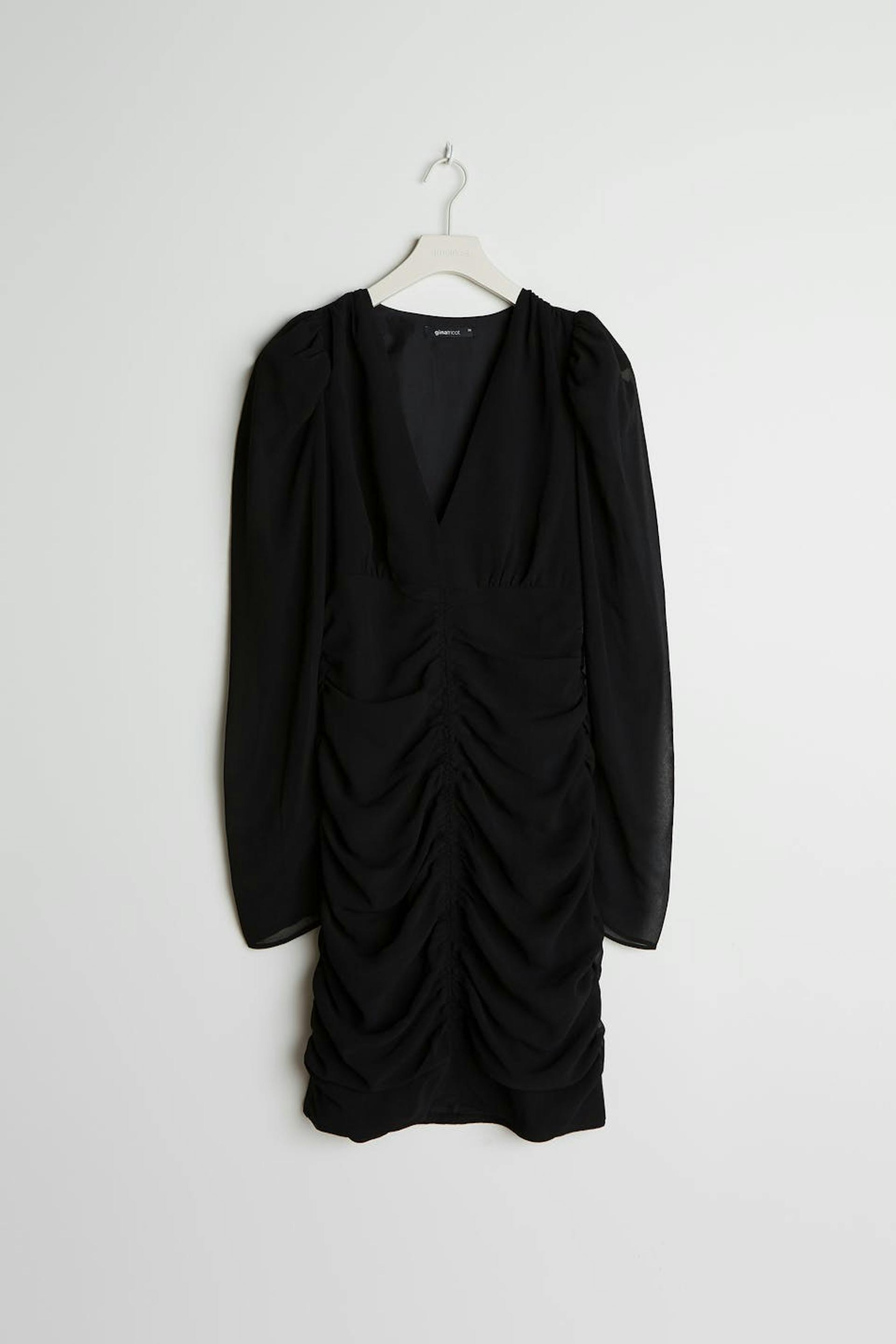 Dress with seethrough, long puff sleeves. The dress is perfect for the party and black and has gathering down the front. It is made of chiffon and has a V-neck.