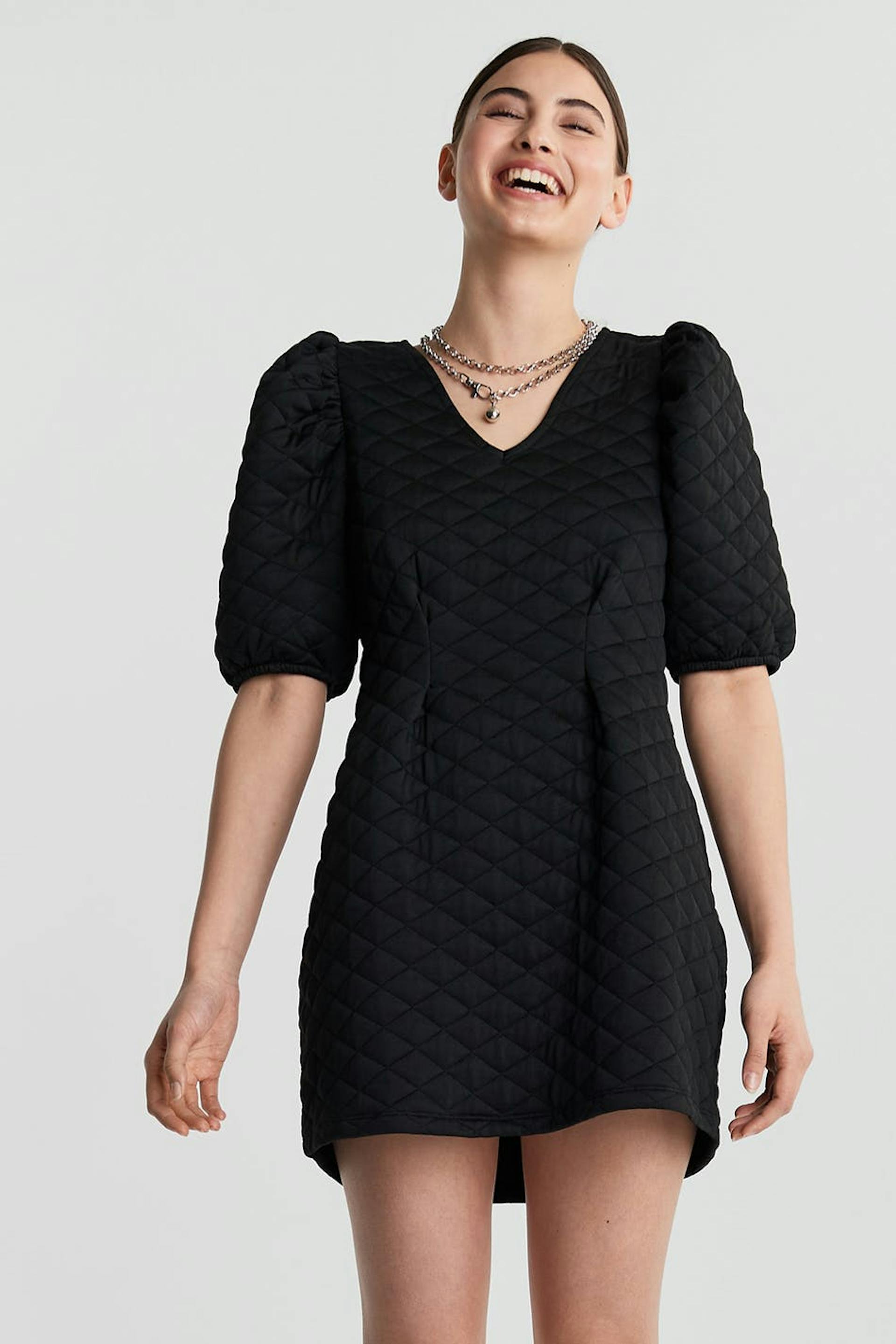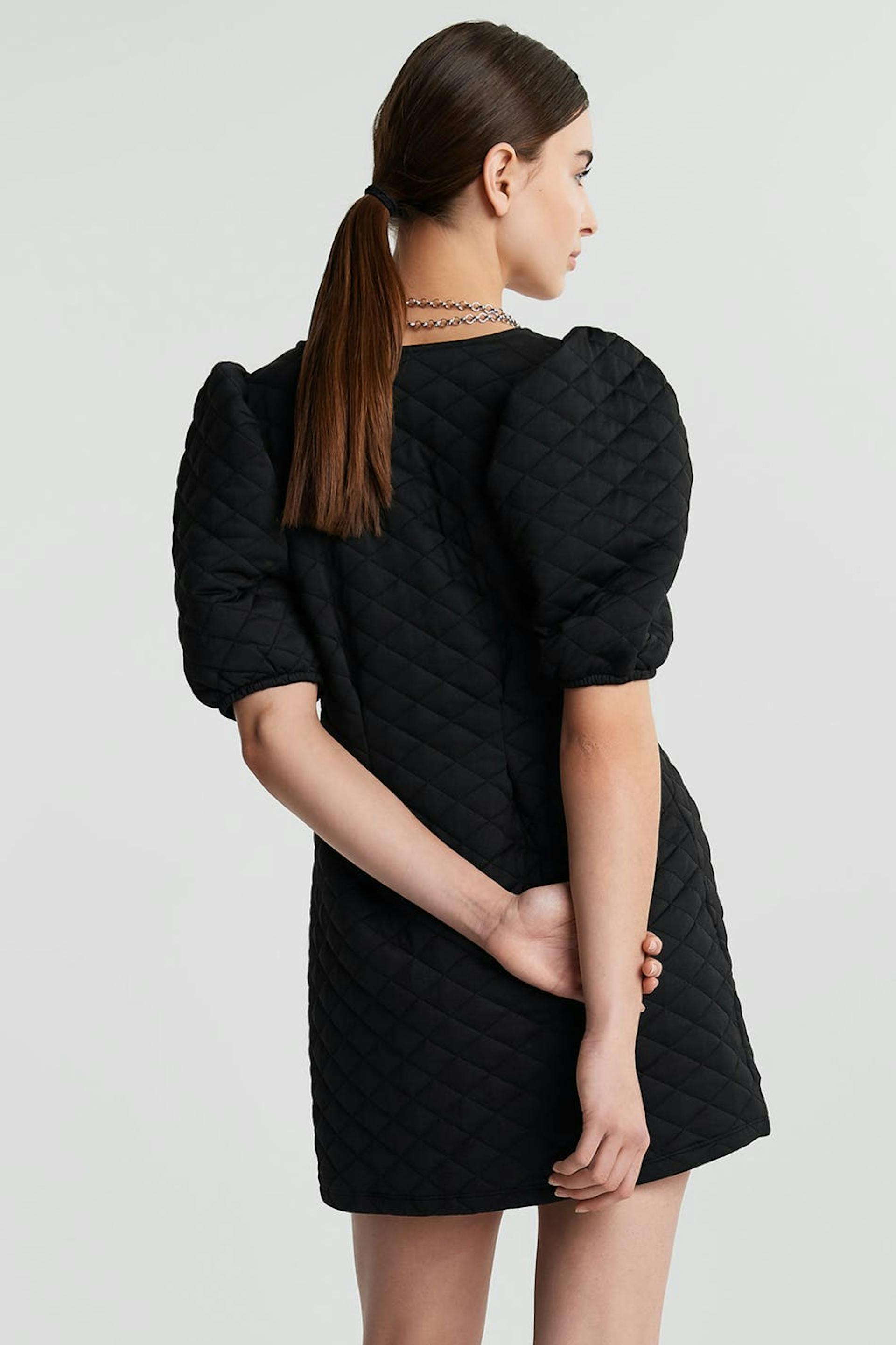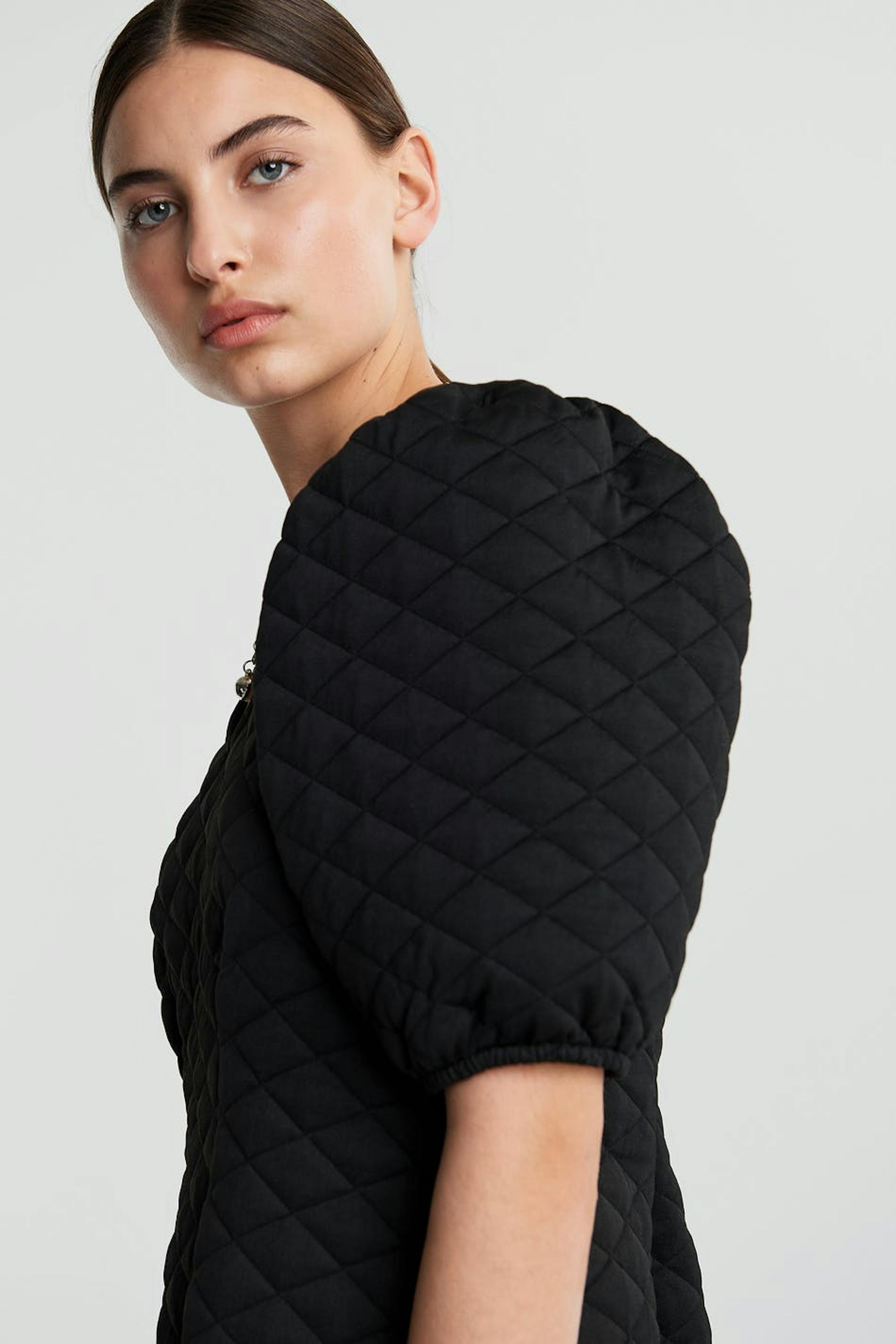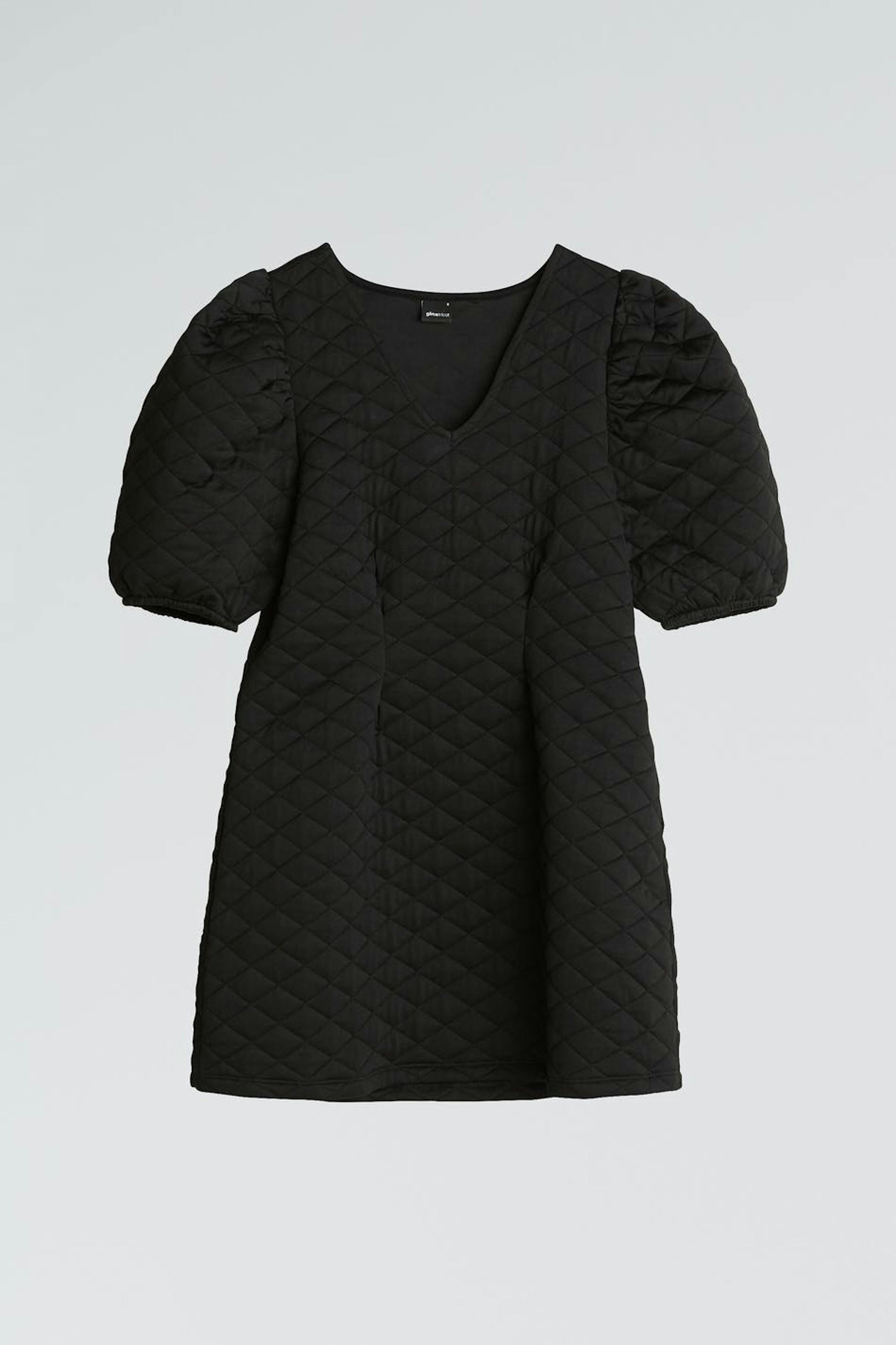 Quilted dress with short puff sleeves. The dress is black and has a defined waist.