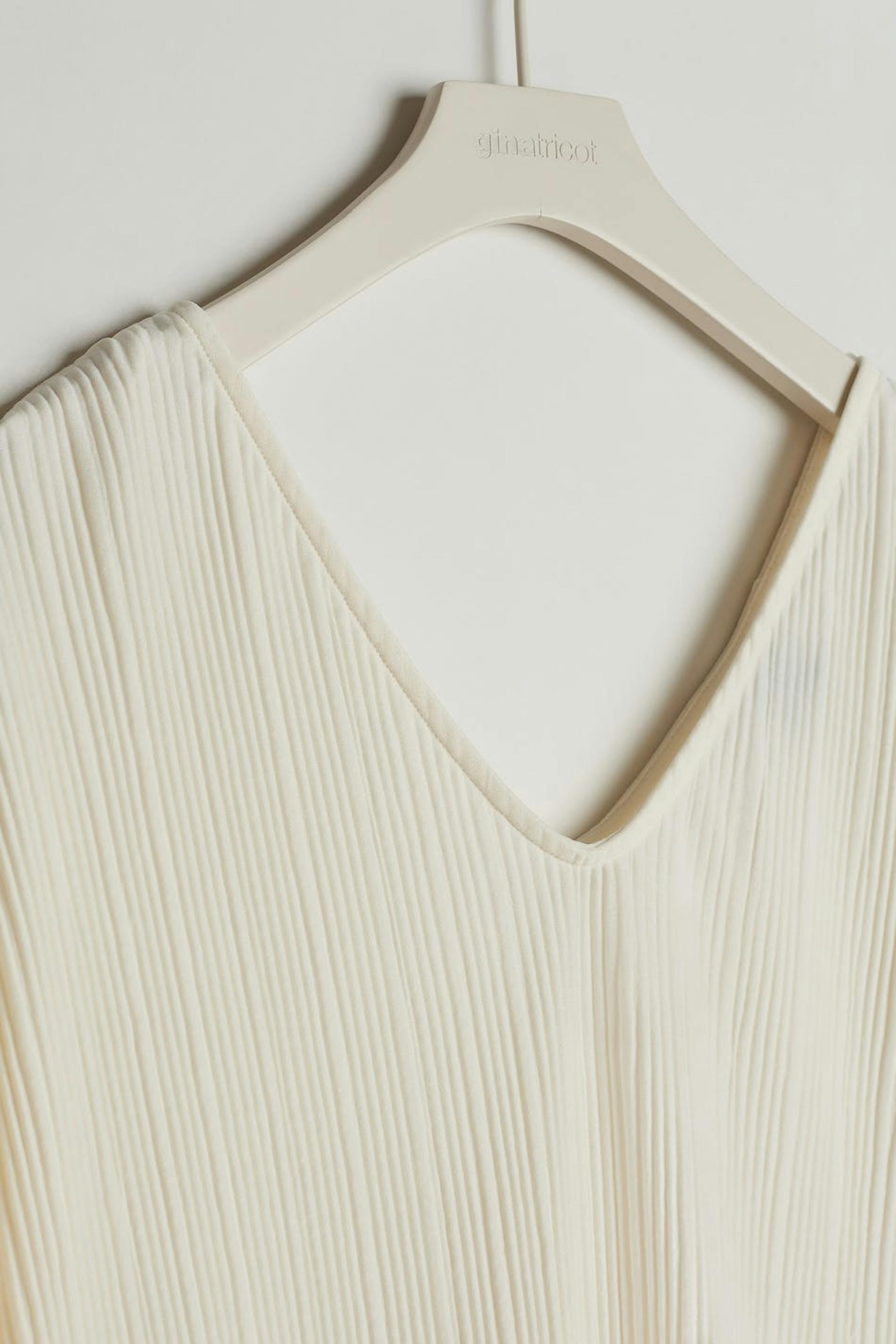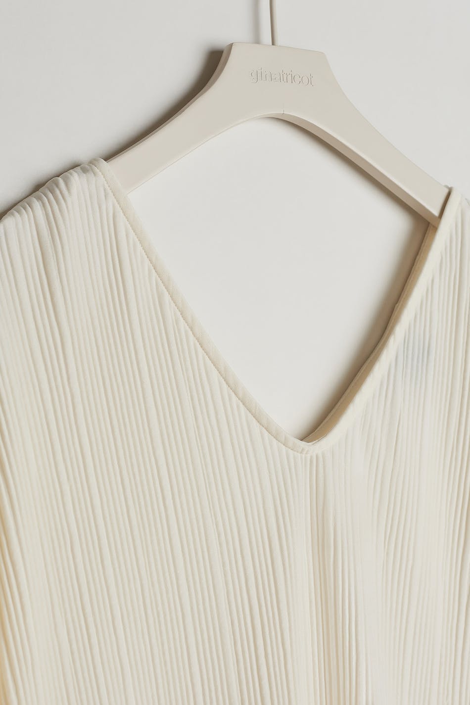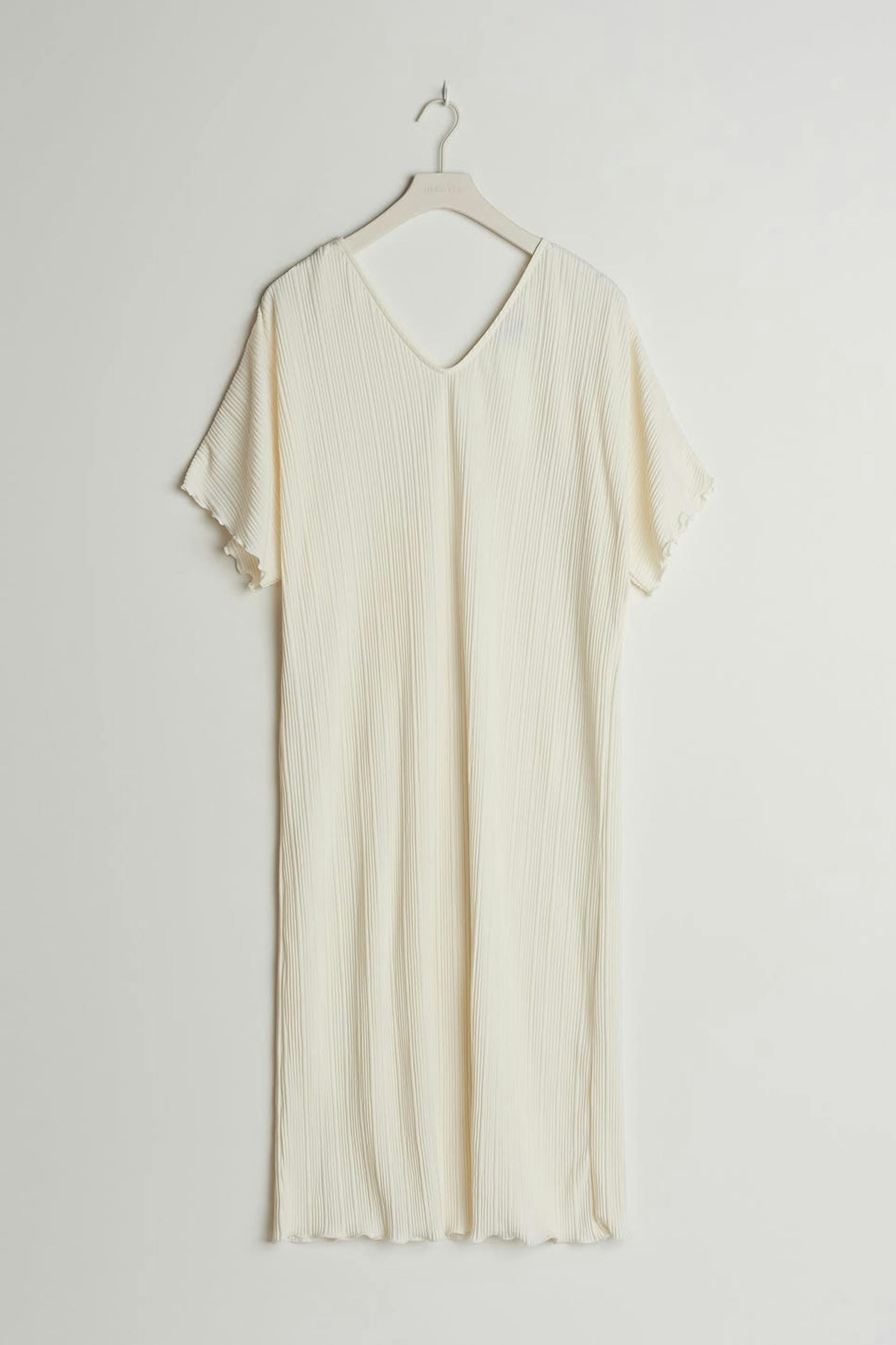 Pleated dress with a regular fit. The dress is white and has a V-neck at the front and at the back. It has short sleeves, midi length and an overlock seam at the bottom and on the sleeve ends.