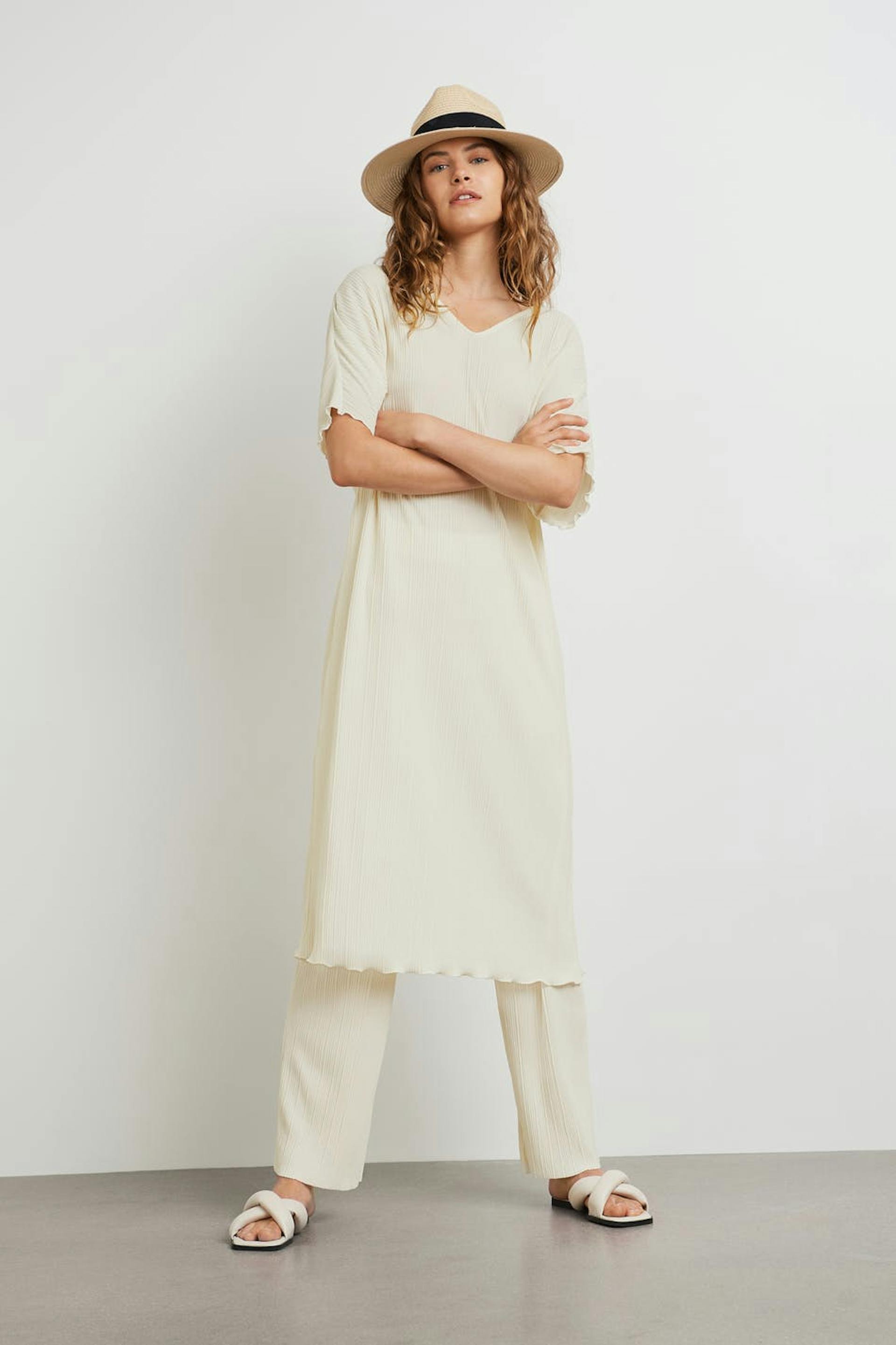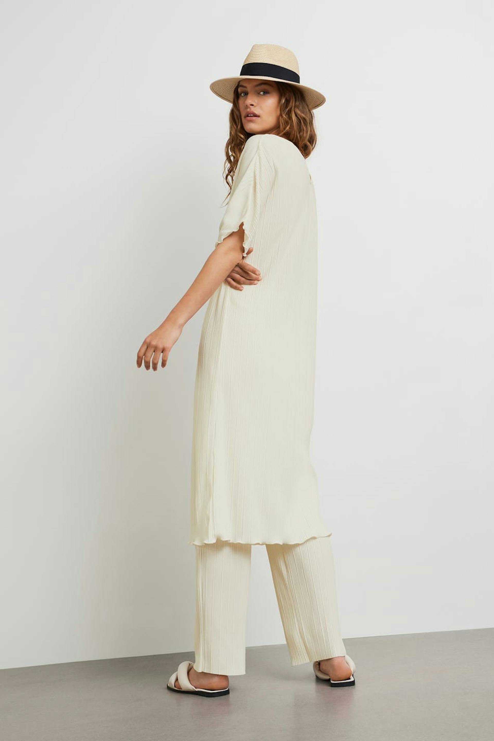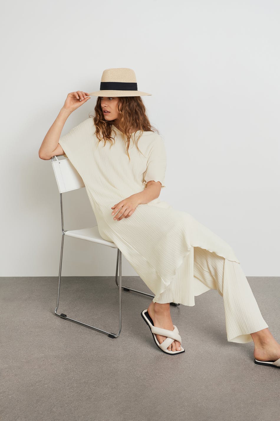 Pleated dress with a regular fit. The dress is white and has a V-neck at the front and at the back. It has short sleeves, midi length and an overlock seam at the bottom and on the sleeve ends.