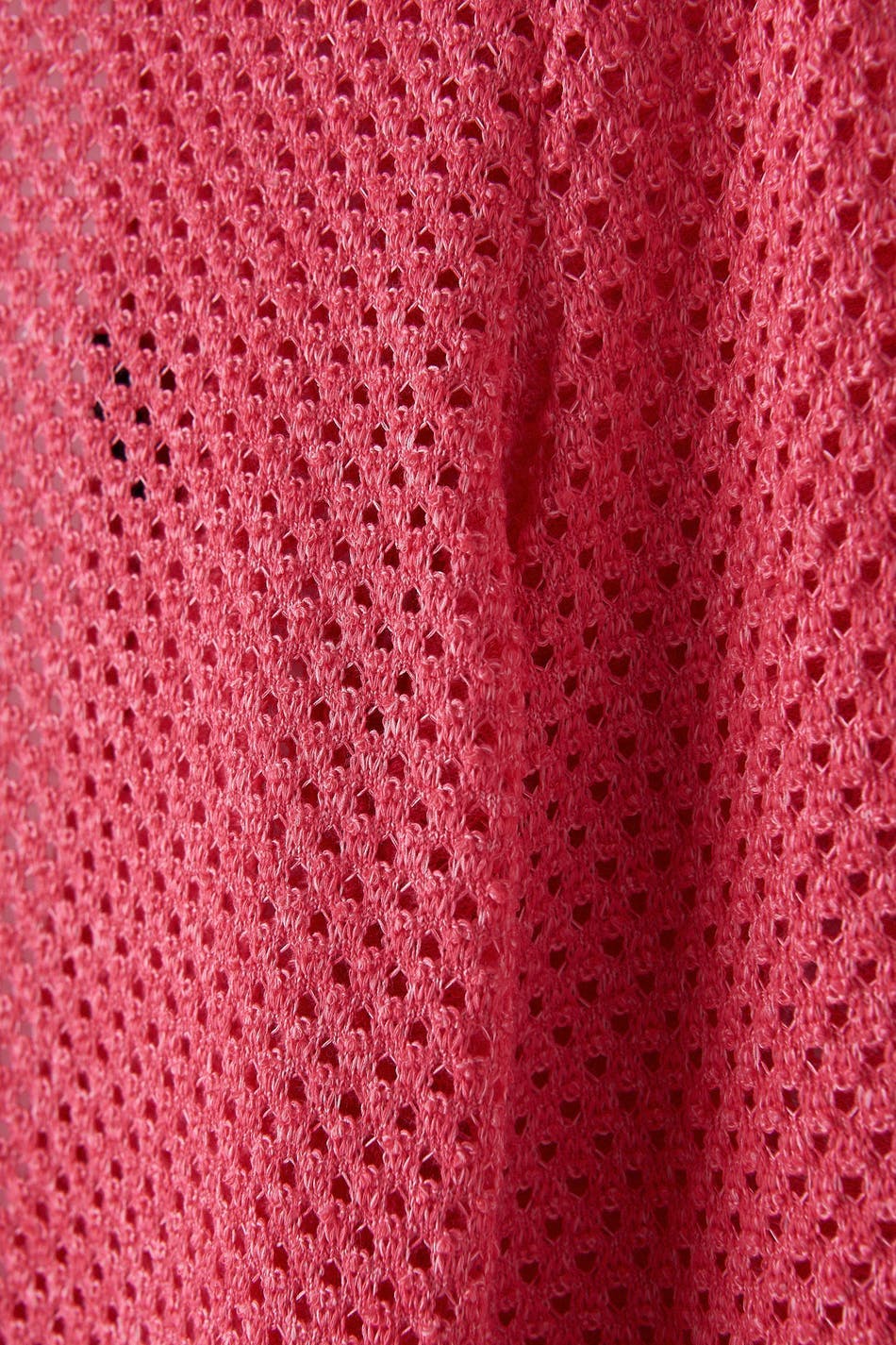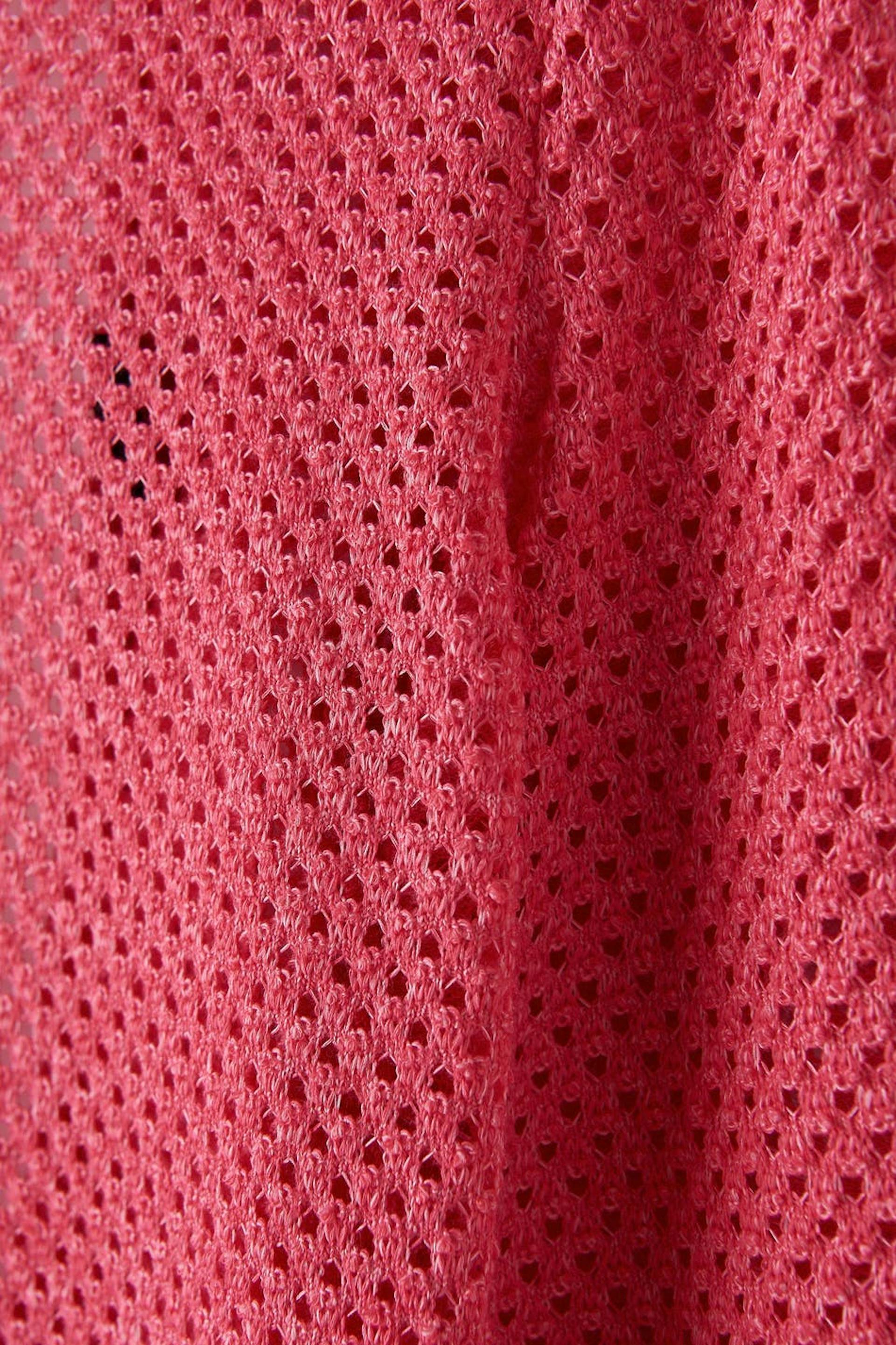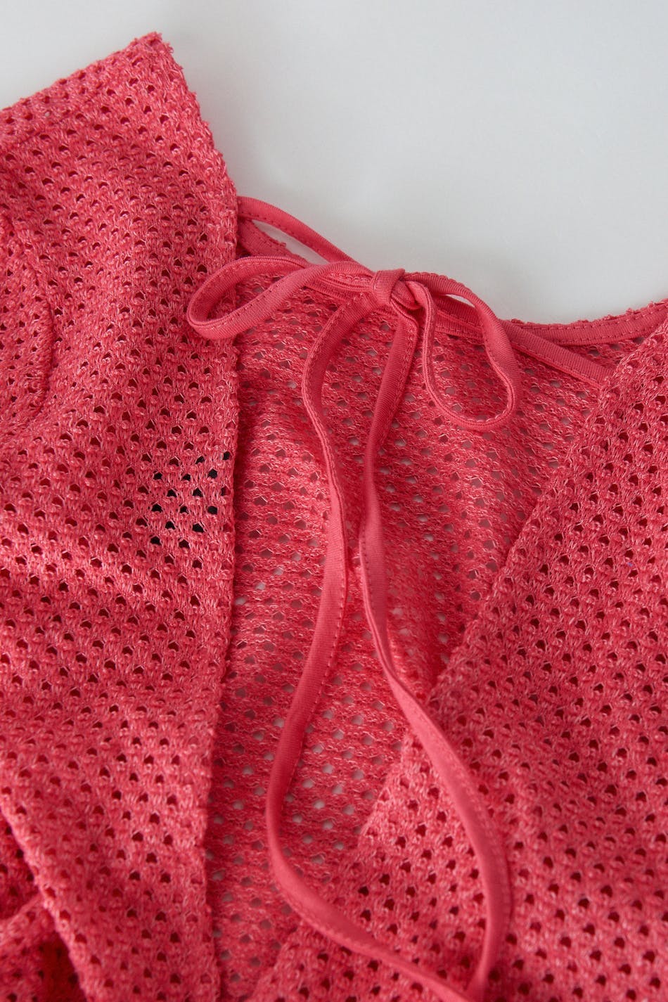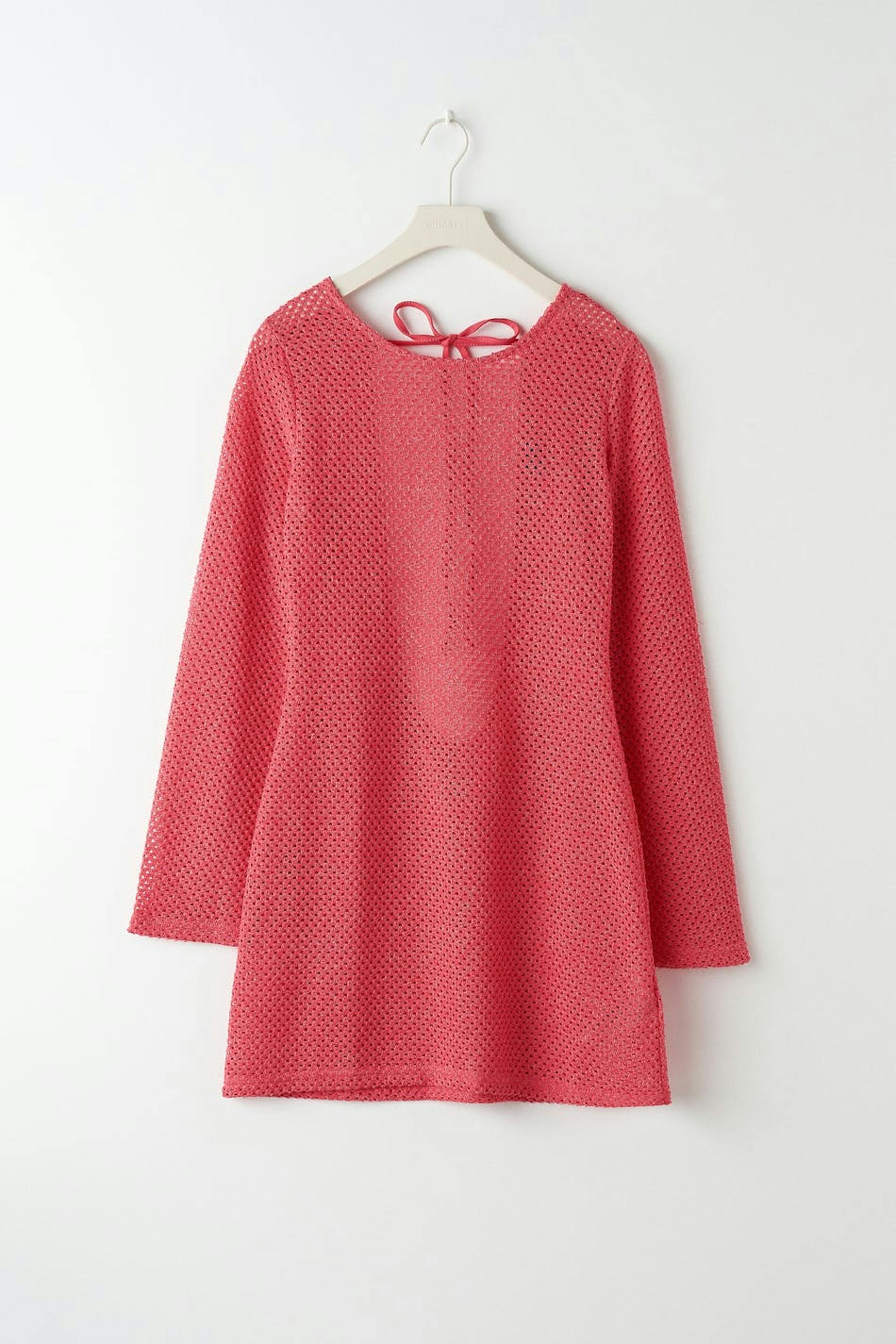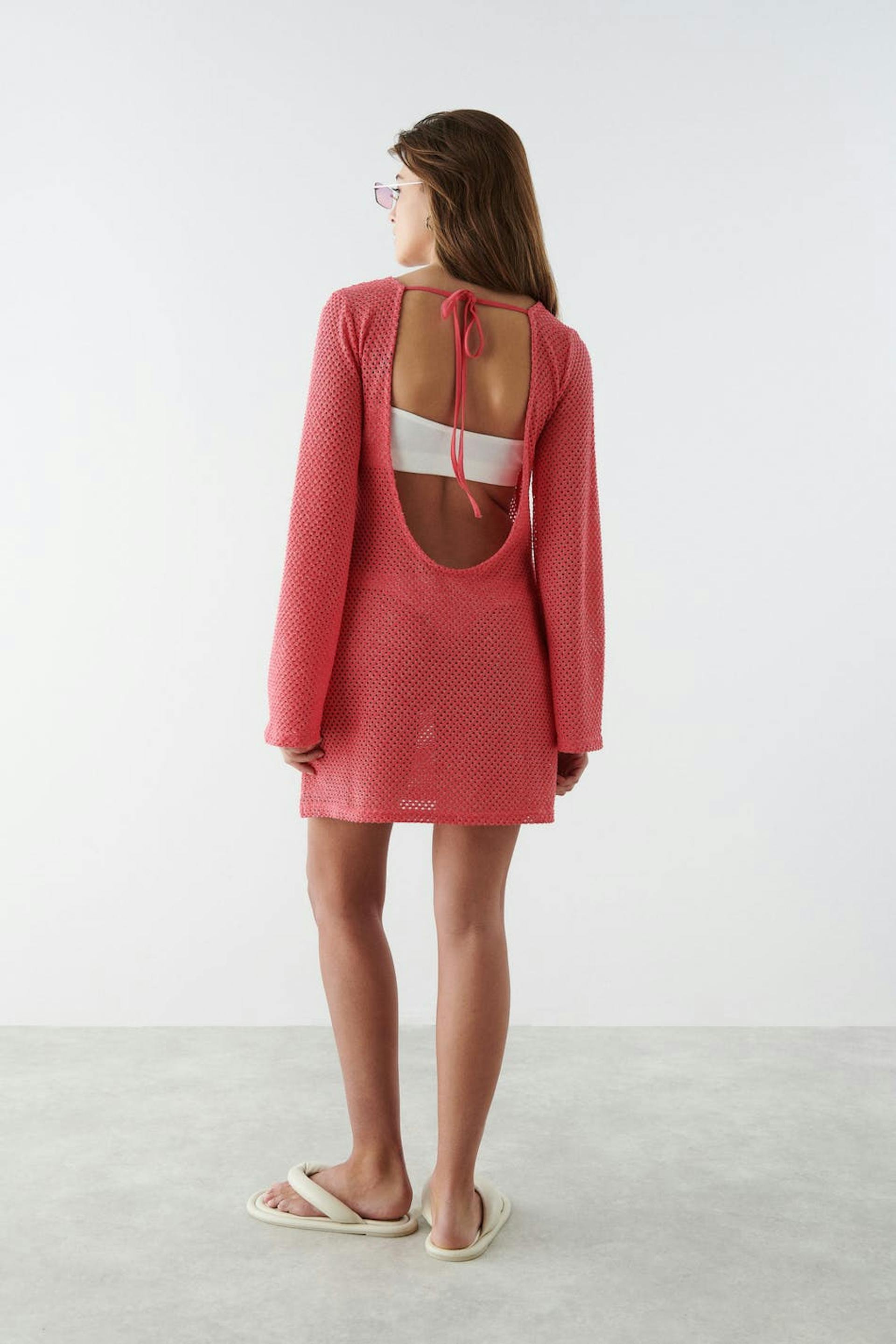Crocheted dress with fitted fit. The dress is pink, long-sleeved and short. It has open back with a knot detail.