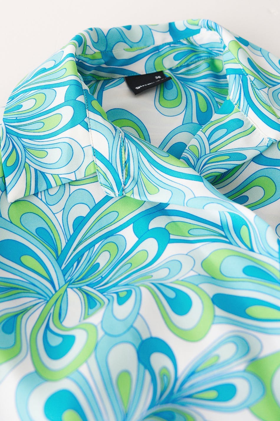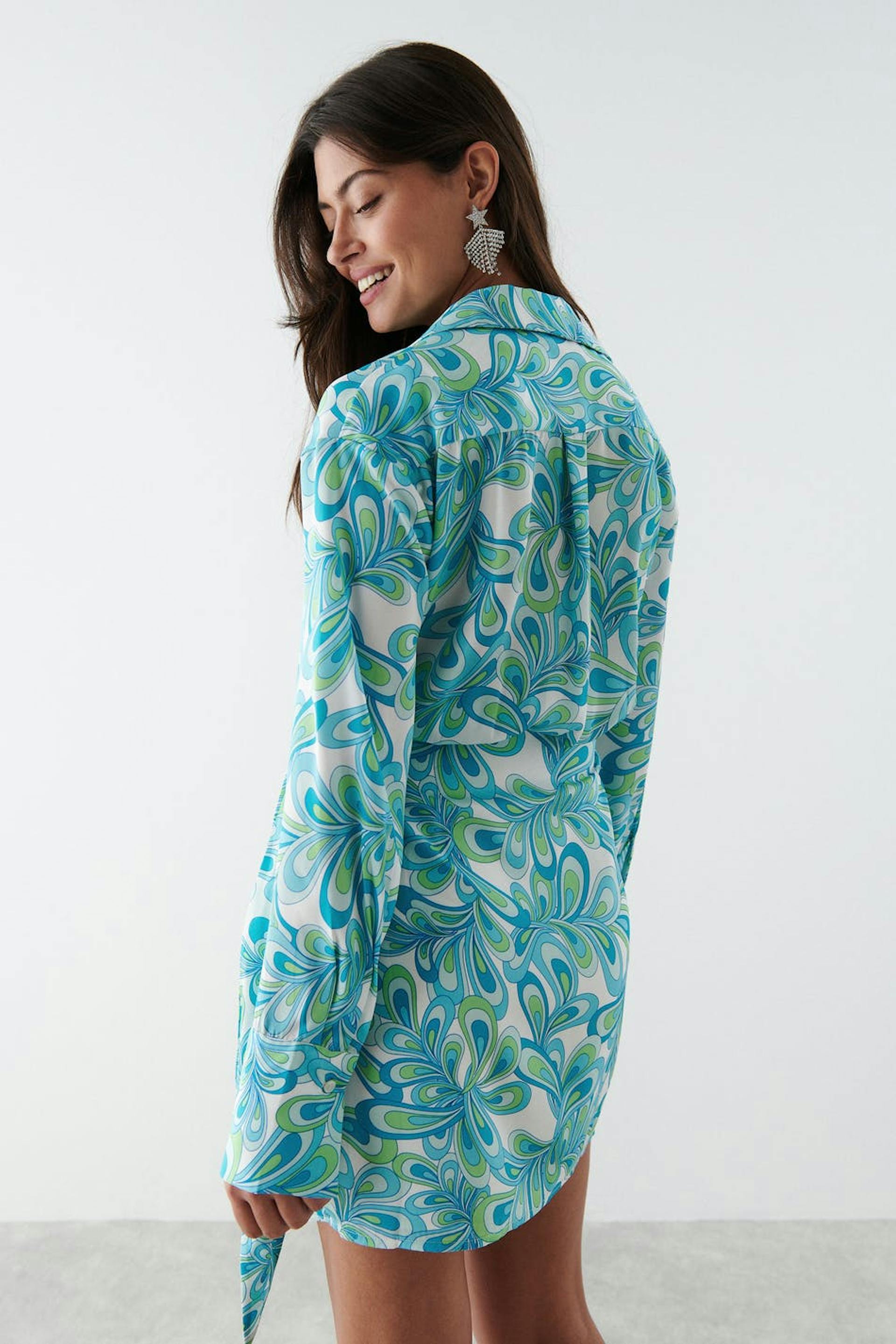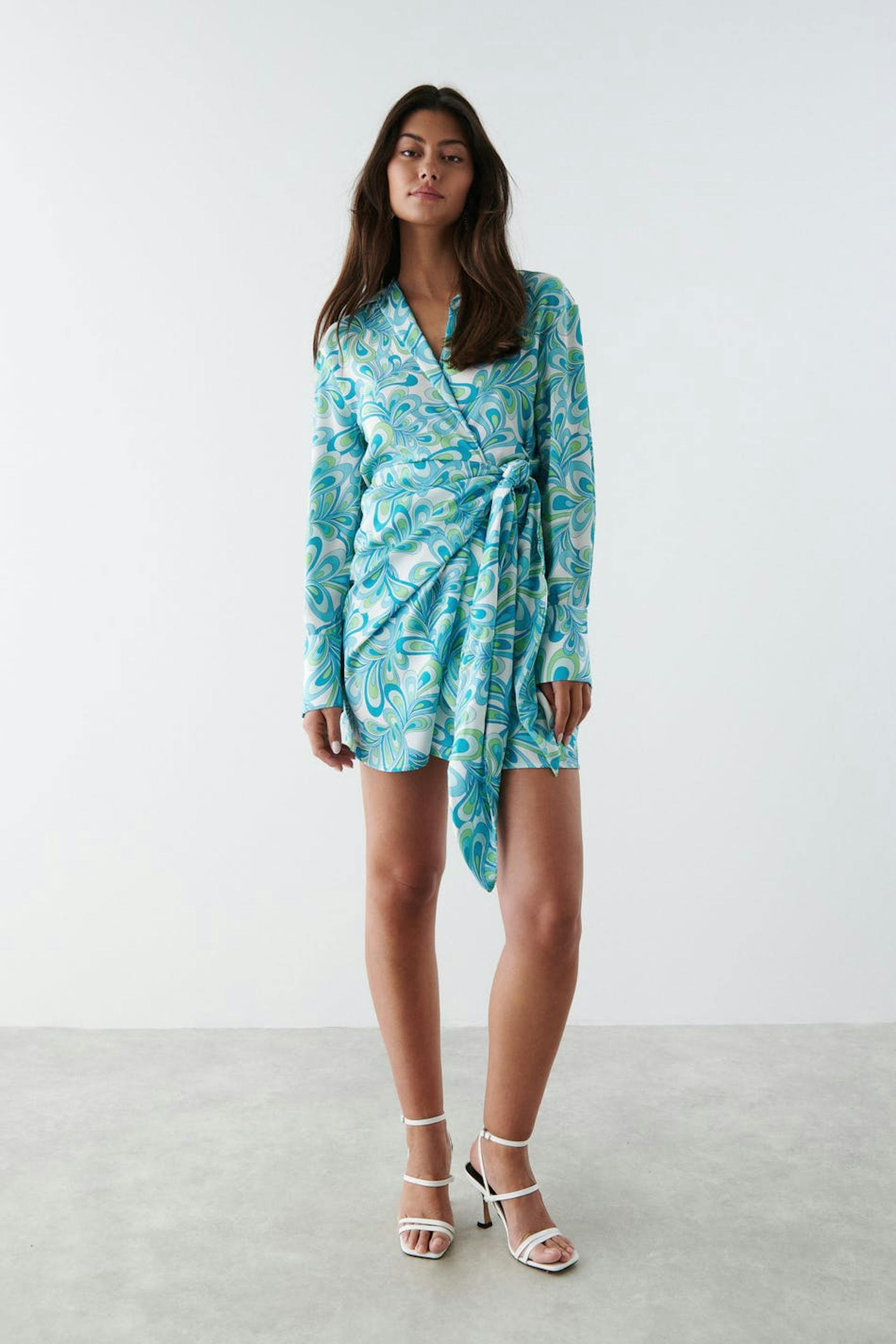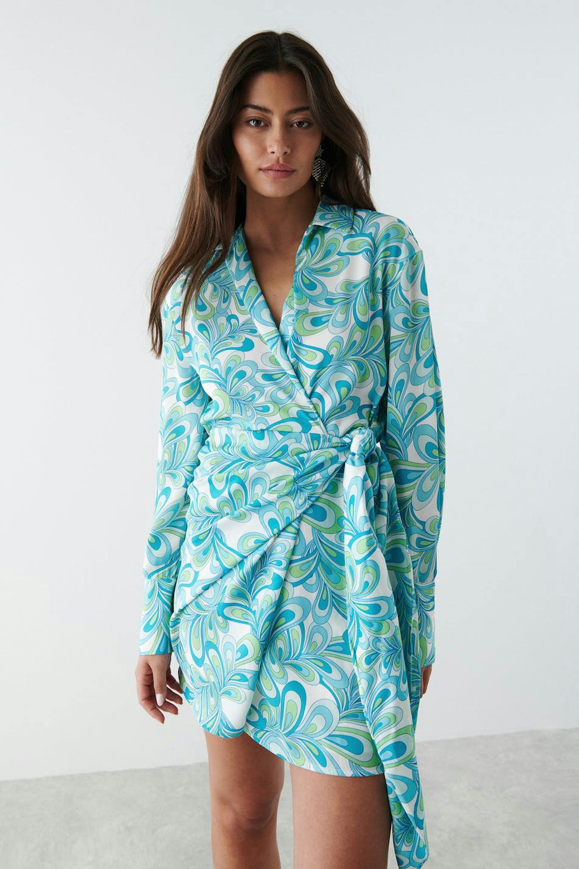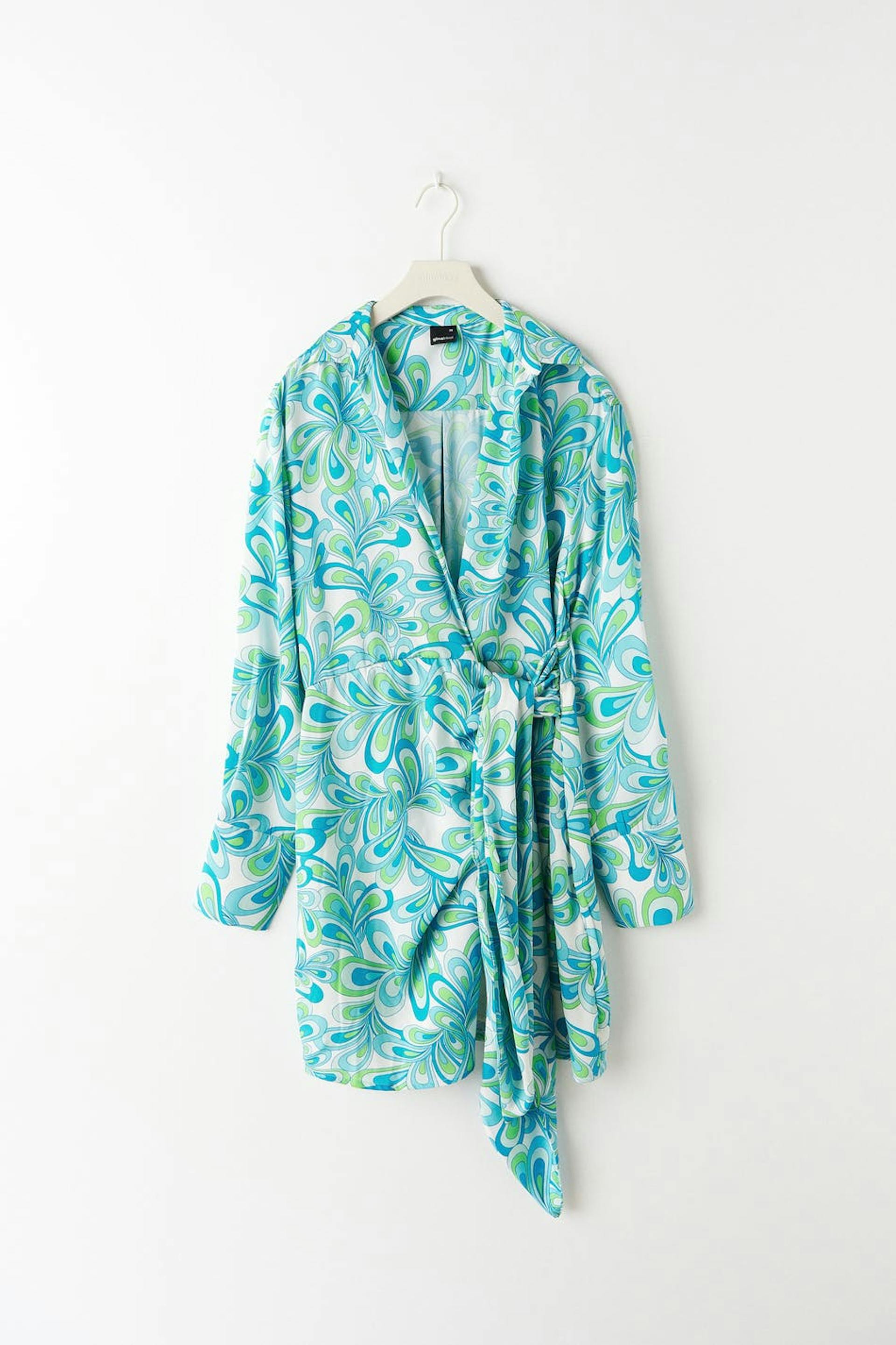 Long-sleeved wrap dress in satin with a knot detail at the waist. The dress is perfect for the party, blue and short. It has a collar, v neckline and wide cuffs.