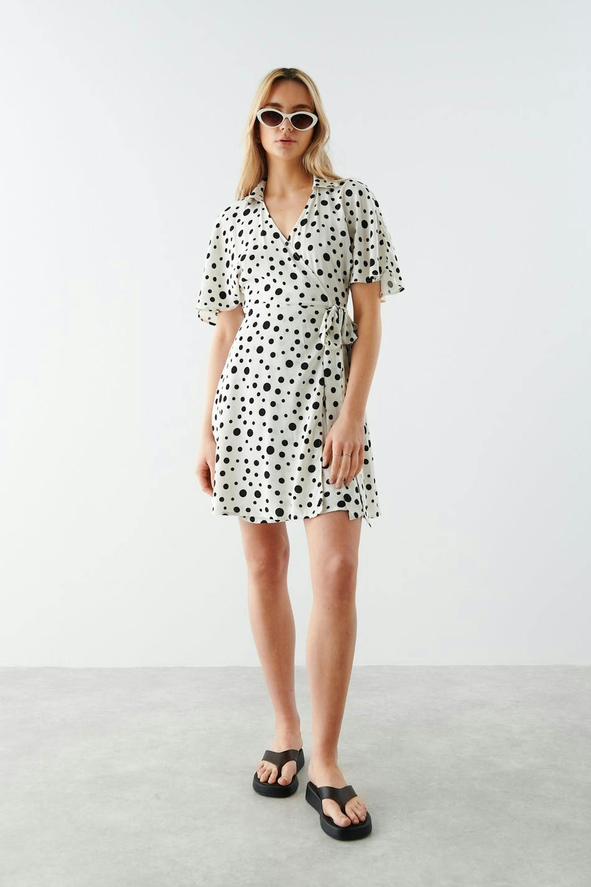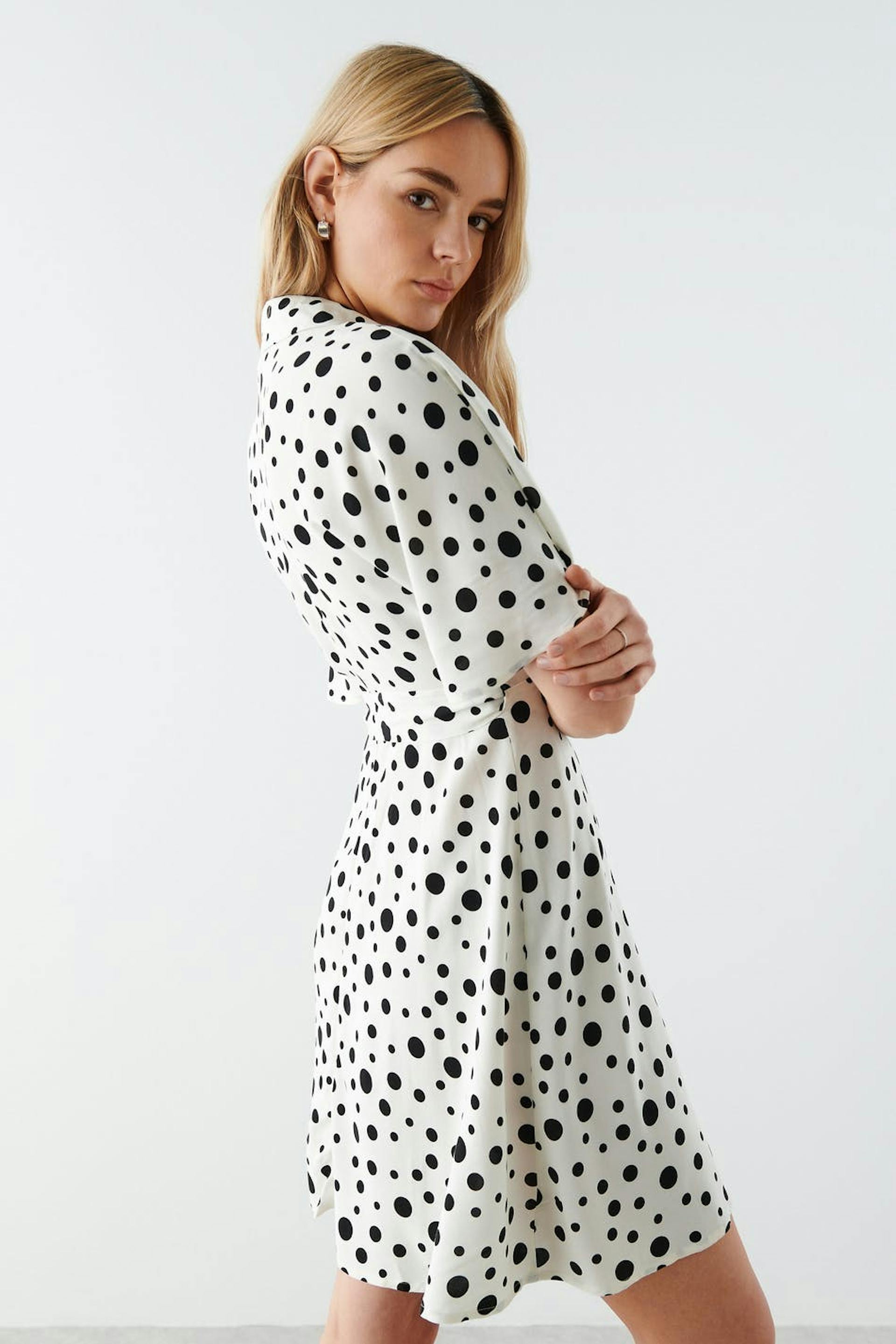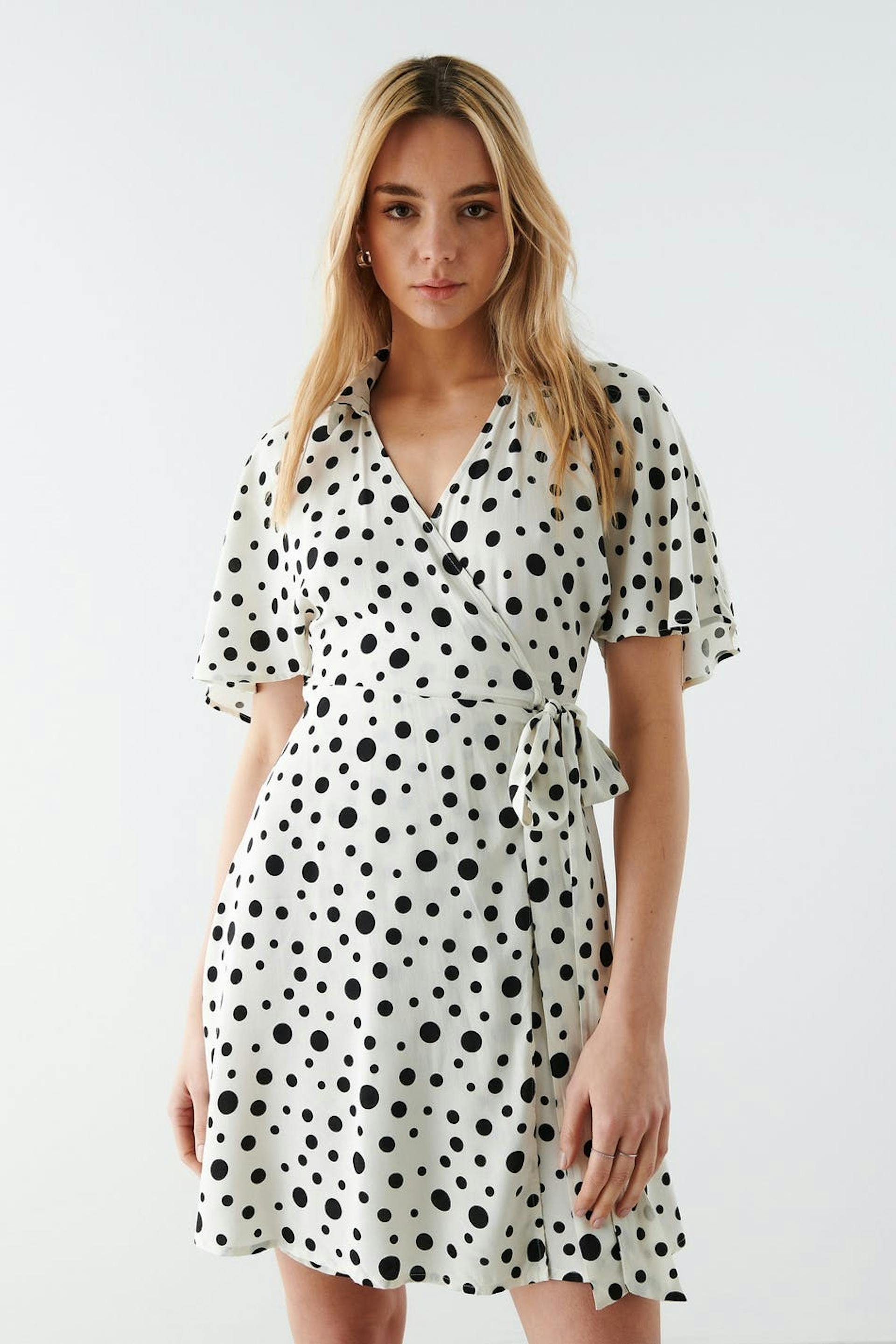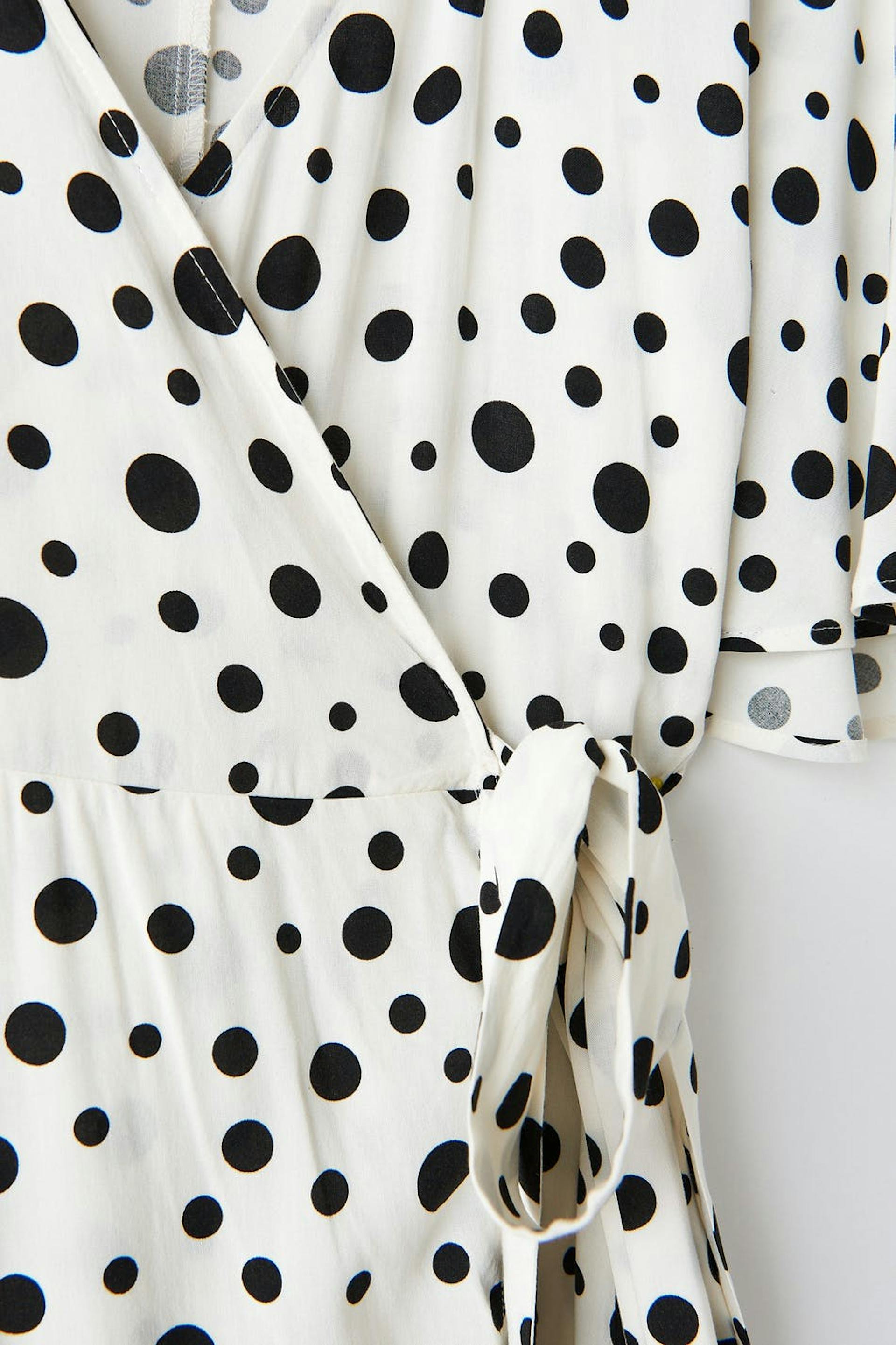 Dotted wrap dress with self-tie at the side. The dress is white, short and short-sleeved. It has a collar and v-neck cut.
