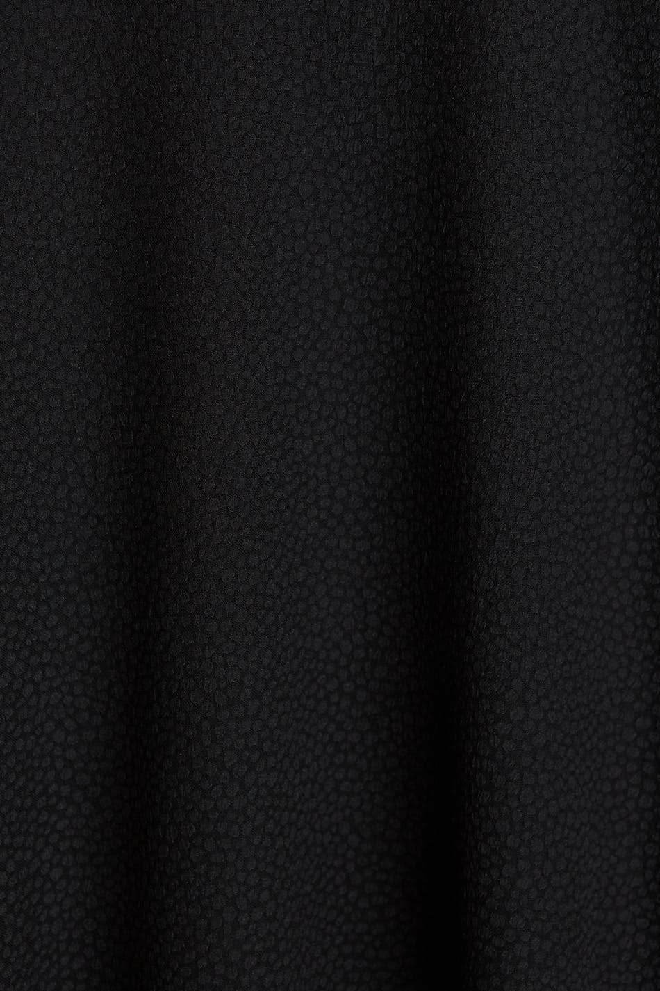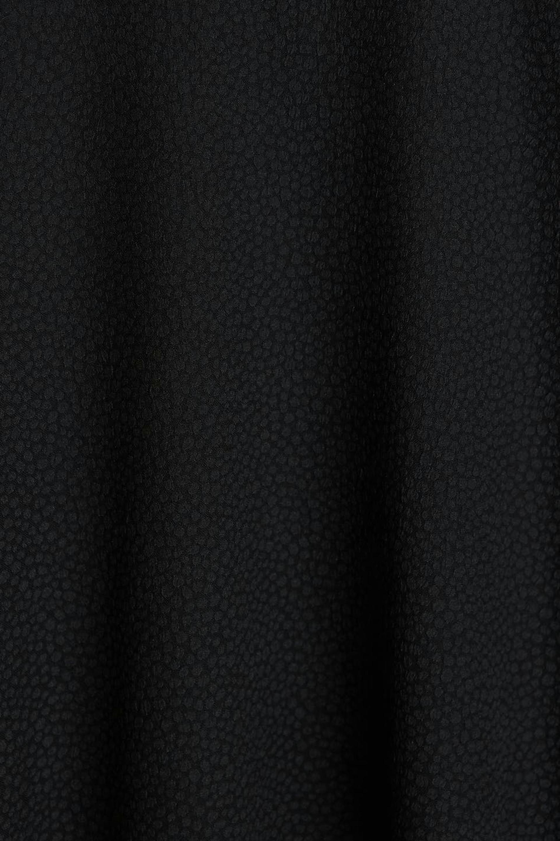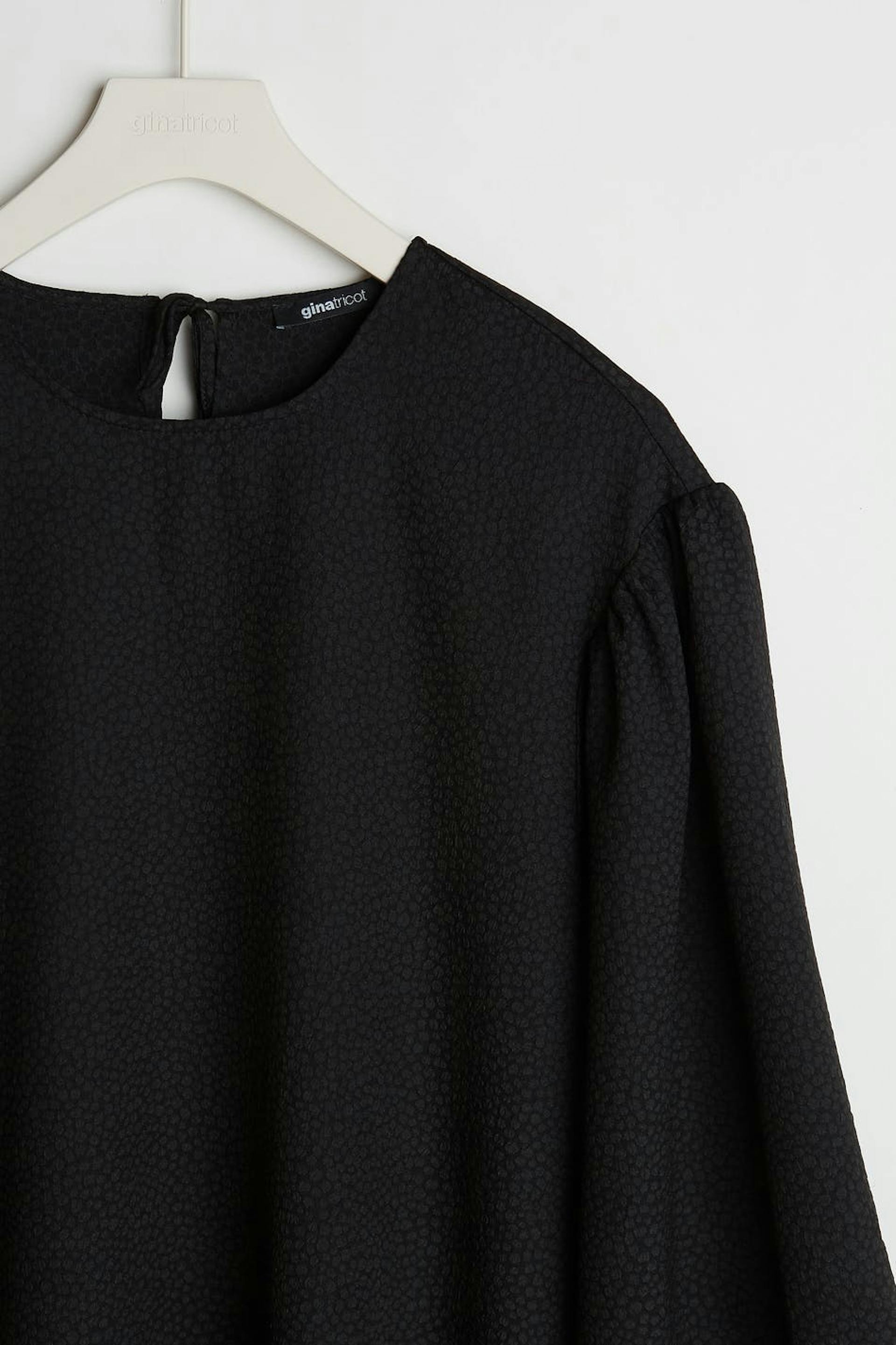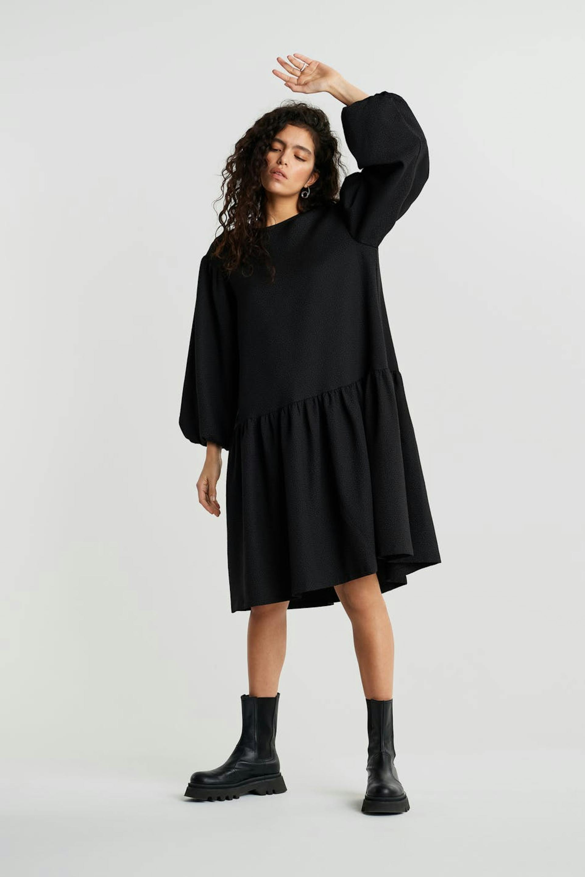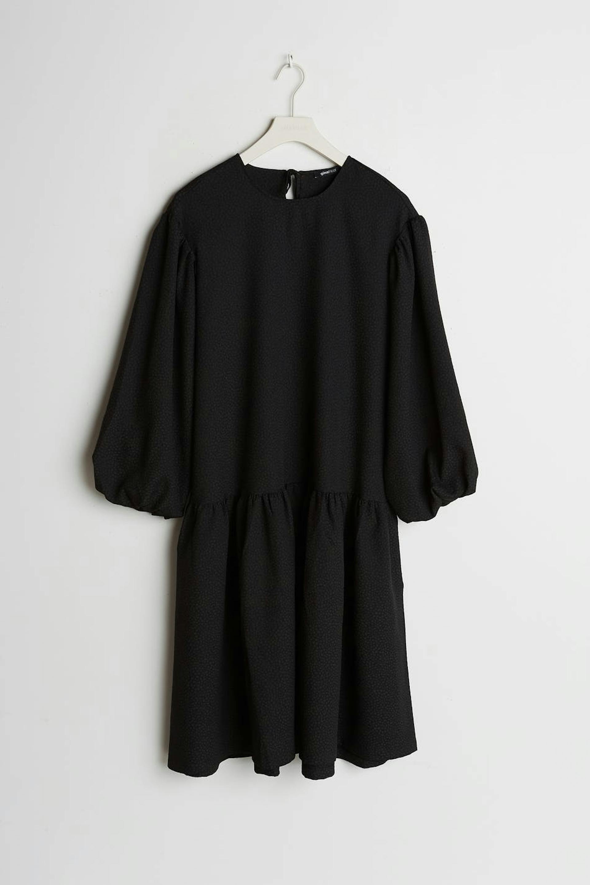 Treaded dress with big, 3/4 length puff sleeves. The dress is black and has gathering on the skirt. It has a self-tie at the neck and midi length.