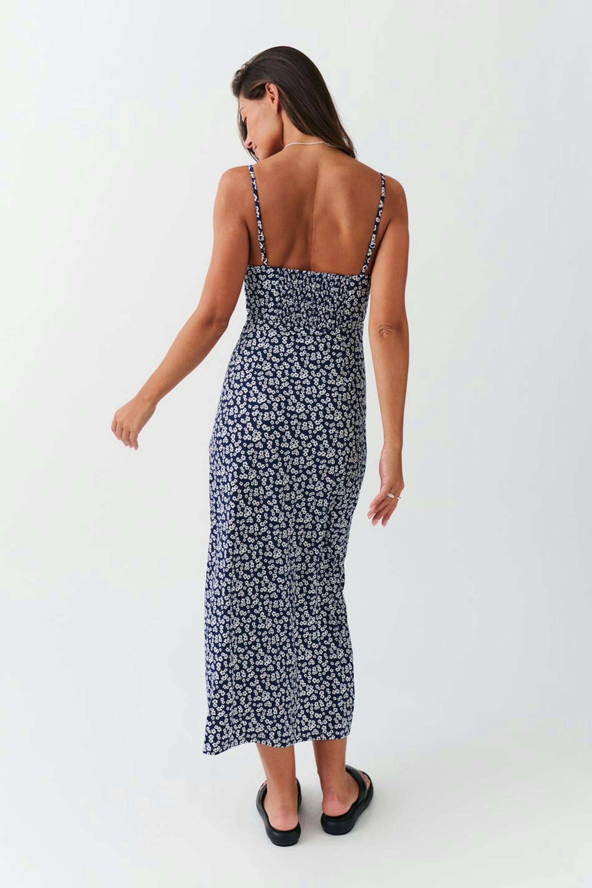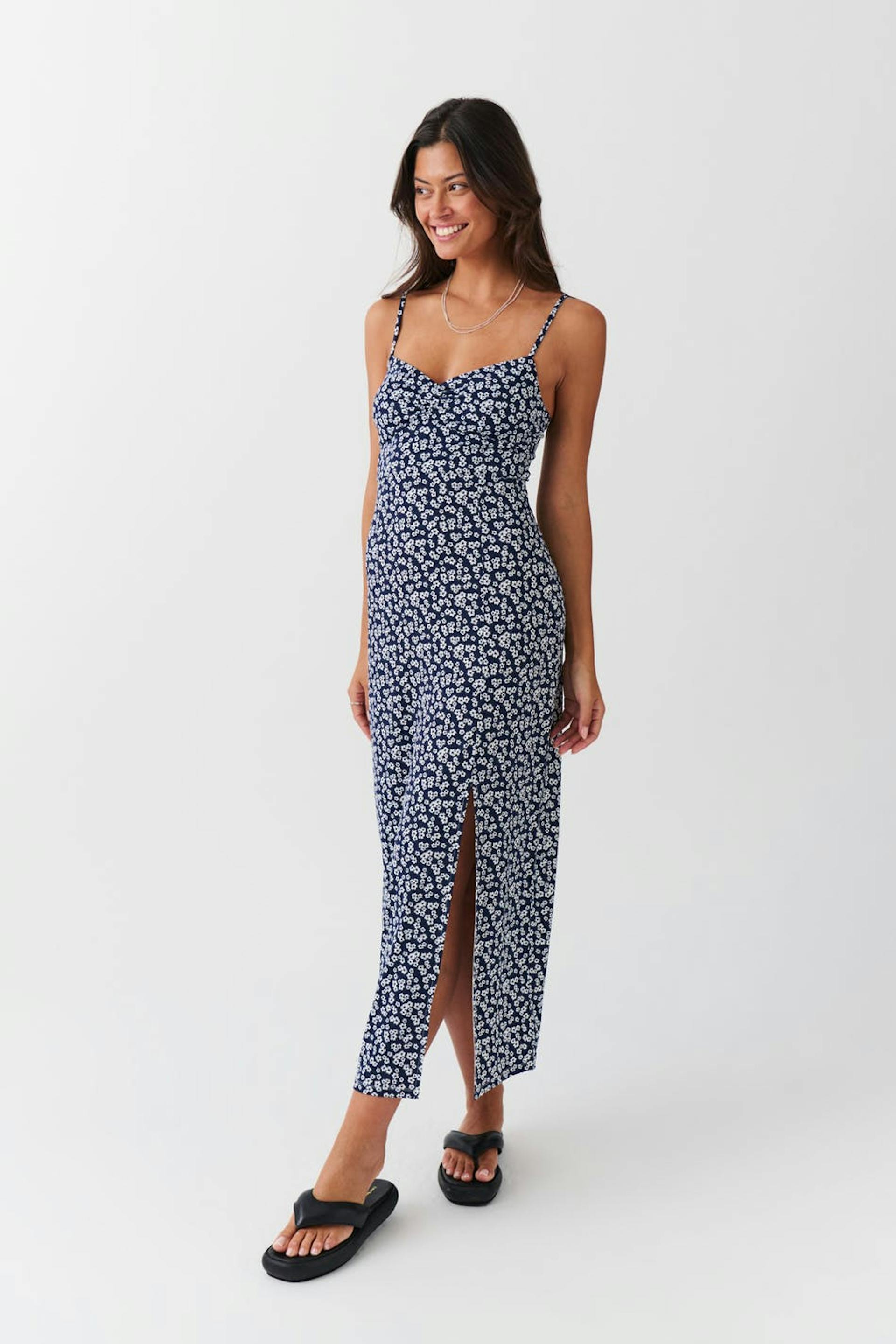 Floral dress in jersey with high slit at the front. The dress is blue, white and sleeveless. It has figure-hugging fit, v-neck, adjustable shoulder straps and smocking in the back.