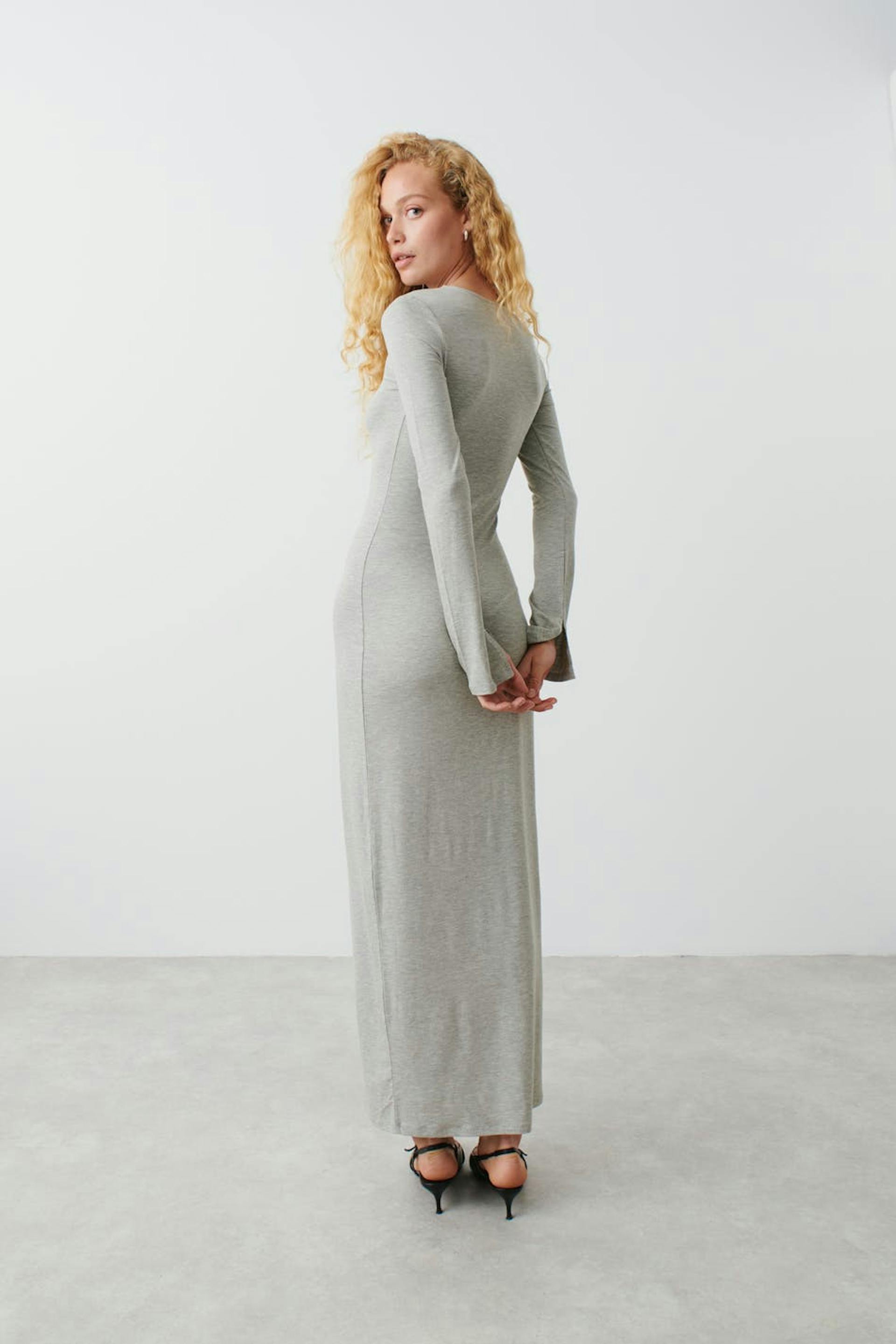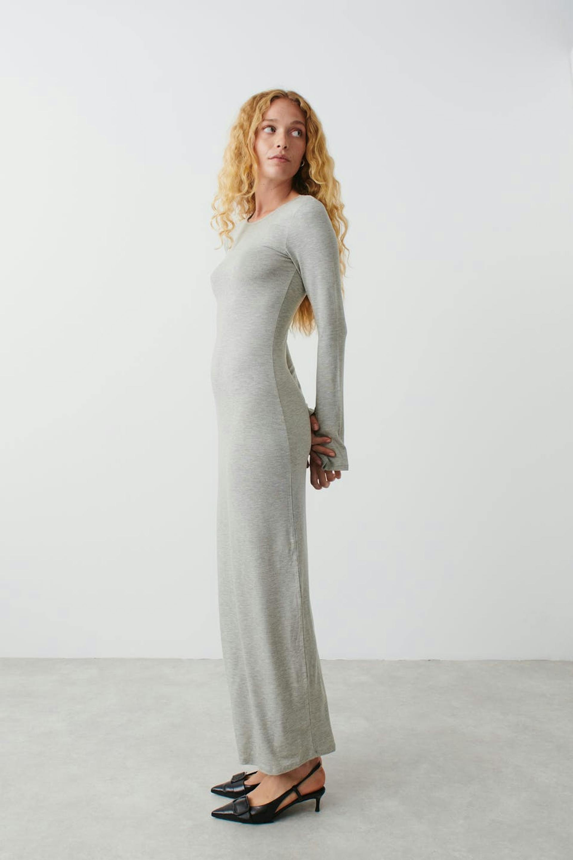 Soft touch – second skin comfort. Long-sleeved maxi dress in soft viscose with slit on the sleeve ends. The dress is grey and has round neckline.