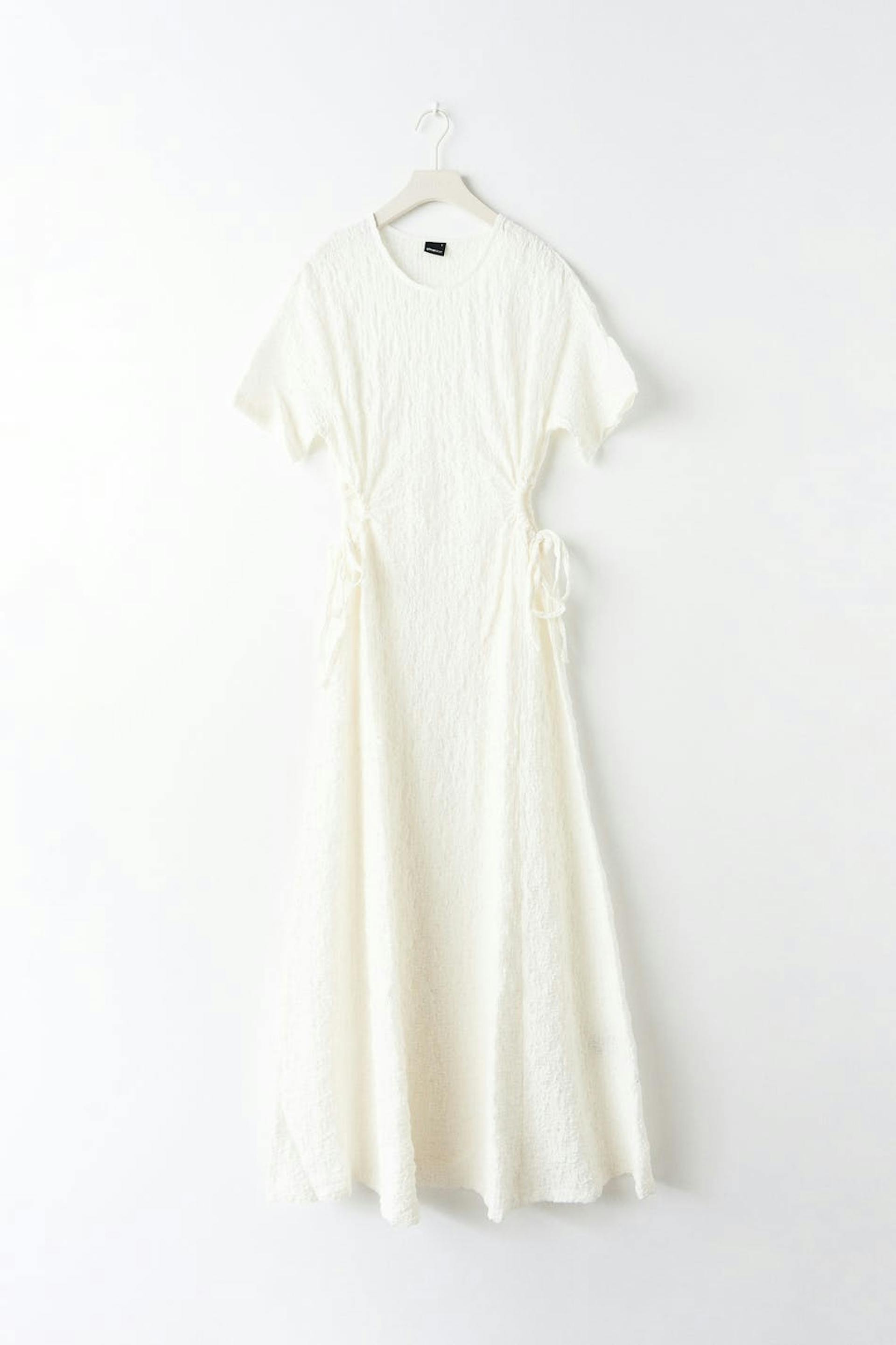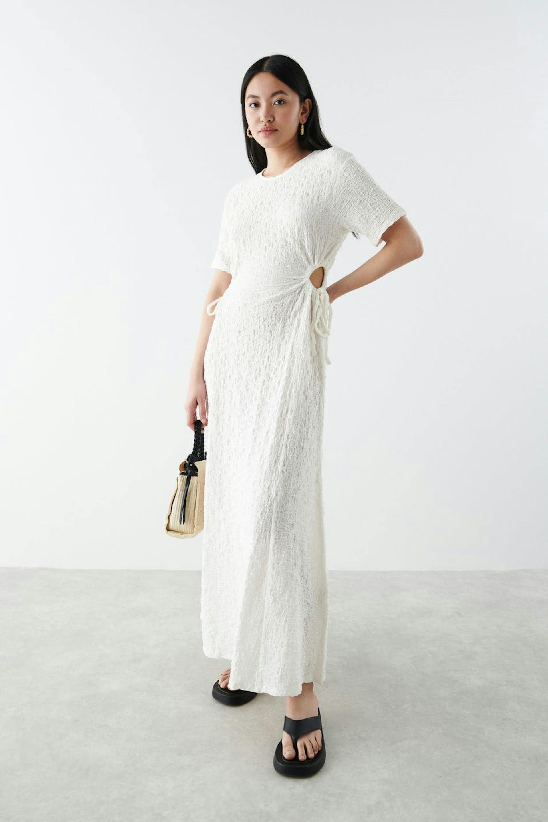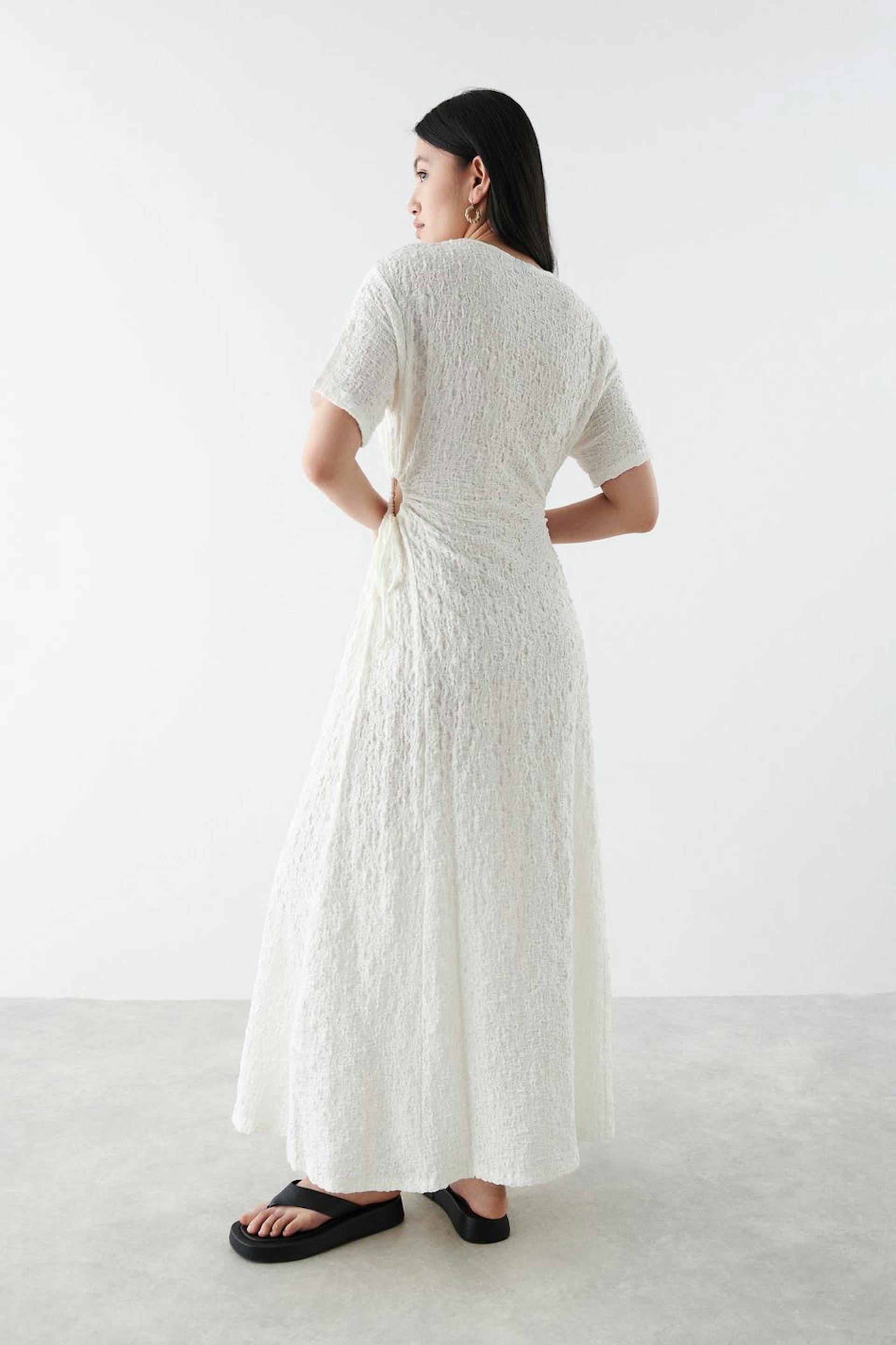 Dress in jersey with a regular fit. The dress is white and has keyholes at the waist. It has a boxy sleeve form and tie strings on the side.