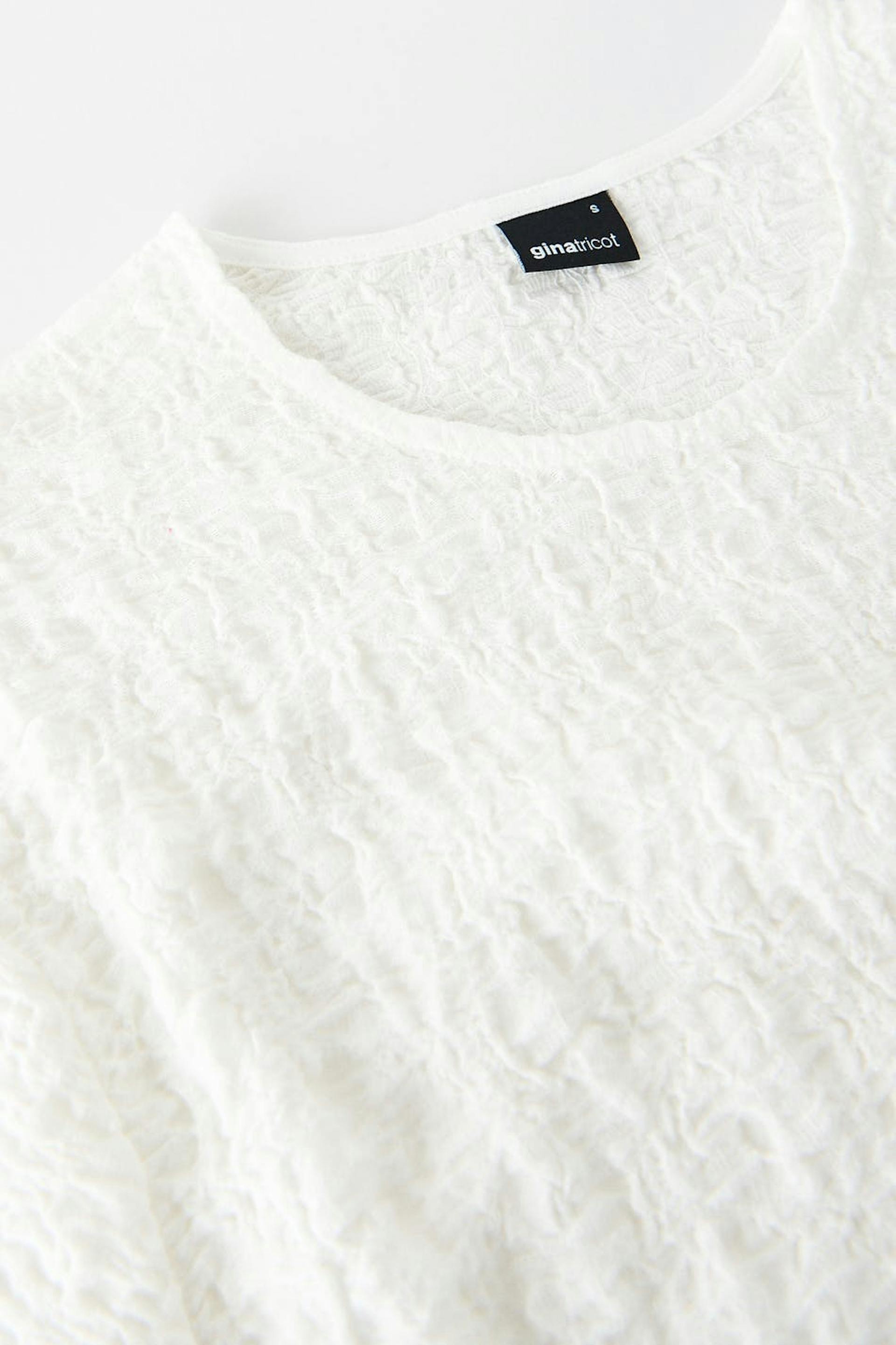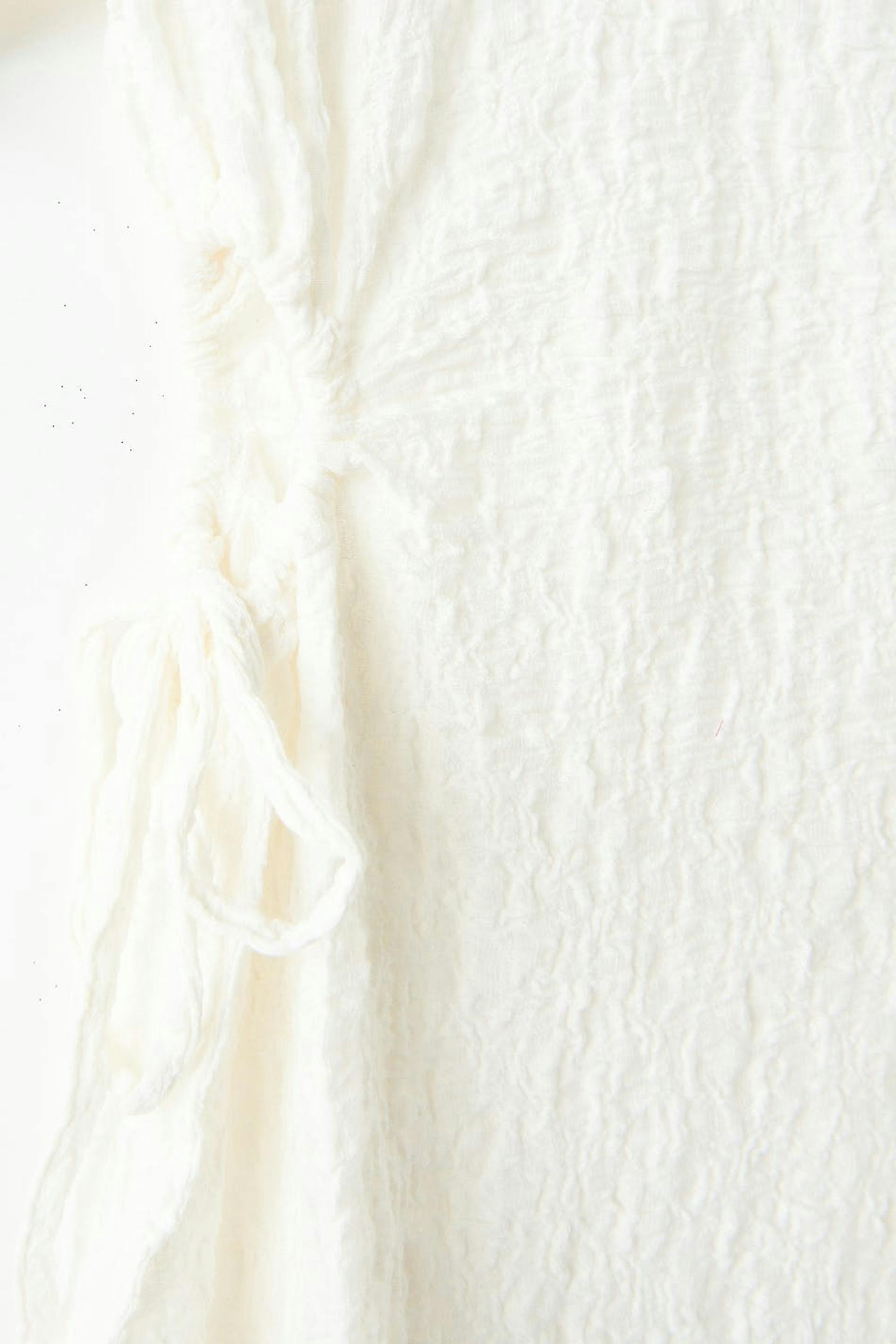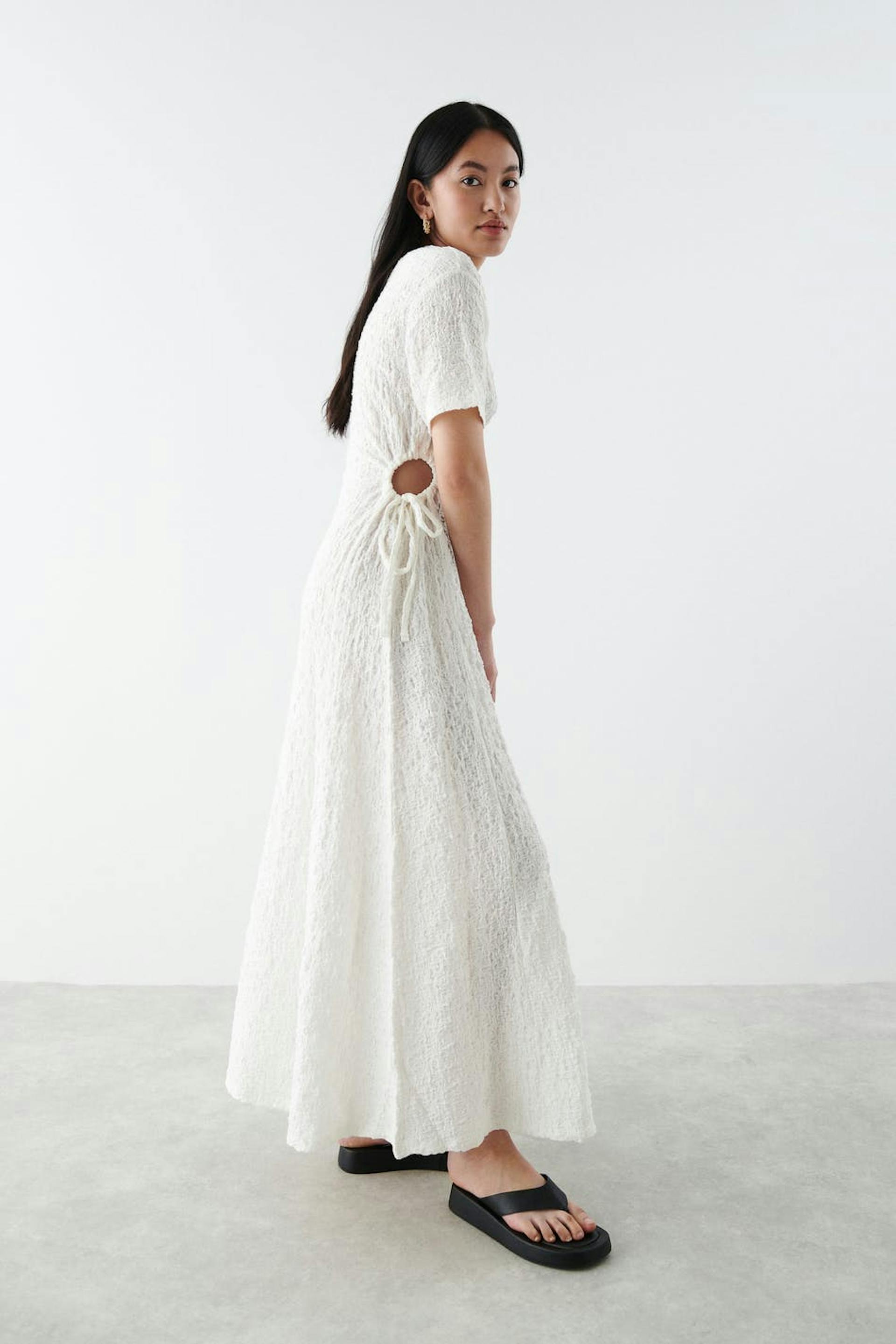 Dress in jersey with a regular fit. The dress is white and has keyholes at the waist. It has a boxy sleeve form and tie strings on the side.