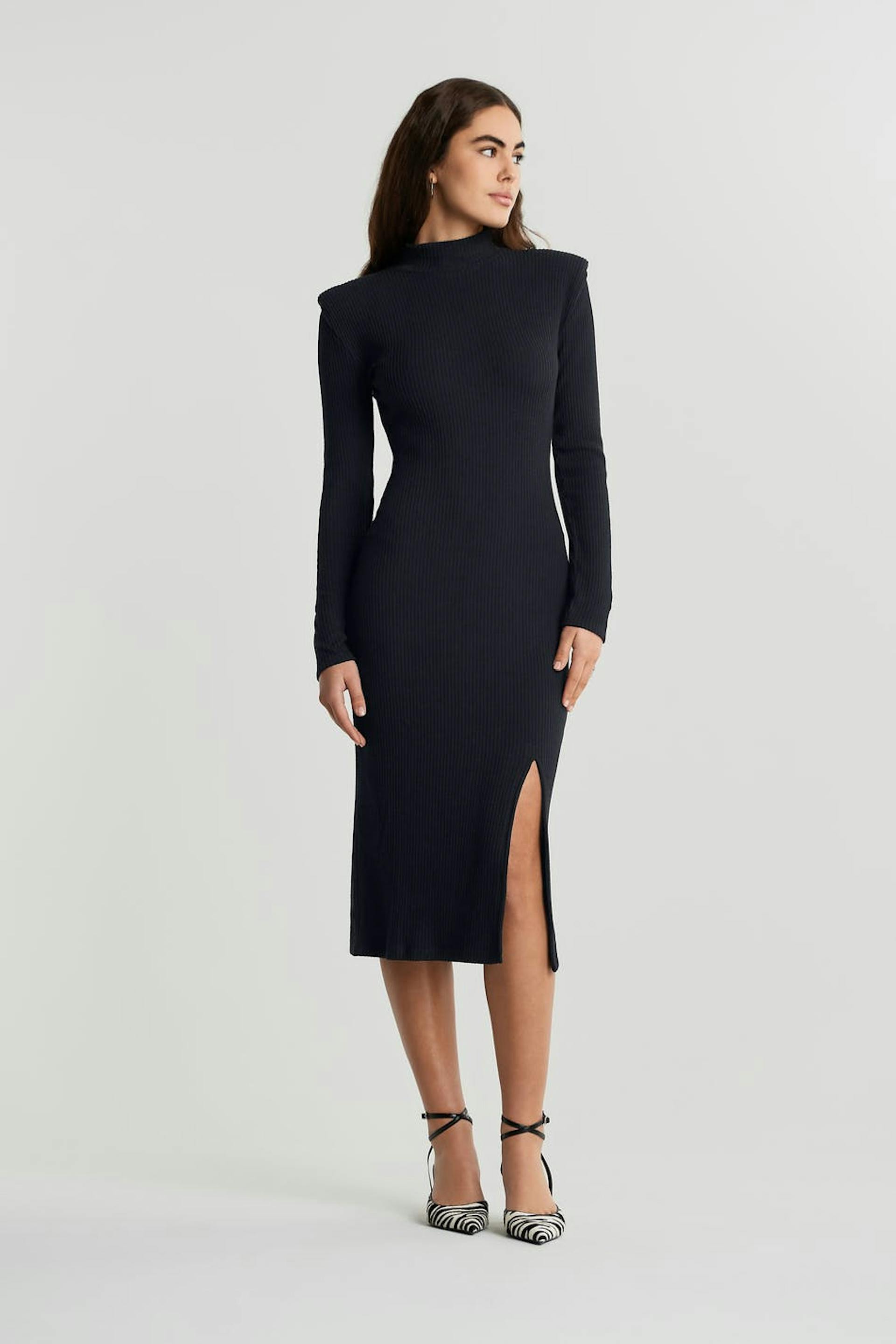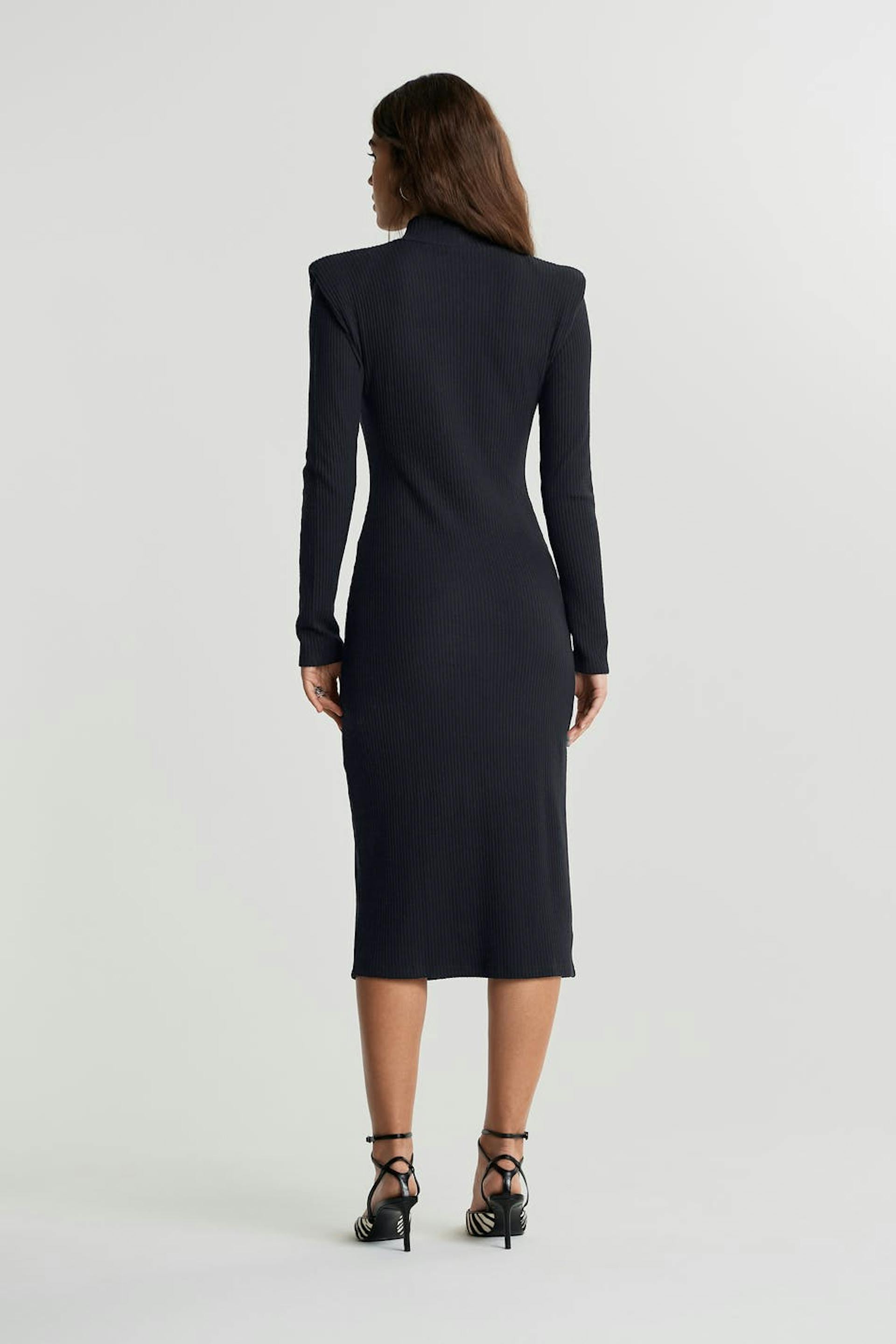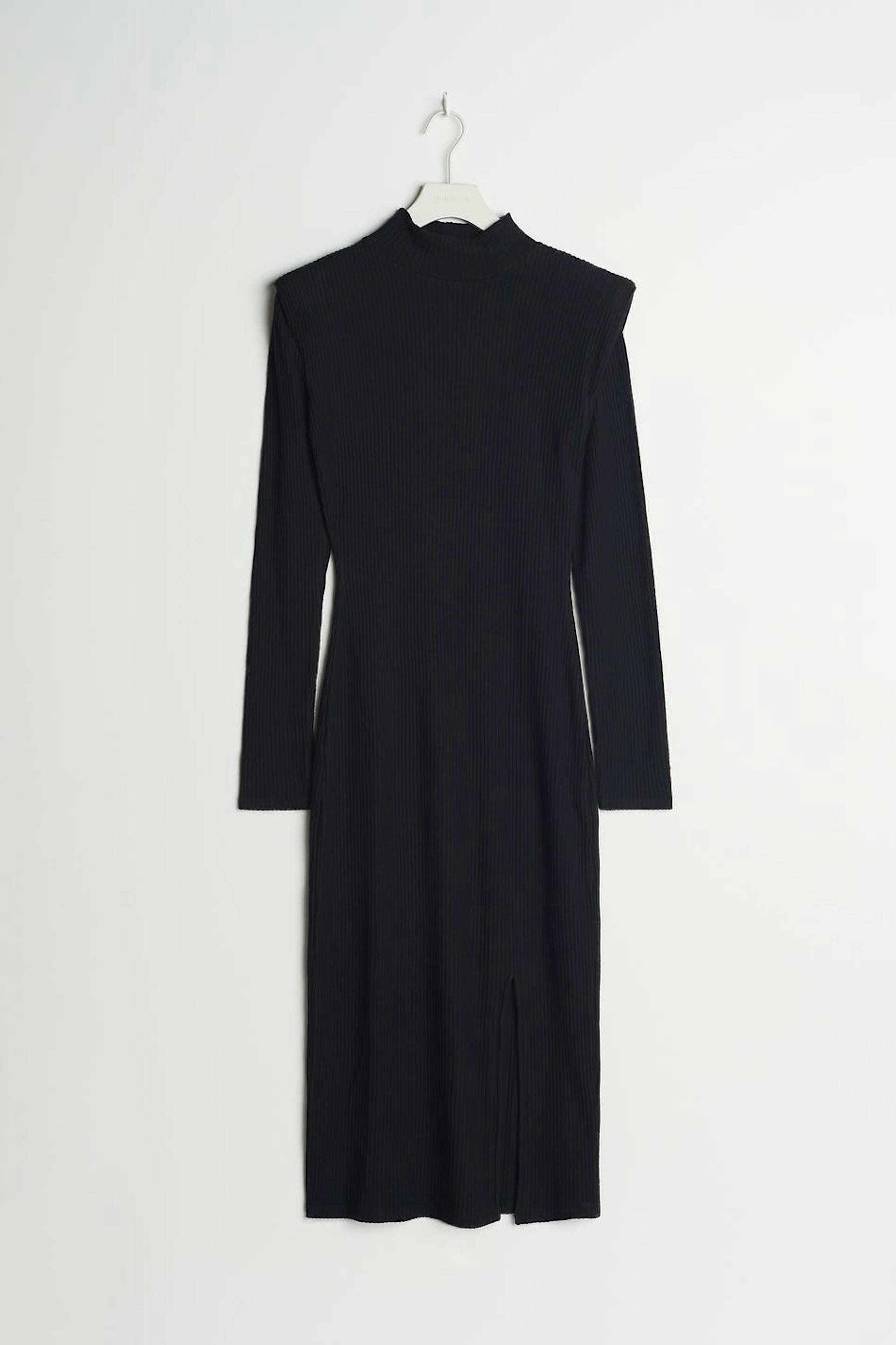 Long-sleeved dress with a regular fit. The dress is black and has a high neckline. It has visible shoulder pads, a slit on the skirt, a fitted fit and midi length.