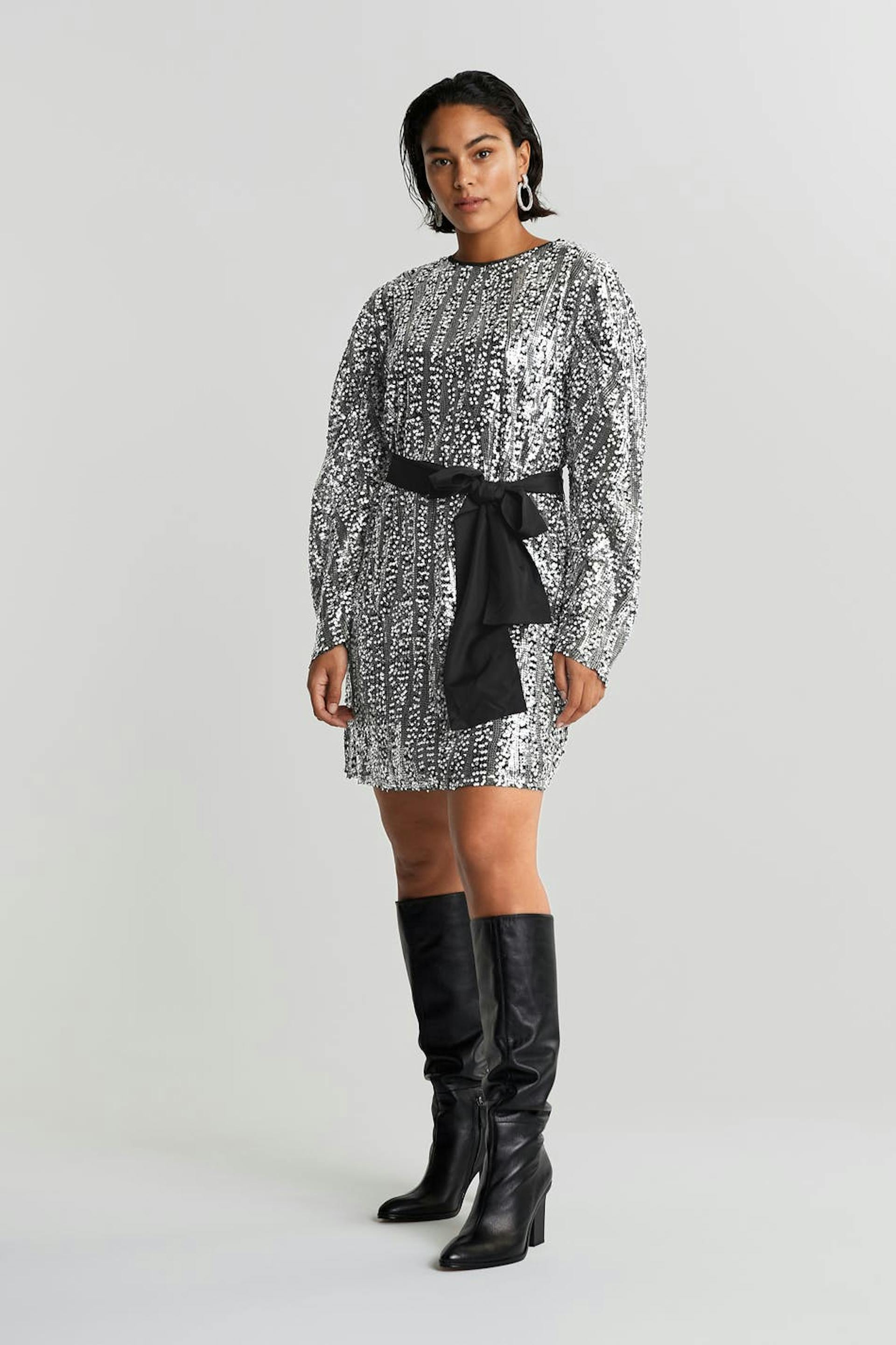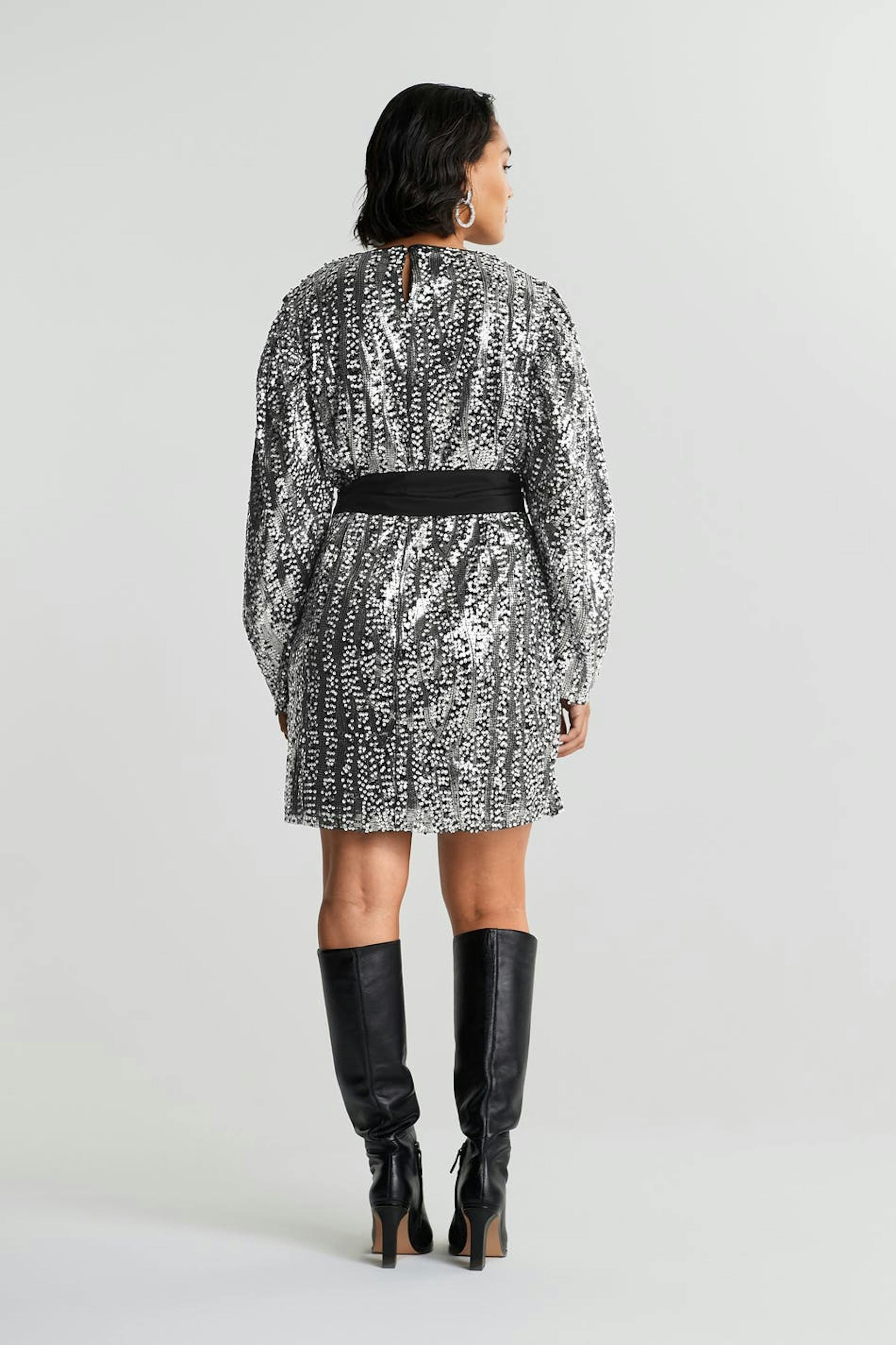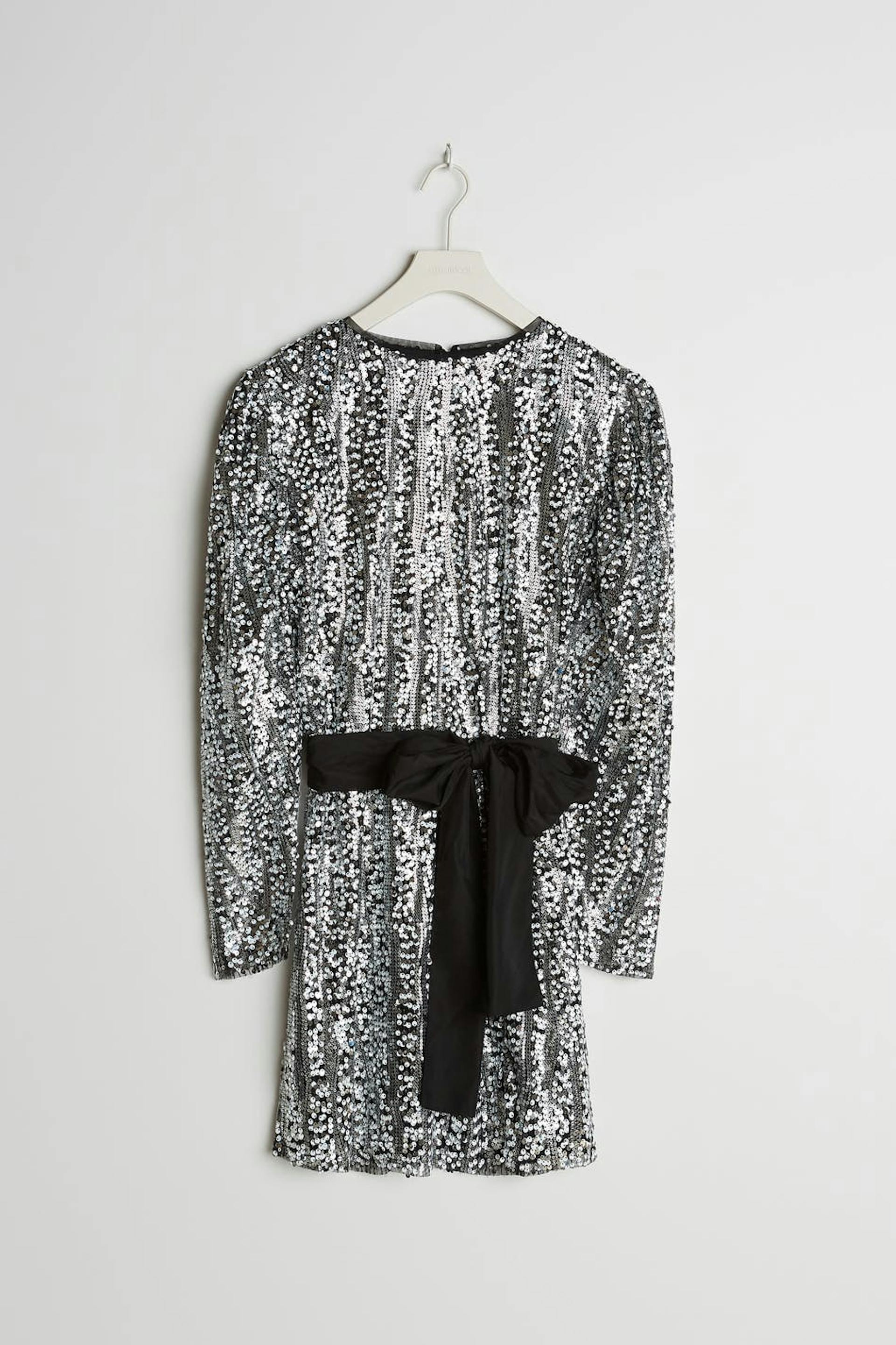Long-sleeved dress with a regular fit. The dress is perfect for the party and short and has silver coloured glitter. It has a black tie strap at the waist.