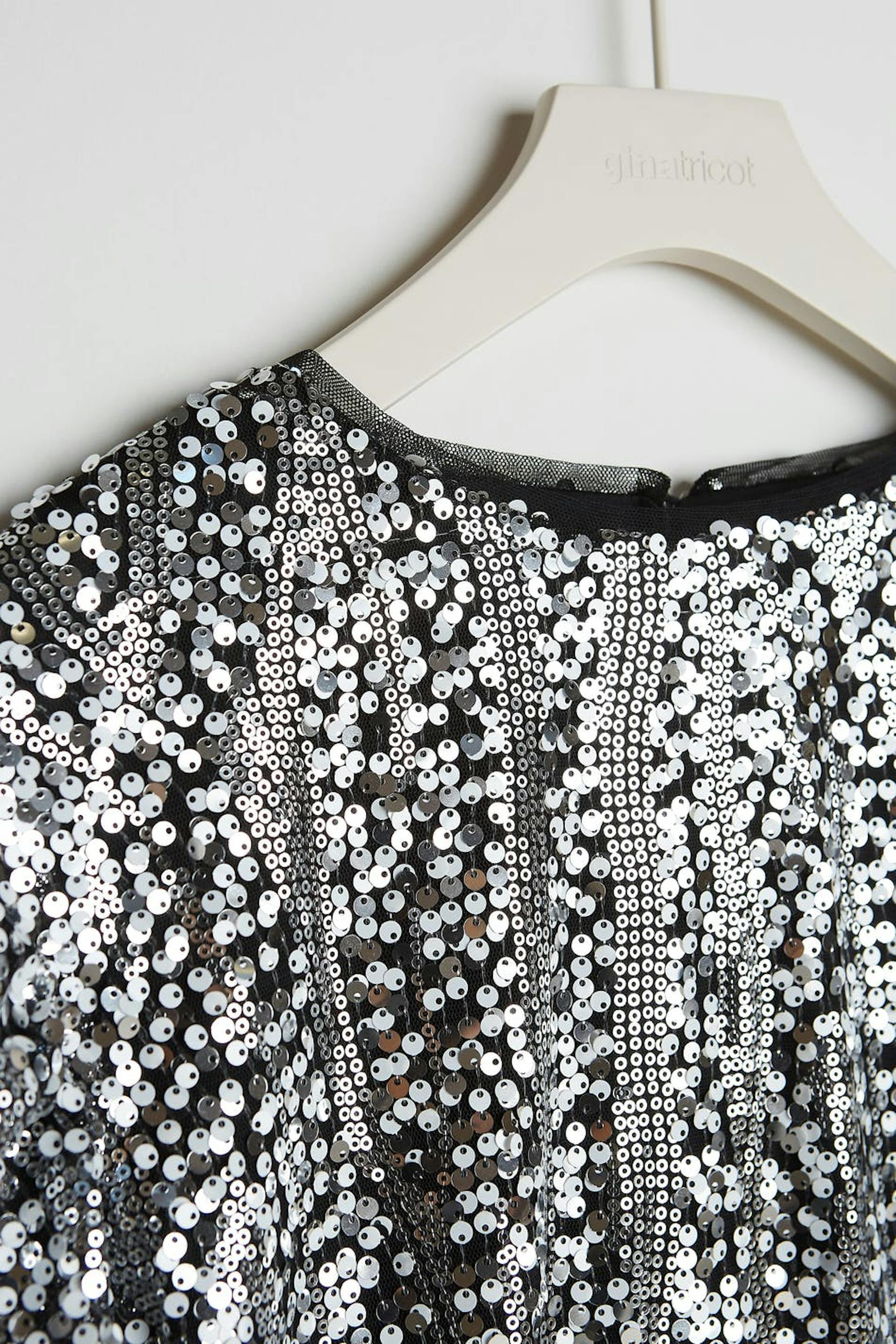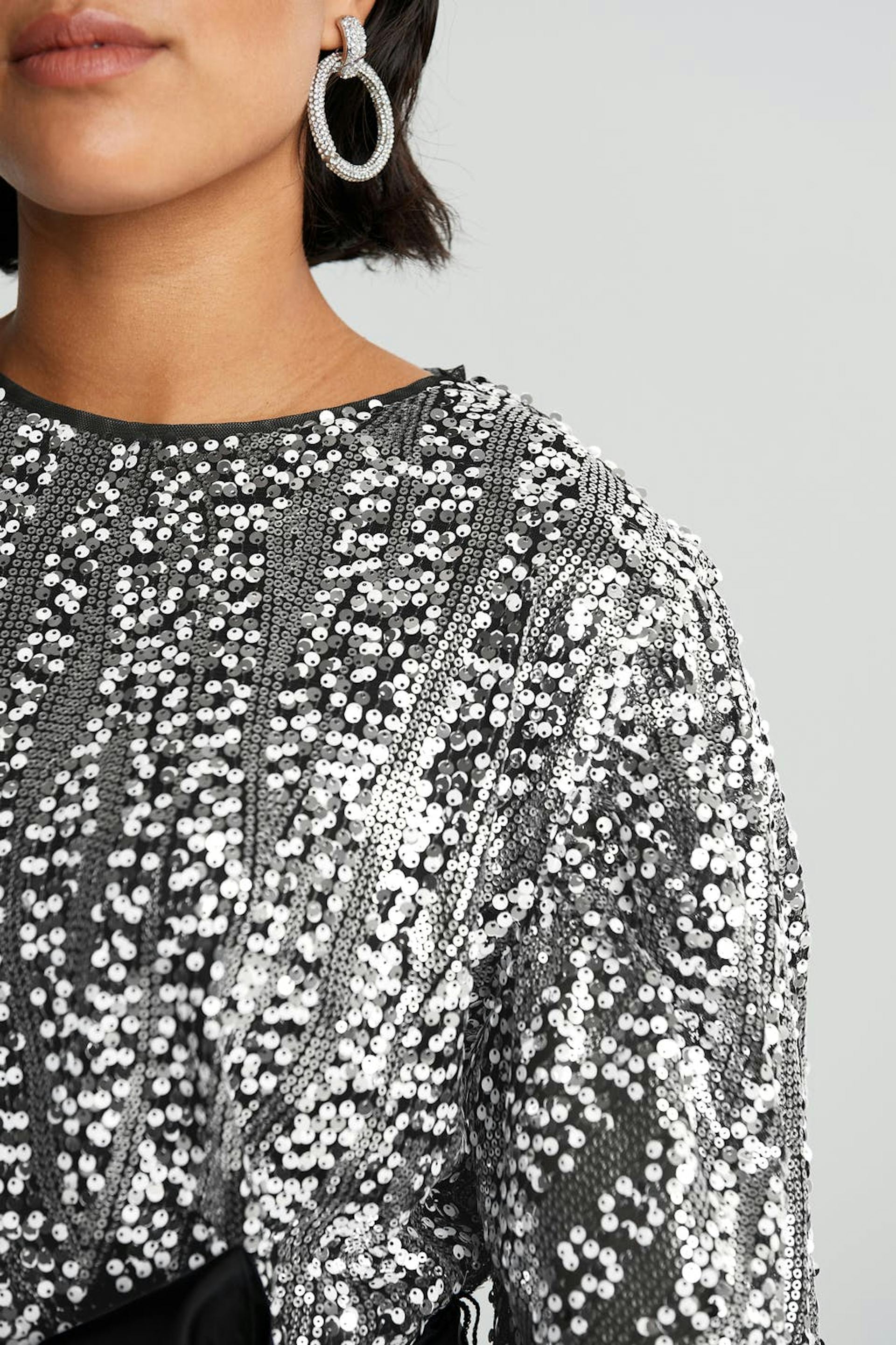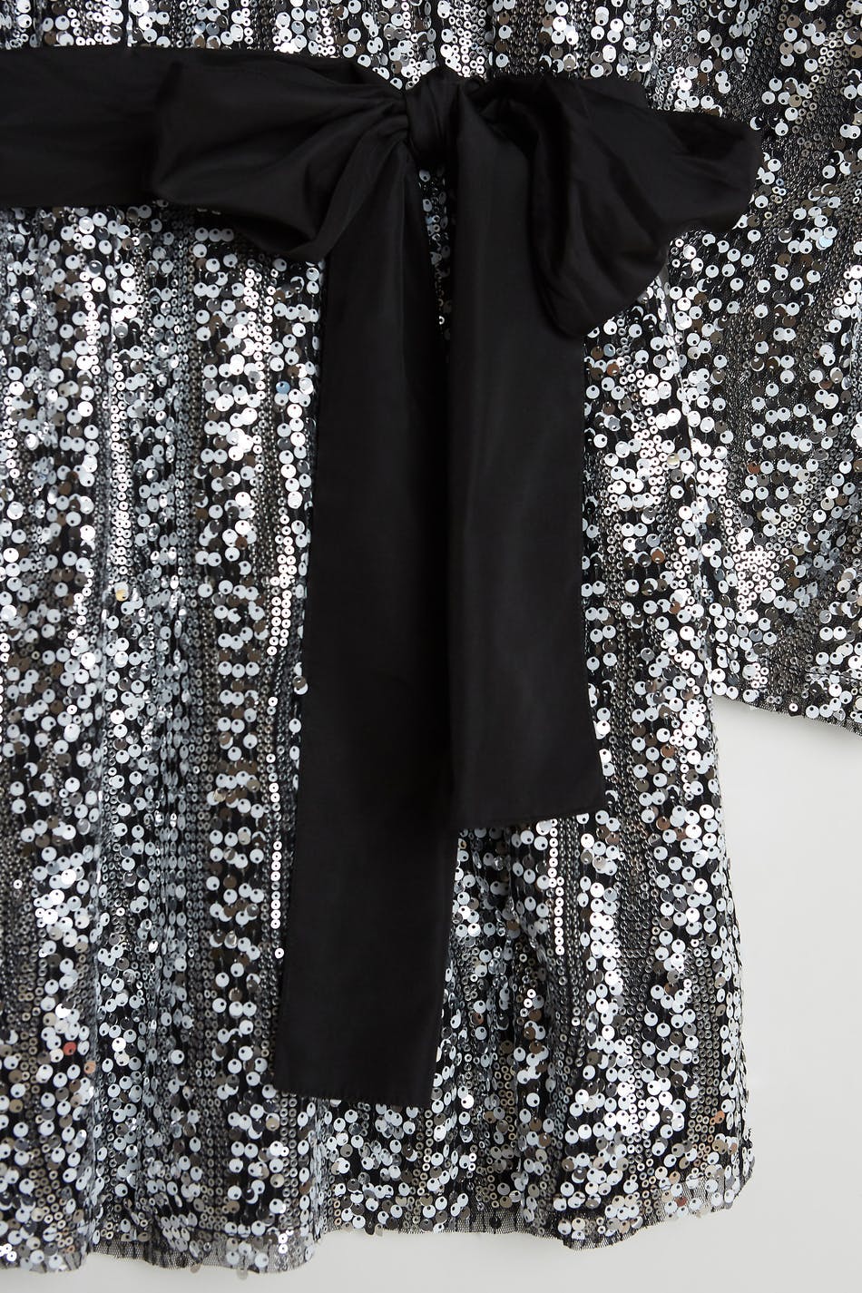Long-sleeved dress with a regular fit. The dress is perfect for the party and short and has silver coloured glitter. It has a black tie strap at the waist.