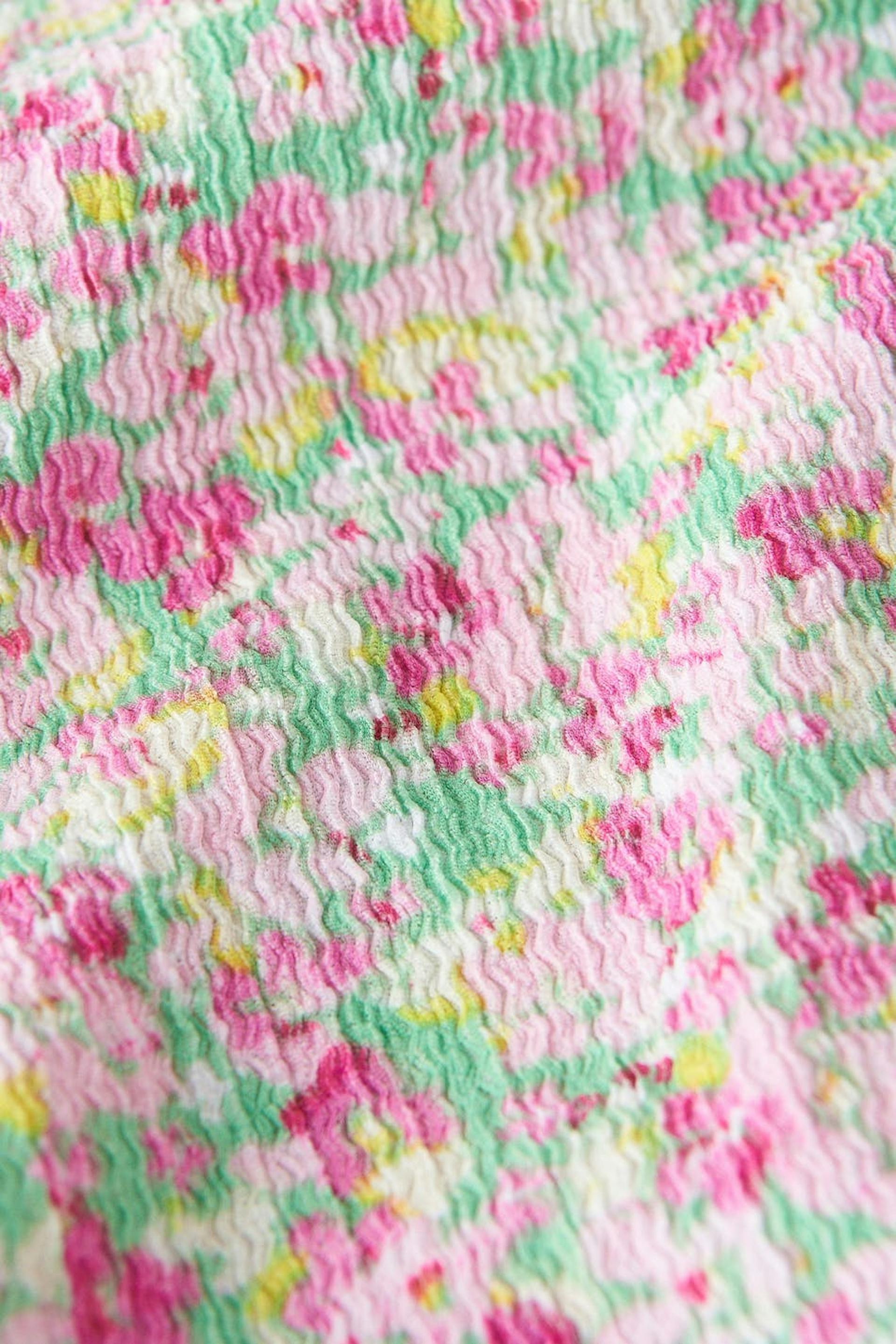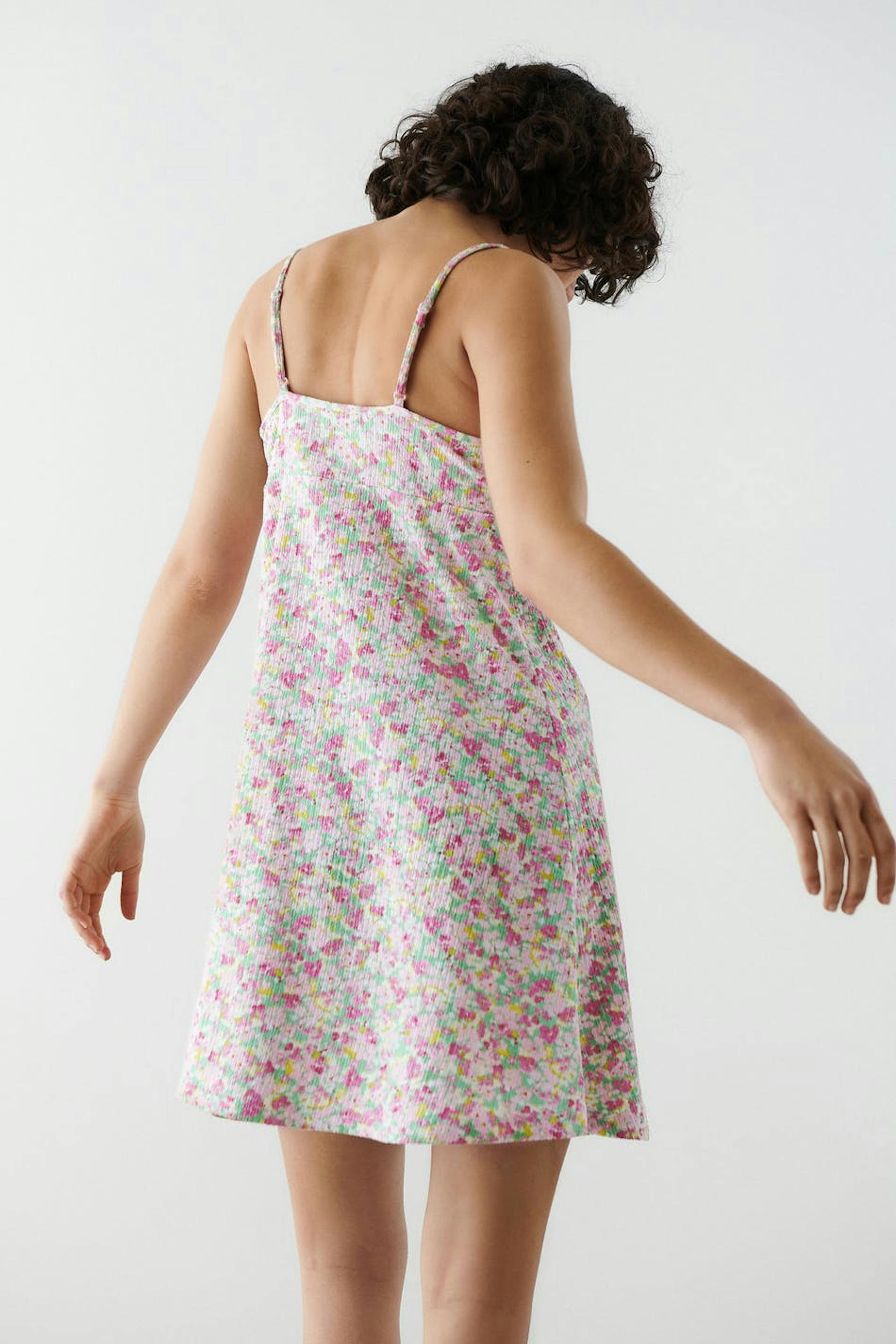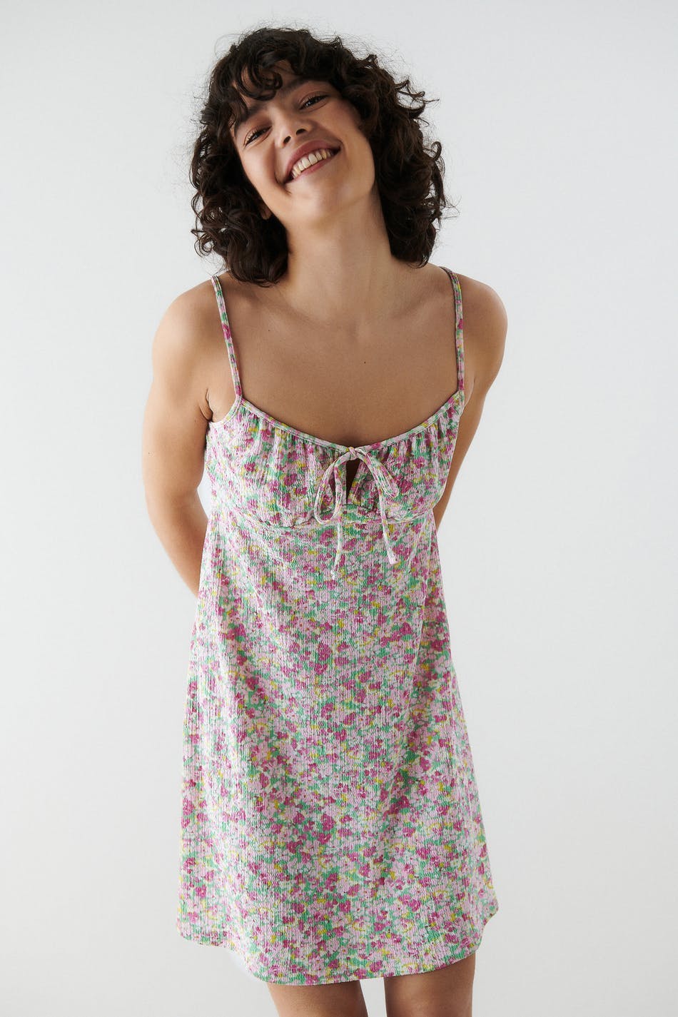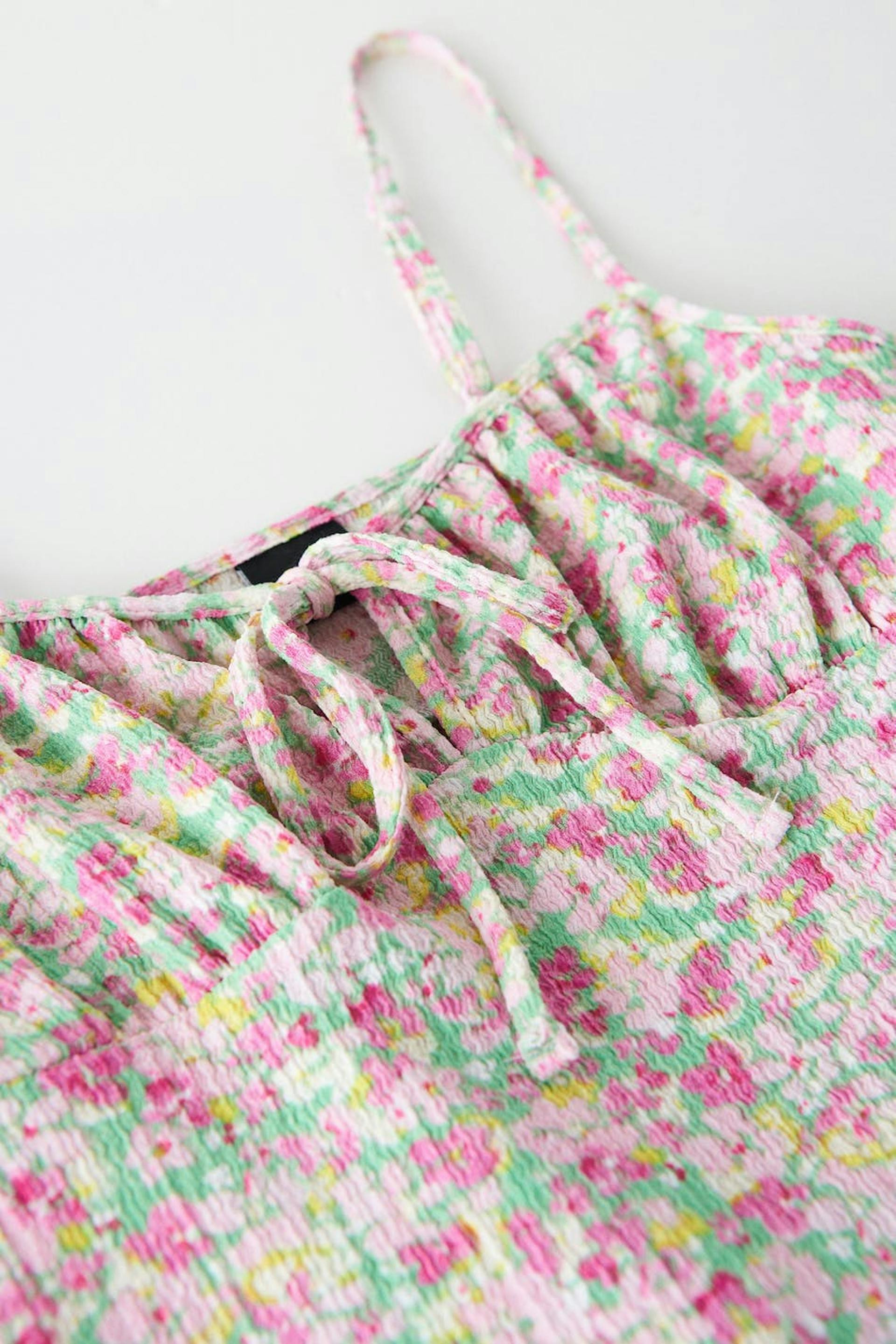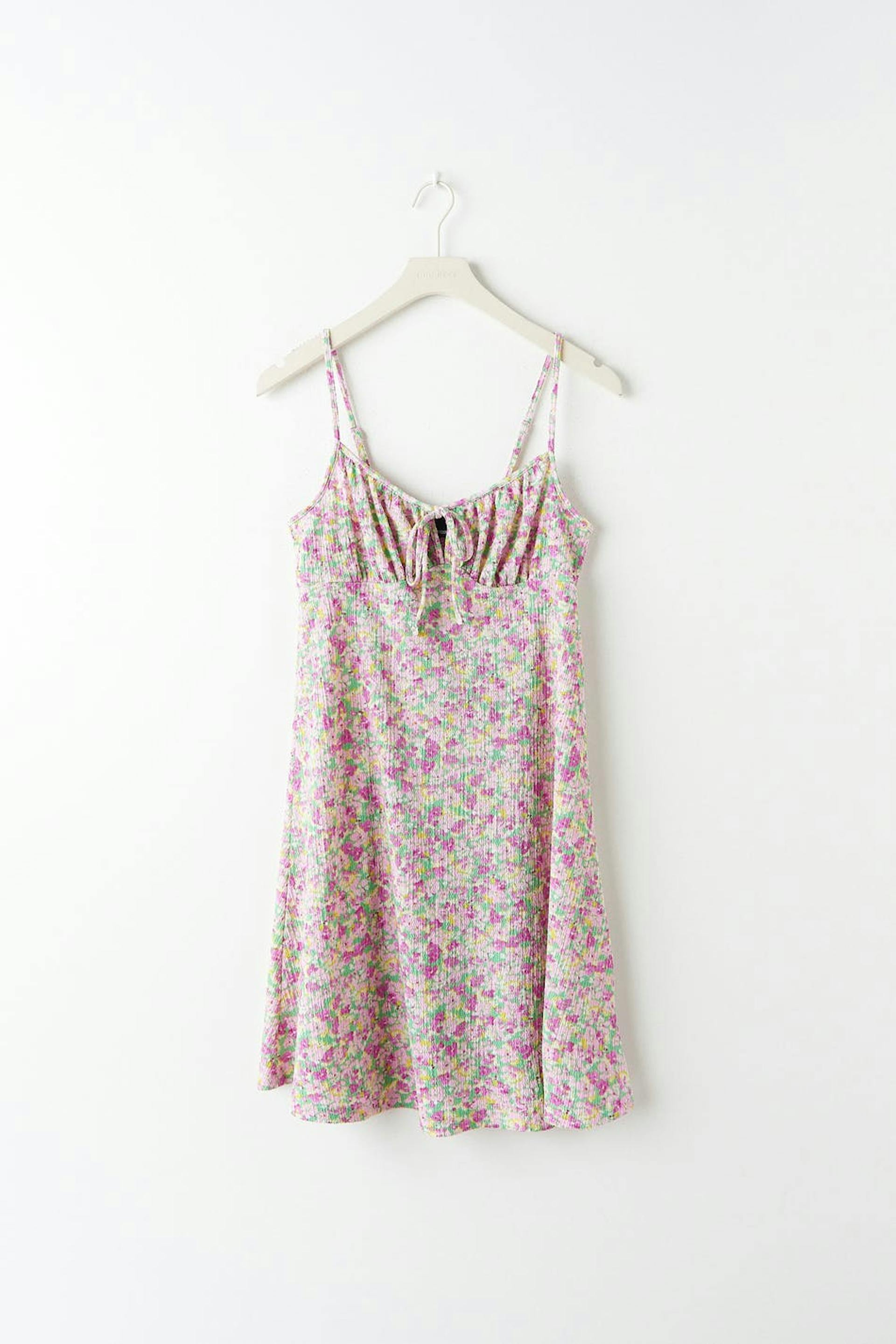 Floral dress in recycled polyester with a knot detail at the front. The dress is pink and short and has a structured material. It has thin, adjustable shoulder straps and a seam detail below the bust with gathering.