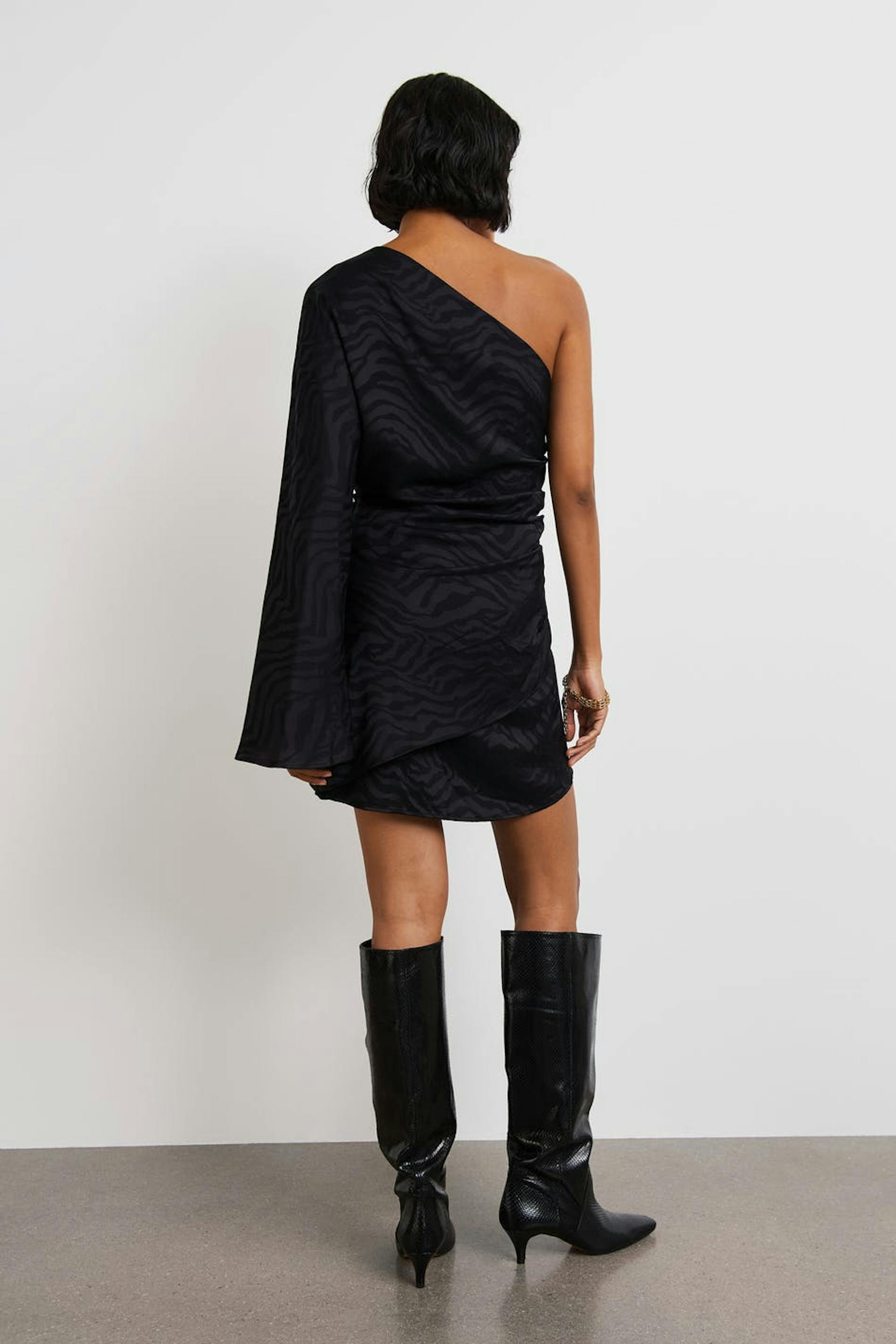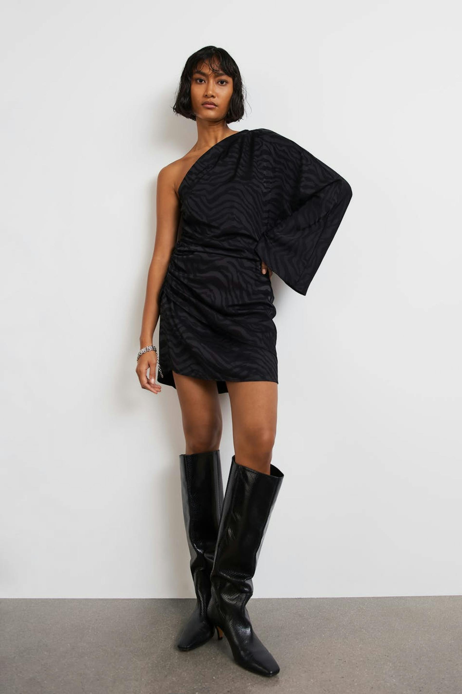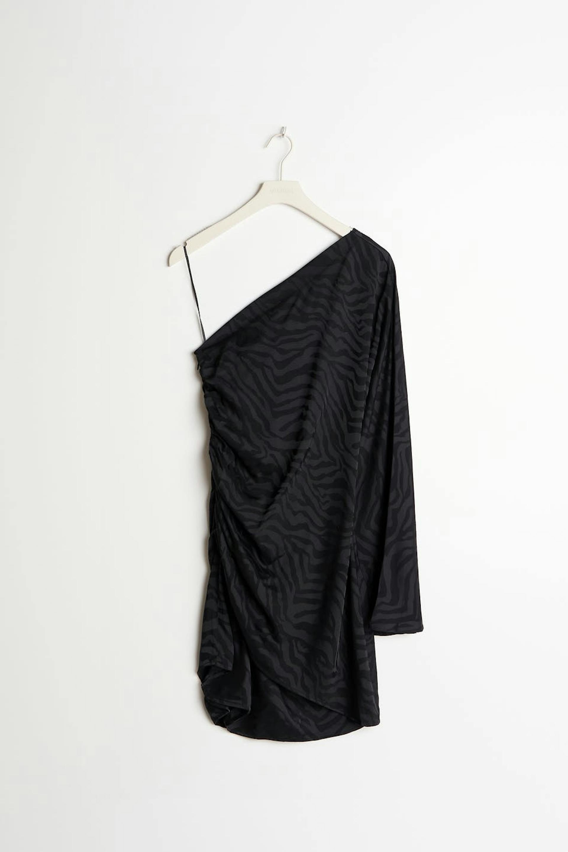 Zebra patterned dress with gathering. The dress is perfect for the party, black and short. It has a woven quality and a long, flared sleeve.