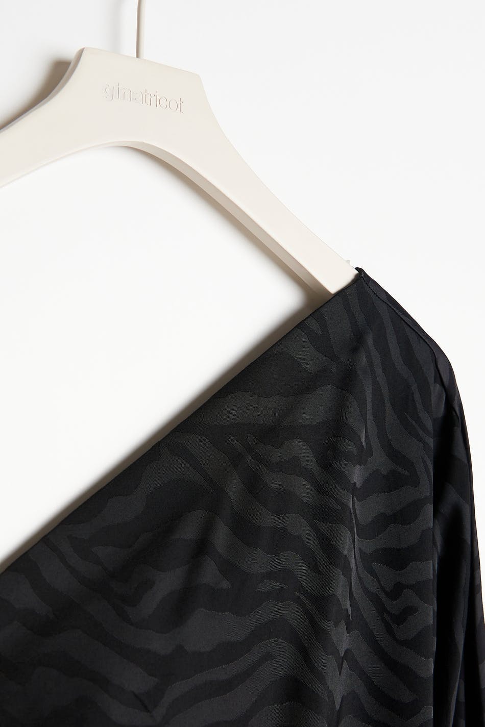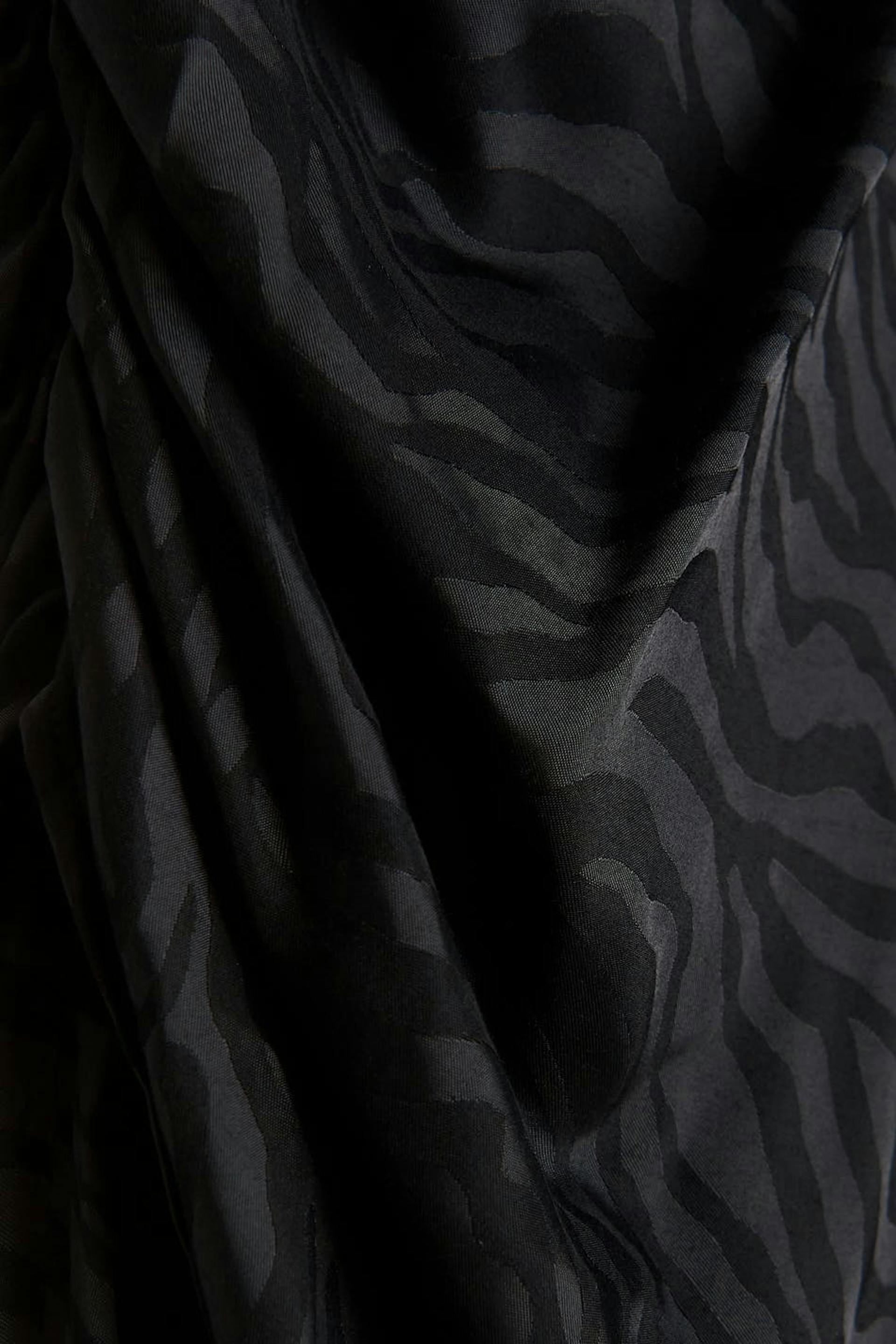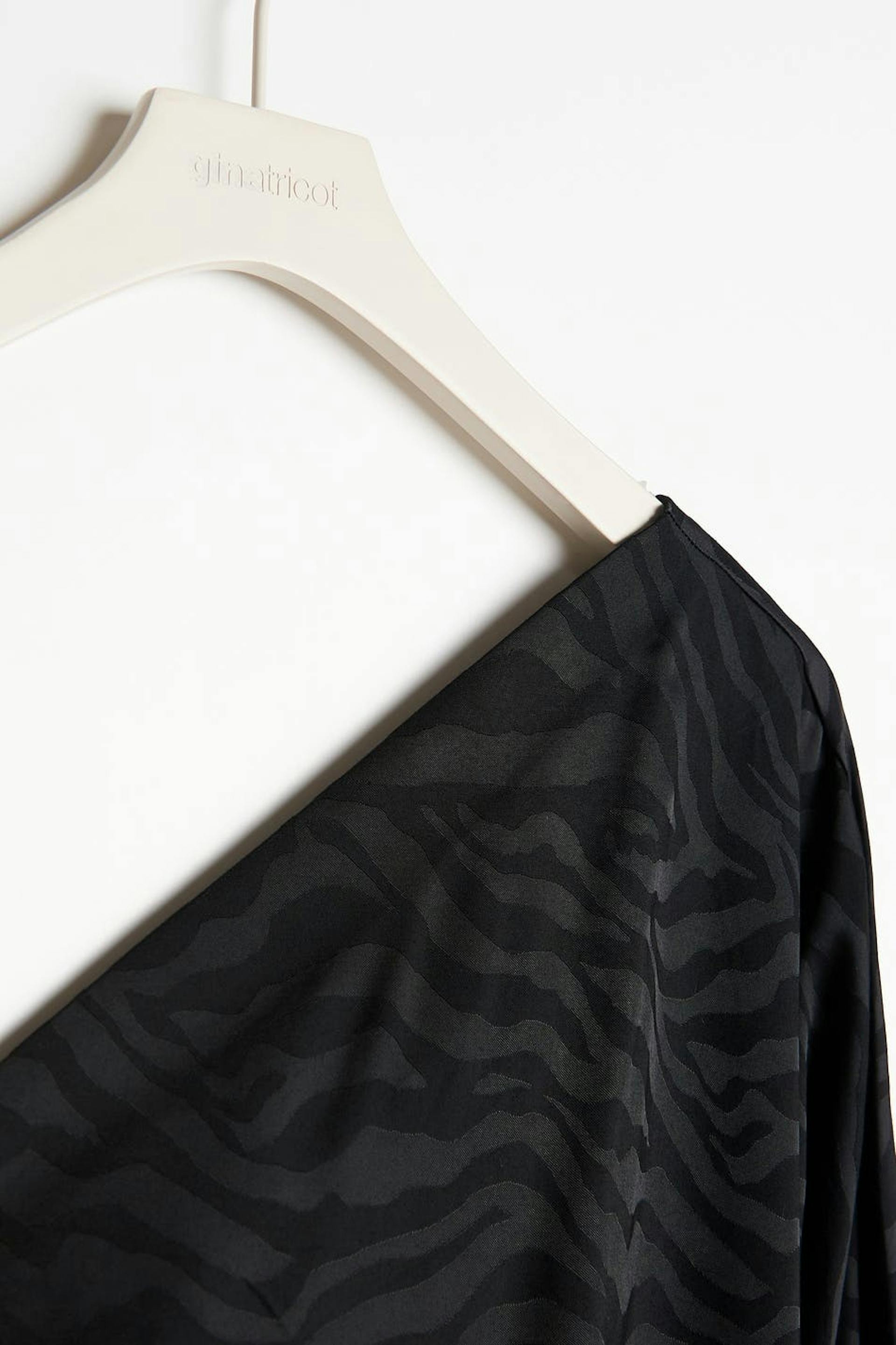 Zebra patterned dress with gathering. The dress is perfect for the party, black and short. It has a woven quality and a long, flared sleeve.