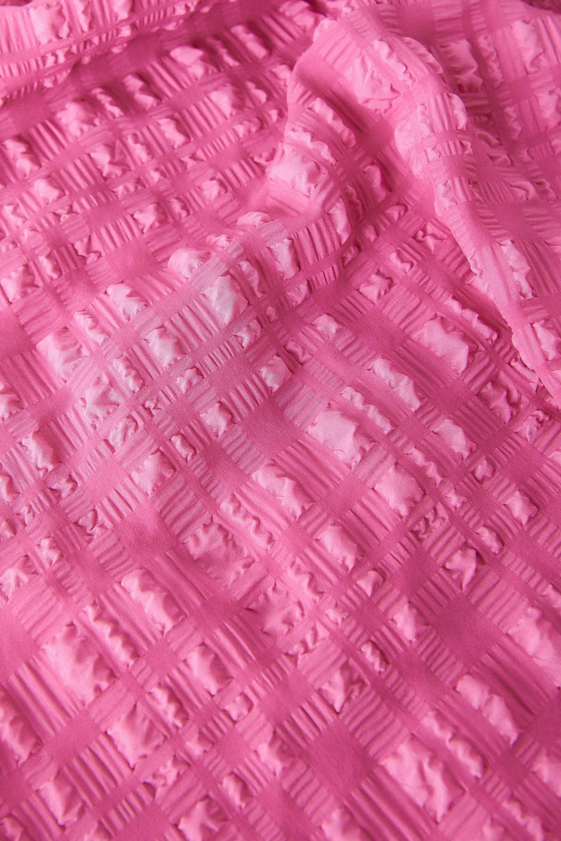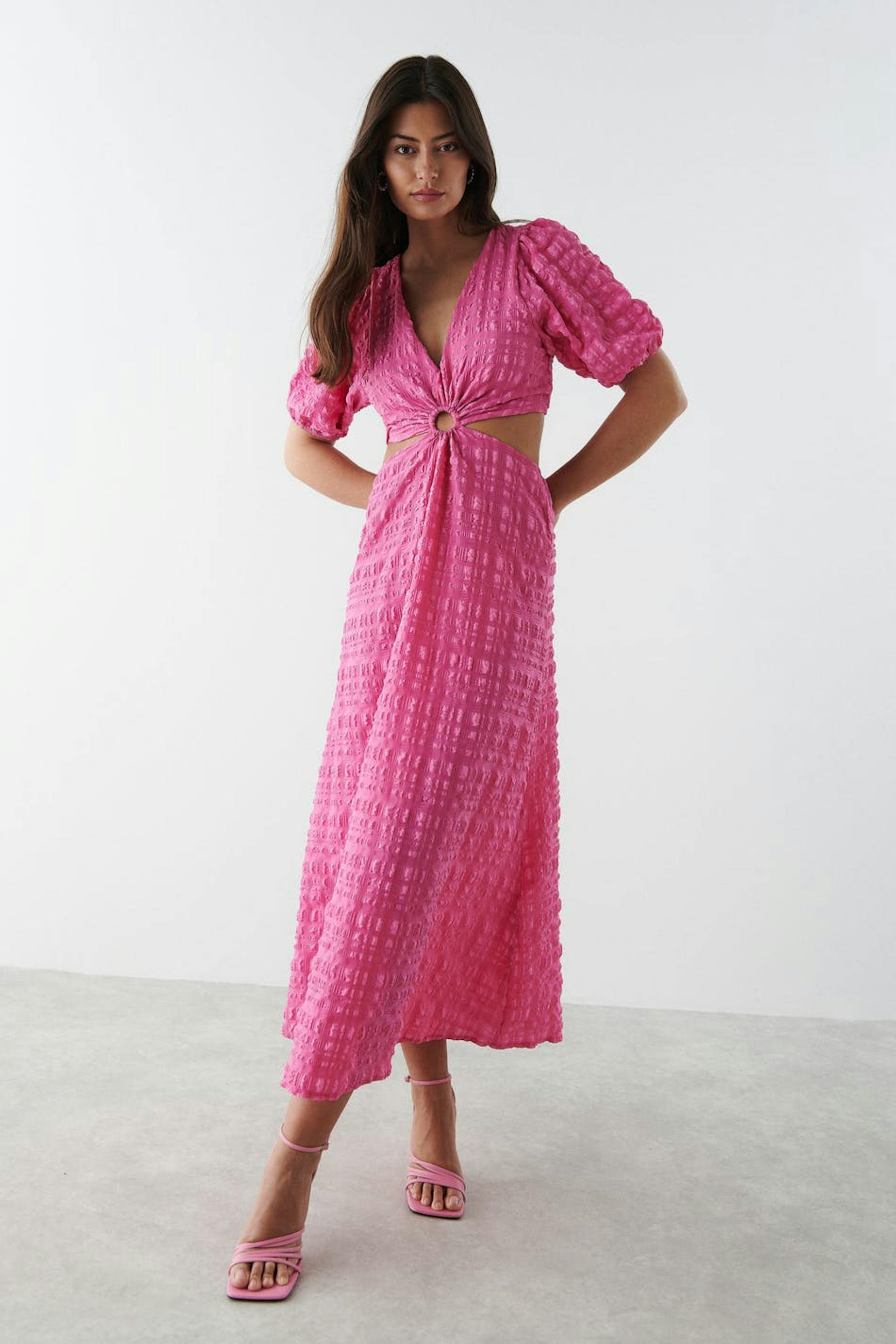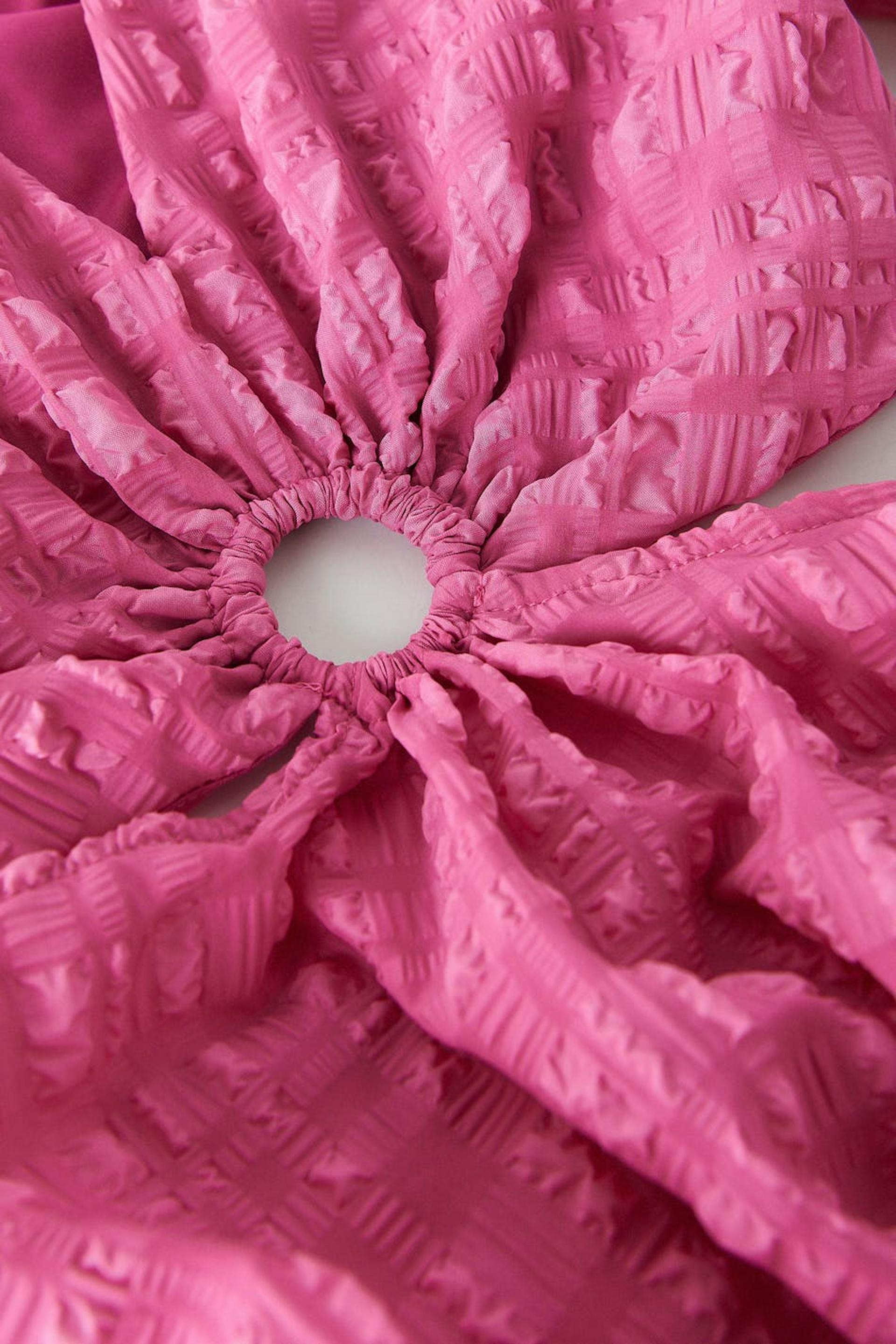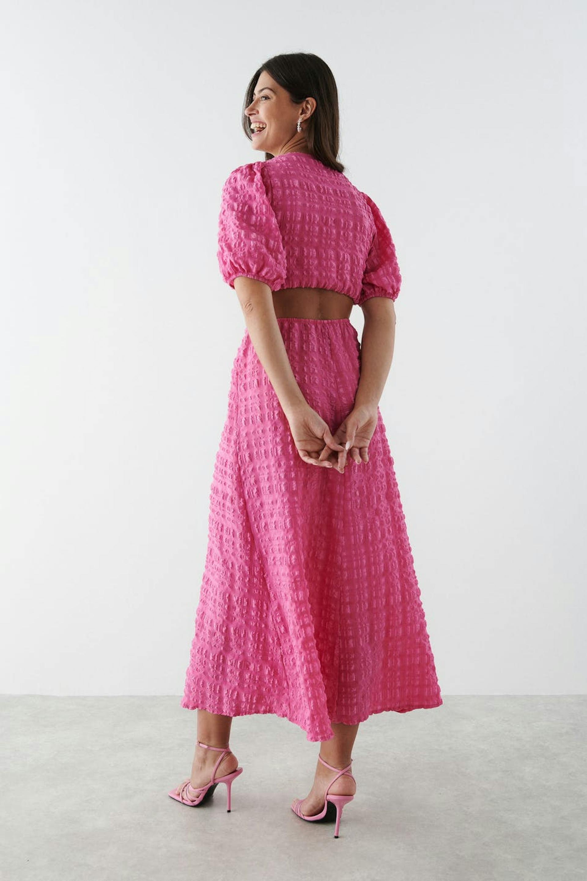 Midi dress in seersucker with v-neck cut. The dress is pink and has short puff sleeves with elasticized cuff. It has a fitted fit, a structured material in recycled polyester and cut-out details at the waist with a keyhole opening at the front.