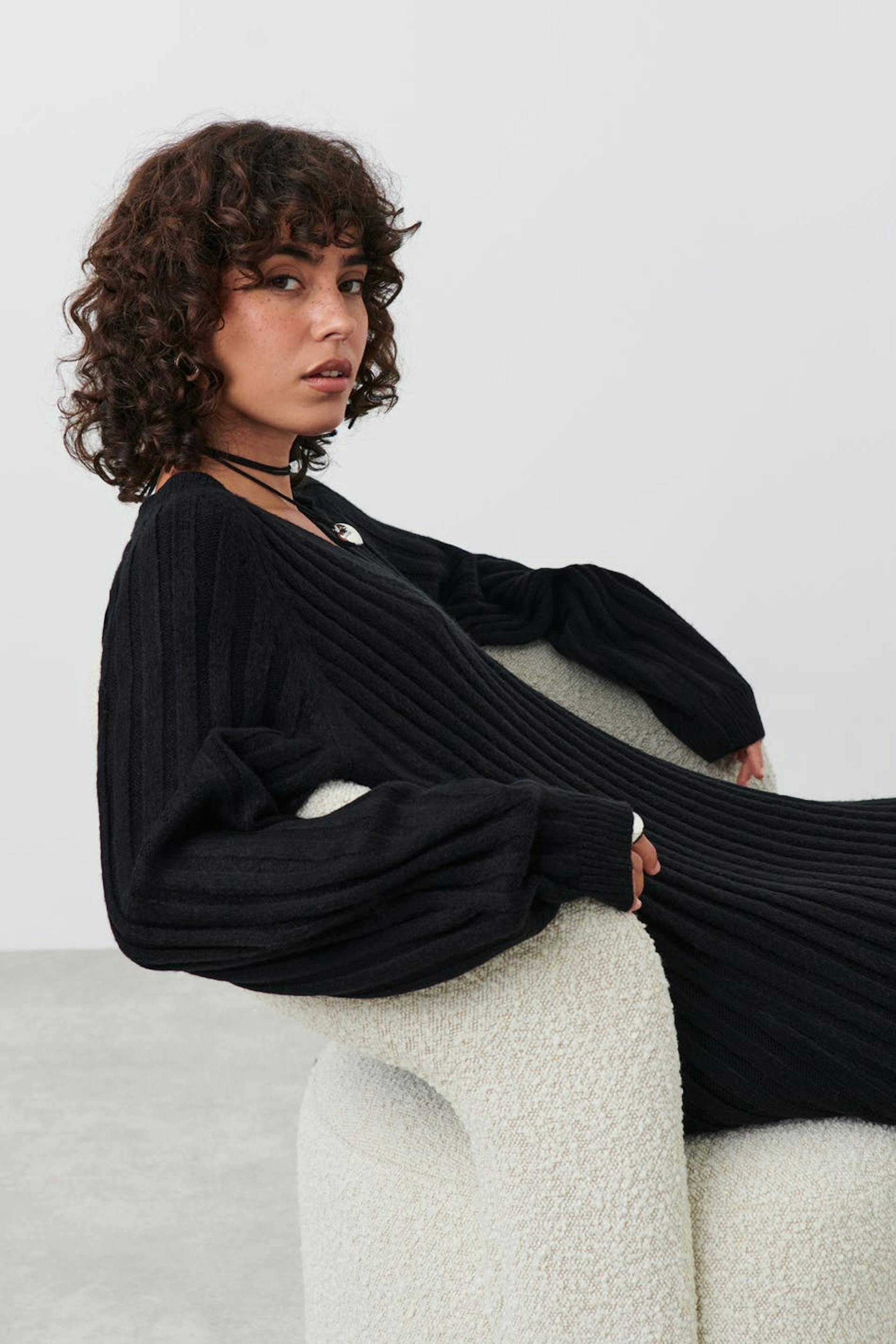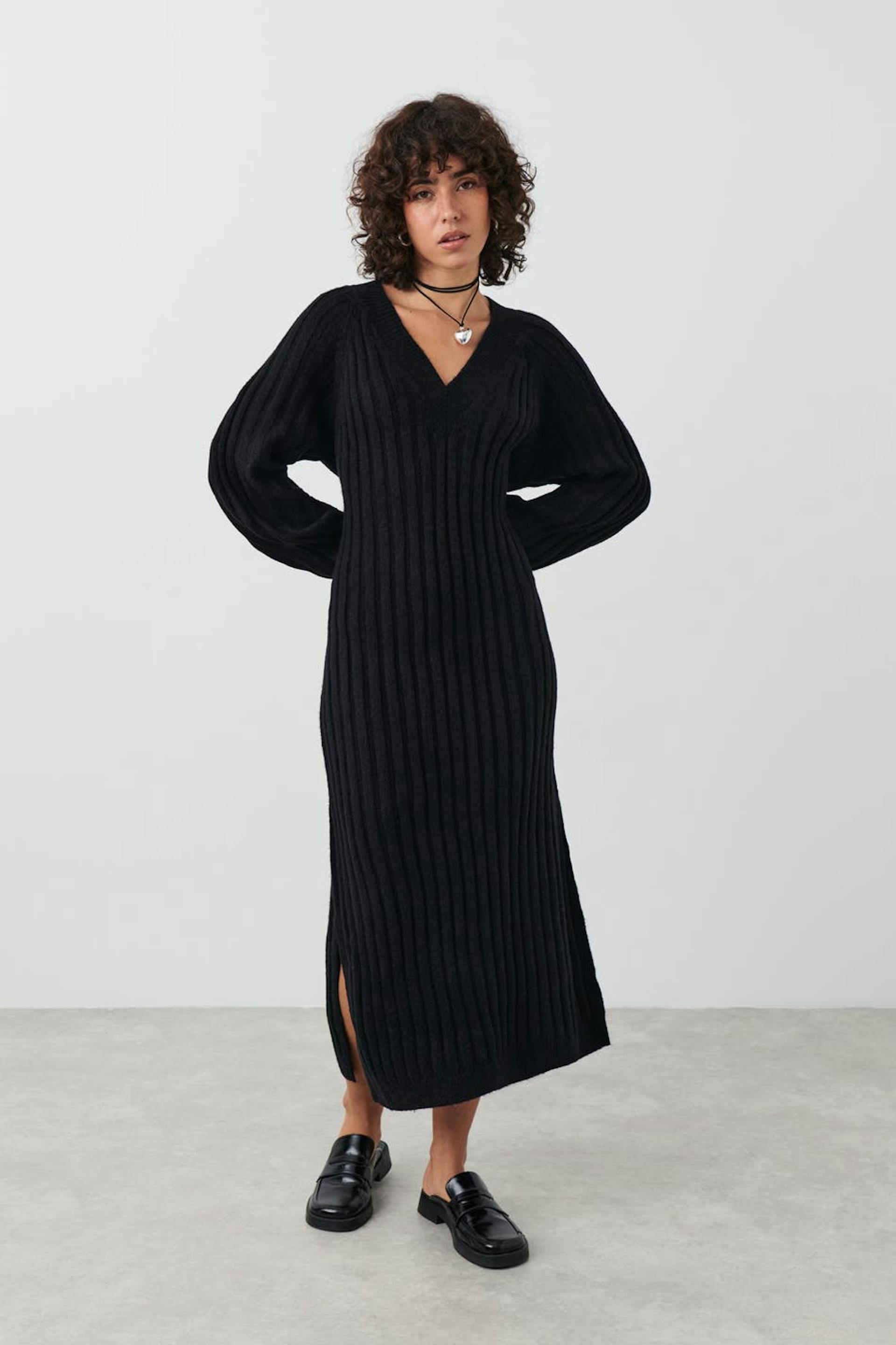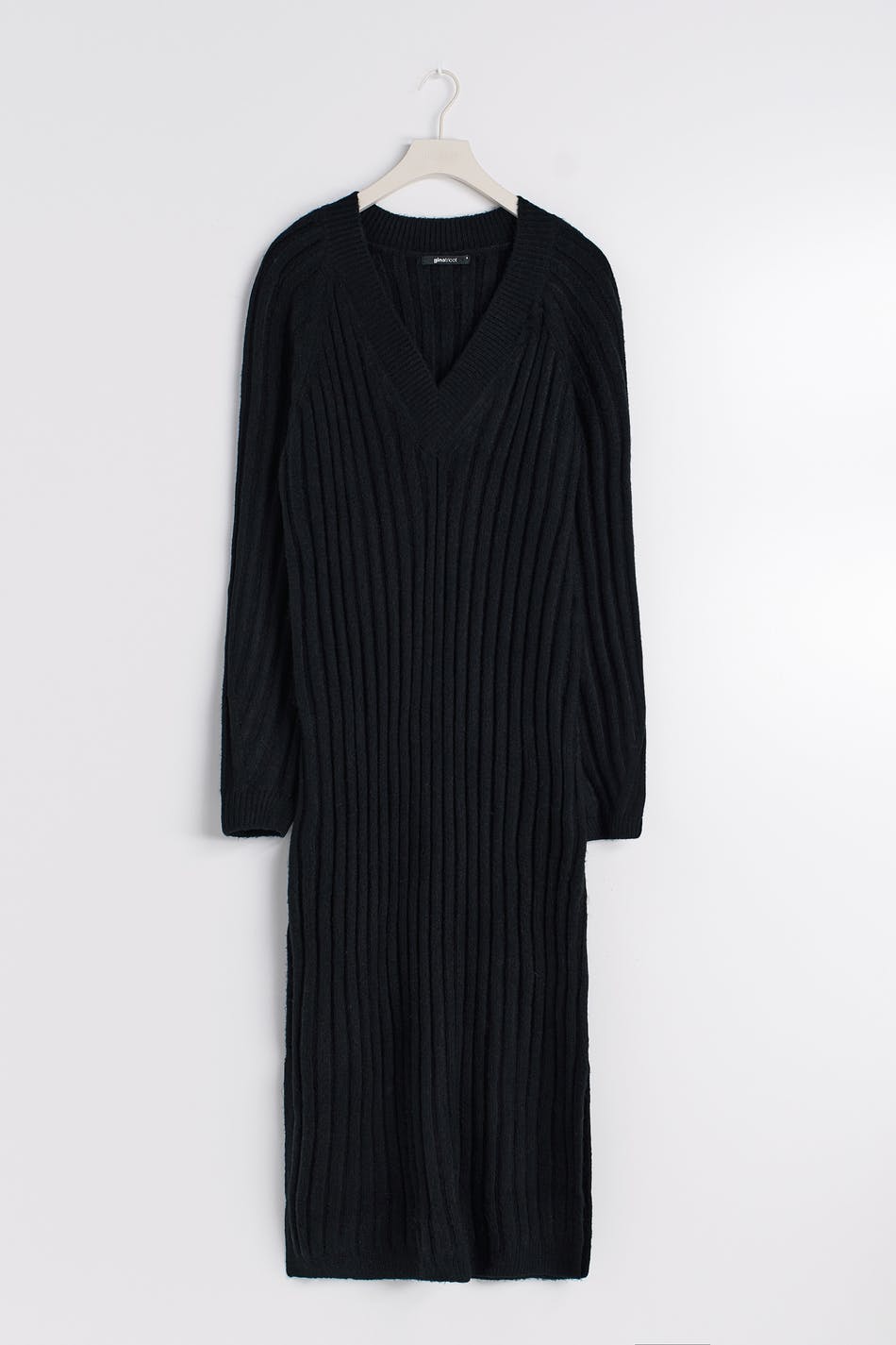 Knitted dress with long raglan sleeve. The dress is black and has ribbed quality. It has v-neck, slit in the sides, ribbed cuff at sleeve ends and maxi length.