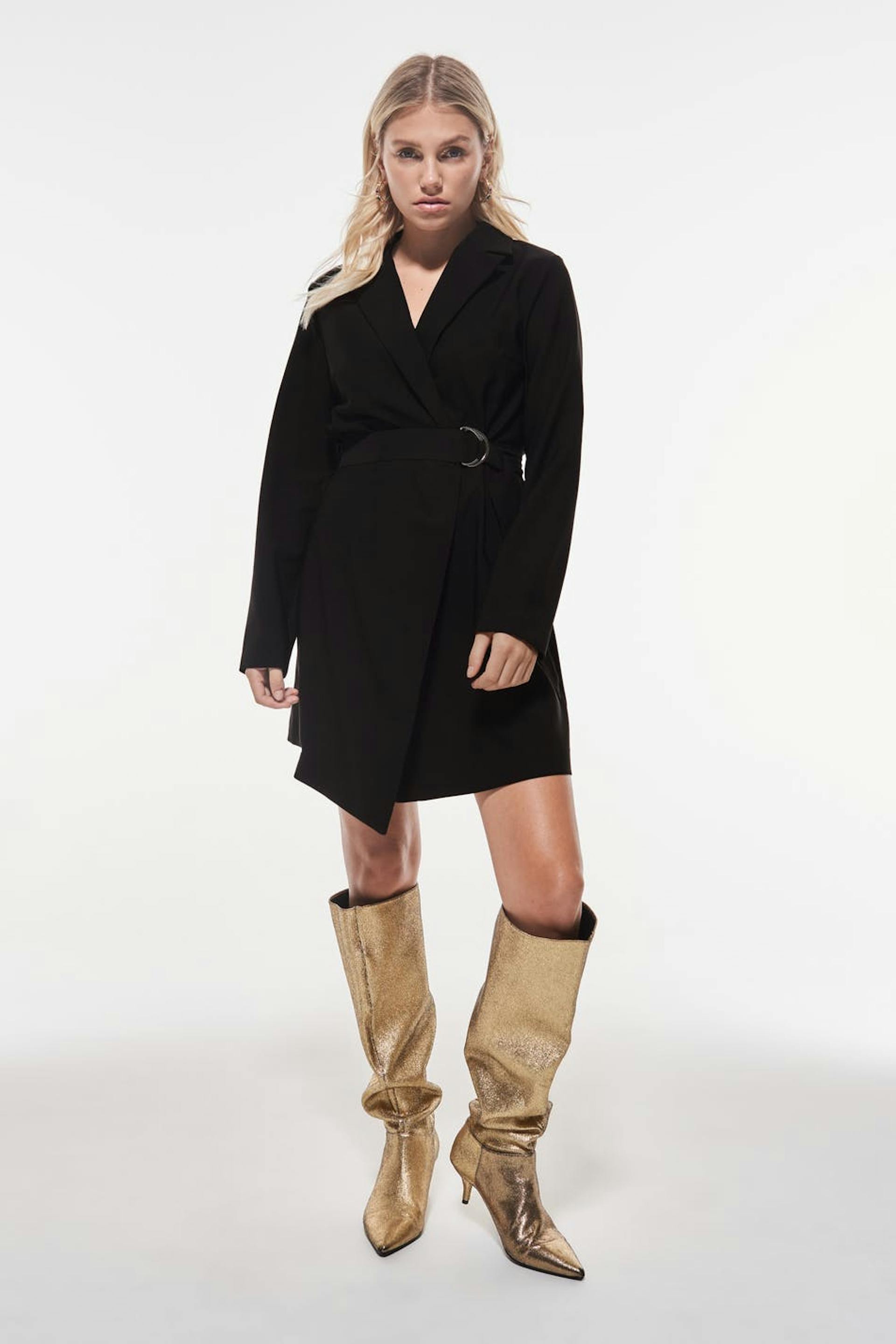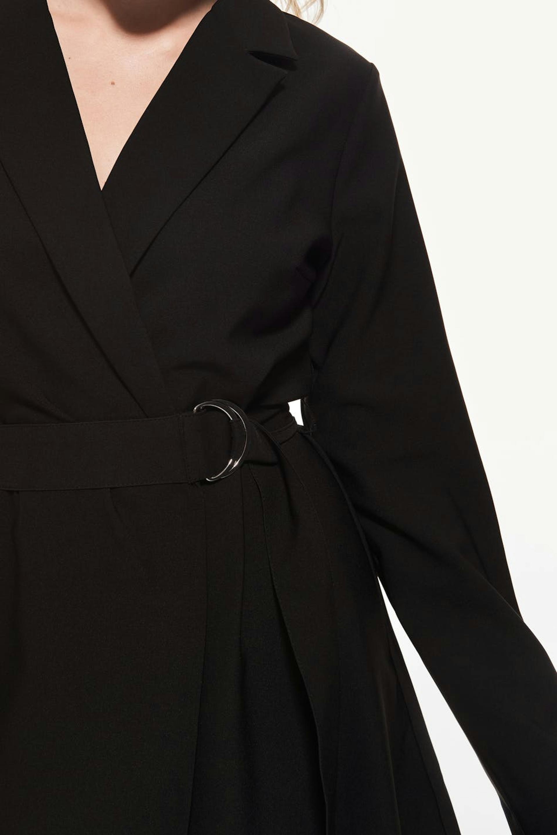 Blazer dress with a wide belt at the waist. The dress is perfect for the party and black and has an asymmetrical hem.