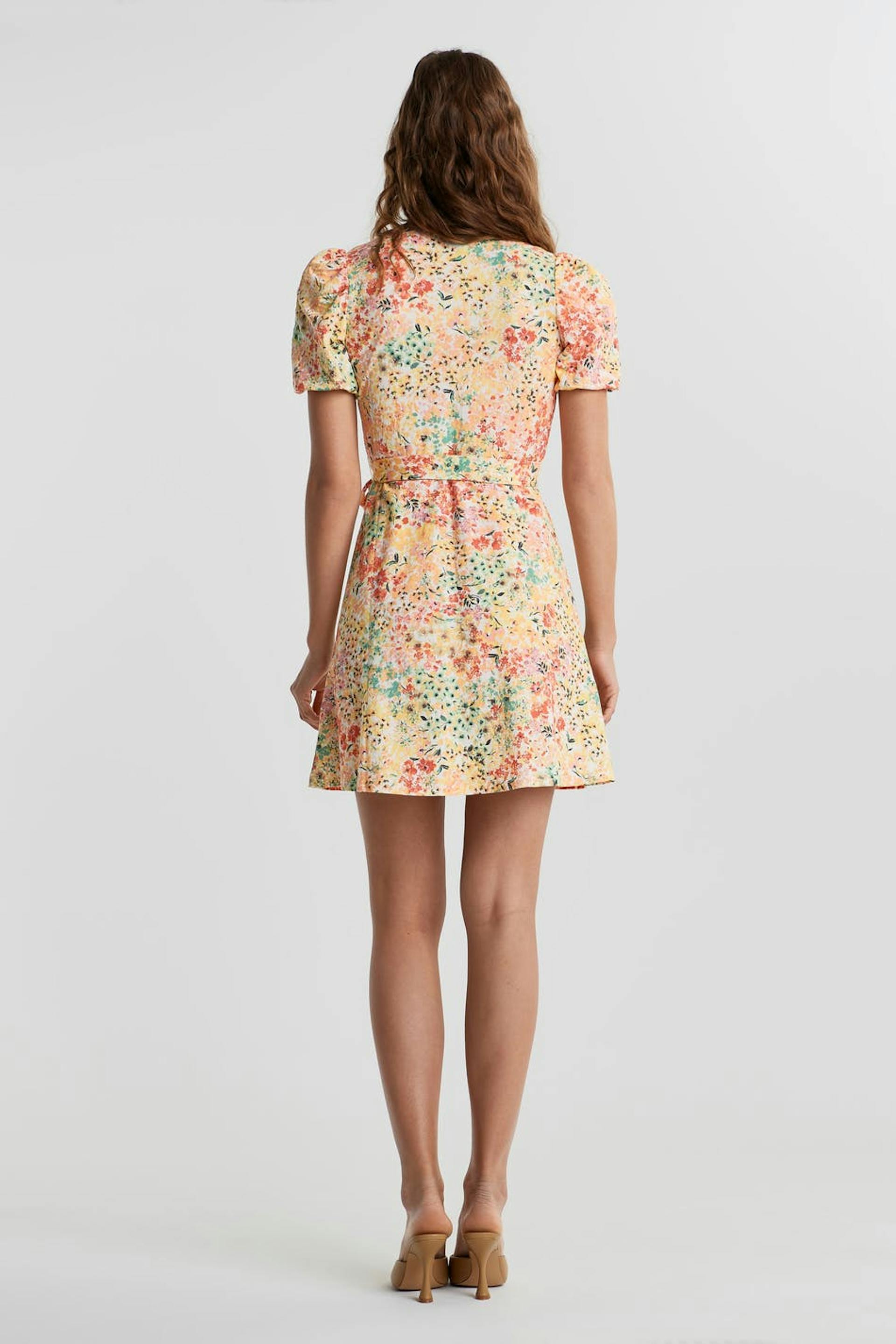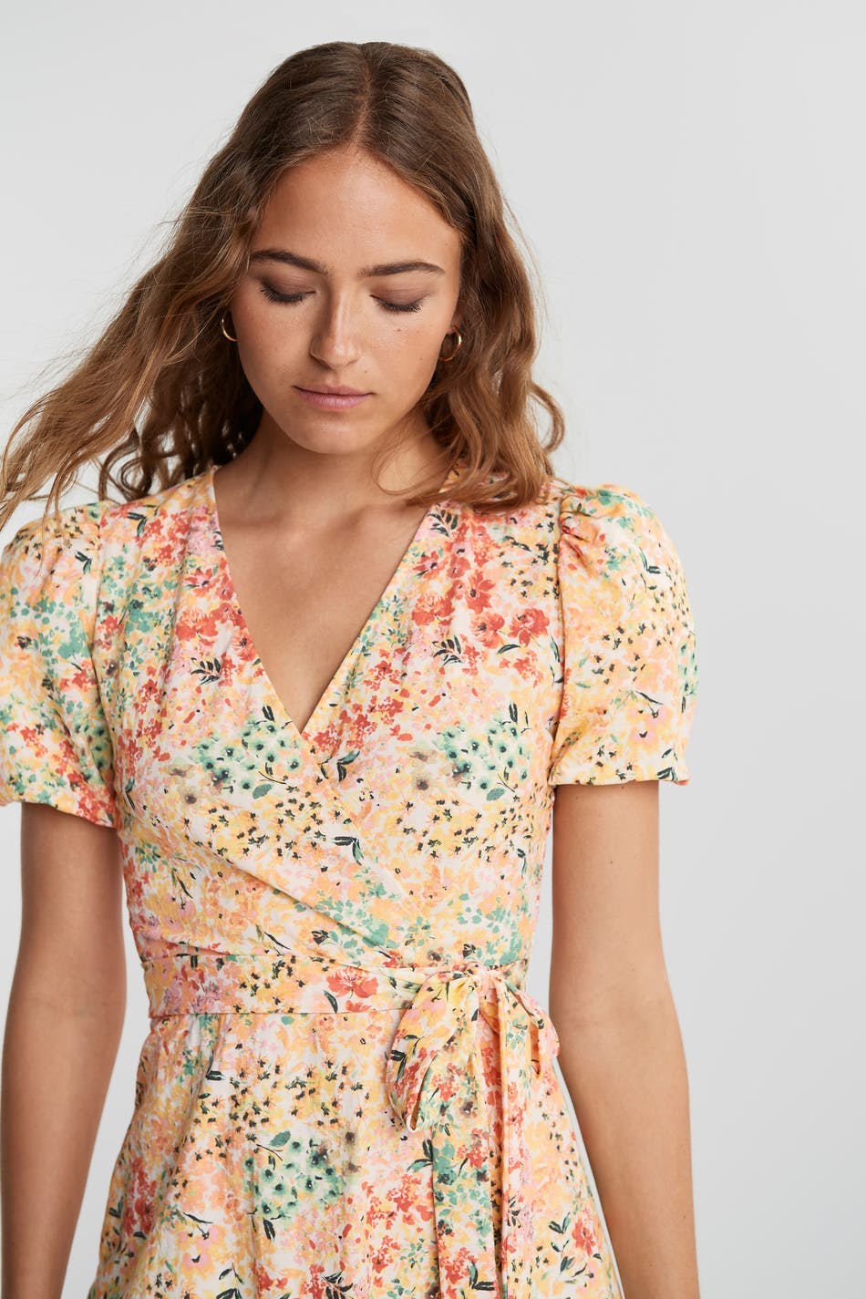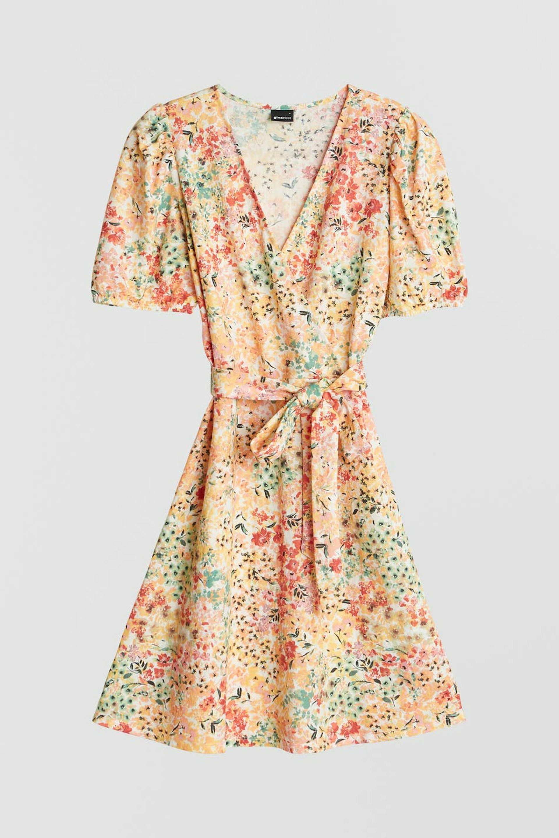 Floral dress with a regular fit. The dress is yellow and short and has a wrap-around style. It is made of jersey and has a tie strap at the waist, short puff sleeve and a wide skirt.
