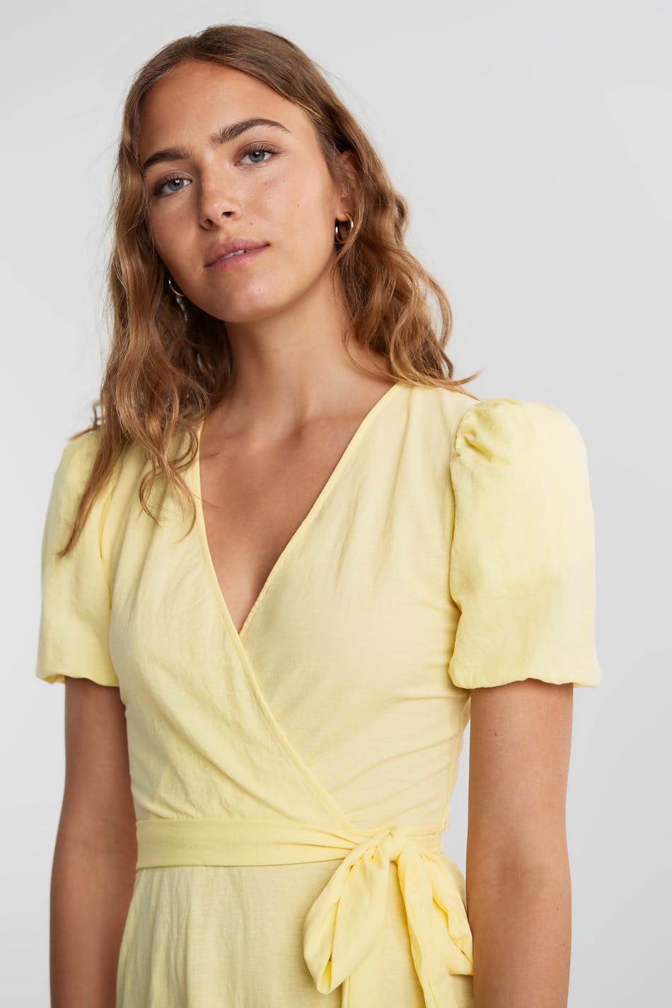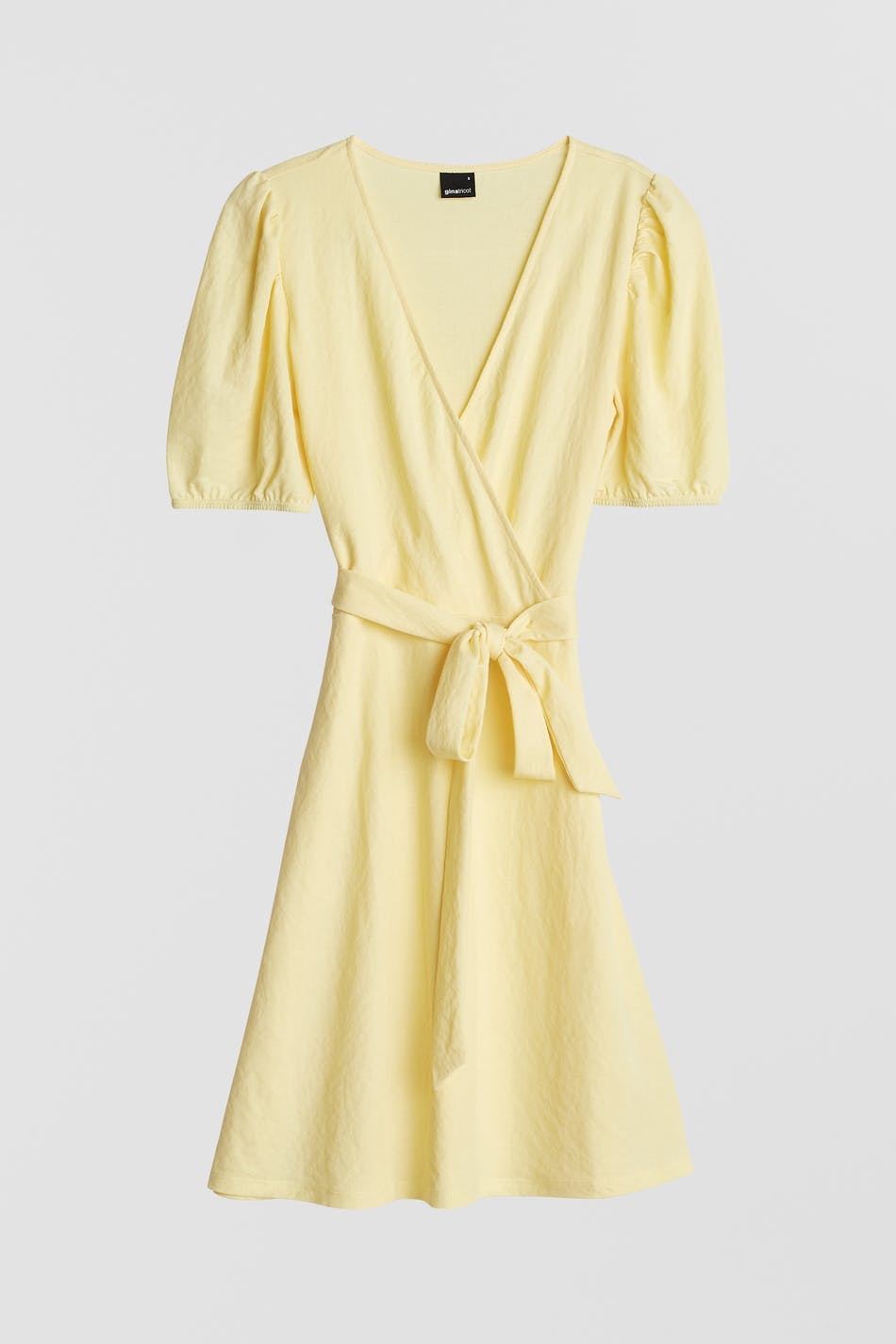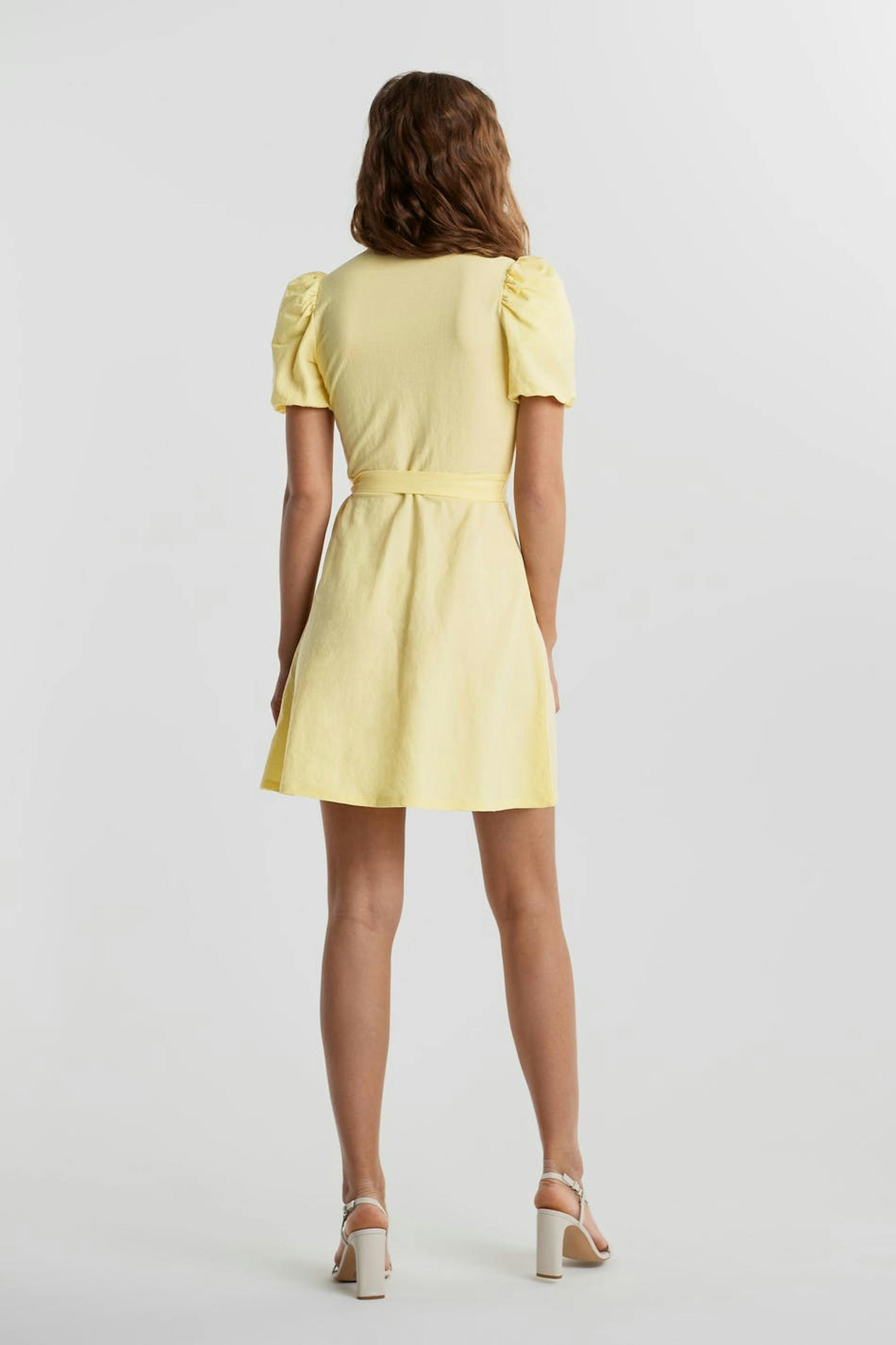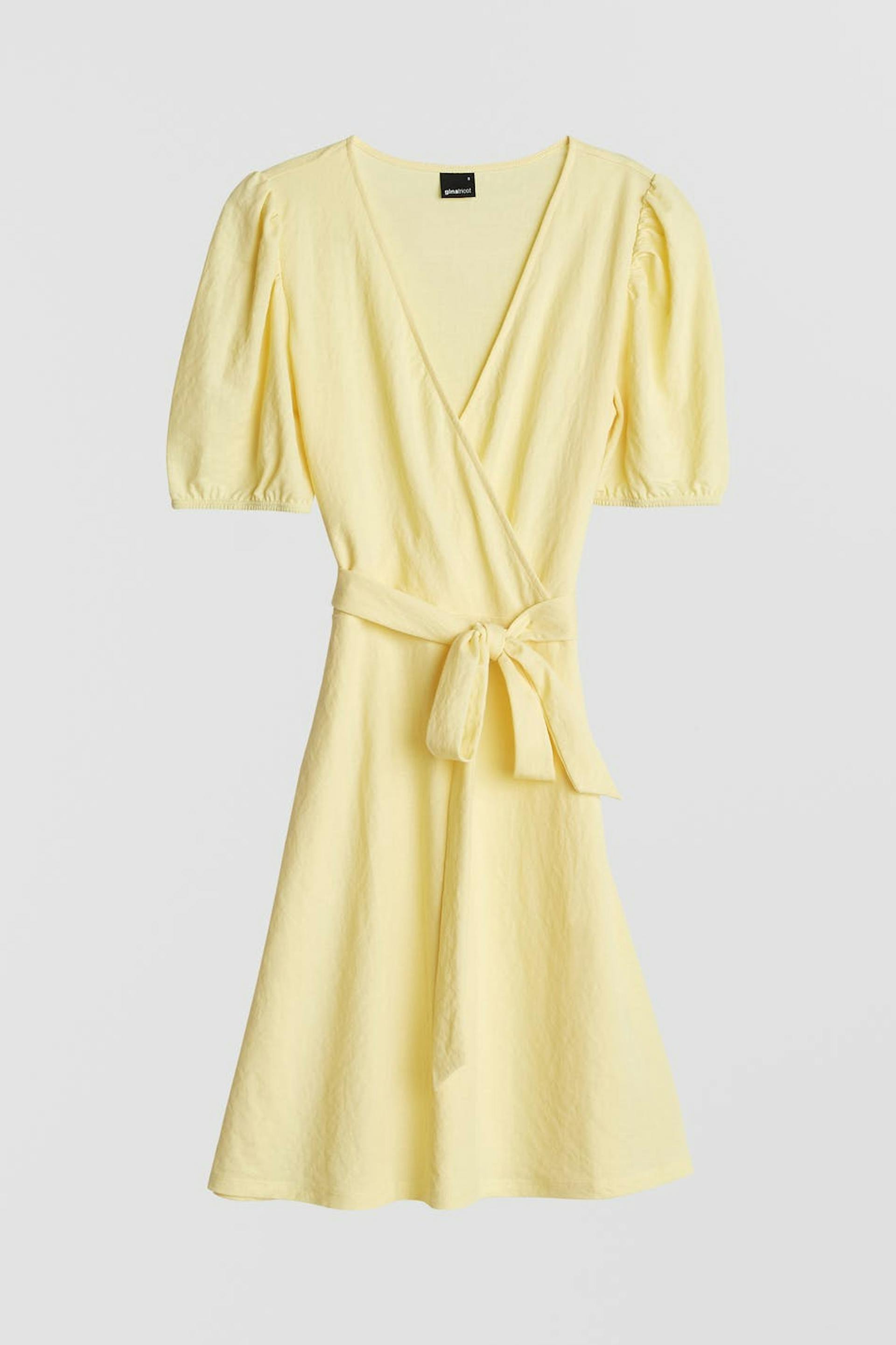 Short dress with a regular fit. The dress is yellow and has a wrap-around style. It is made of jersey and has a tie strap at the waist, short puff sleeve and a wide skirt.