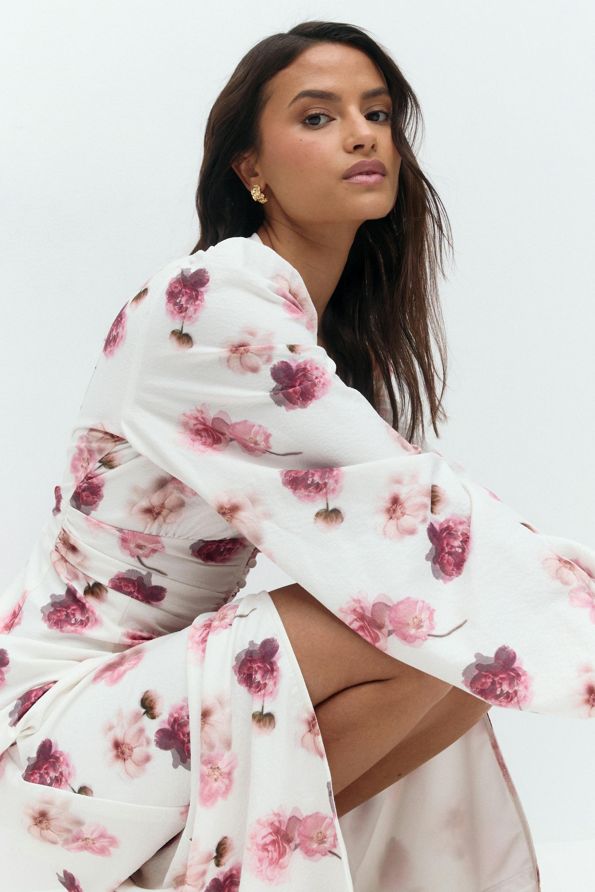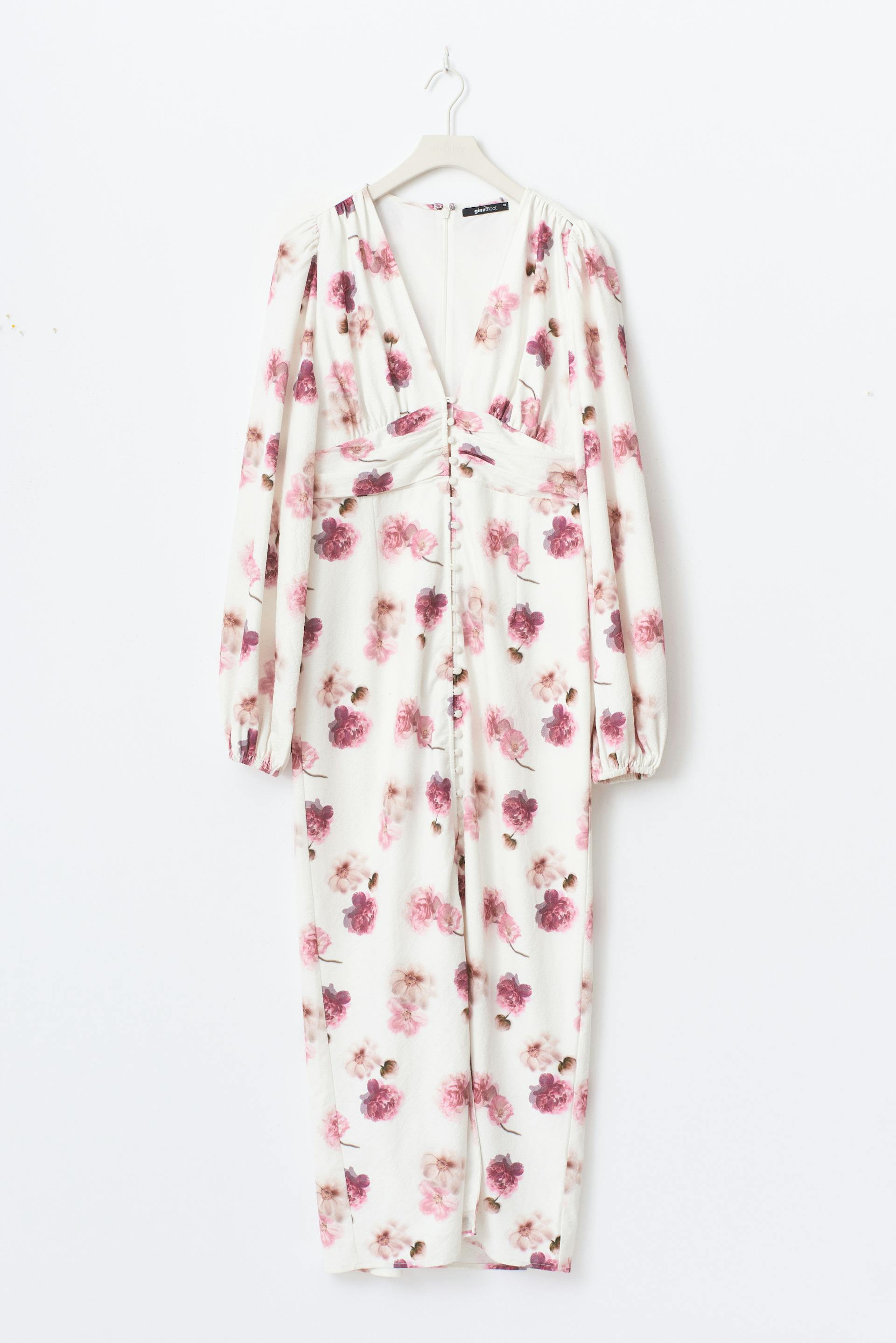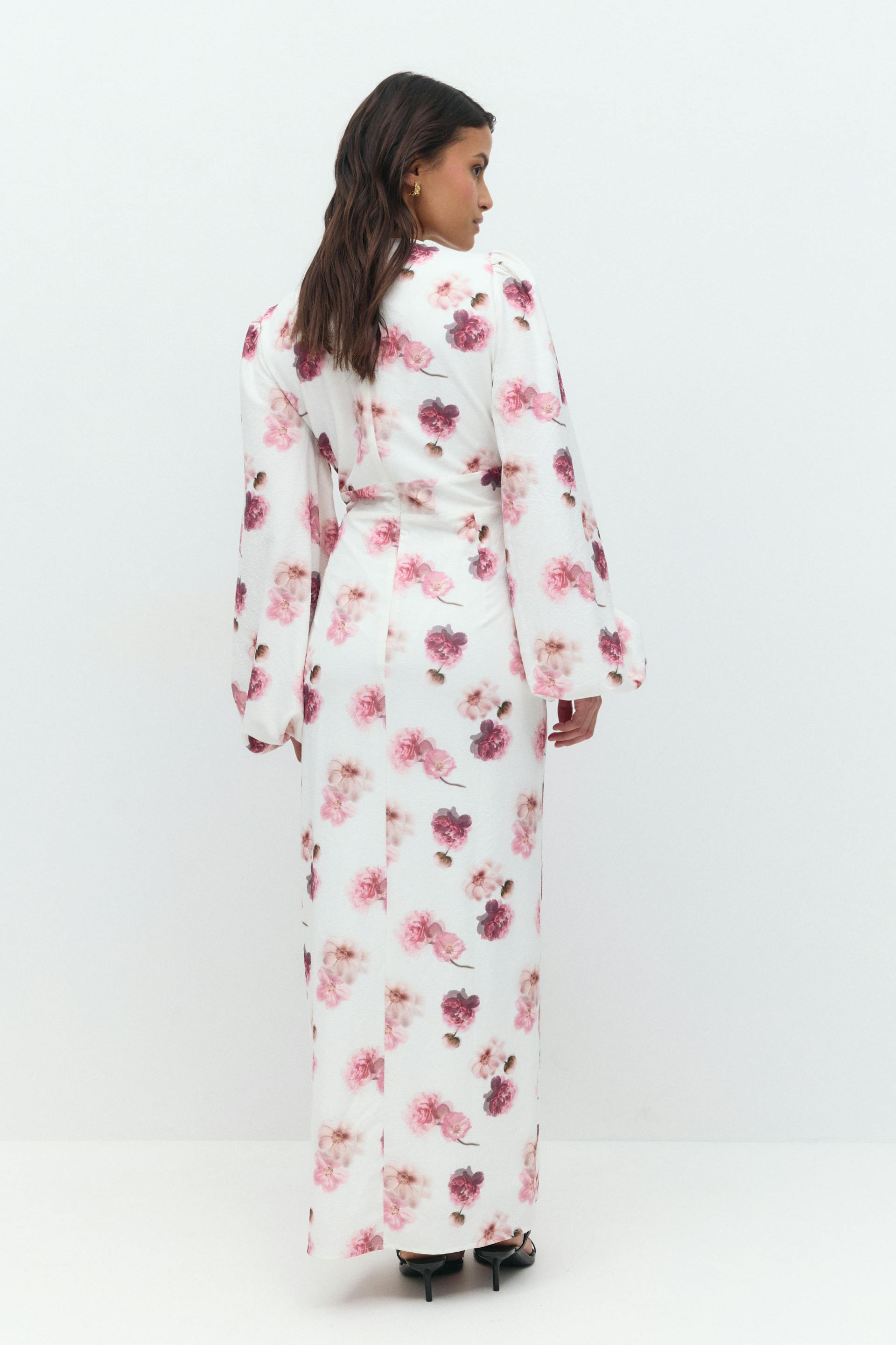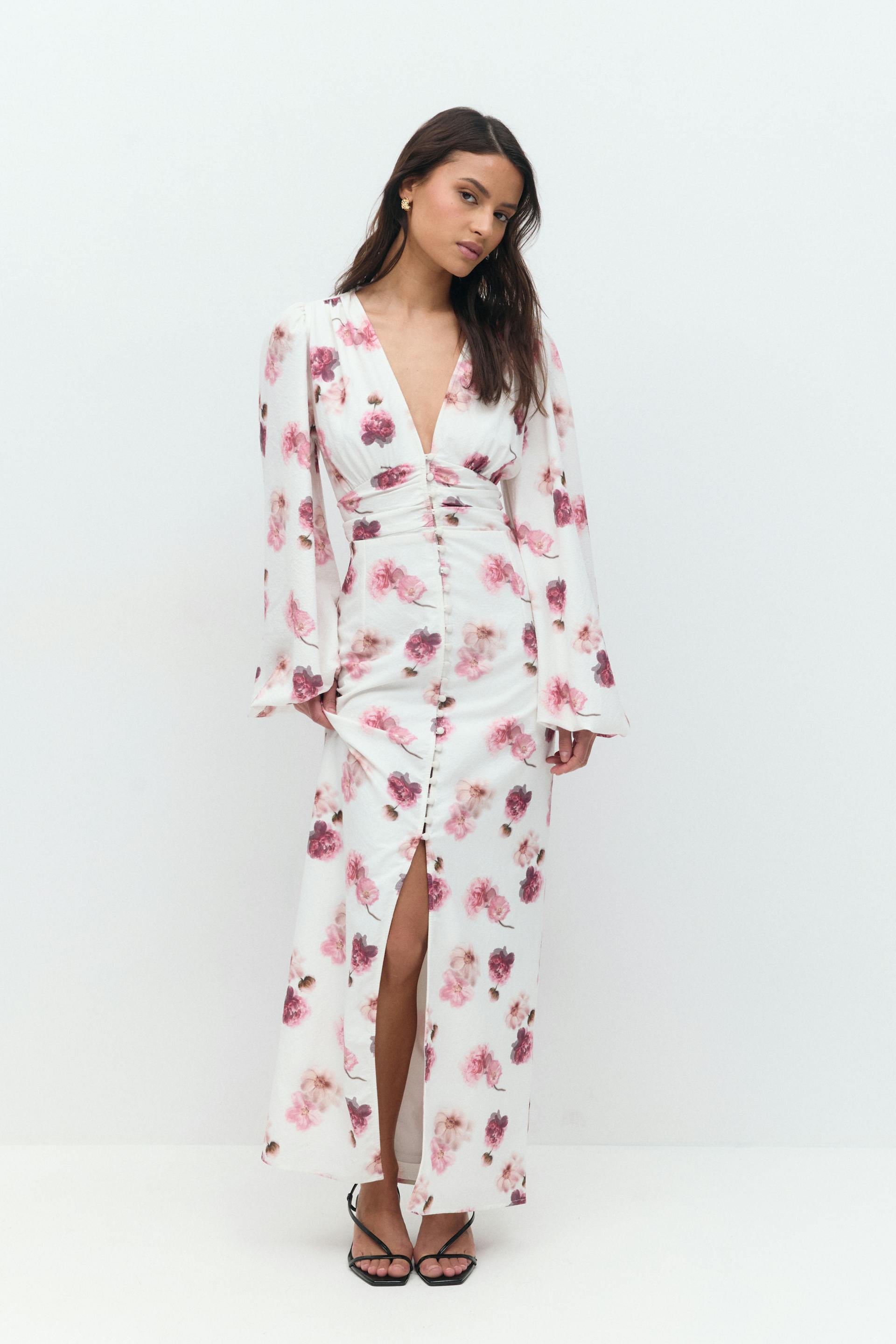 Floral maxi dress with buttons at the front. The dress is white and has balloon sleeves. It has figure-hugging fit, v-neck, gathered detail at the waist, slit at the front and zip closure.